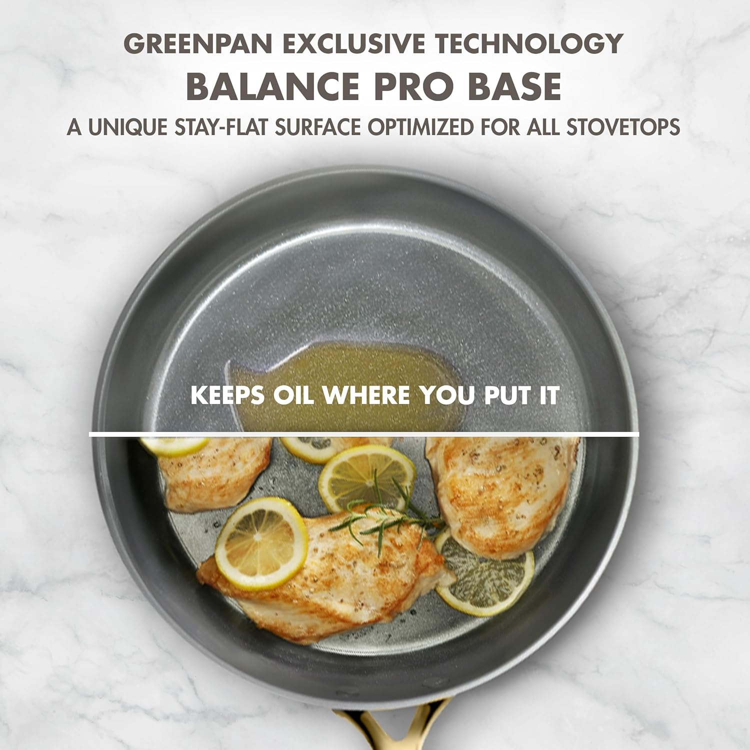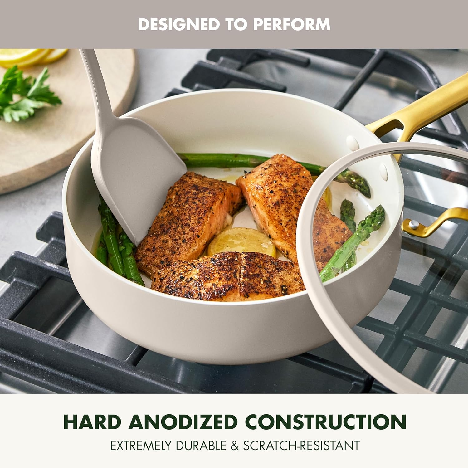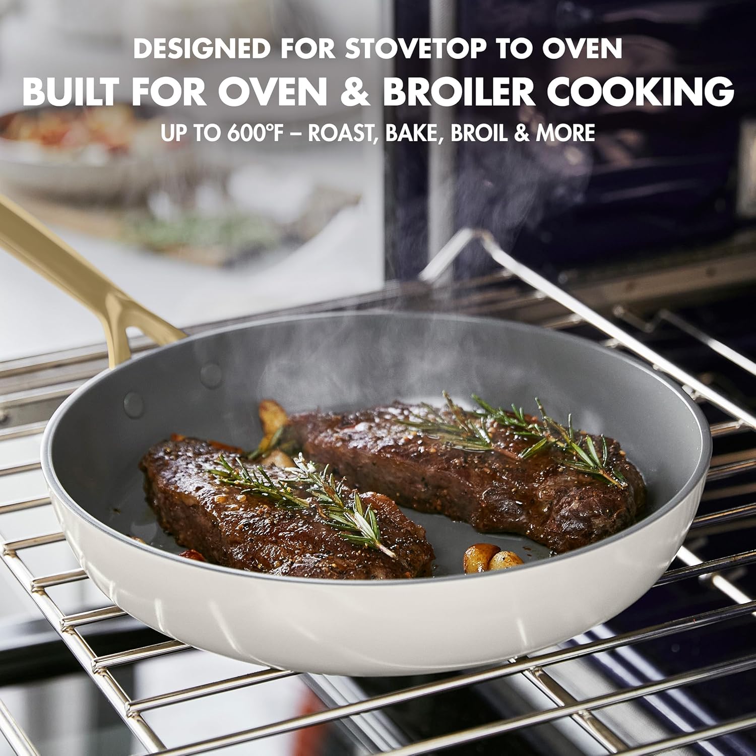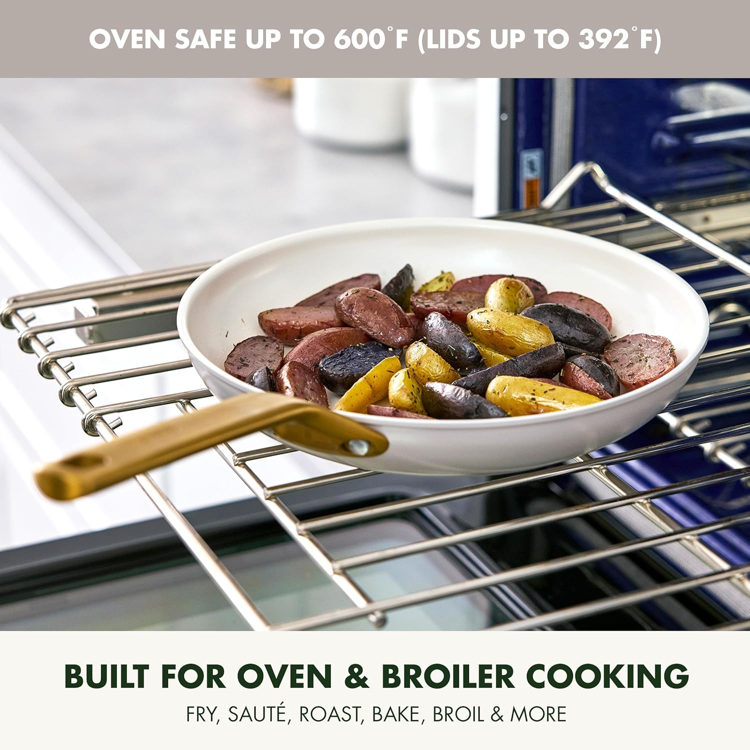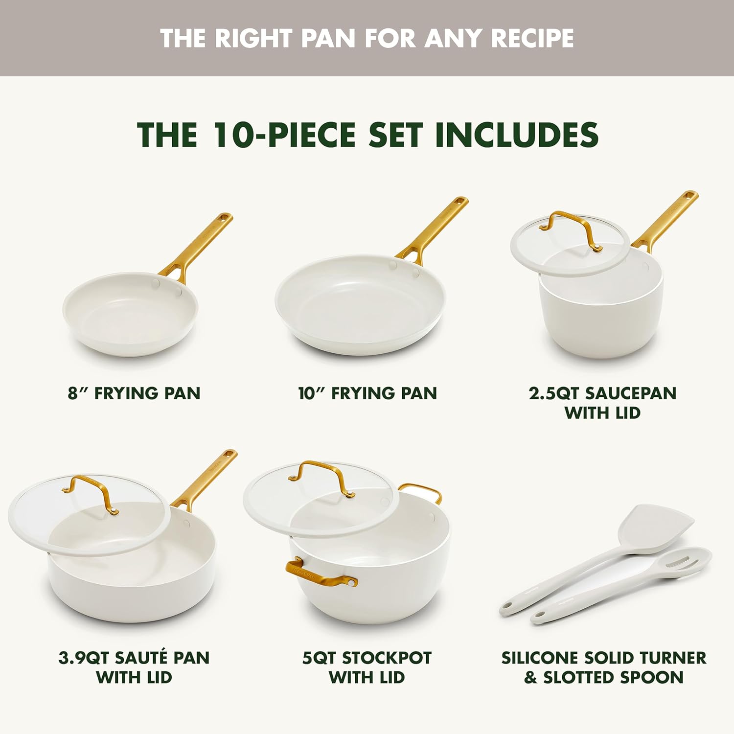GreenPan GP5 14 Piece Cookware Pots and Pans Set, Hard Anodized Healthy Ceramic Nonstick PFAS-Free, Champagne Handles, Heavy Gauge, Stay-Flat Surface, Induction, Dishwasher and Oven Safe, Cream