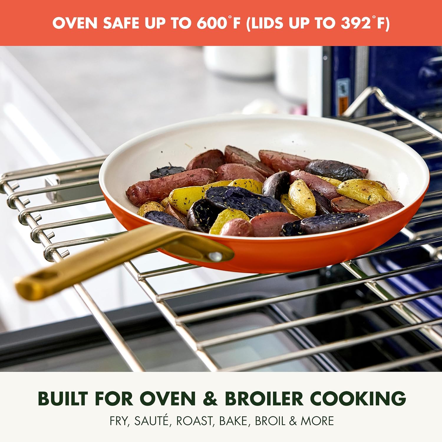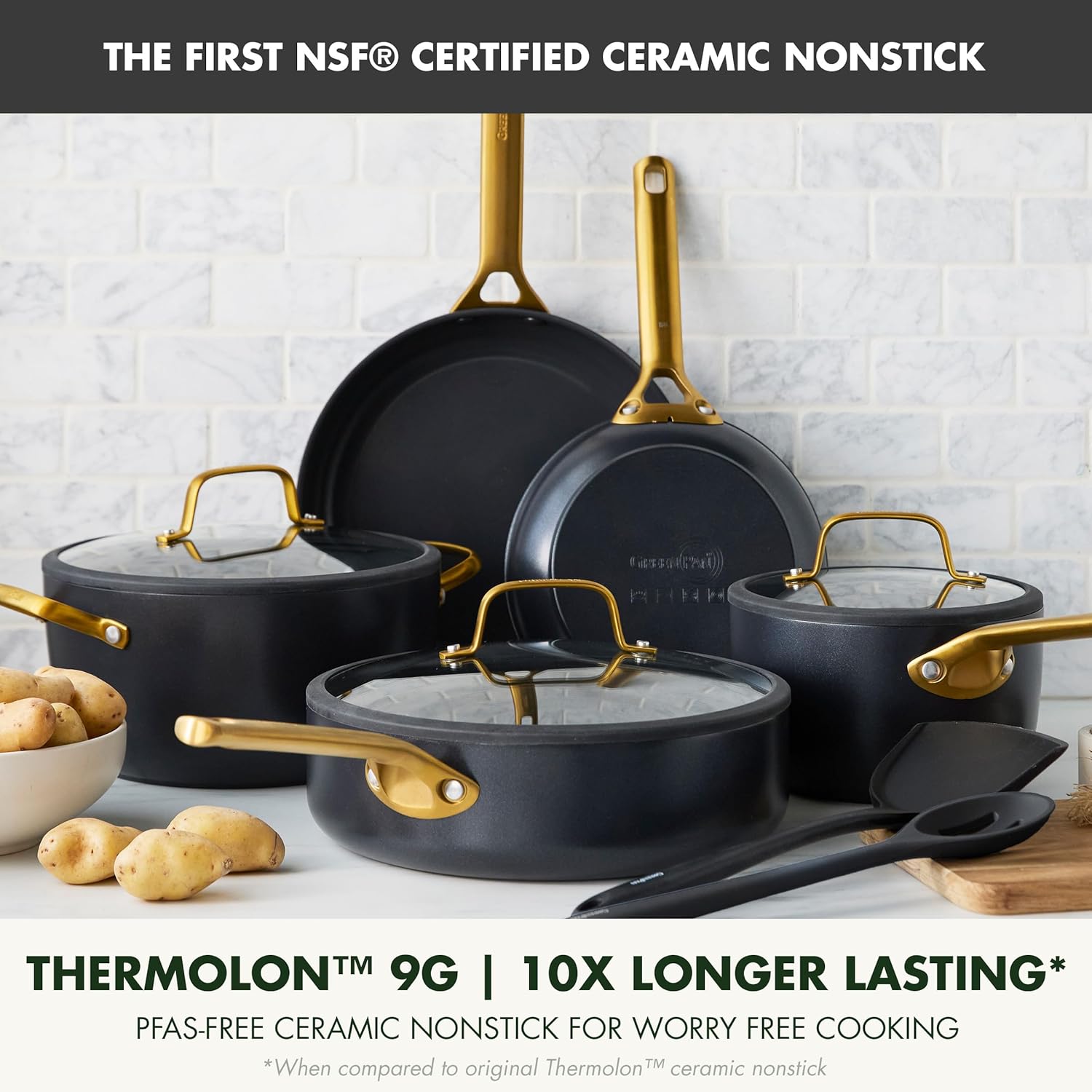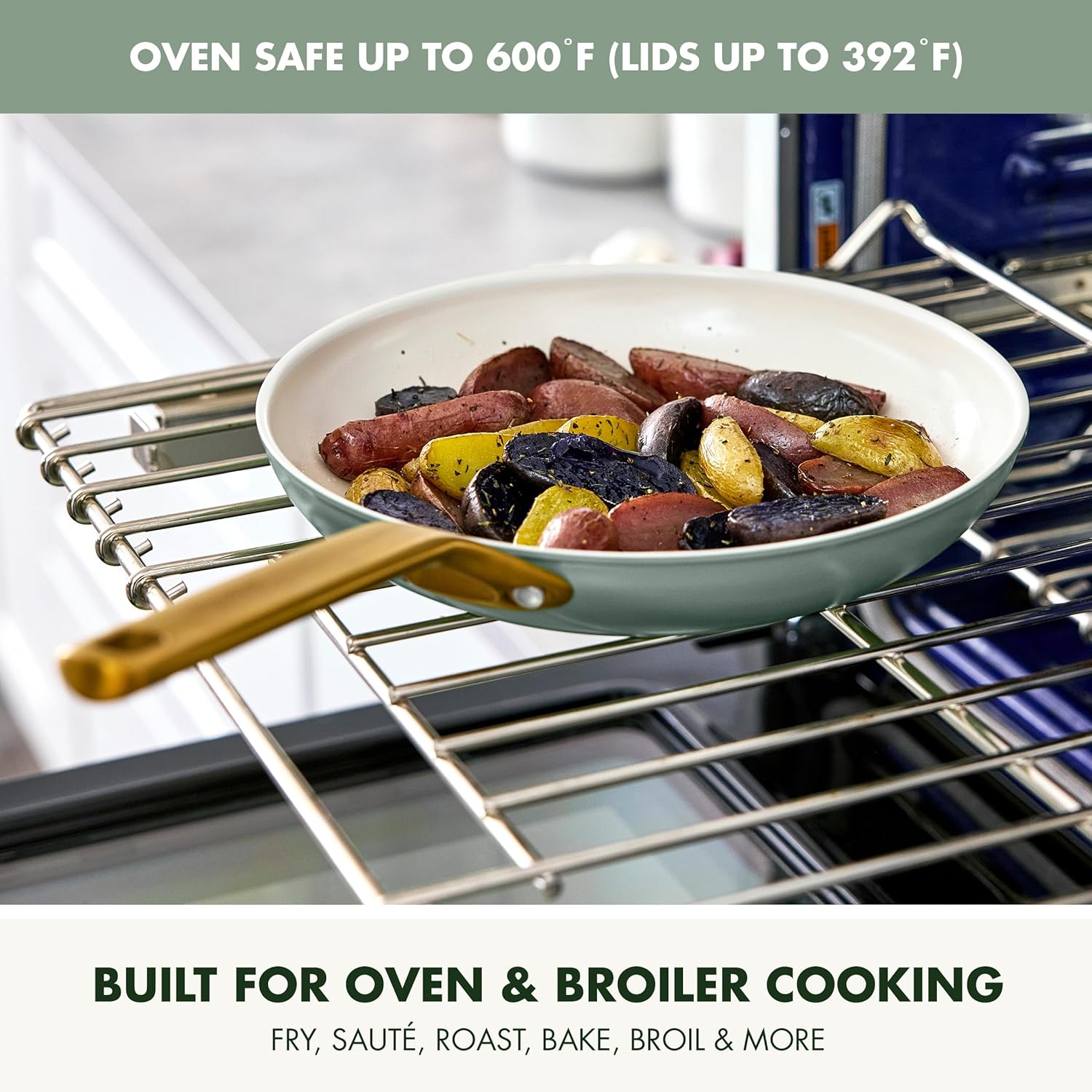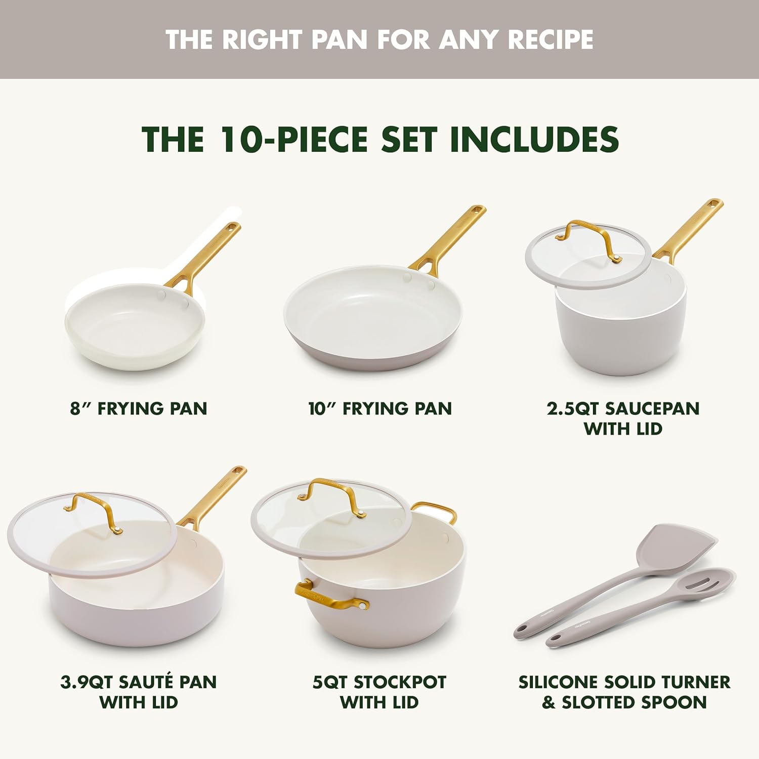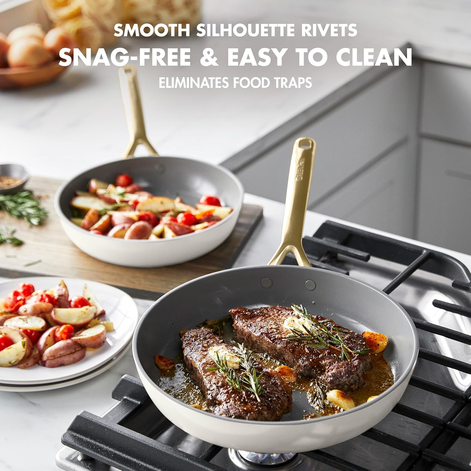 GreenPan GP5 14 Piece Cookware Pots and Pans Set, Hard Anodized Healthy Ceramic Nonstick PFAS-Free, Champagne Handles, Heavy Gauge, Stay-Flat Surface, Induction, Dishwasher and Oven Safe, Cream