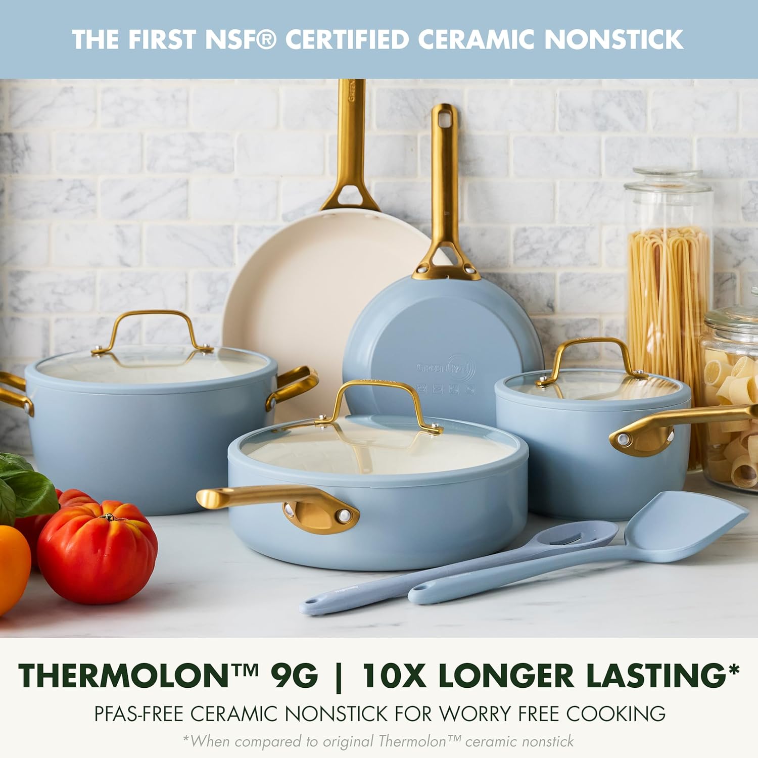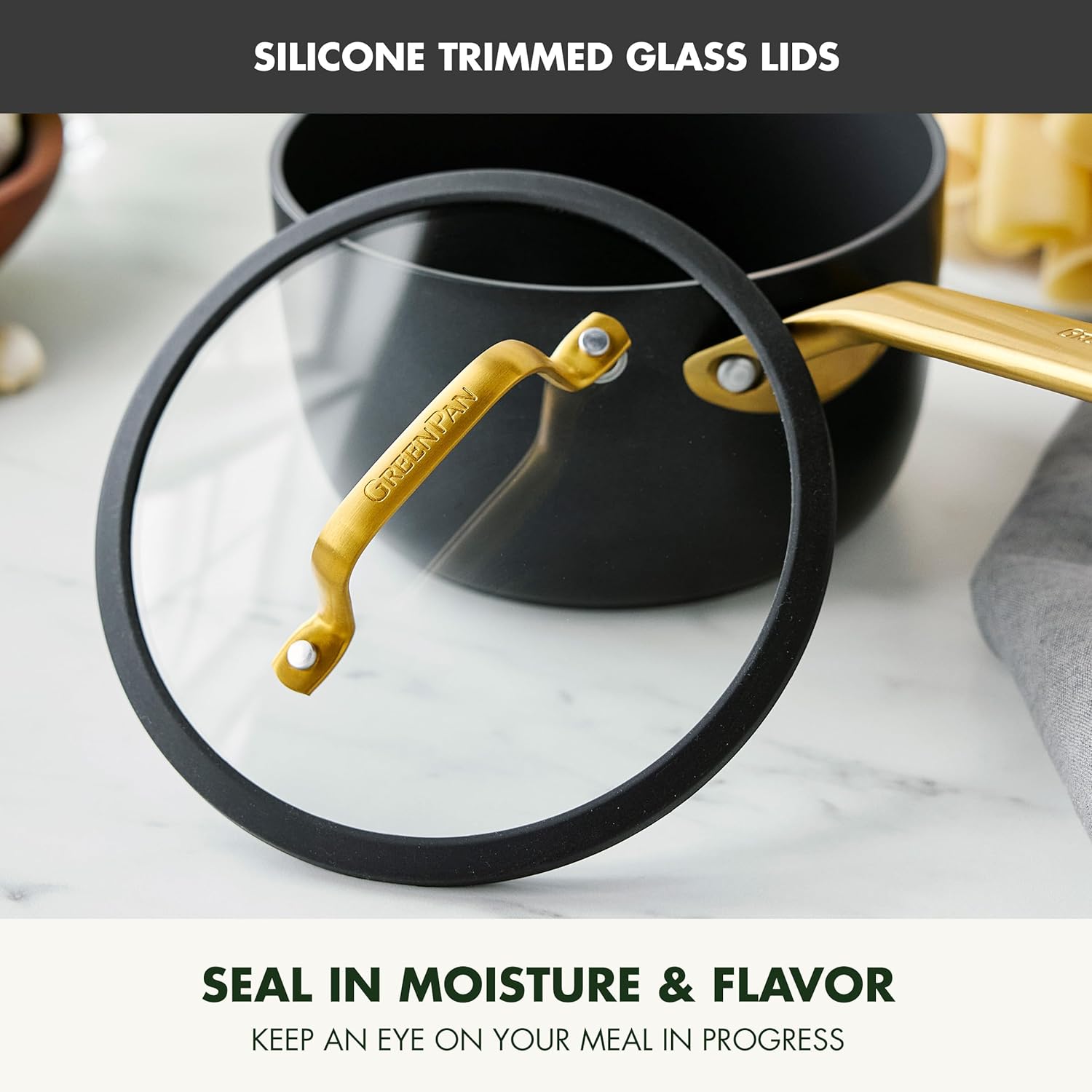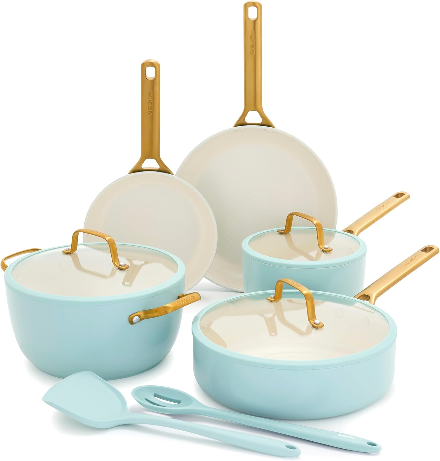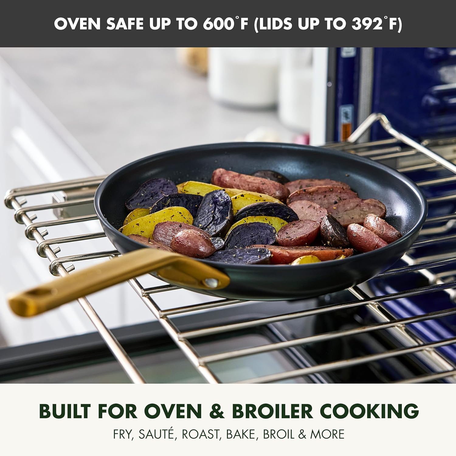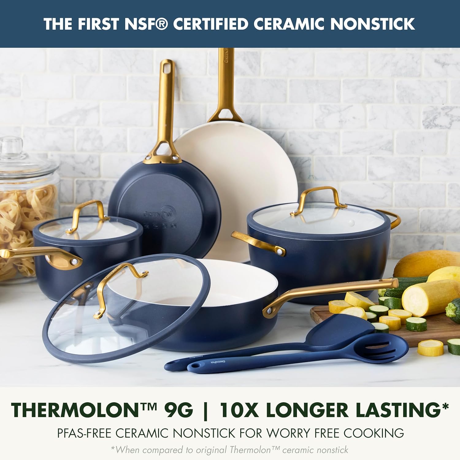 GreenPan GP5 14 Piece Cookware Pots and Pans Set, Hard Anodized Healthy Ceramic Nonstick PFAS-Free, Champagne Handles, Heavy Gauge, Stay-Flat Surface, Induction, Dishwasher and Oven Safe, Cream