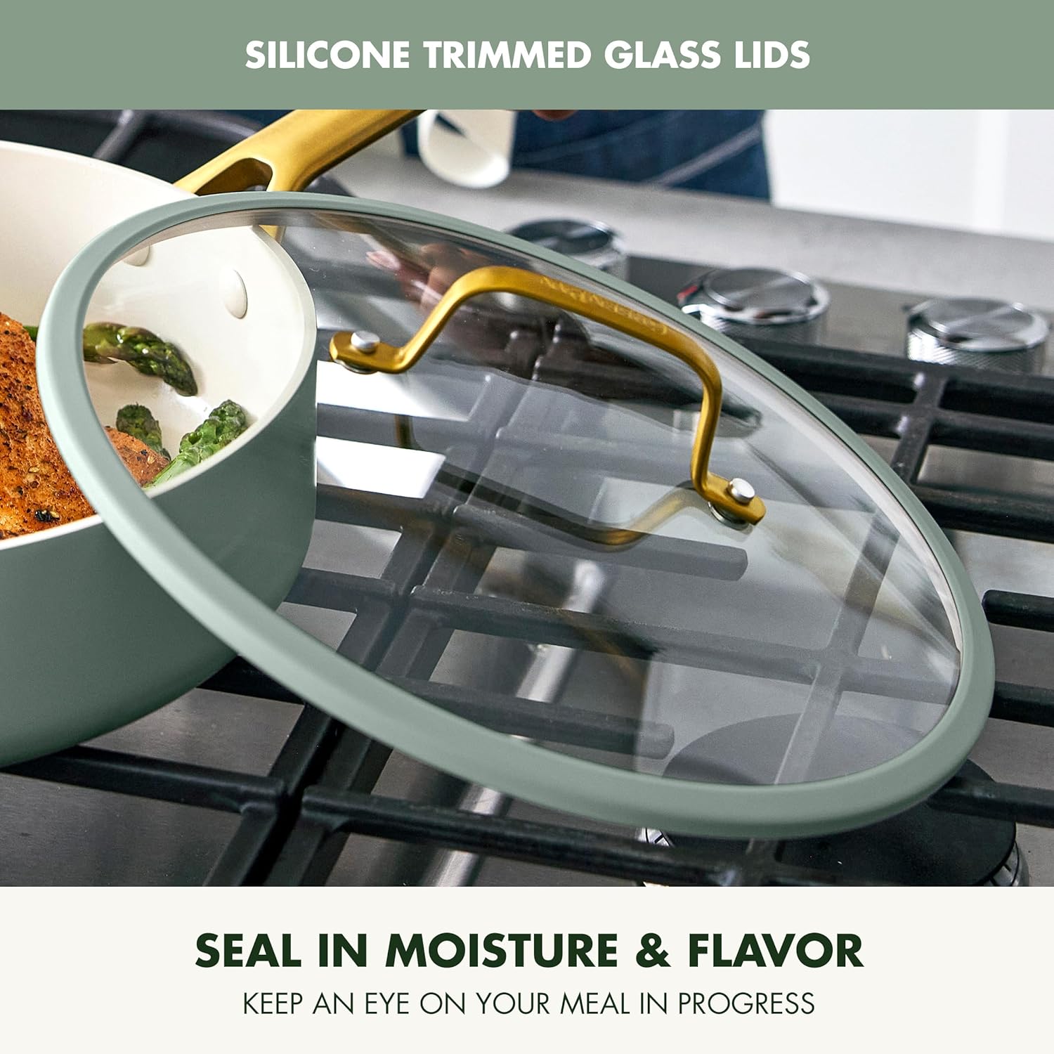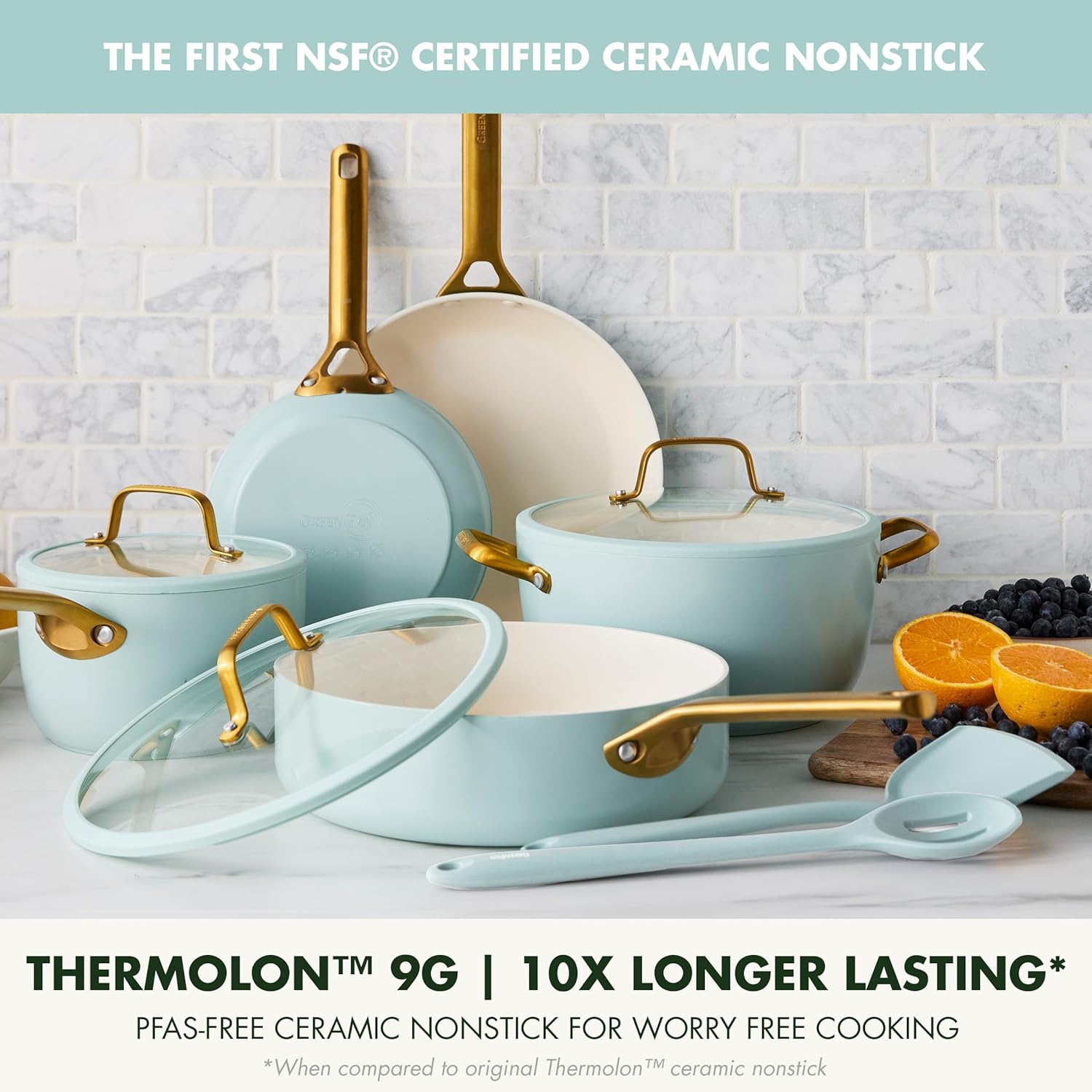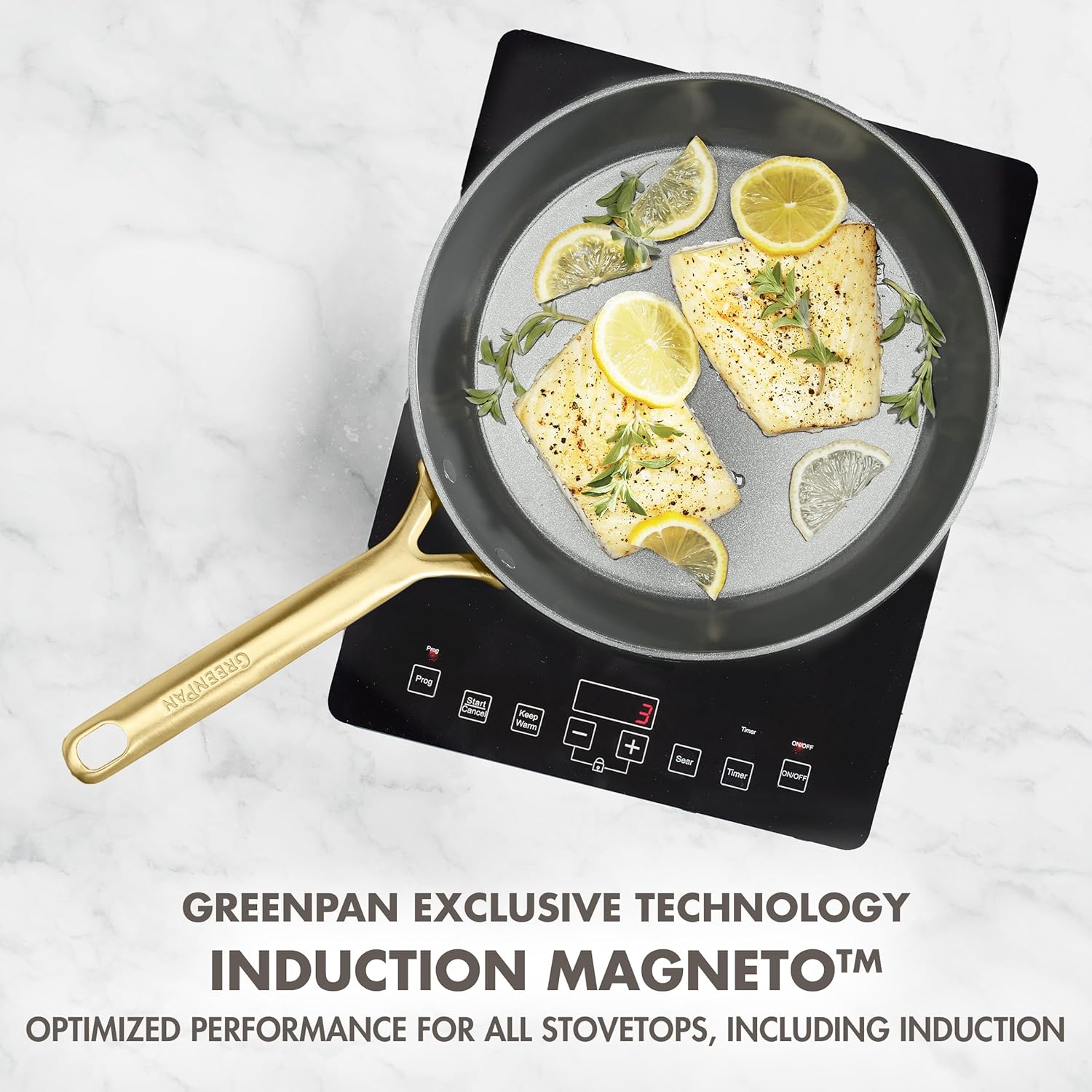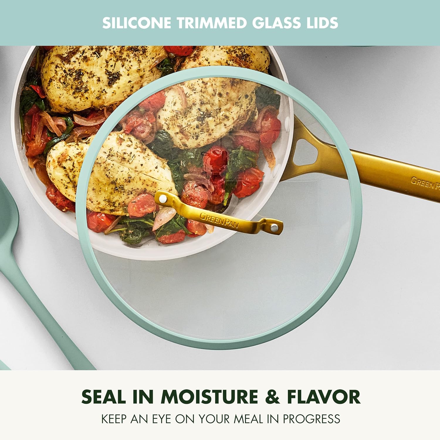 GreenPan GP5 14 Piece Cookware Pots and Pans Set, Hard Anodized Healthy Ceramic Nonstick PFAS-Free, Champagne Handles, Heavy Gauge, Stay-Flat Surface, Induction, Dishwasher and Oven Safe, Cream