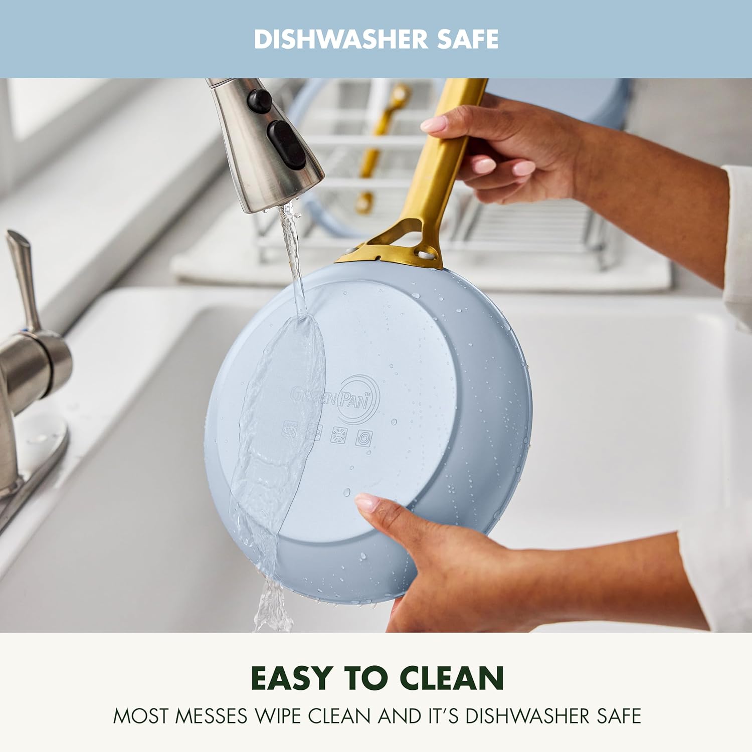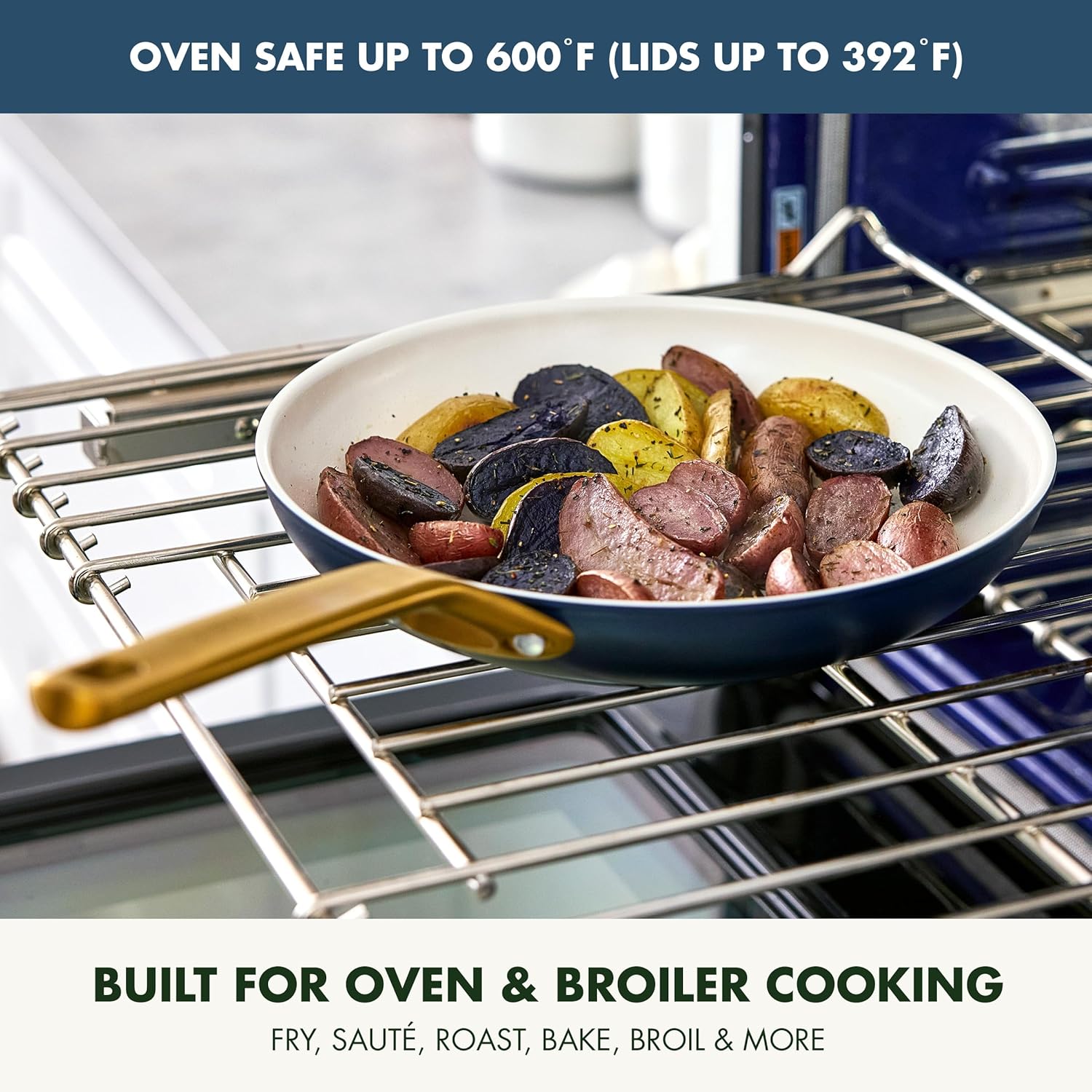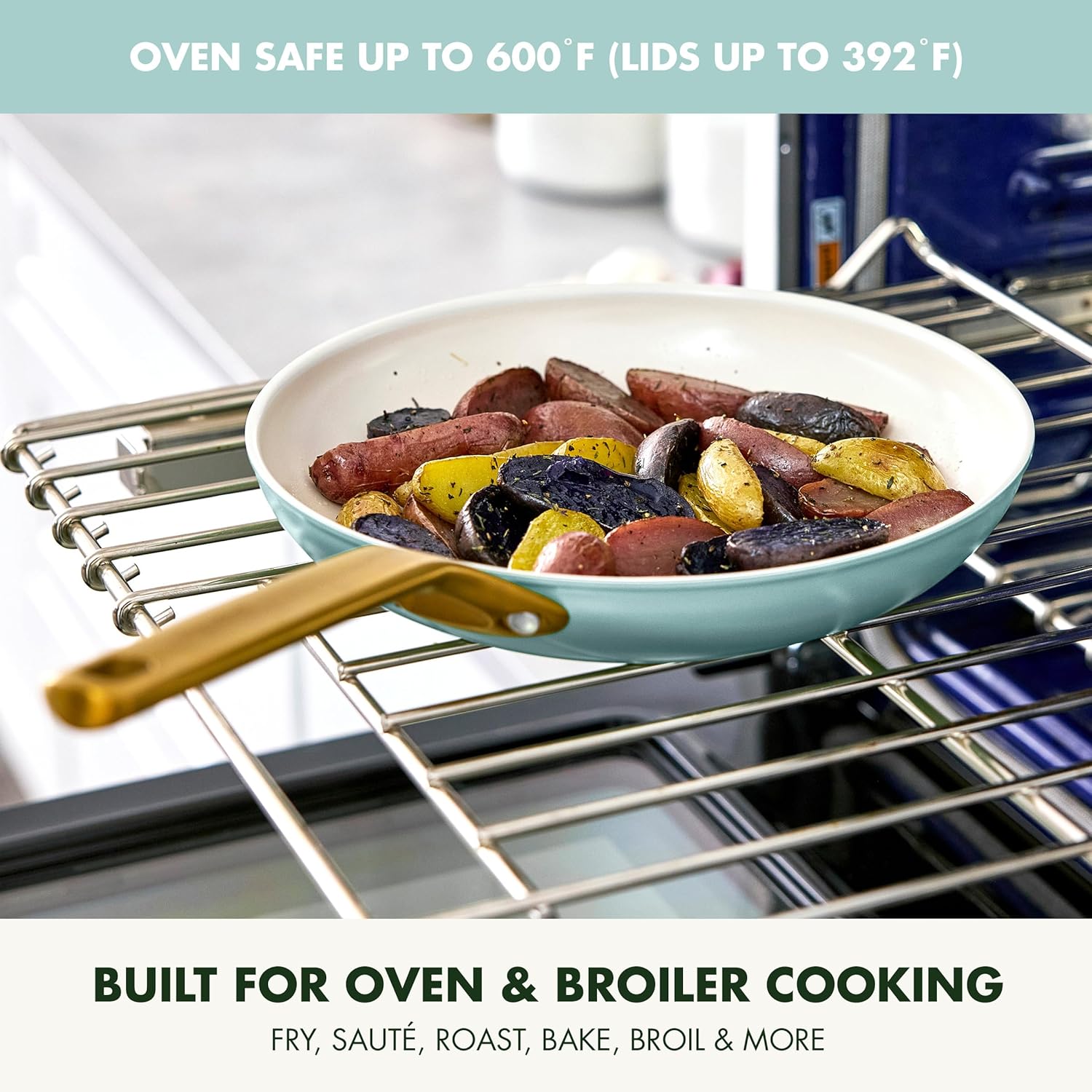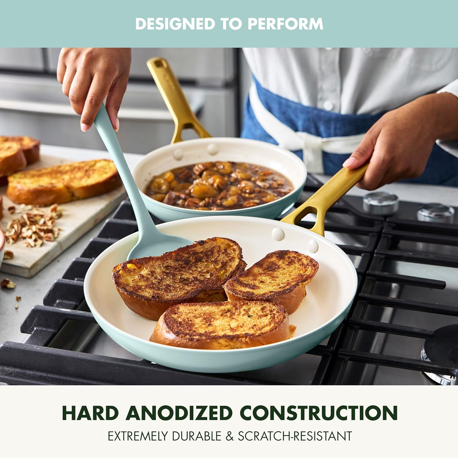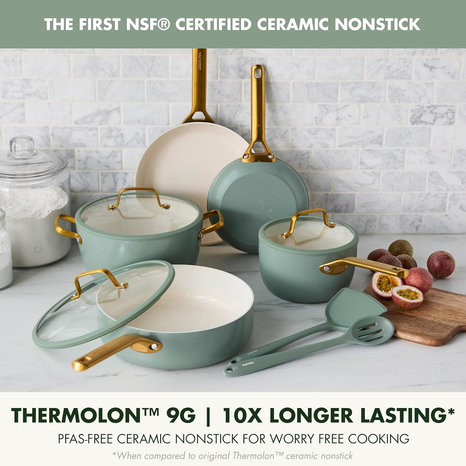 GreenPan GP5 14 Piece Cookware Pots and Pans Set, Hard Anodized Healthy Ceramic Nonstick PFAS-Free, Champagne Handles, Heavy Gauge, Stay-Flat Surface, Induction, Dishwasher and Oven Safe, Cream