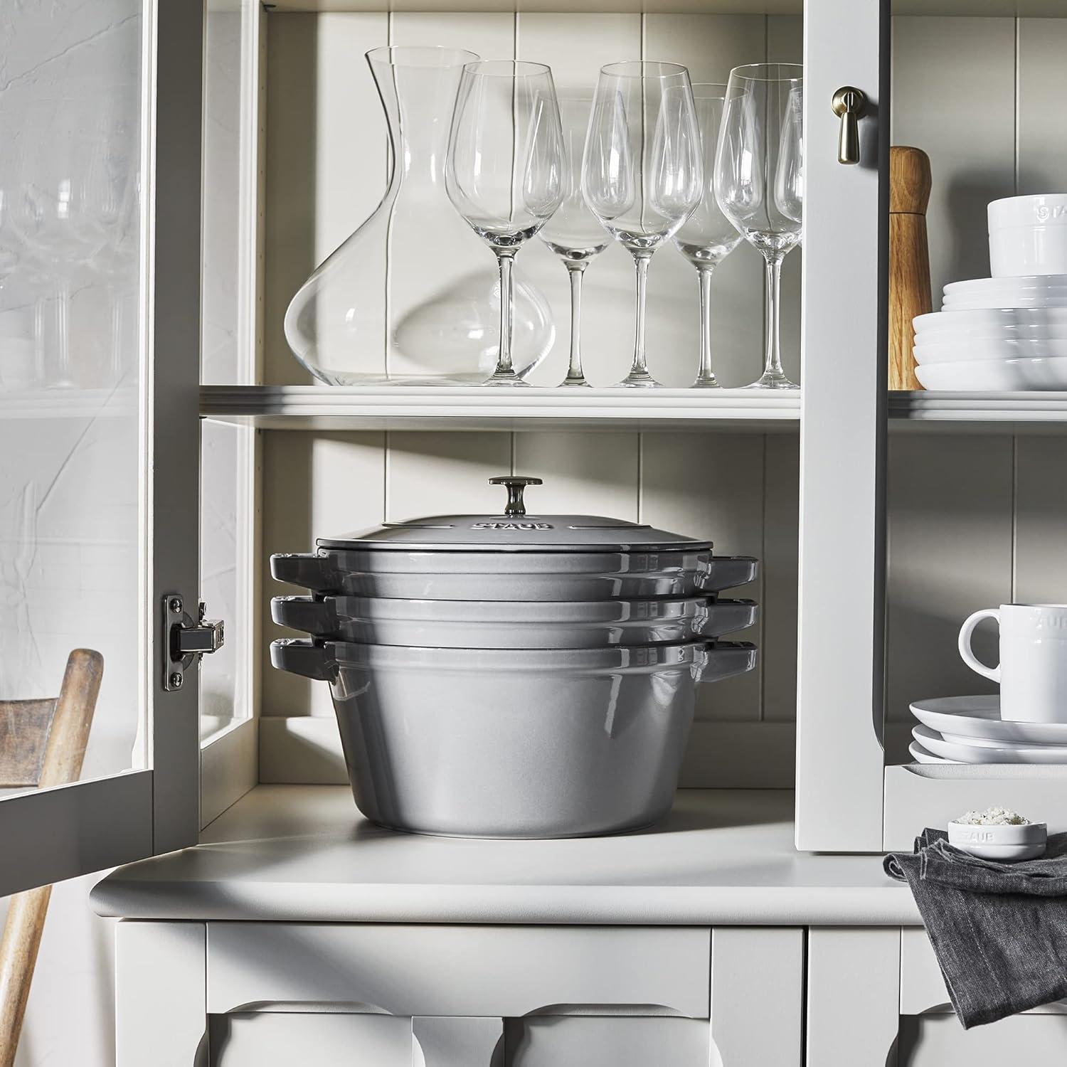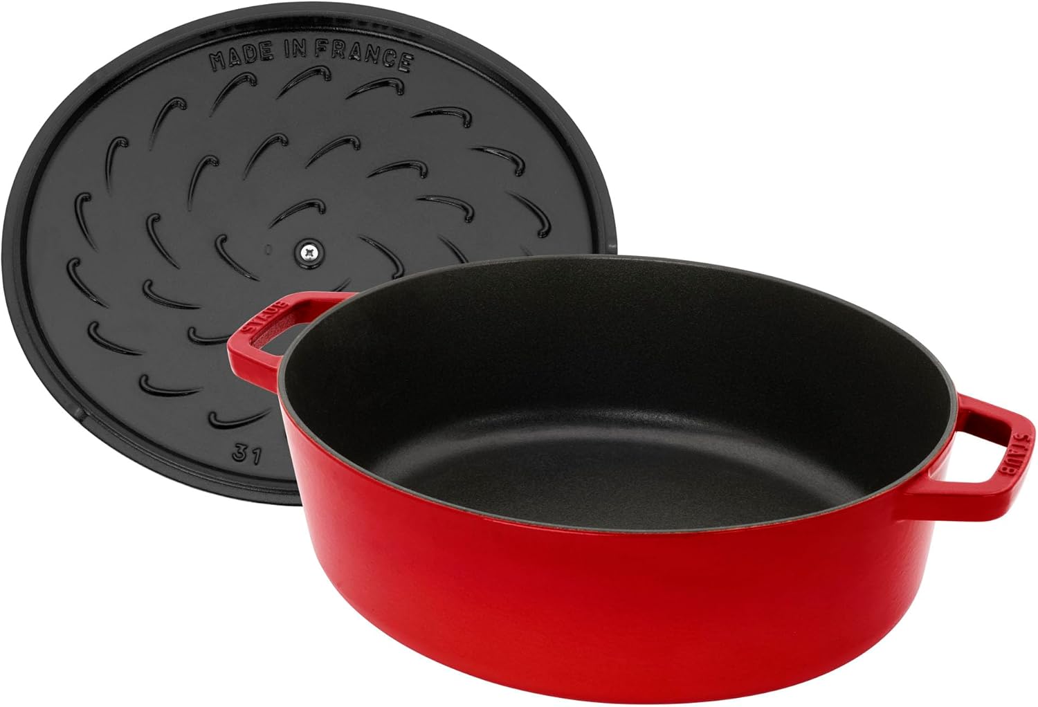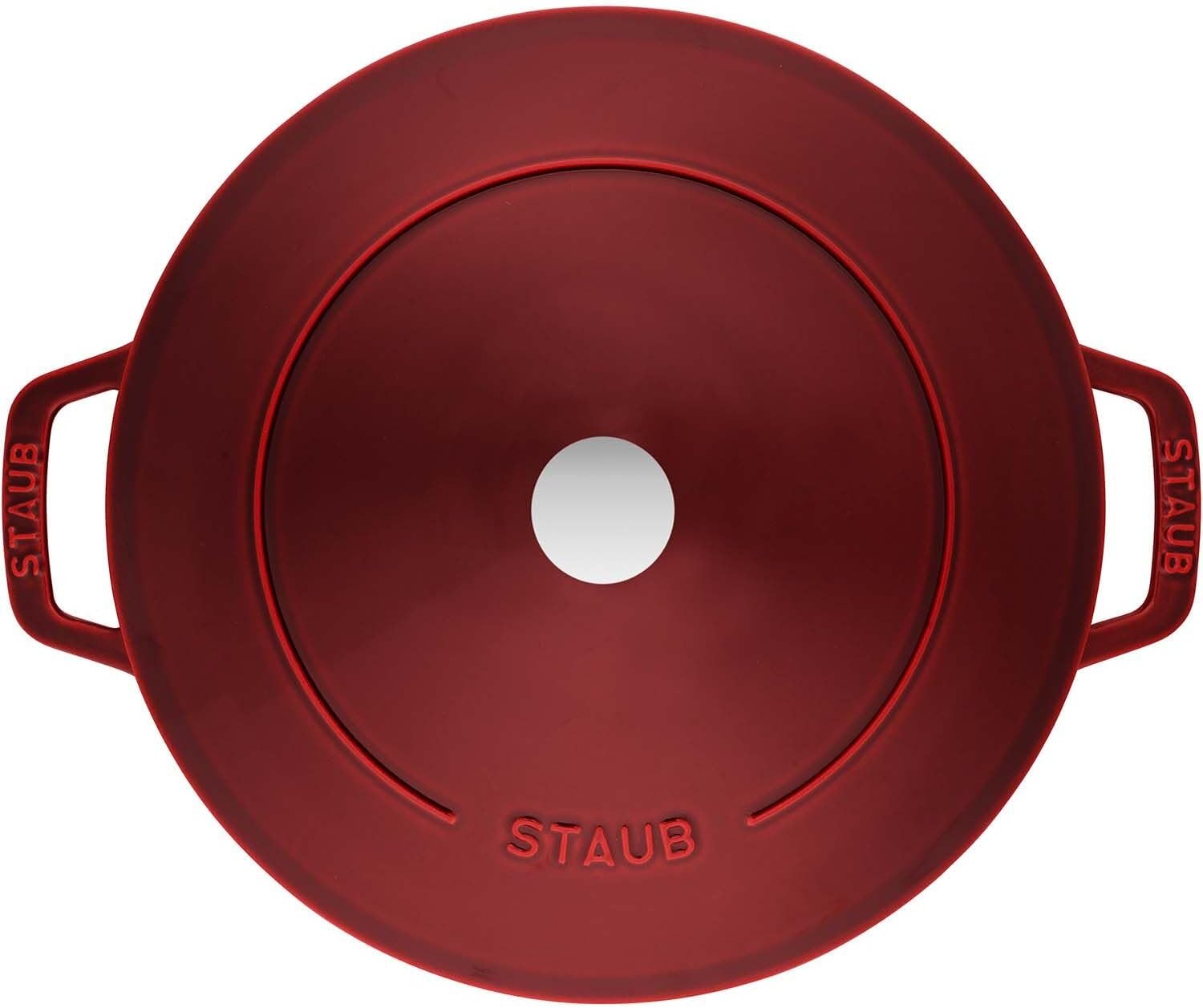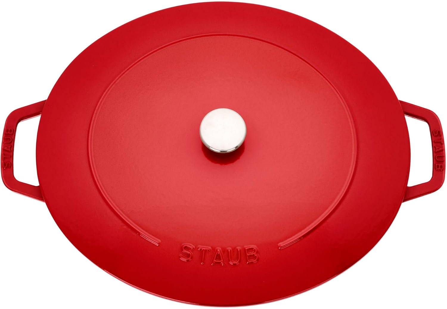 STAUB Cast Iron Set 4-pc, Stackable Space-Saving Cookware Set, Dutch Oven, Skillet, Grill Pan with Universal Lid, Made in France, Cherry