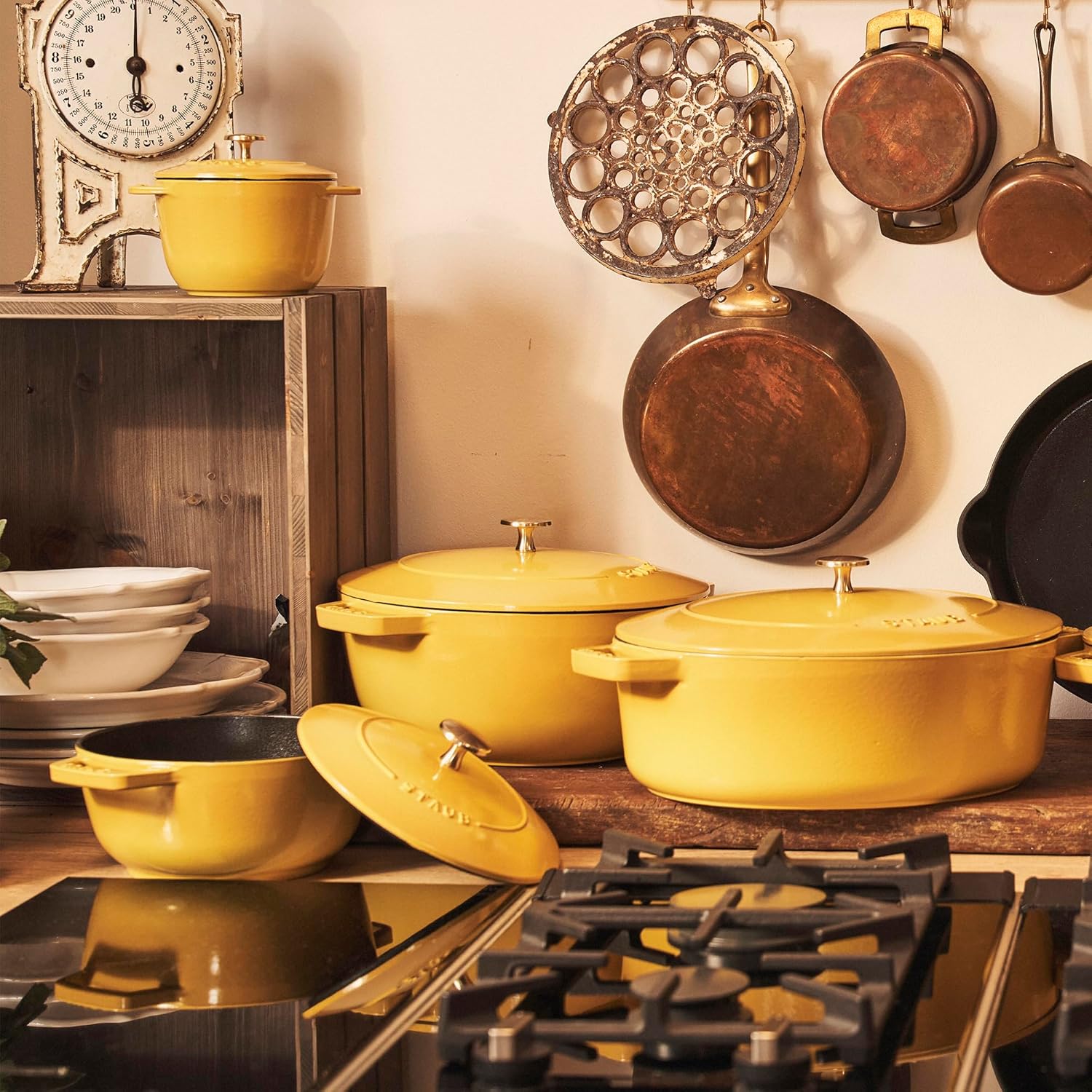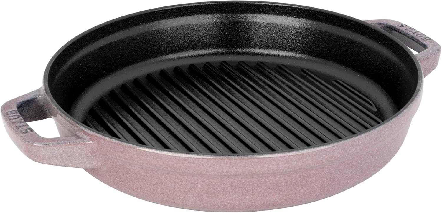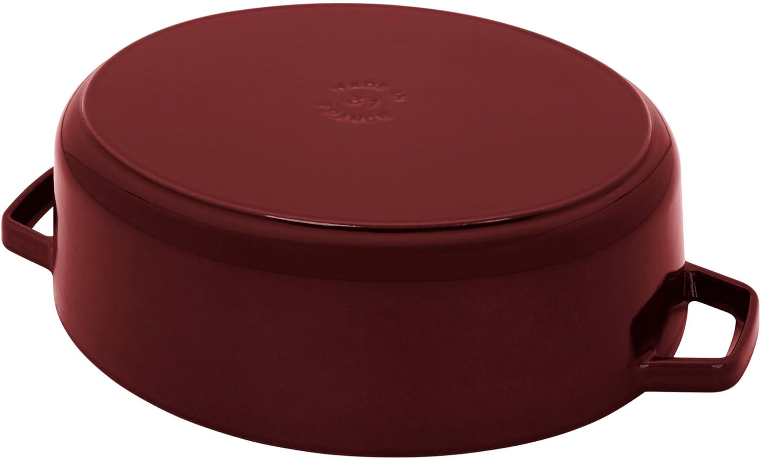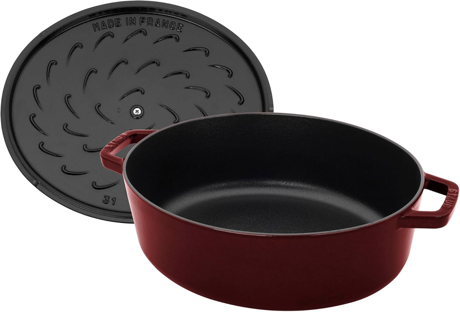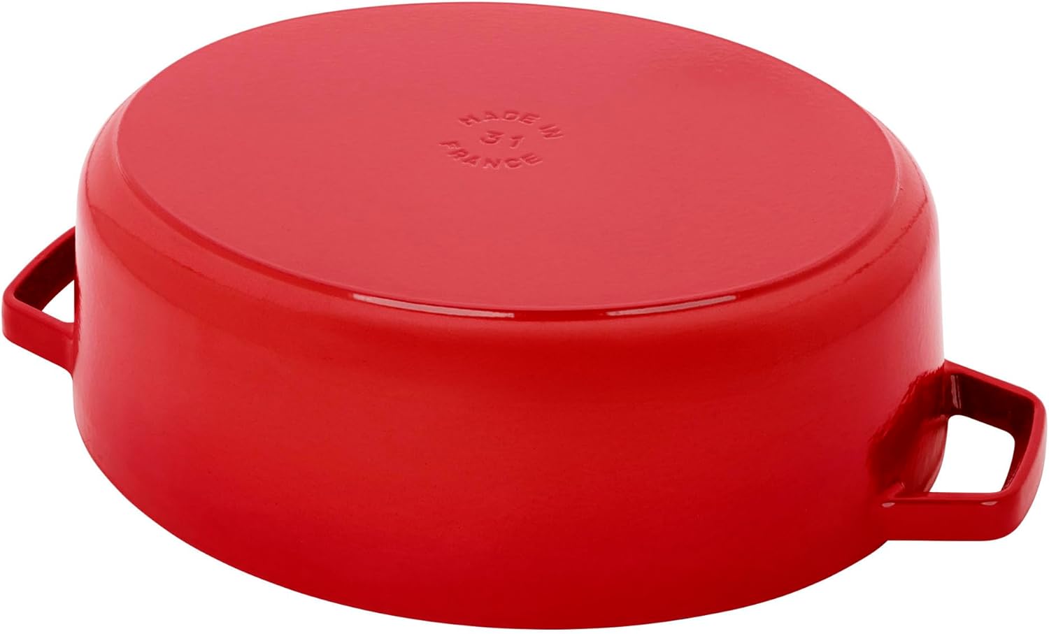STAUB Cast Iron Set 4-pc, Stackable Space-Saving Cookware Set, Dutch Oven, Skillet, Grill Pan with Universal Lid, Made in France, Cherry