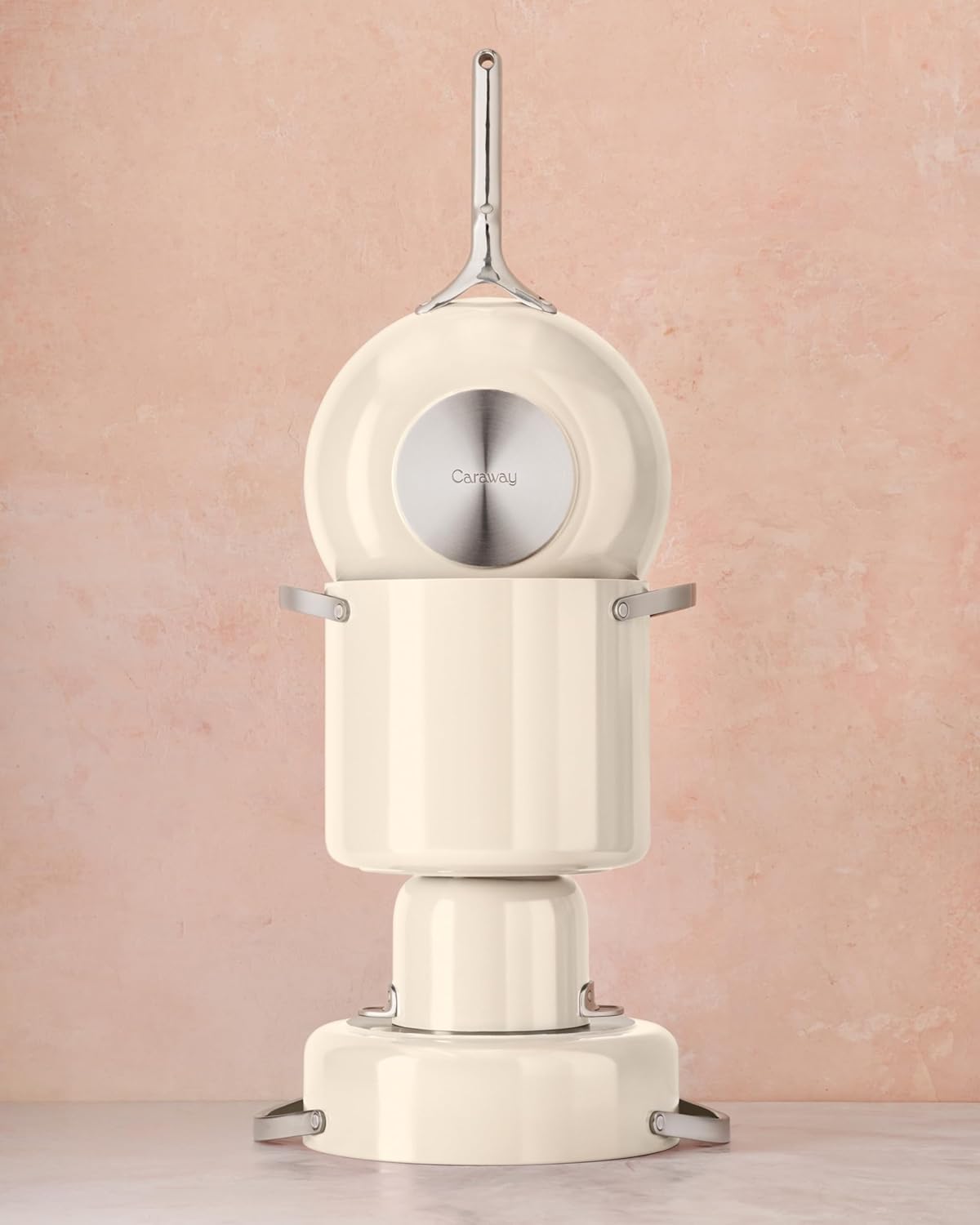 Caraway Cookware+ Collection - Specialty Cookware Set - Petite Cooker, Stir Fry Pan, Rondeau, & Stock Pot - 3 Lids & Storage Organizer Included - Cream
