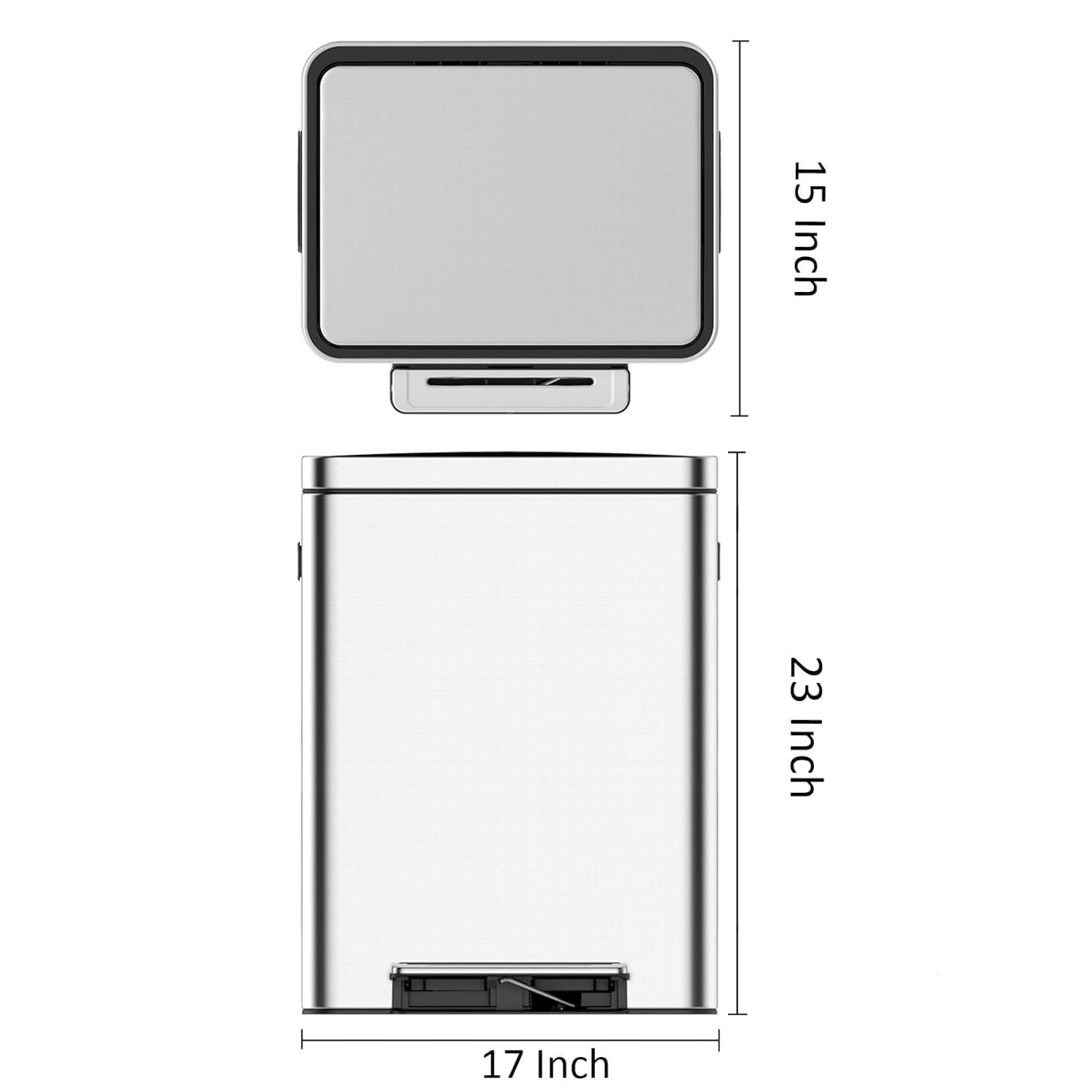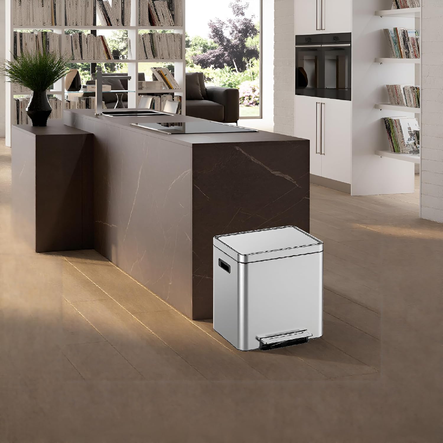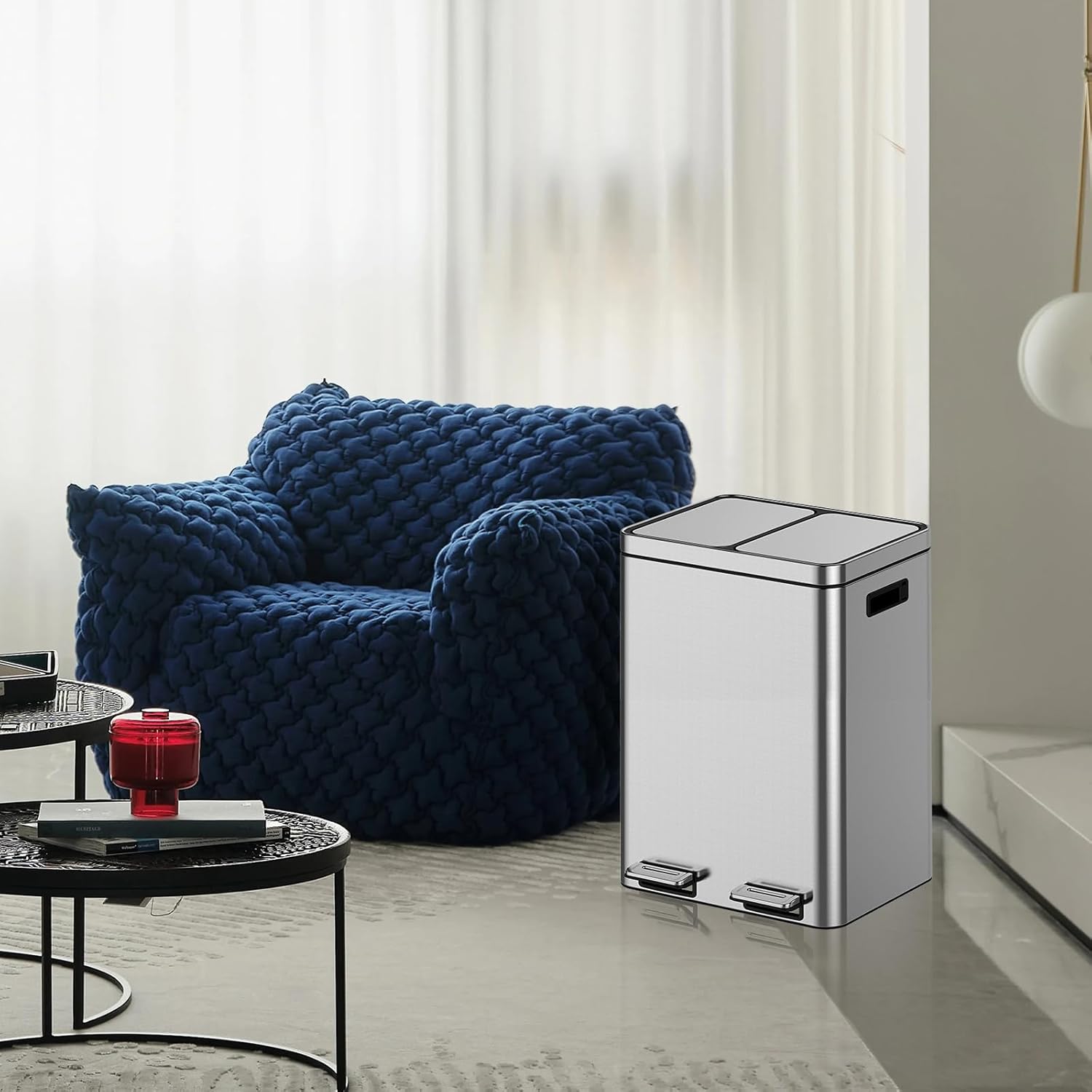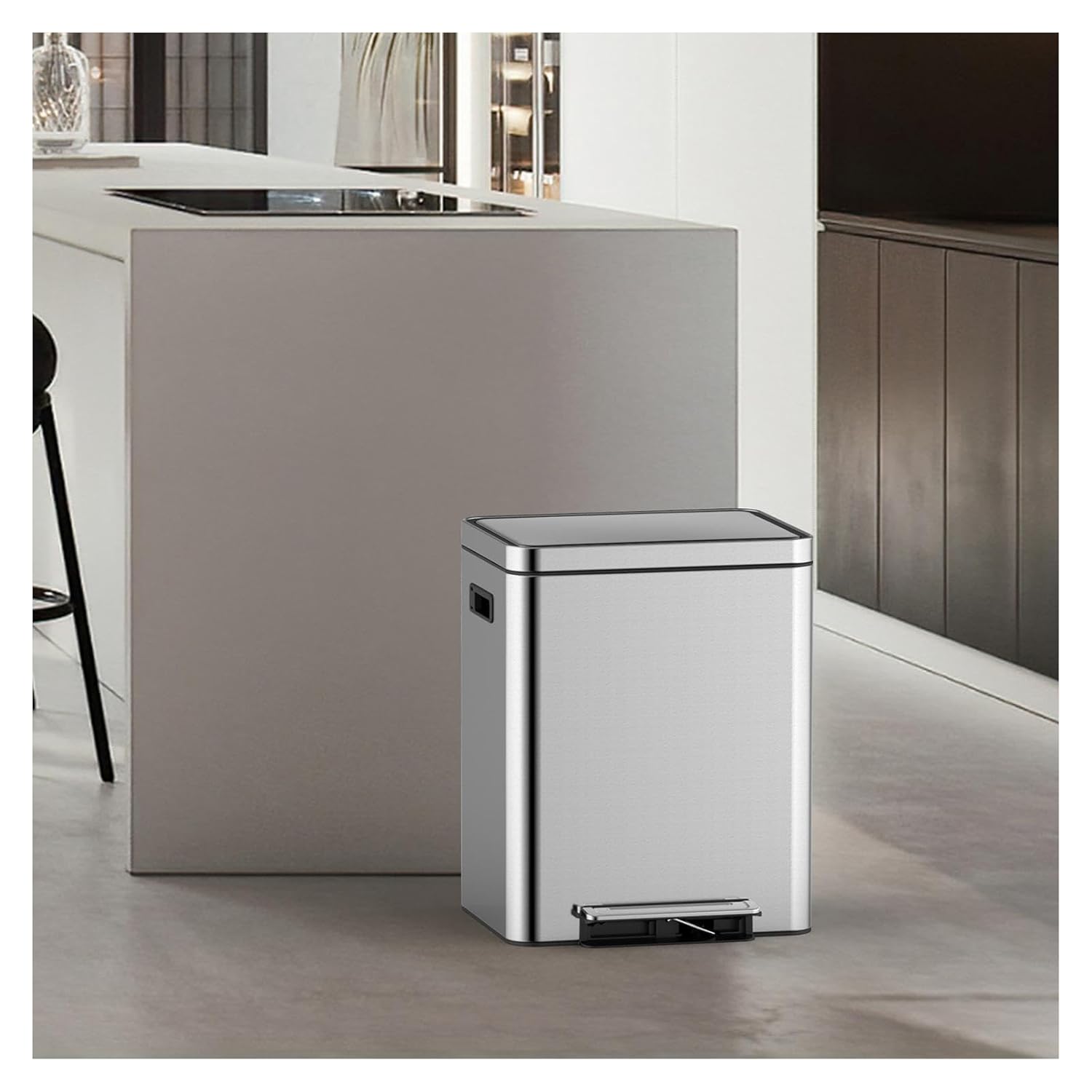 Garvee 16 gal Dual Trash Can, Stainless Steel Kitchen Garbage Can with Soft-Close Lid, Double Compartment Recycle Bin with 2 Removable Inner Buckets and Foot Pedal for Kitchen Home Office