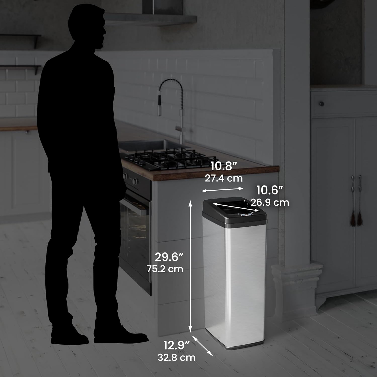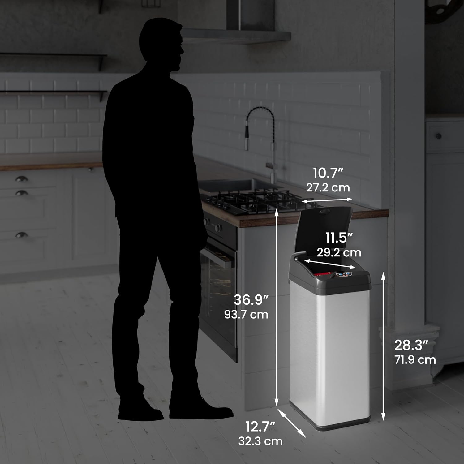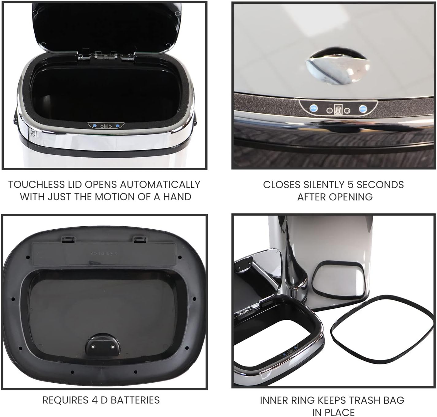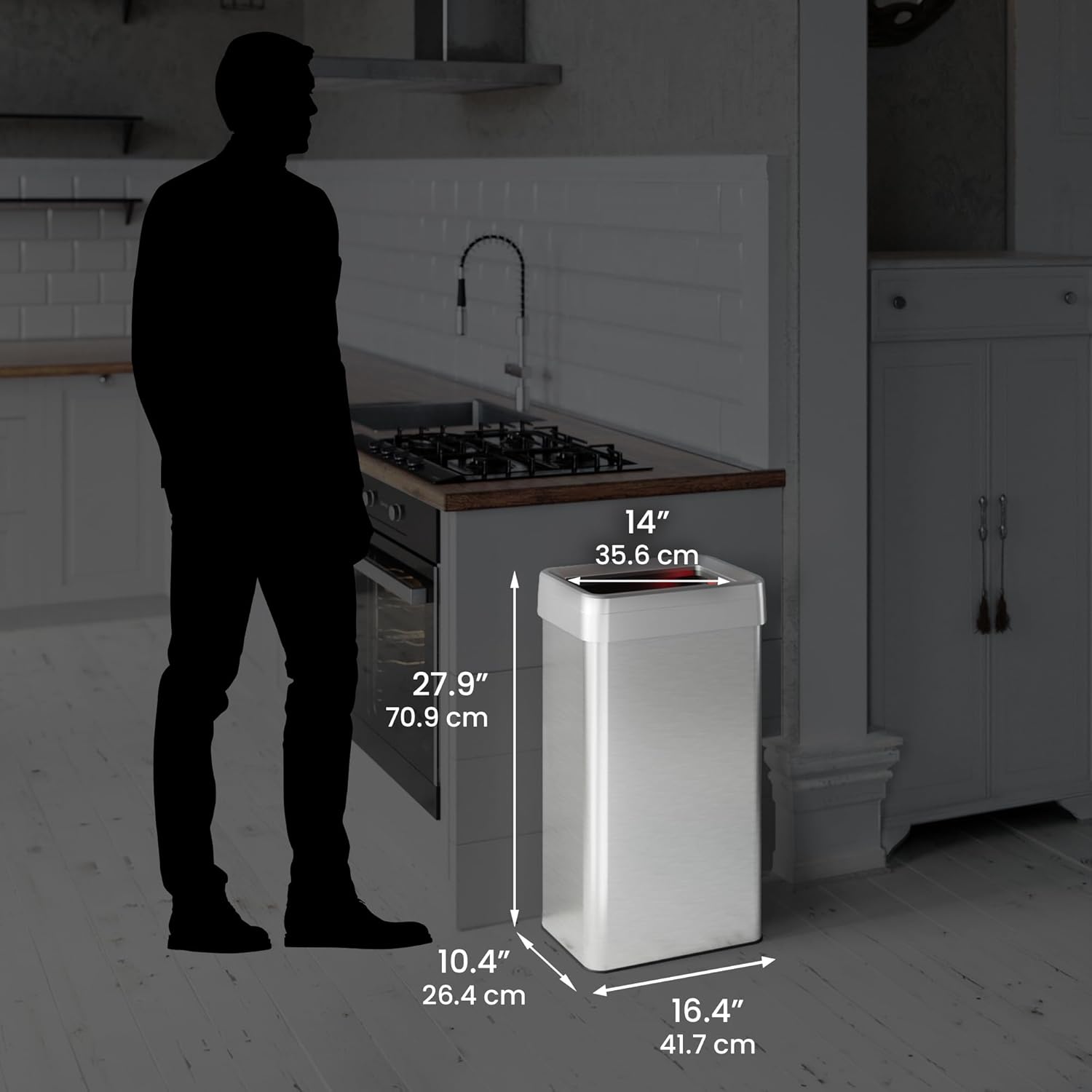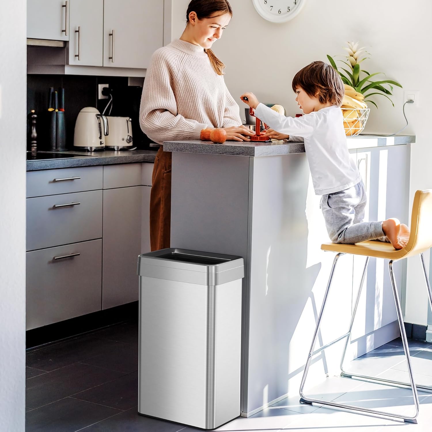 ELLO&ALLO 13 Gallon Kitchen Trash Can with Roll Up Lid, Automatic Touchless Motion Sensor Rectangular Trash Can, Brushed Stainless Steel Finish