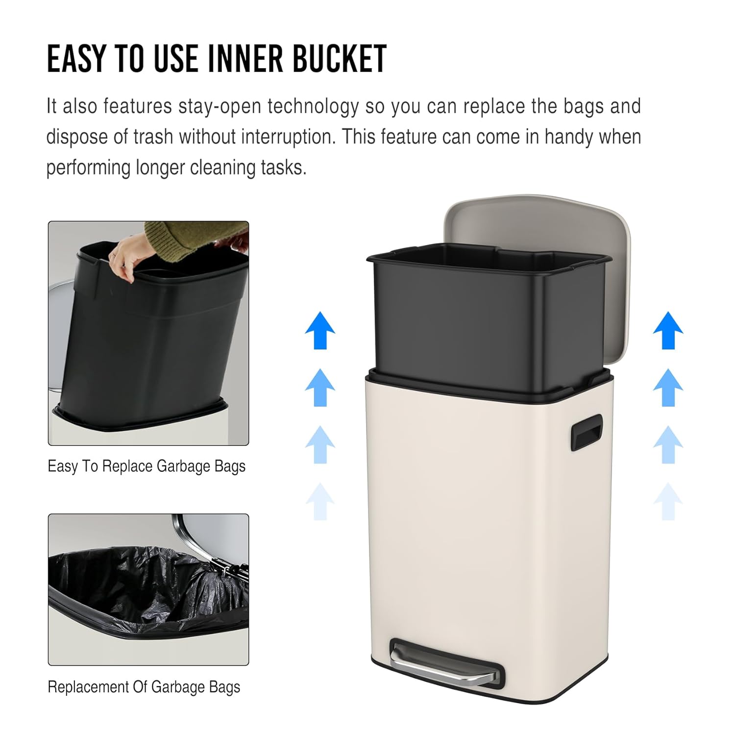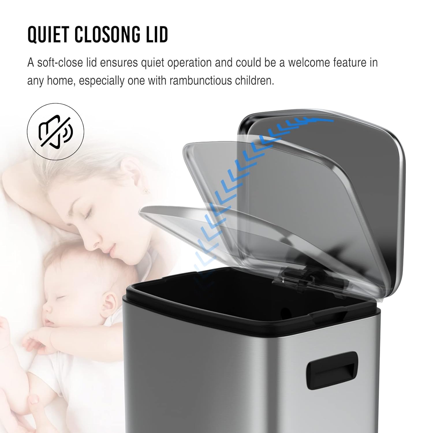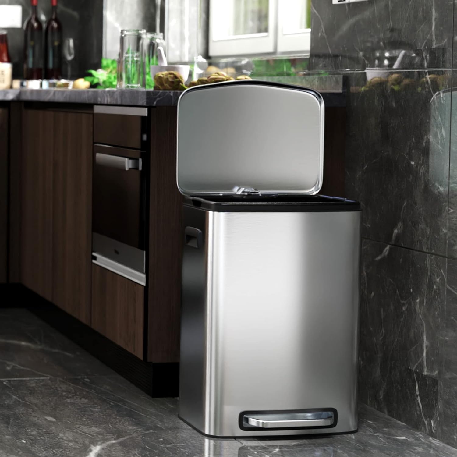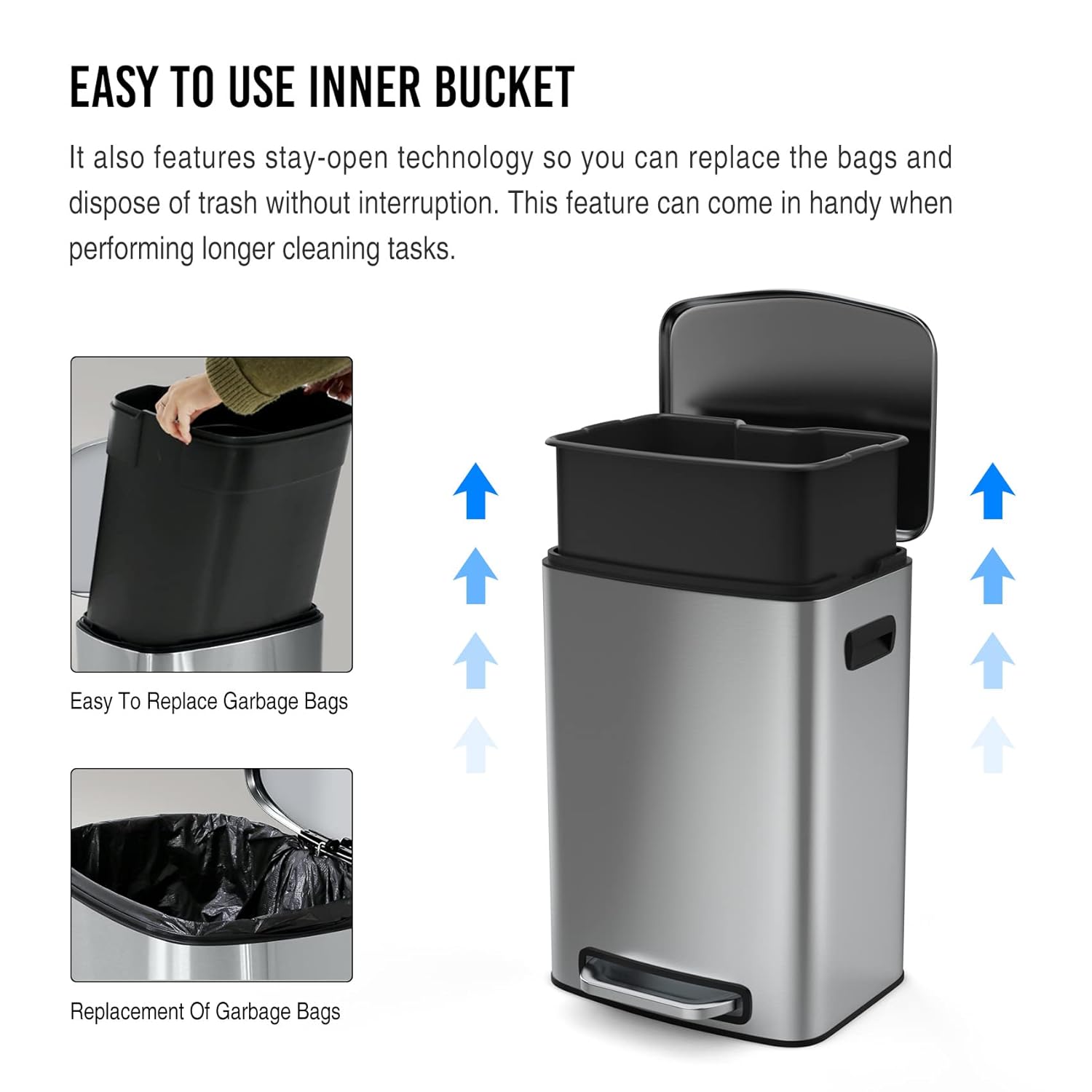 GarveeHome 56 L/14.8 gal Step-On Kitchen Trash Can with Butterfly Lid,2 * 7.4 gal Dual Compartments Garbage Can with Wing Lid, Slim Pedal Stainless Steel Trash Bin with Removable Buckets