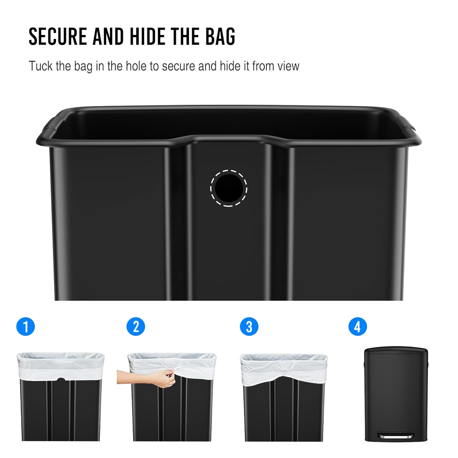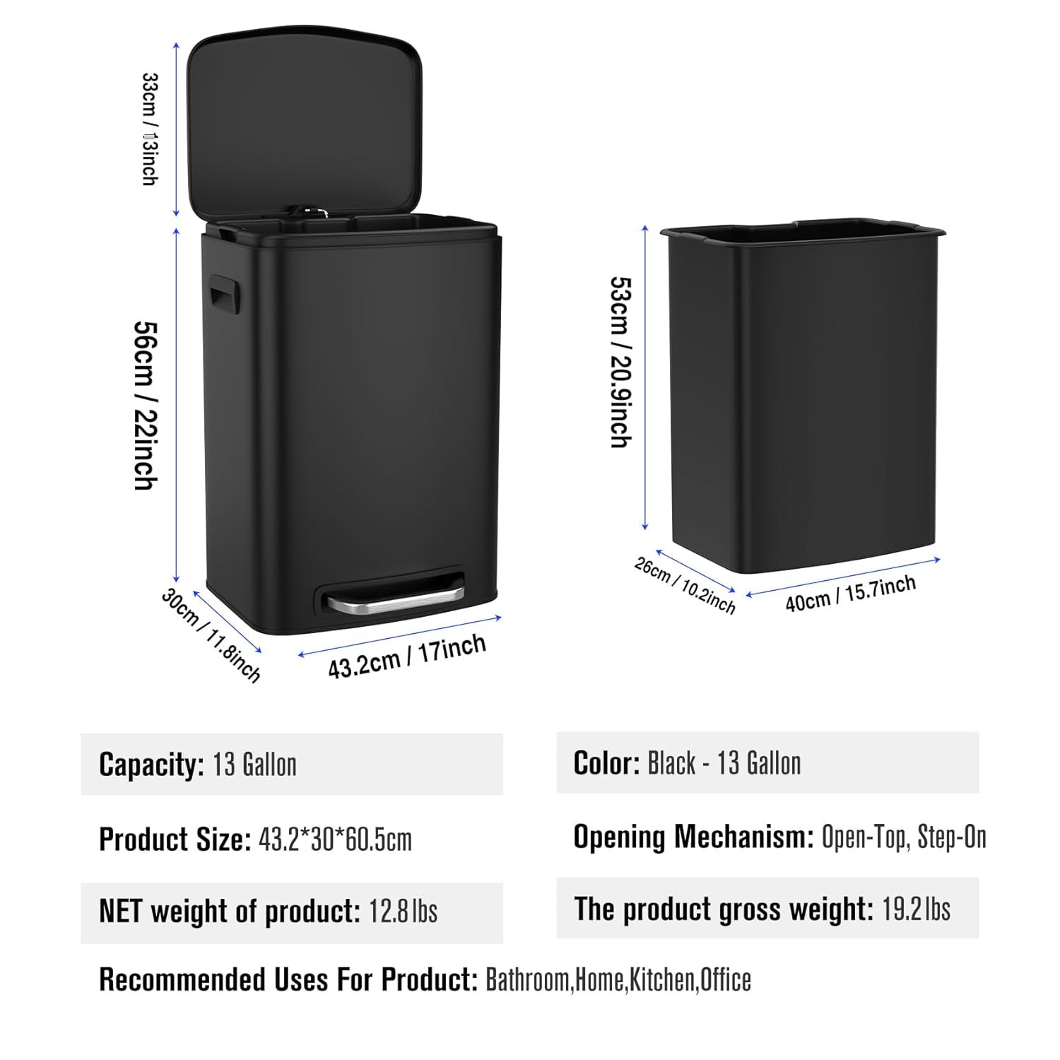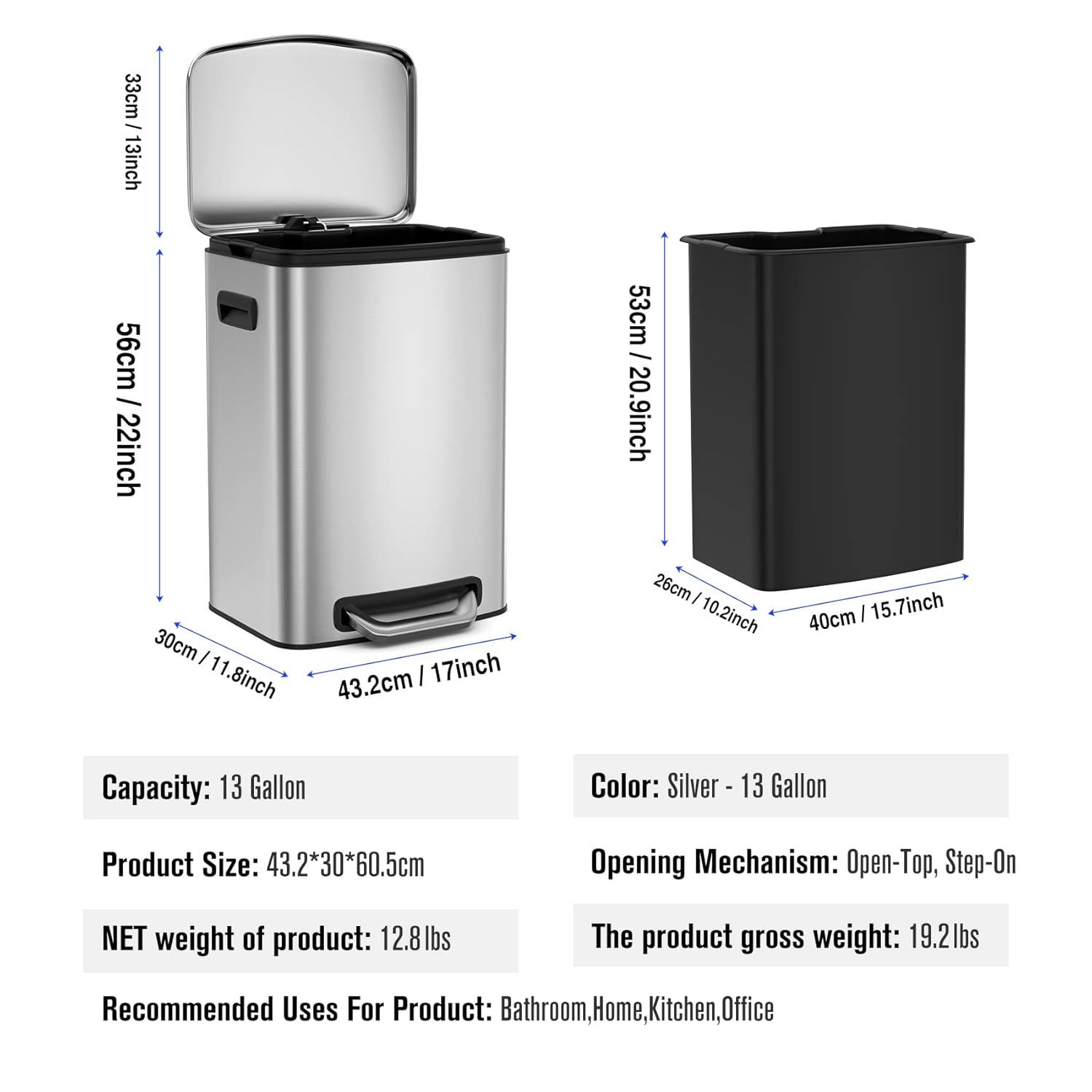 13 Gallon Foot Pedal Large Trash Can with Soft Close Quiet Lid, Stainless Steel Thickened Body Rectangular Garbage Can with 30 Garbage Bags for Home Kitchen, Office, Commercial, Home and More - Silver