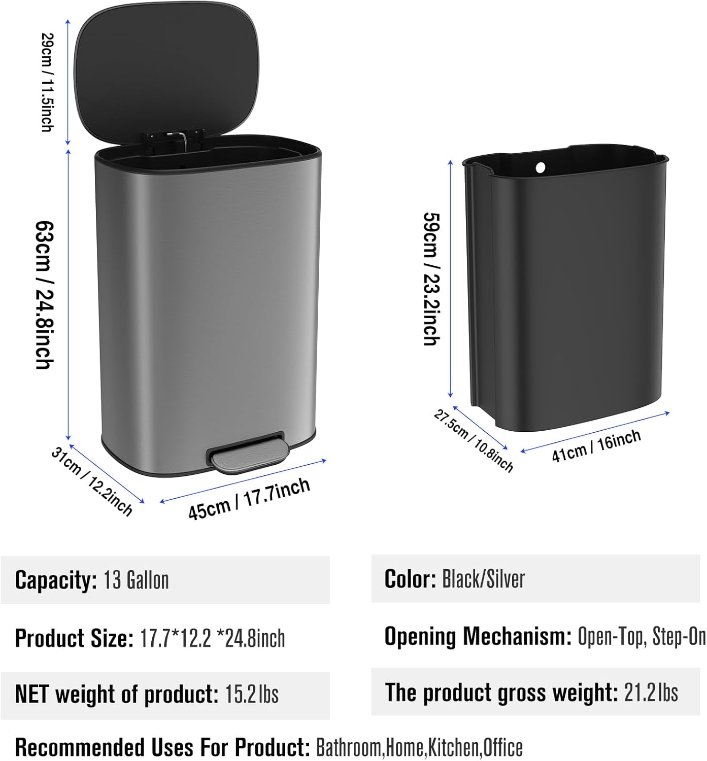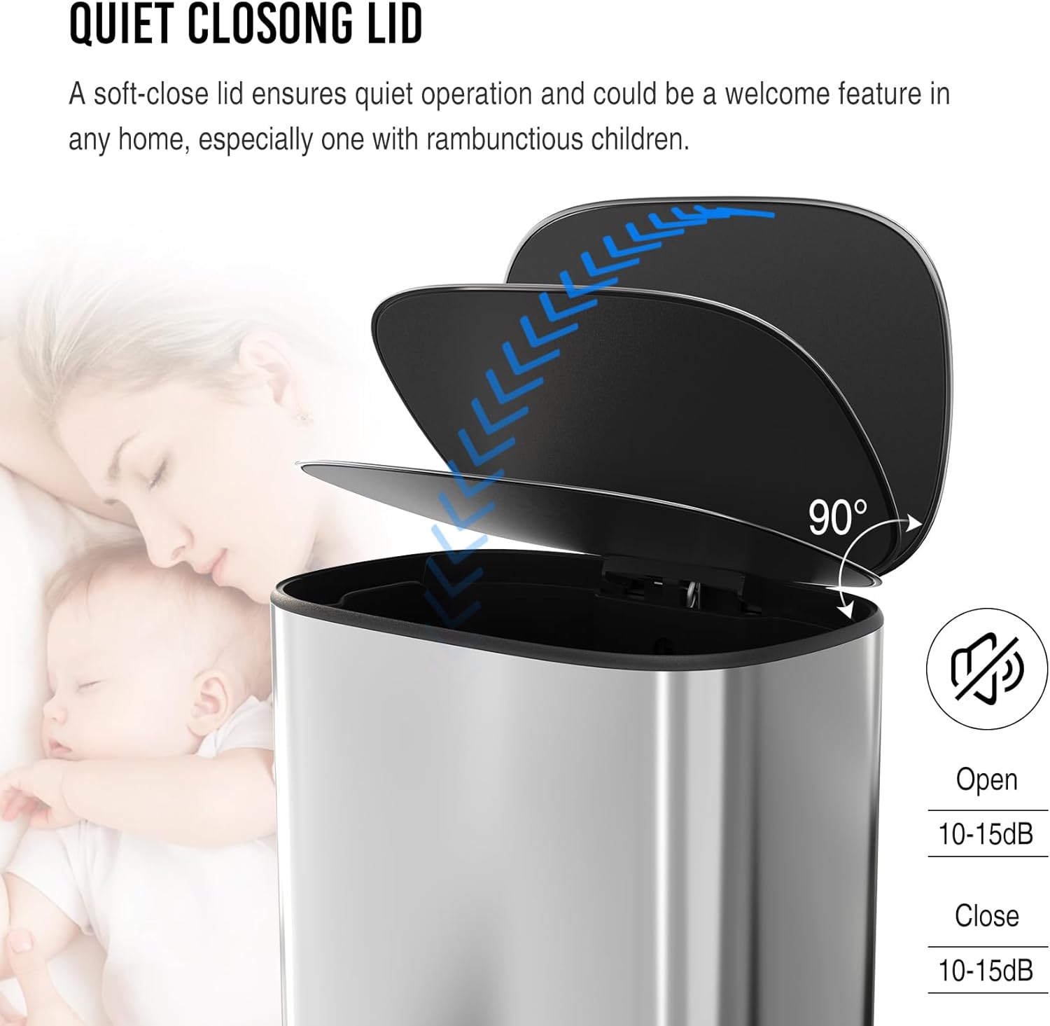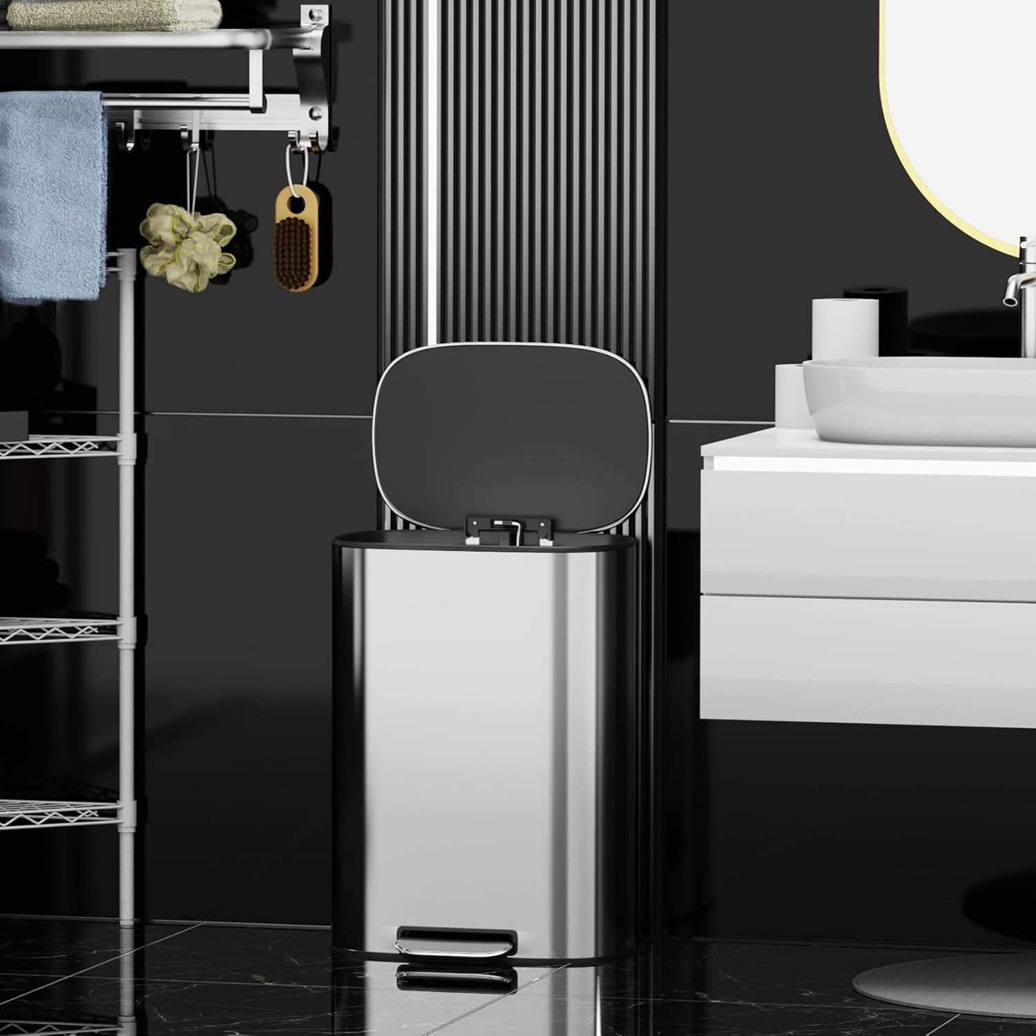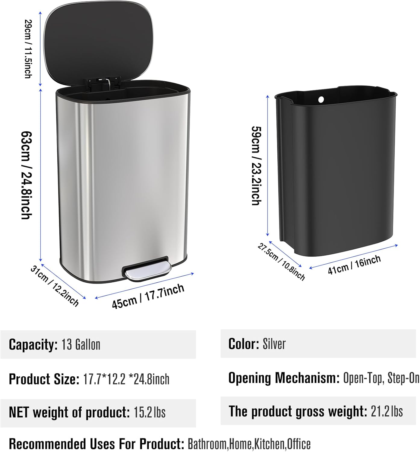 Dolonm 13 Gallon Stainless Steel Foot Pedal Large Trash Can with Soft Close Quiet Lid, Oval Shape, 12.2"L x 17.7"W x 24.8"H, Silver