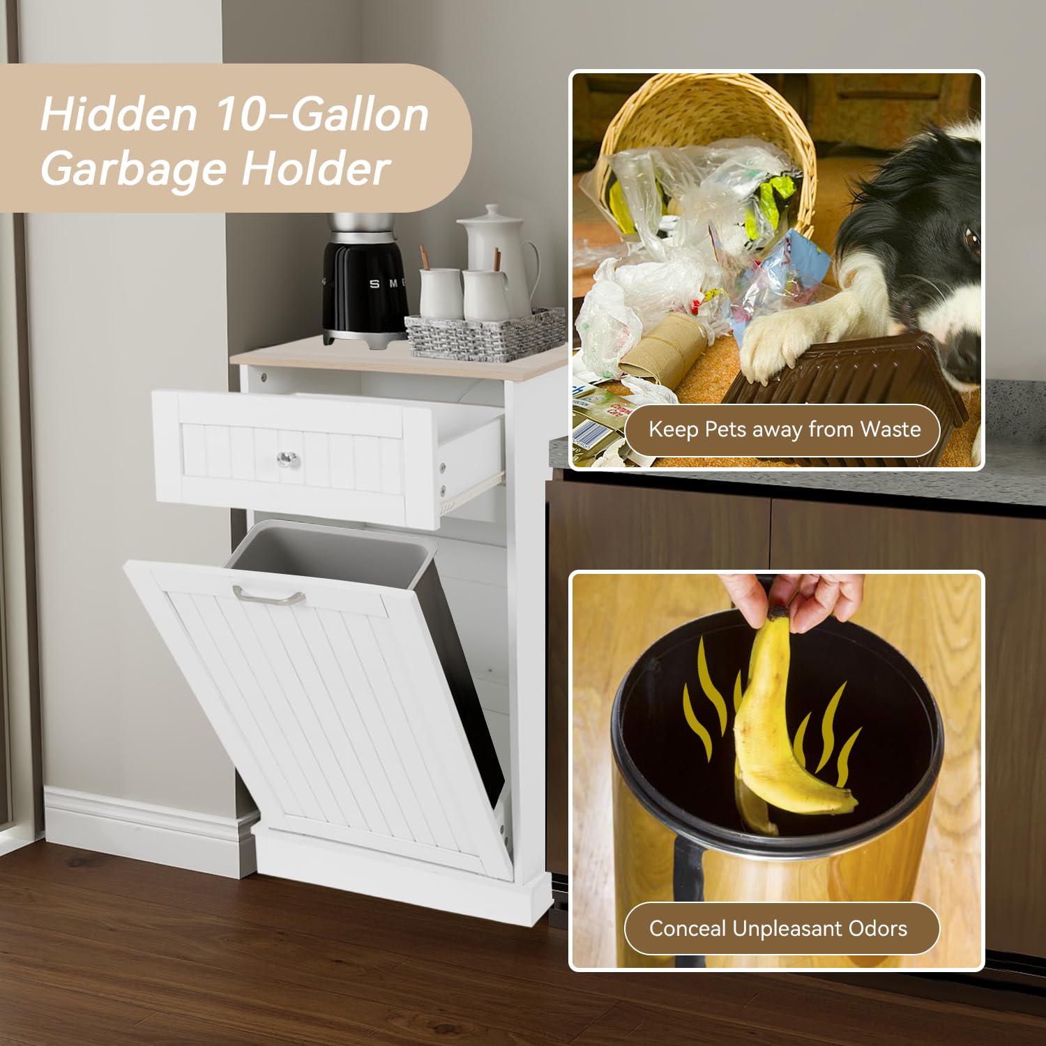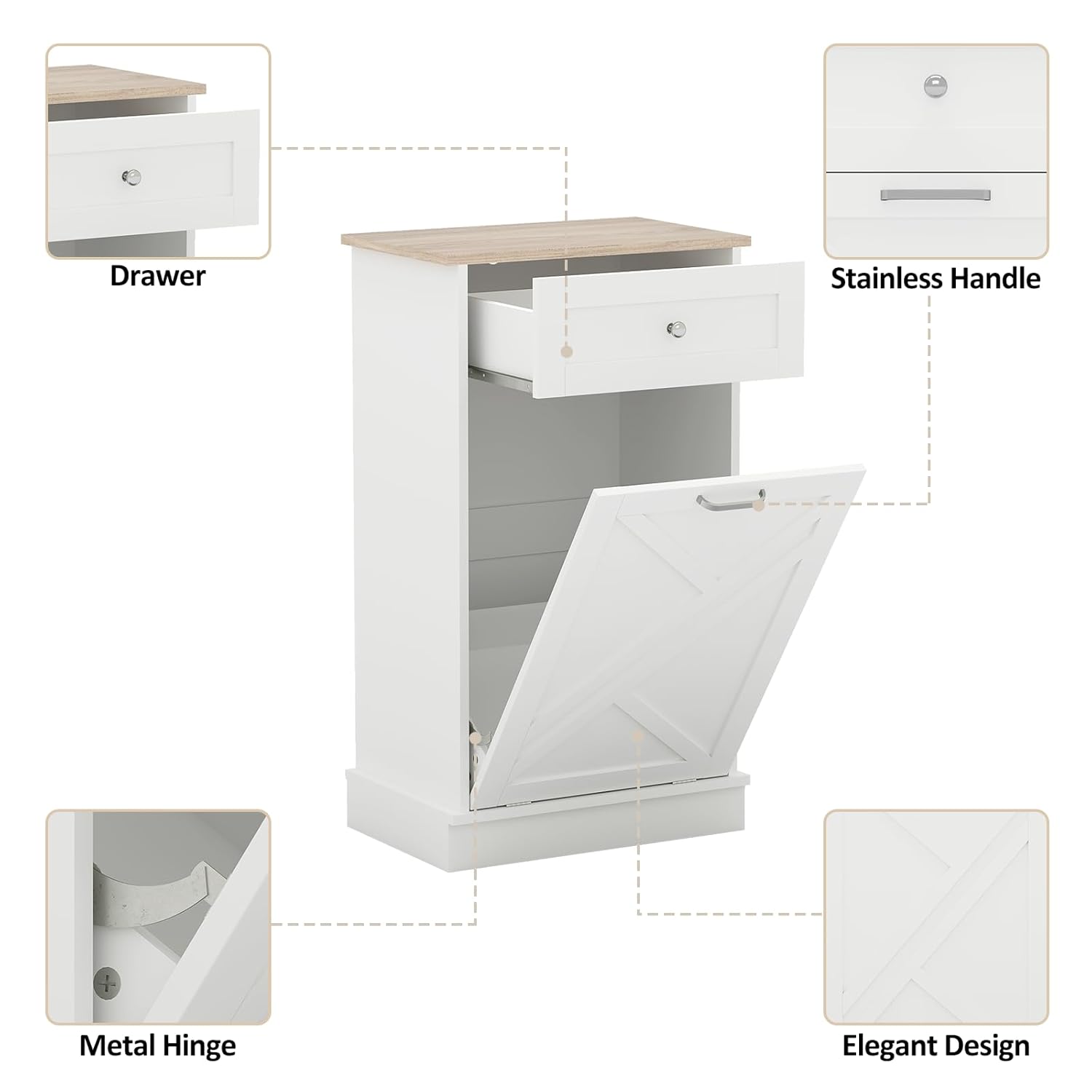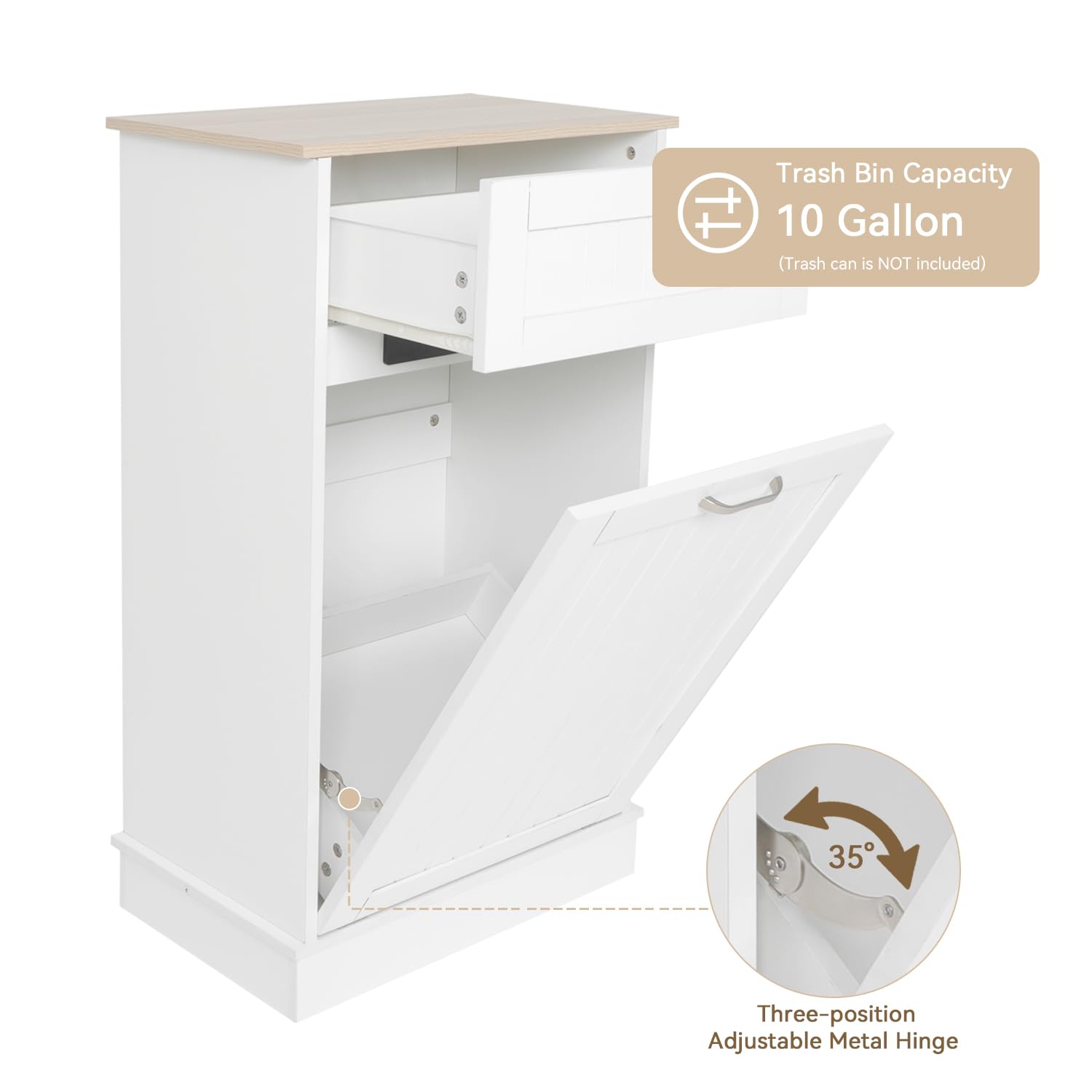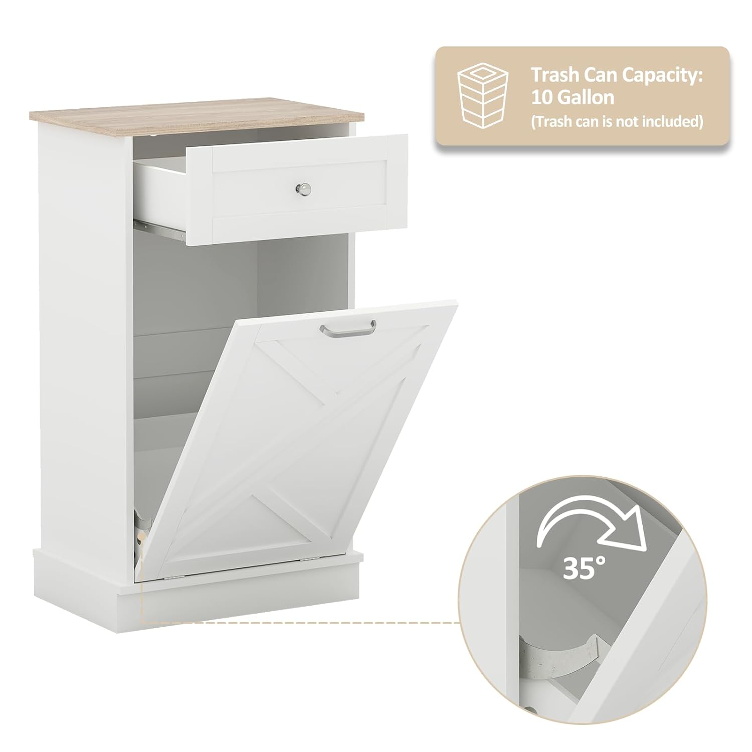 Tilt Out Trash Cabinet-Free Standing Kitchen Waste Bin-Wooden Recycling Trash Cabinet with Drawer-White