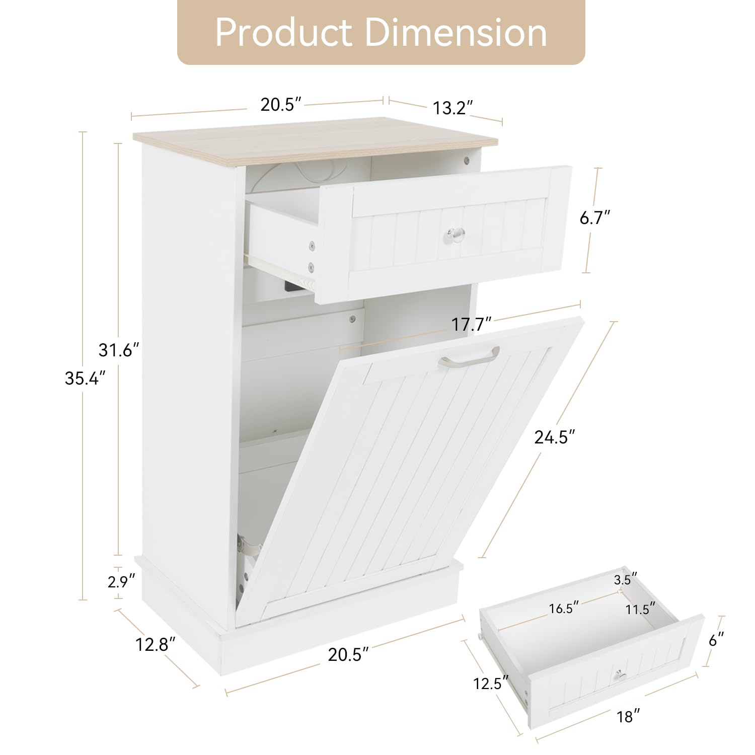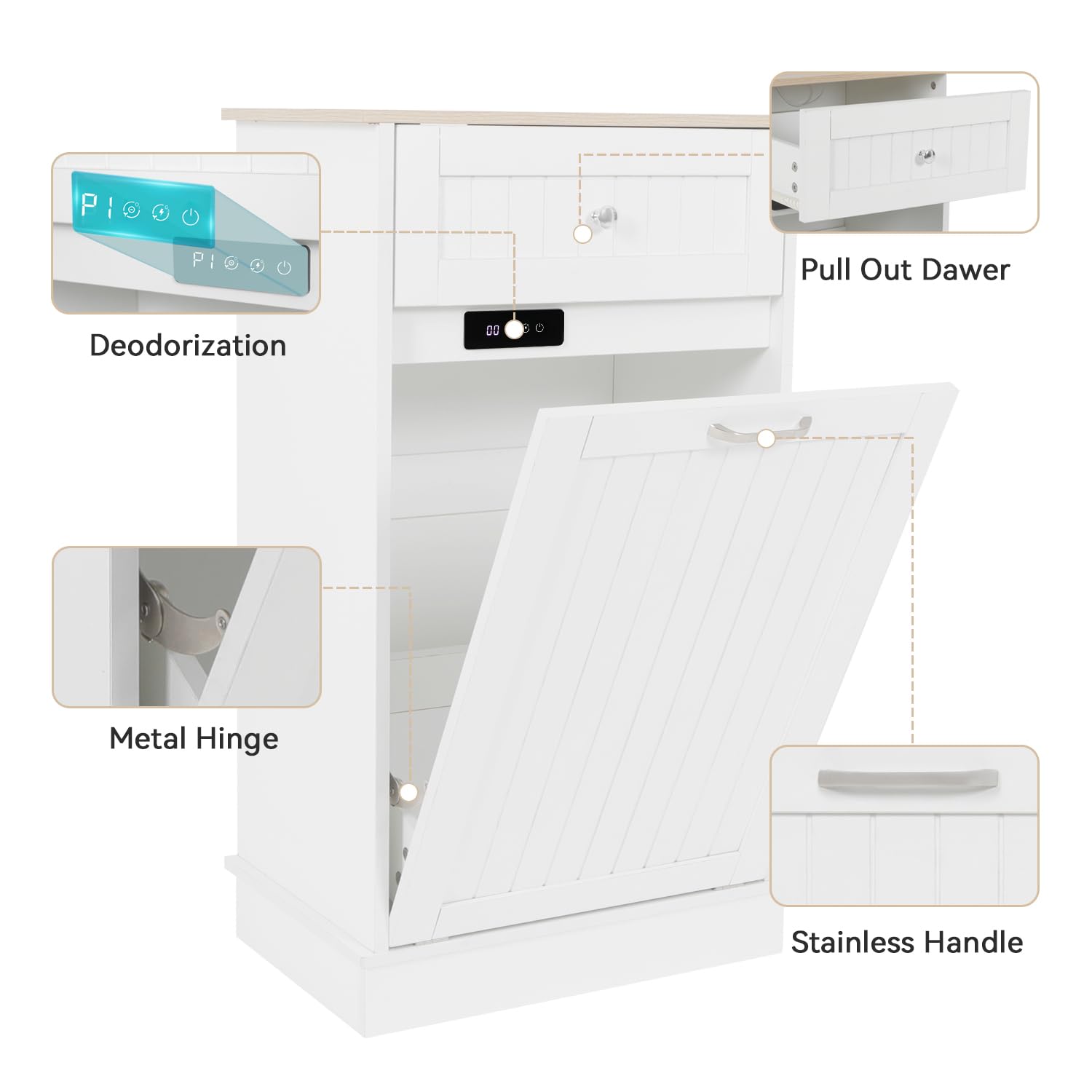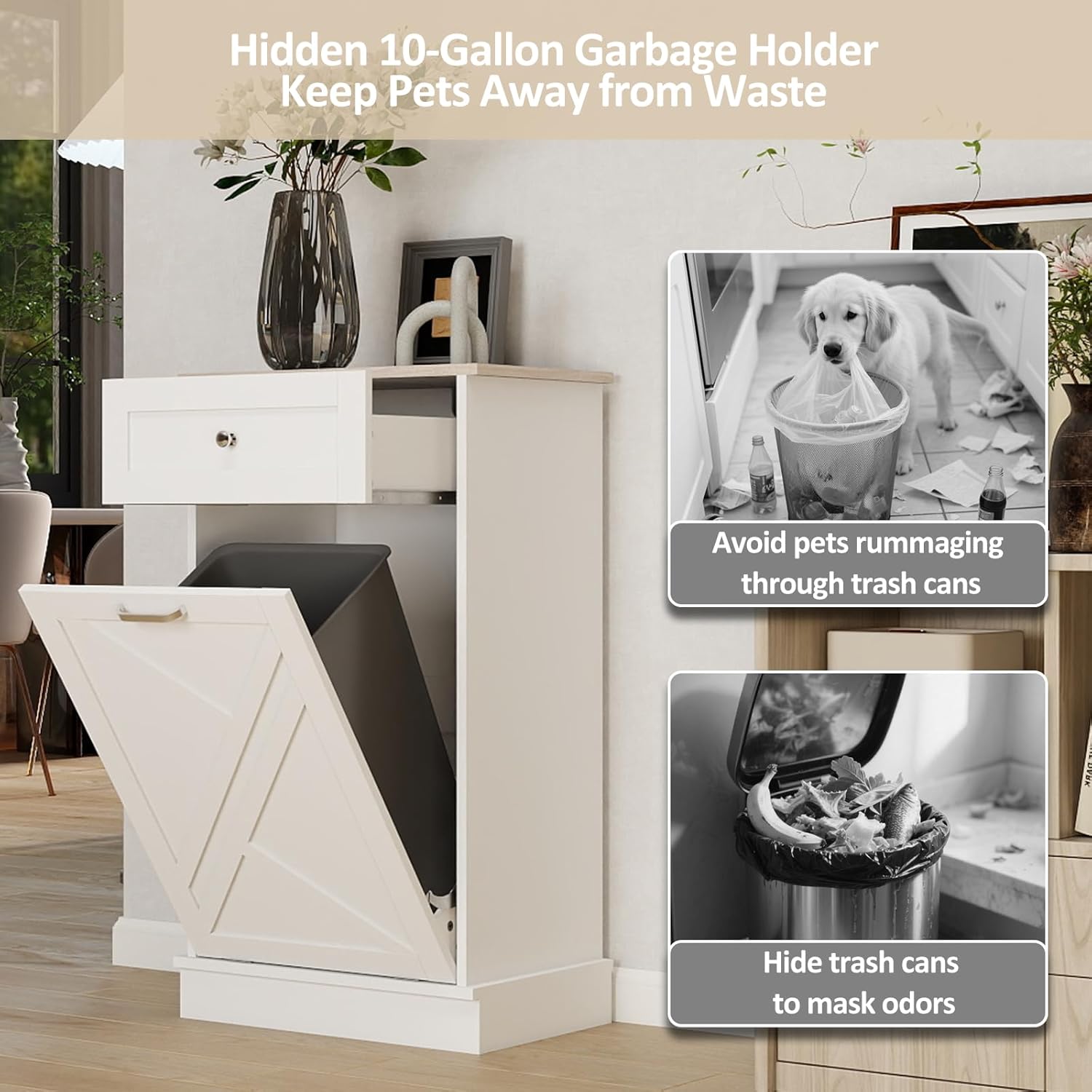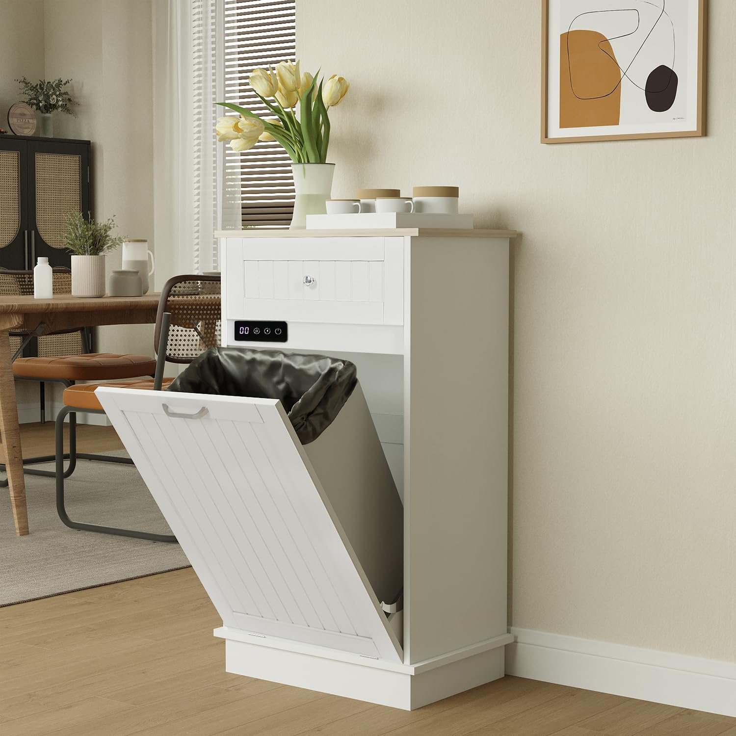 Tilt Out Trash Cabinet-Free Standing Kitchen Waste Bin-Wooden Recycling Trash Cabinet with Drawer-White