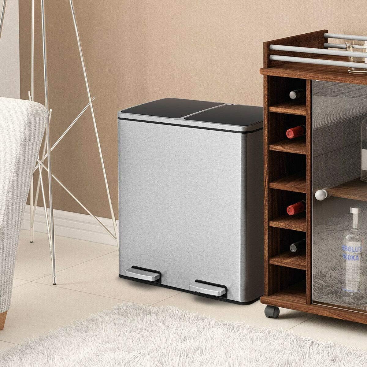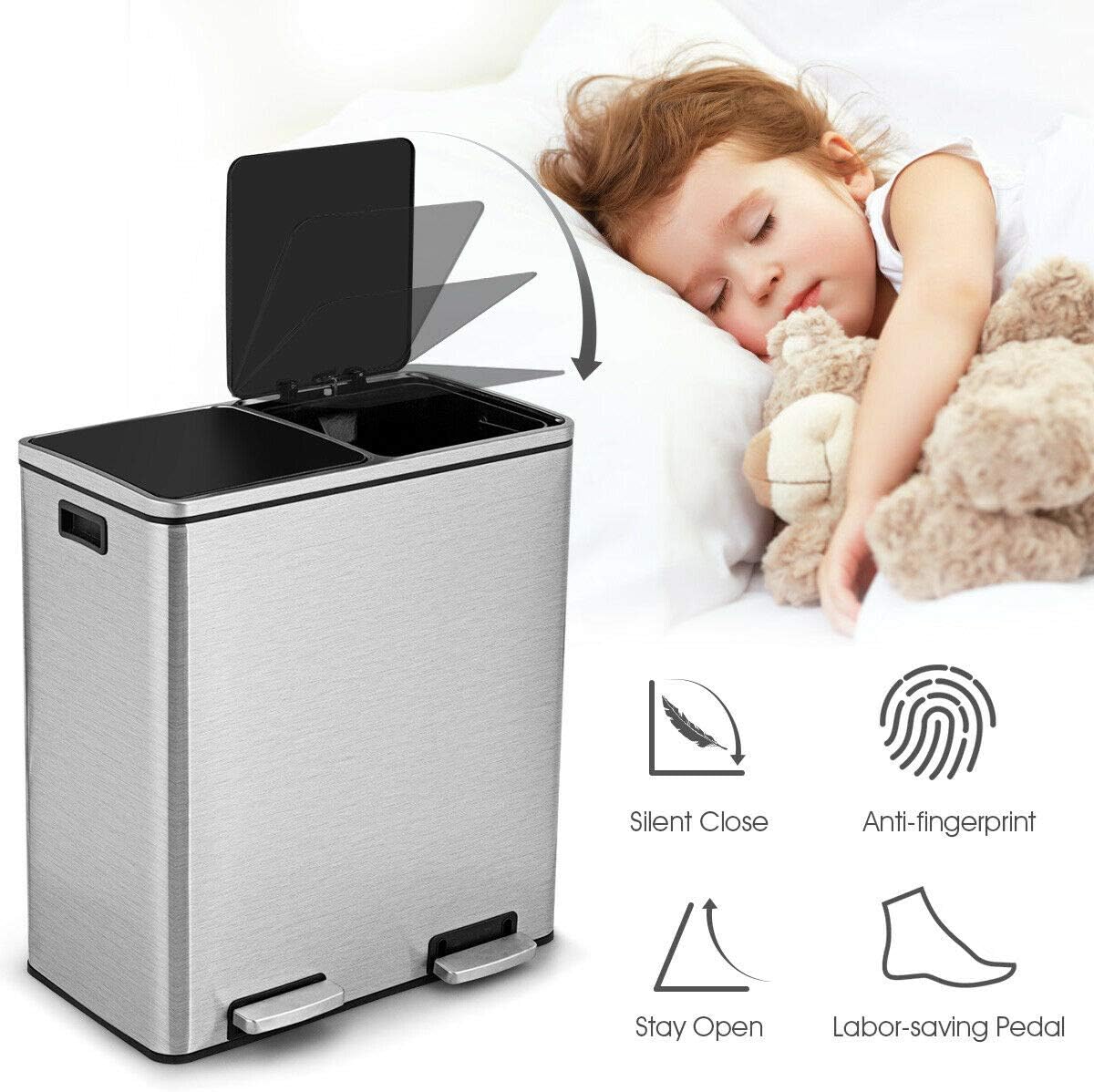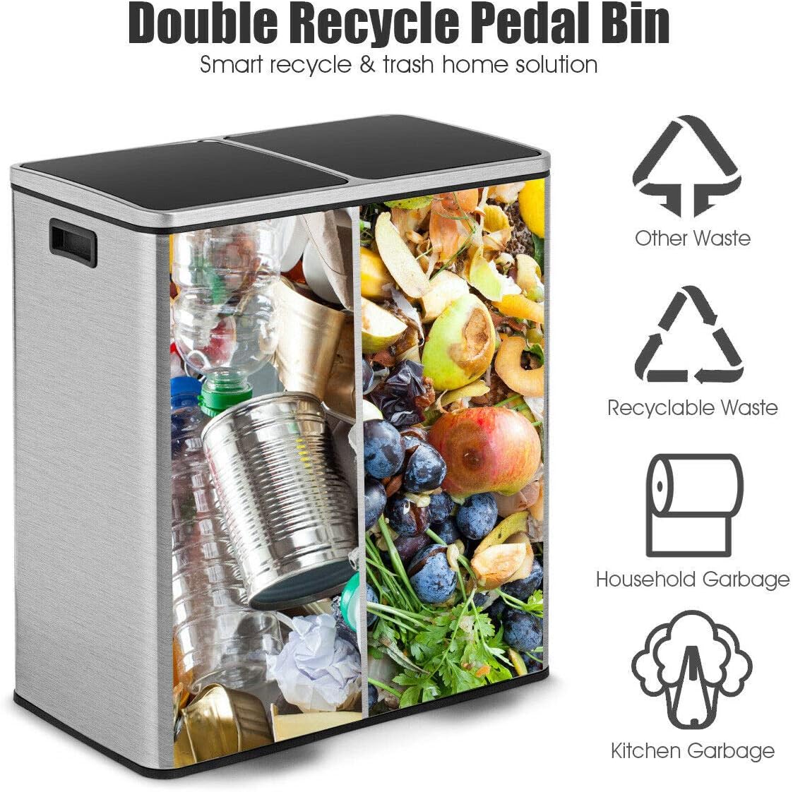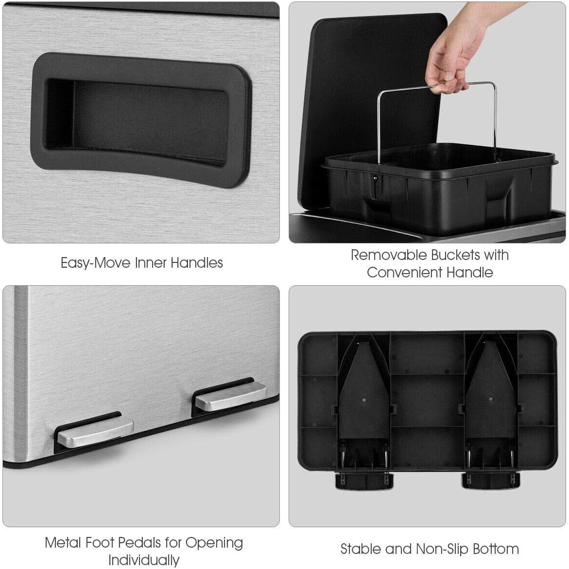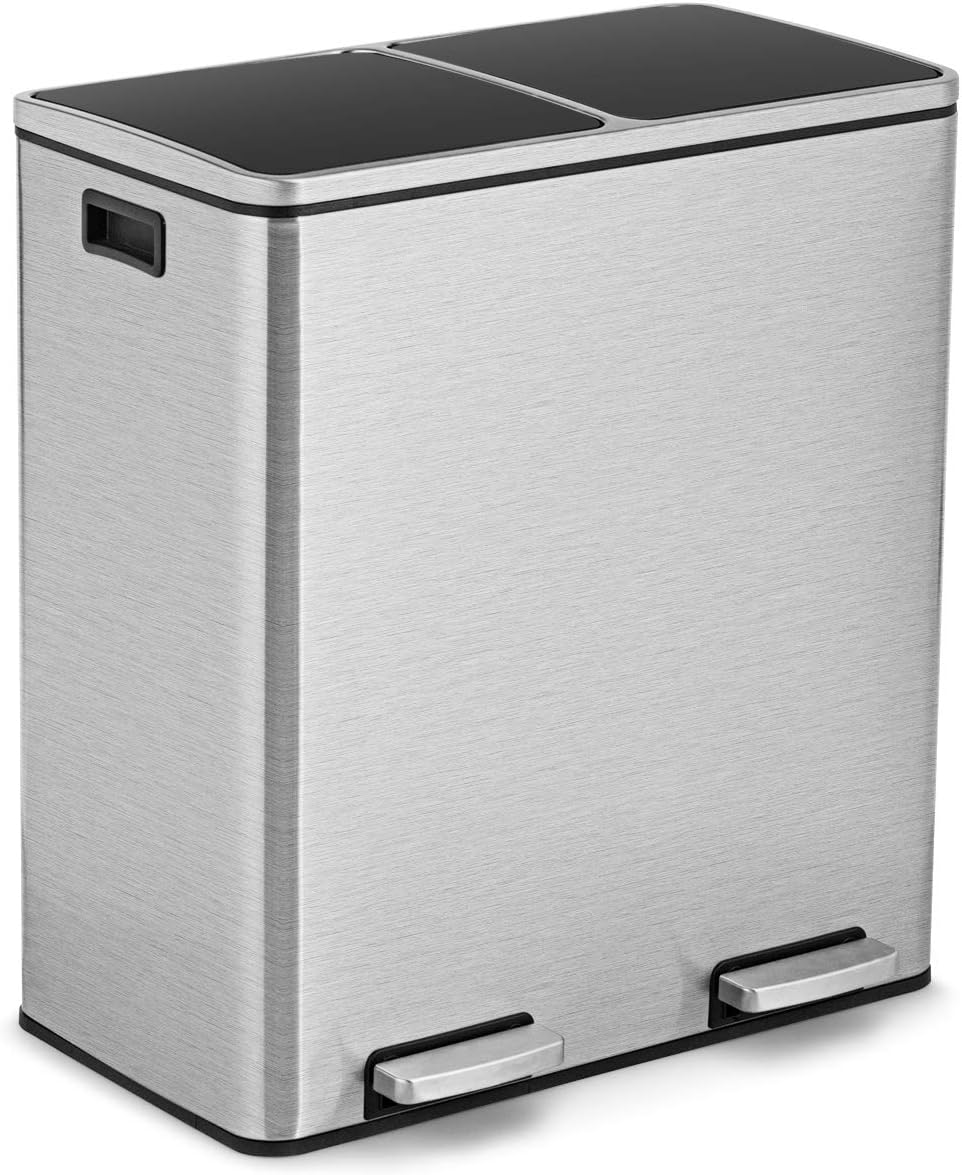 Goplus Dual Trash Can, 60 Liter (2x30L)/ 16 Gallon Stainless Steel Step Trash Can, Rectangular Garbage Bin with Inner Buckets and Hinged Lids, Suit for Kitchen Office Home Use,Black