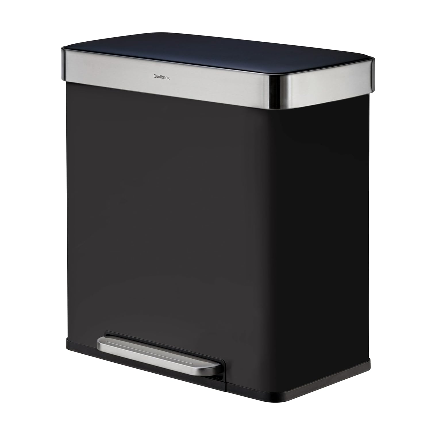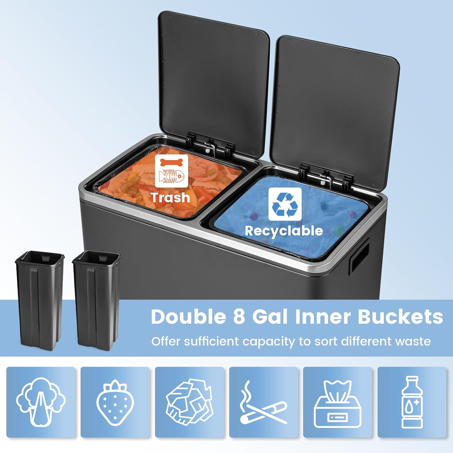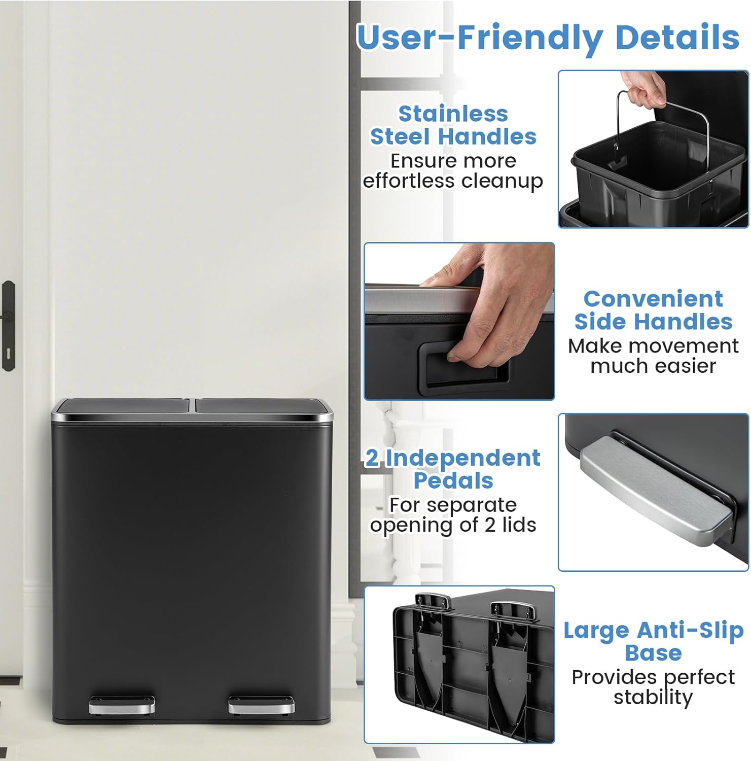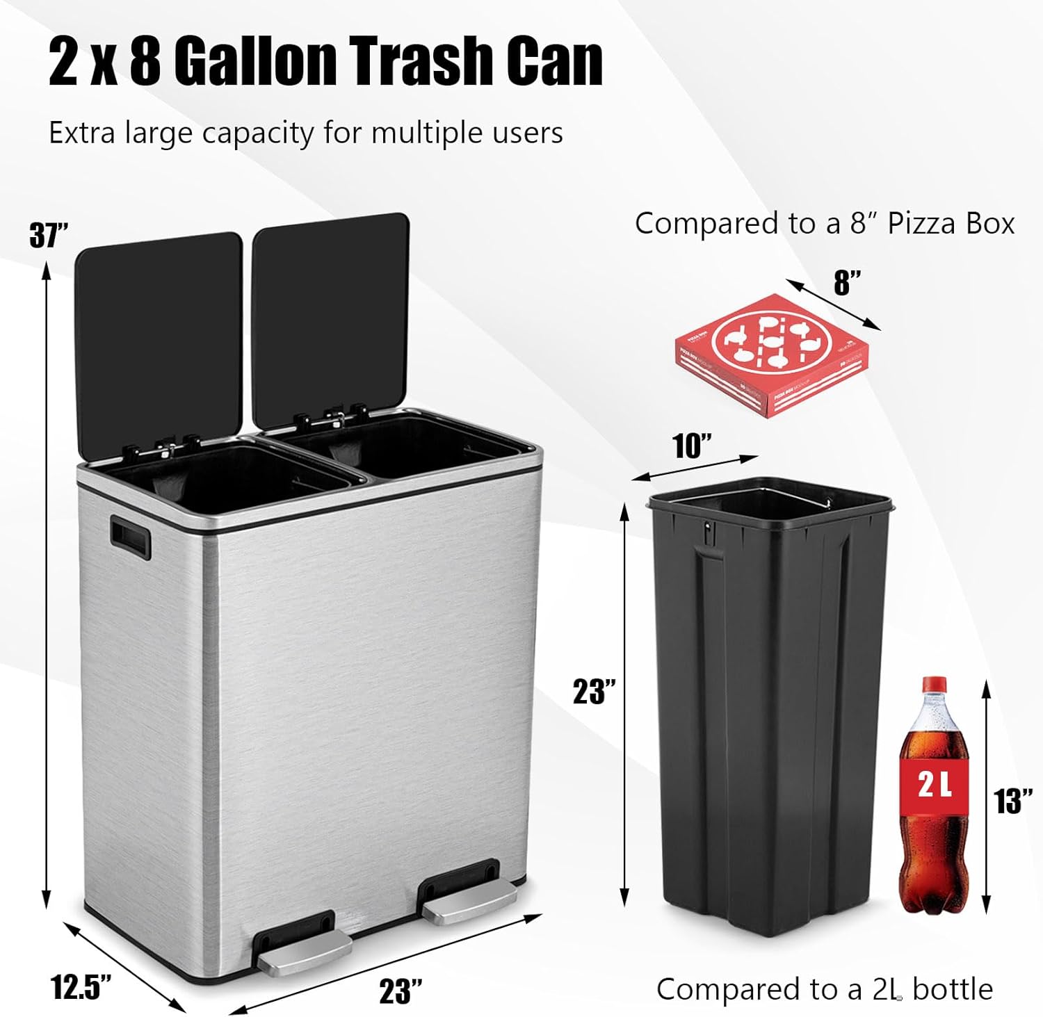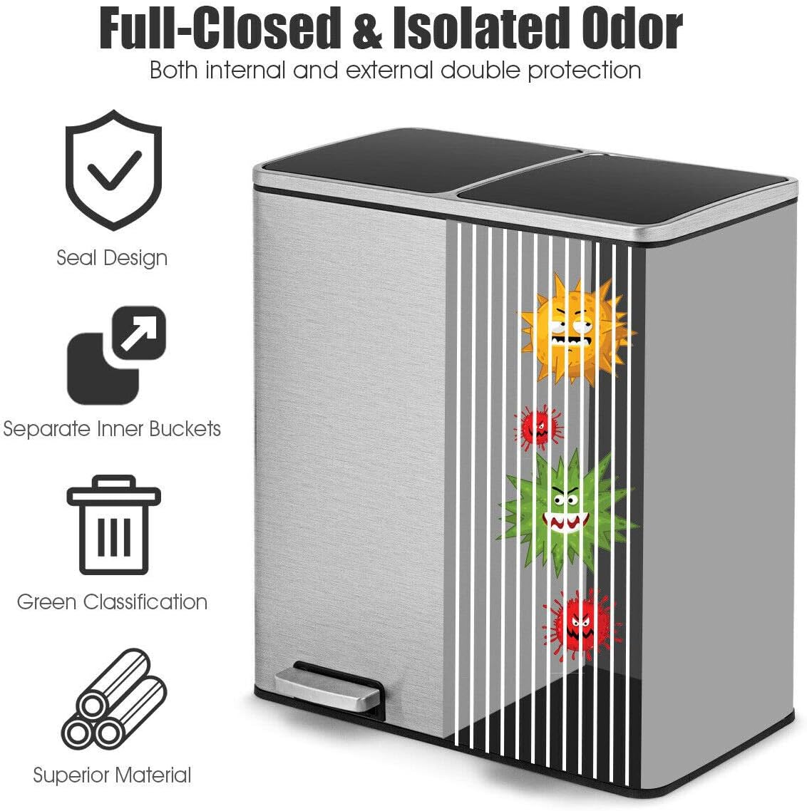 Goplus Dual Trash Can, 60 Liter (2x30L)/ 16 Gallon Stainless Steel Step Trash Can, Rectangular Garbage Bin with Inner Buckets and Hinged Lids, Suit for Kitchen Office Home Use,Black