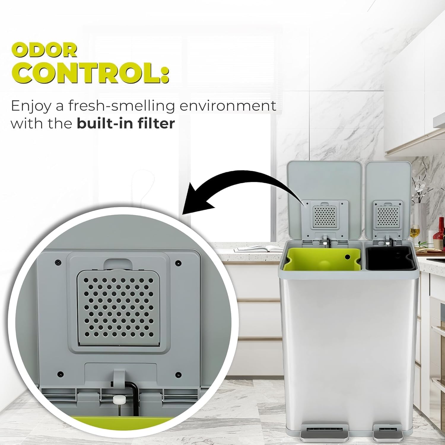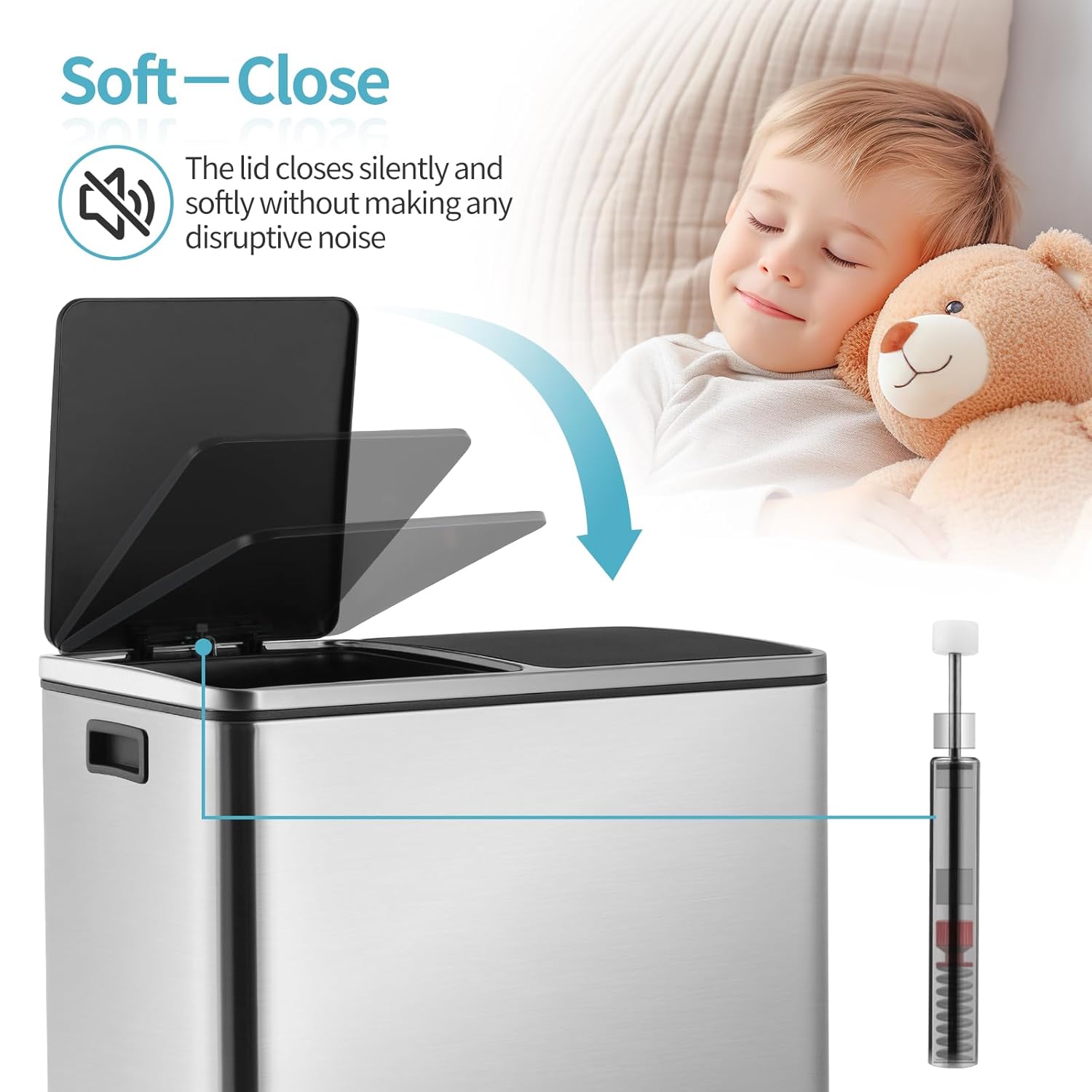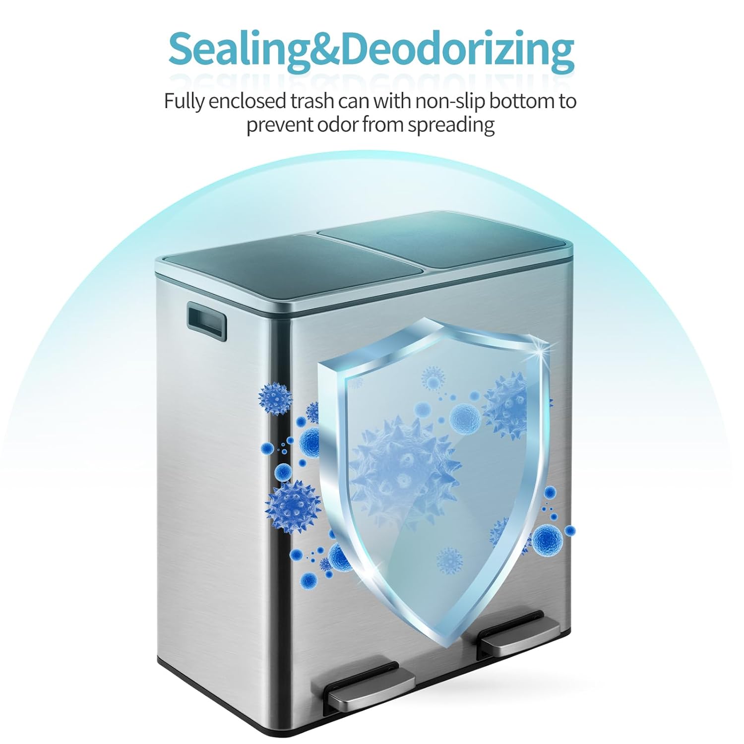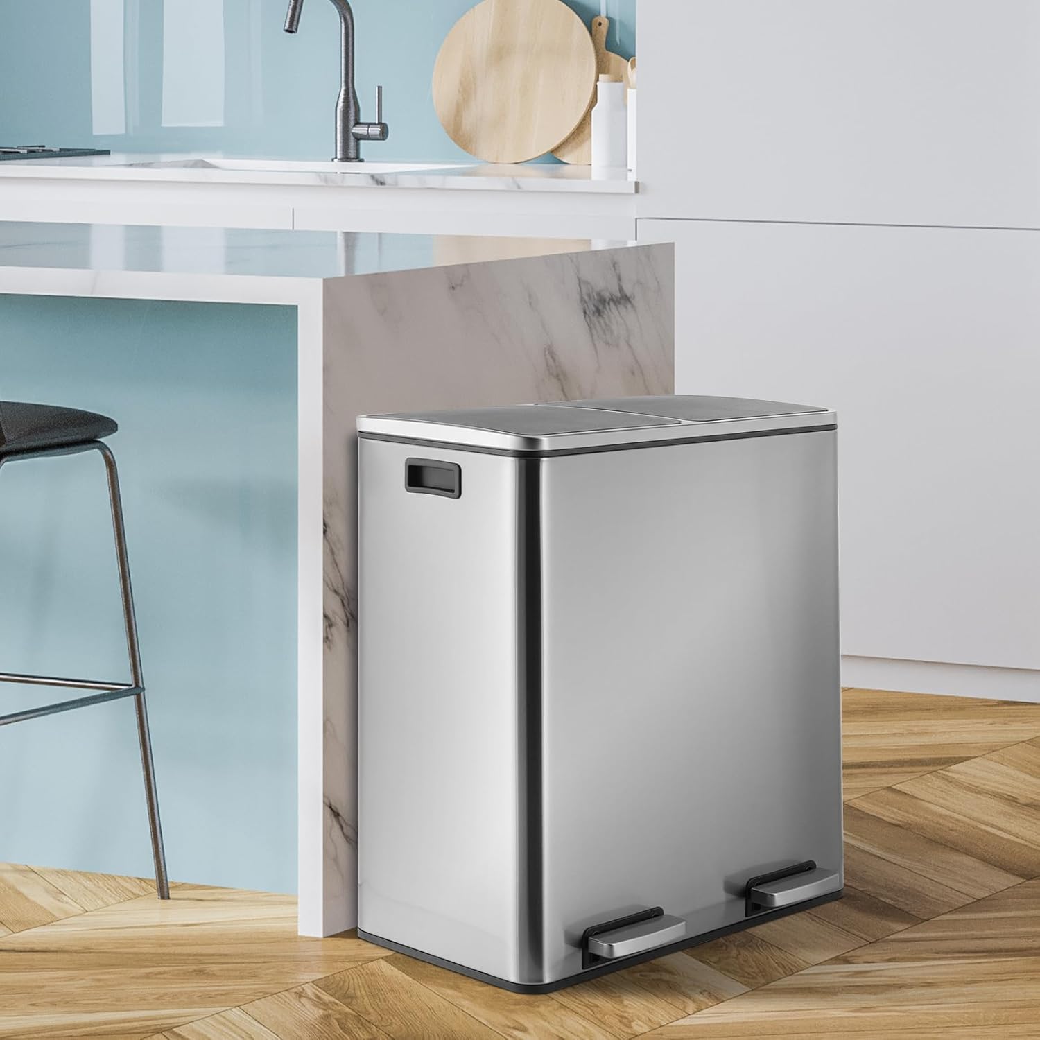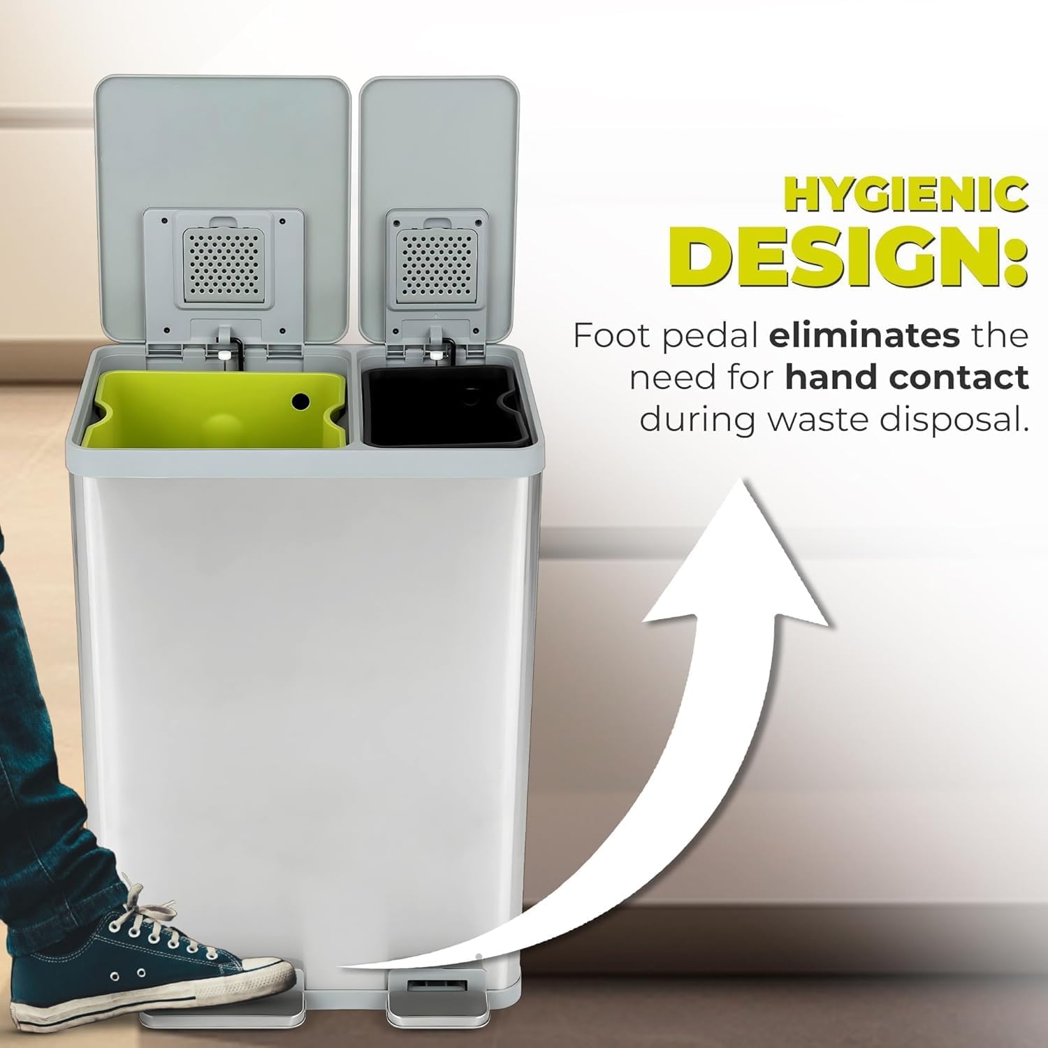 Simpli-Magic 16 Gallon (38L x 22L) Dual Compartment Step Trash Can – Kitchen Garbage Can with Waste & Recycling Bins – Slow-Close Lid, Odor Control, Hands-Free, Easy to Clean, Brushed Stainless Steel