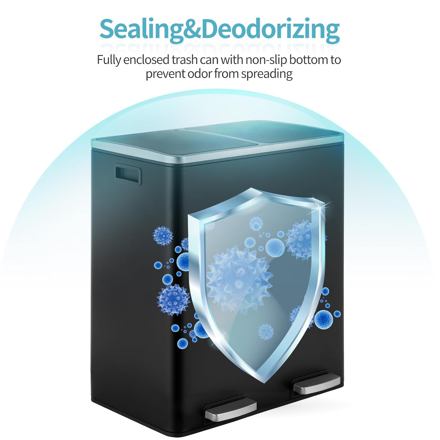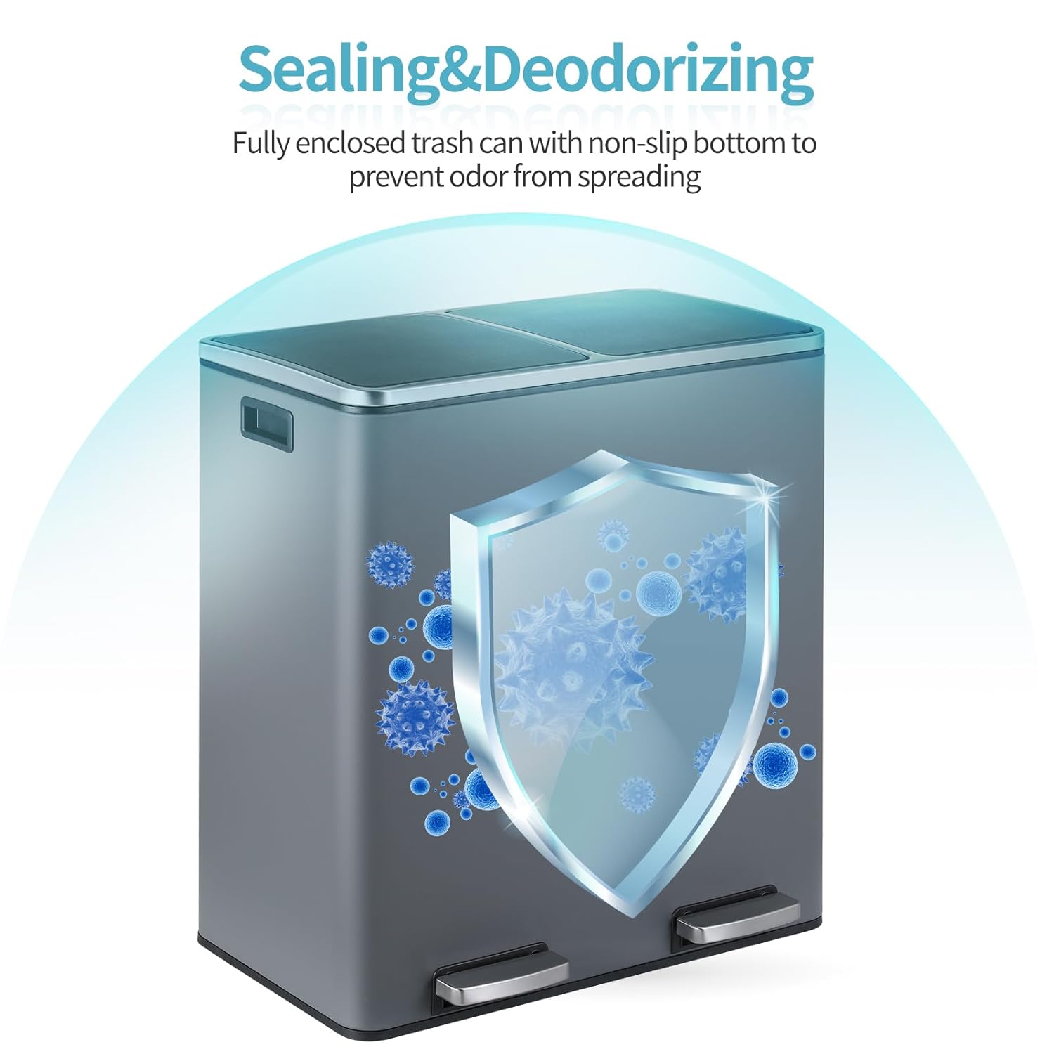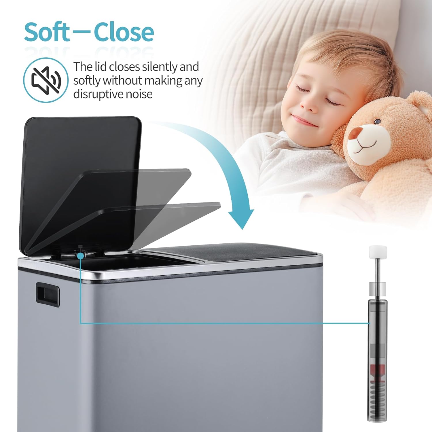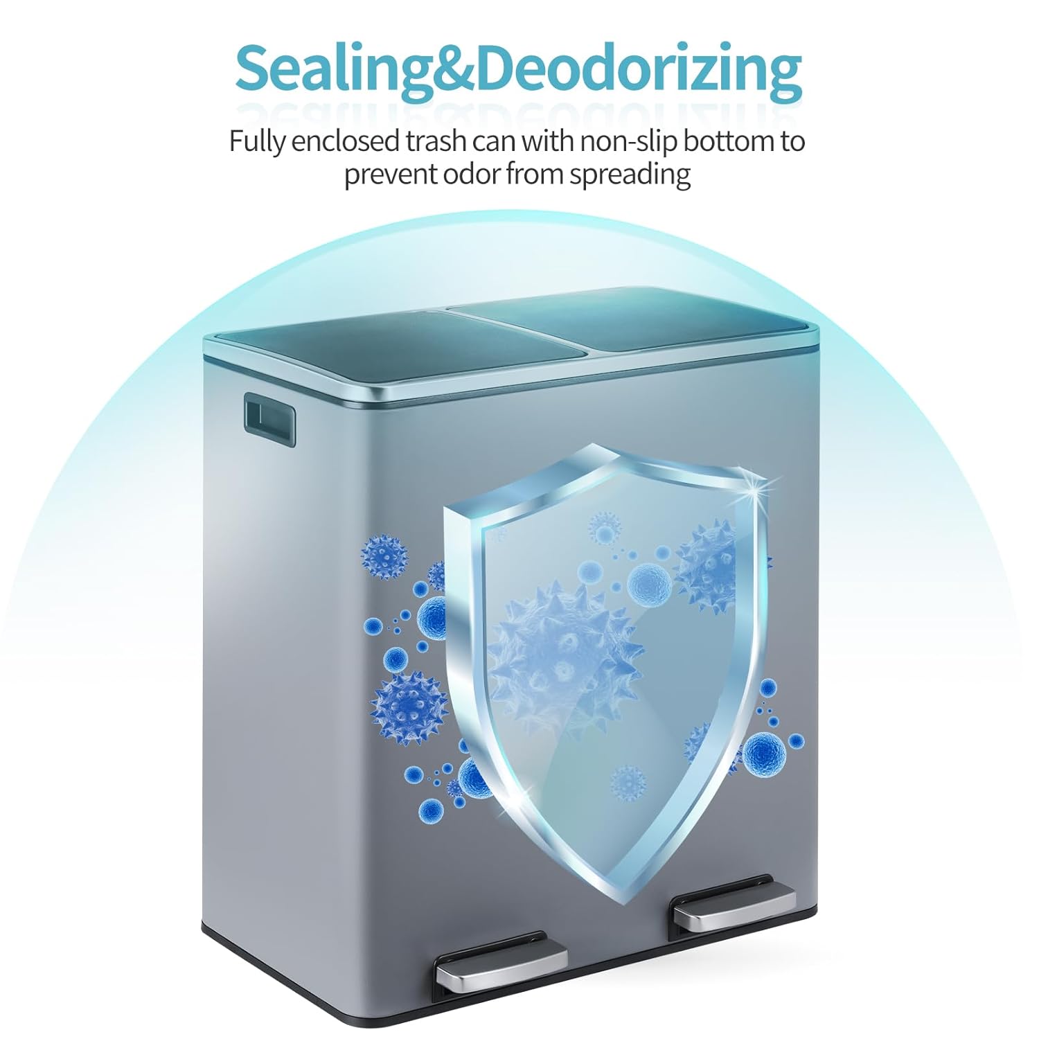 Simpli-Magic 16 Gallon (38L x 22L) Dual Compartment Step Trash Can – Kitchen Garbage Can with Waste & Recycling Bins – Slow-Close Lid, Odor Control, Hands-Free, Easy to Clean, Brushed Stainless Steel