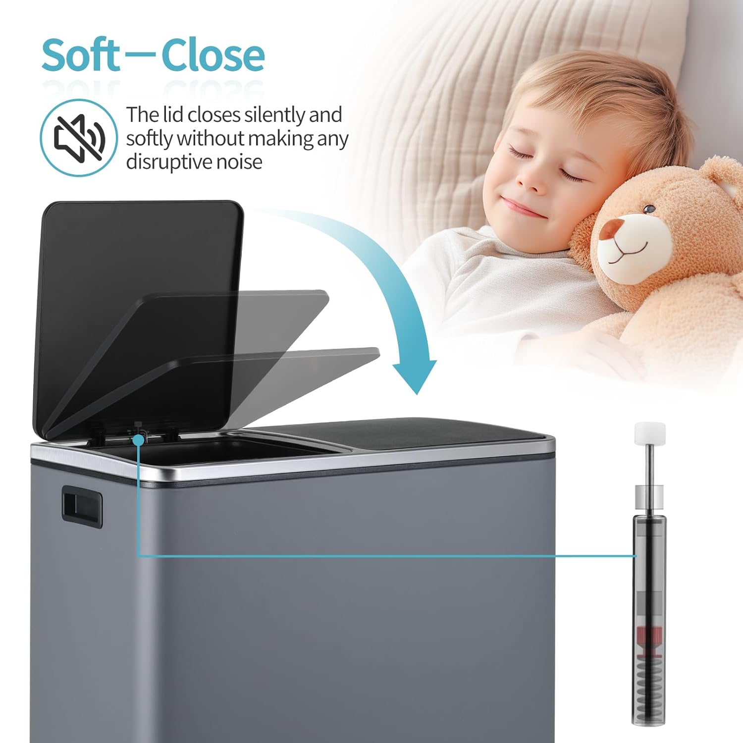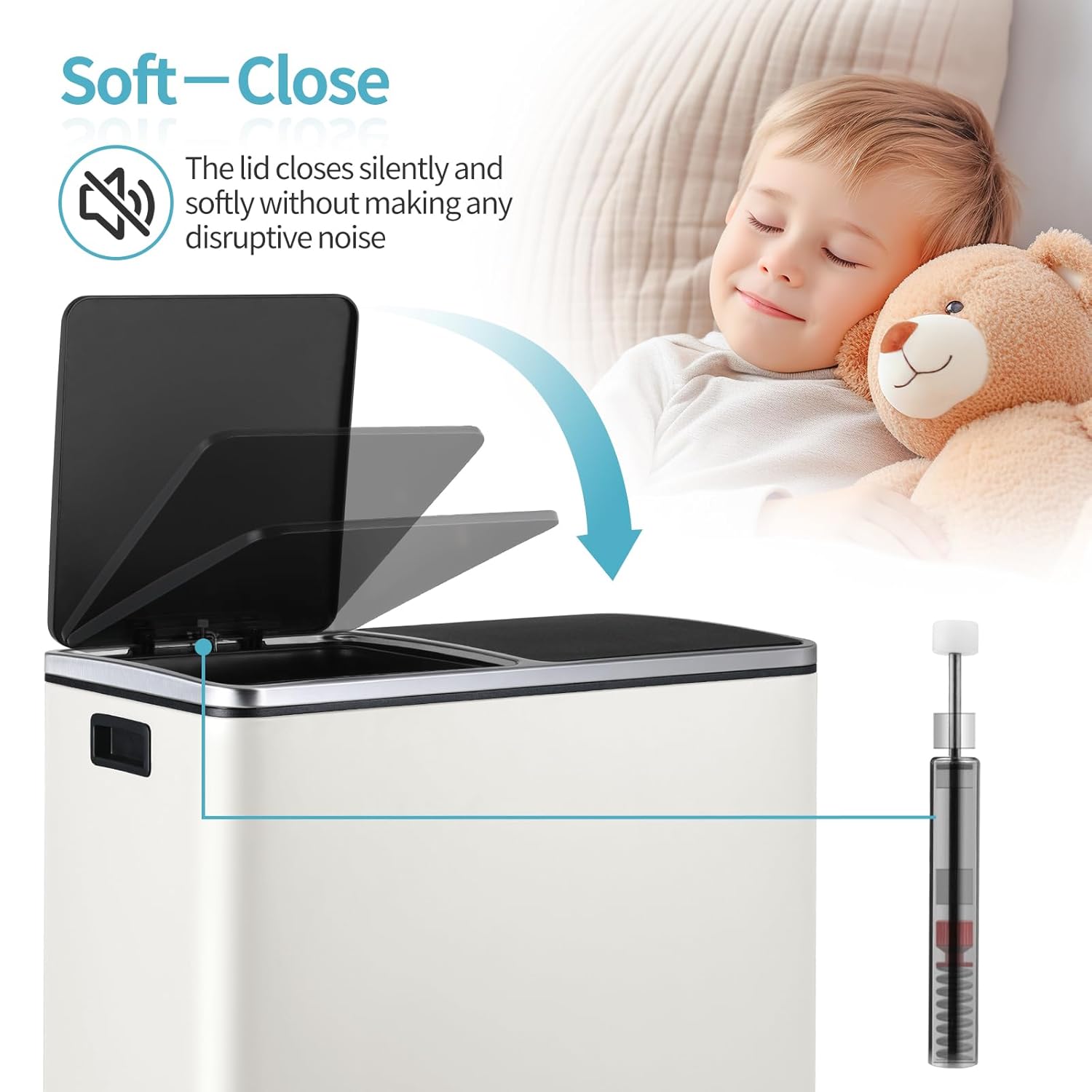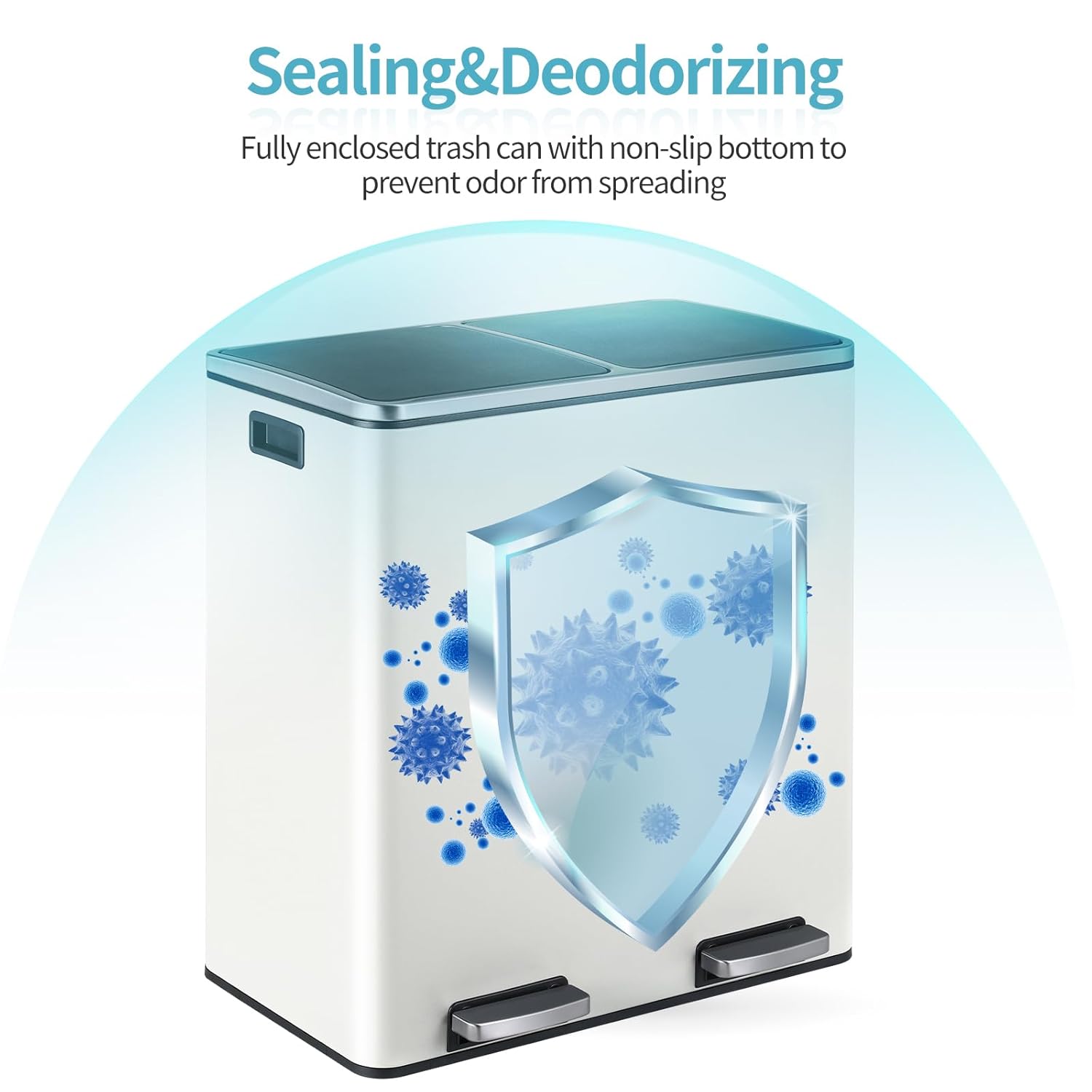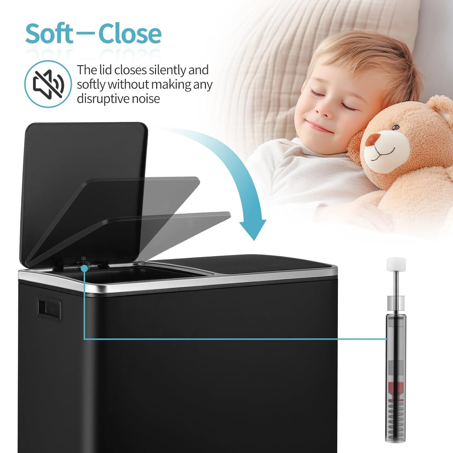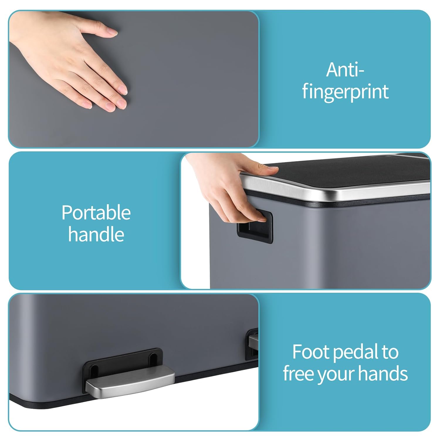 Simpli-Magic 16 Gallon (38L x 22L) Dual Compartment Step Trash Can – Kitchen Garbage Can with Waste & Recycling Bins – Slow-Close Lid, Odor Control, Hands-Free, Easy to Clean, Brushed Stainless Steel