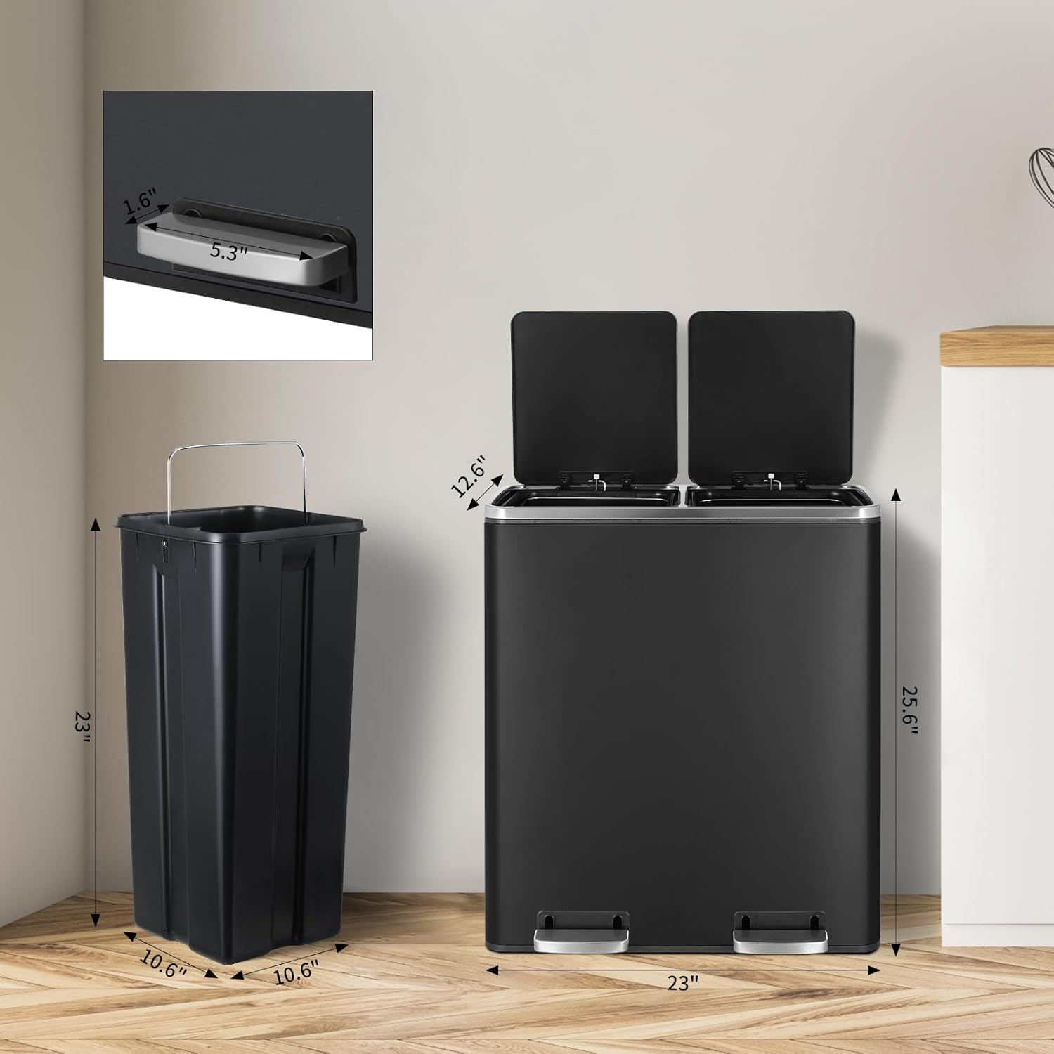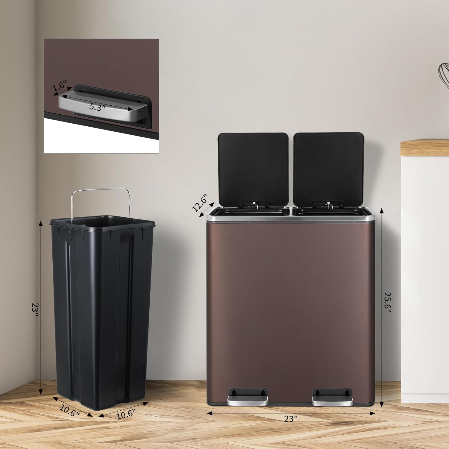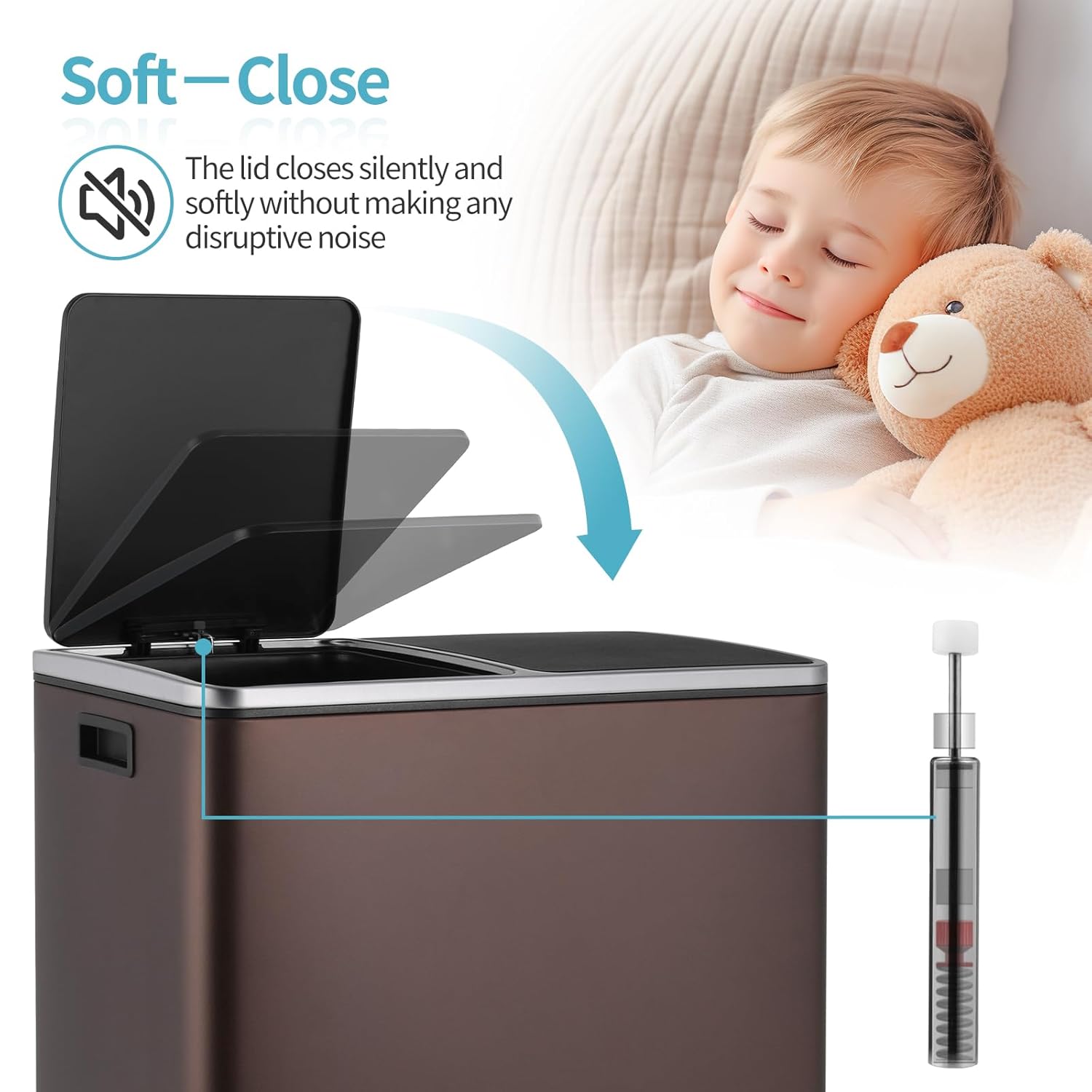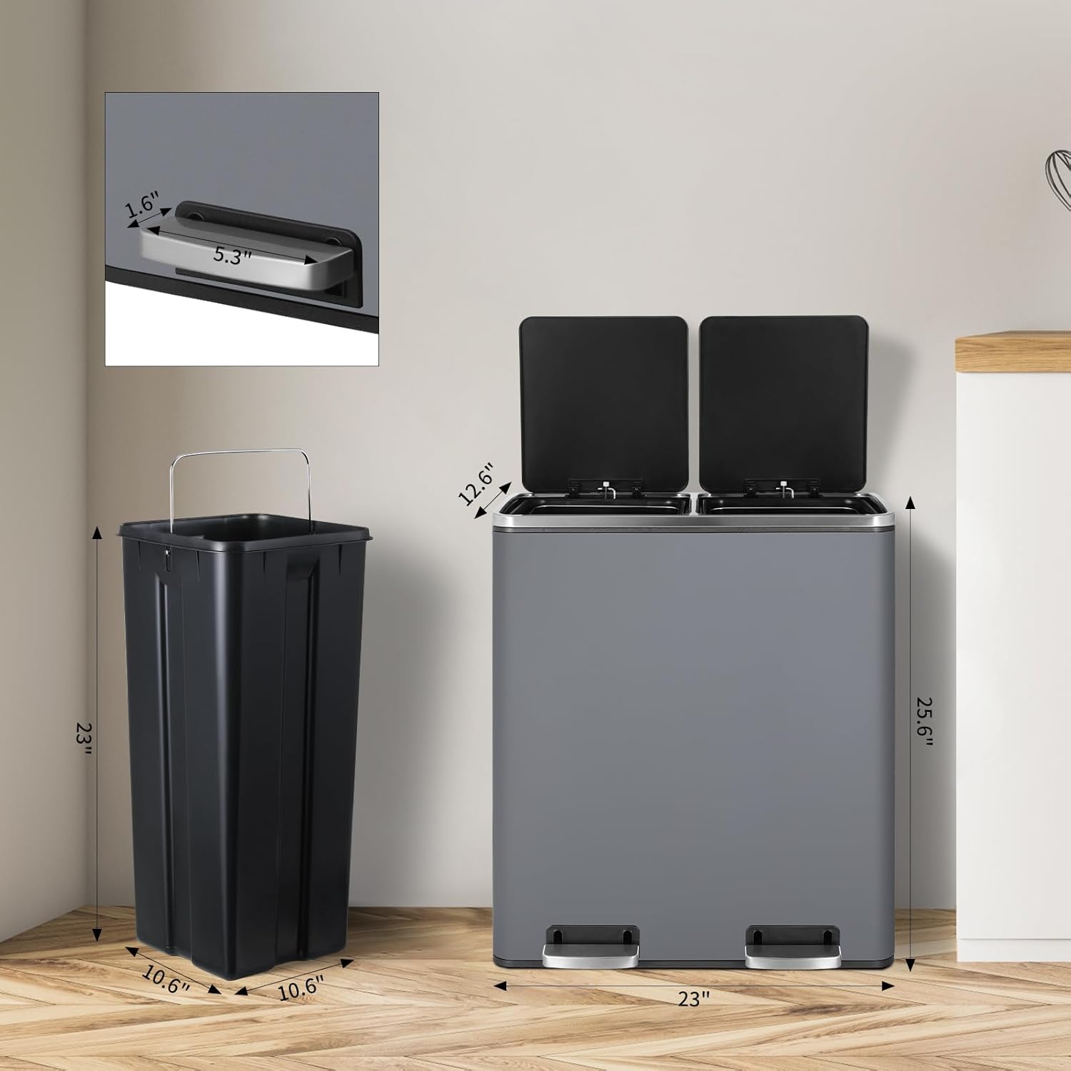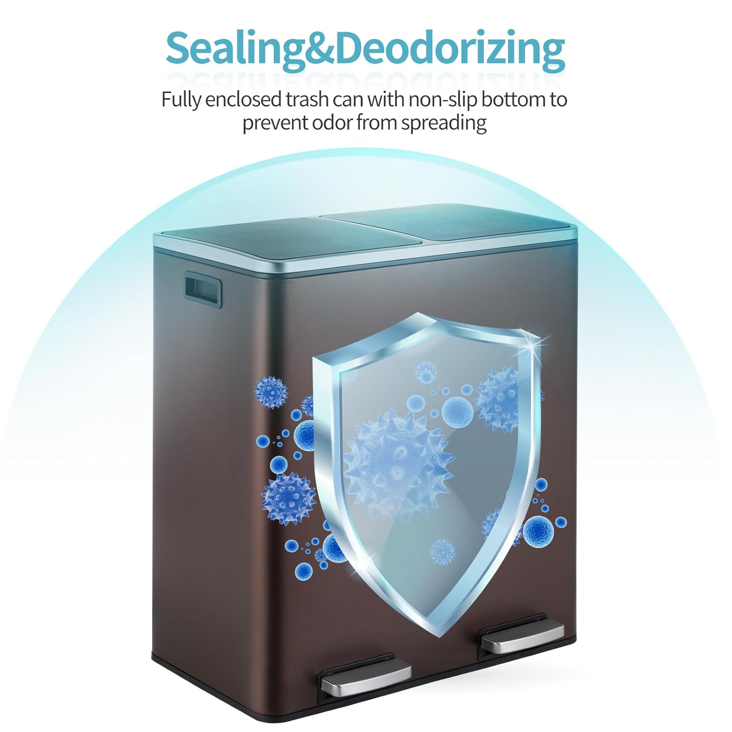 Simpli-Magic 16 Gallon (38L x 22L) Dual Compartment Step Trash Can – Kitchen Garbage Can with Waste & Recycling Bins – Slow-Close Lid, Odor Control, Hands-Free, Easy to Clean, Brushed Stainless Steel