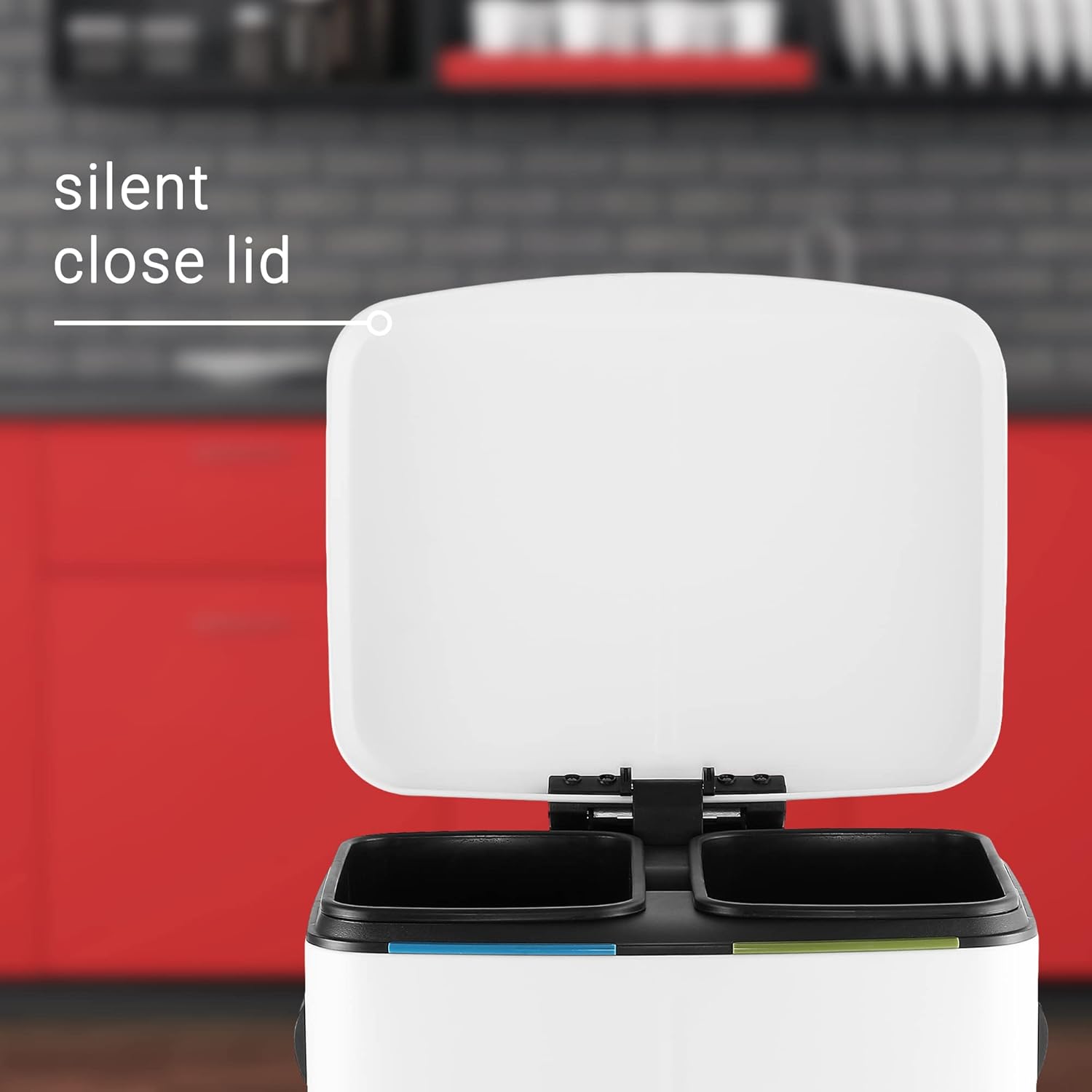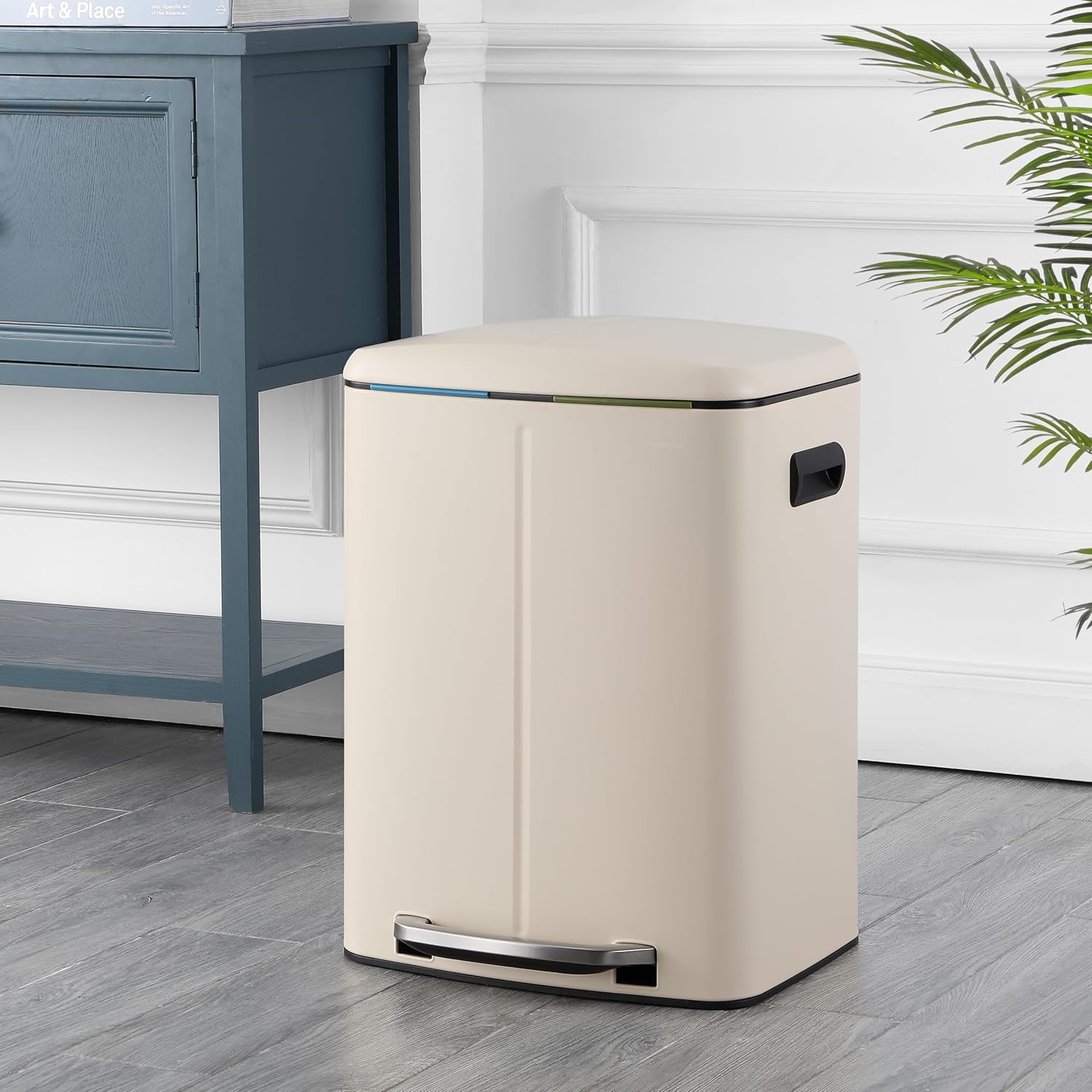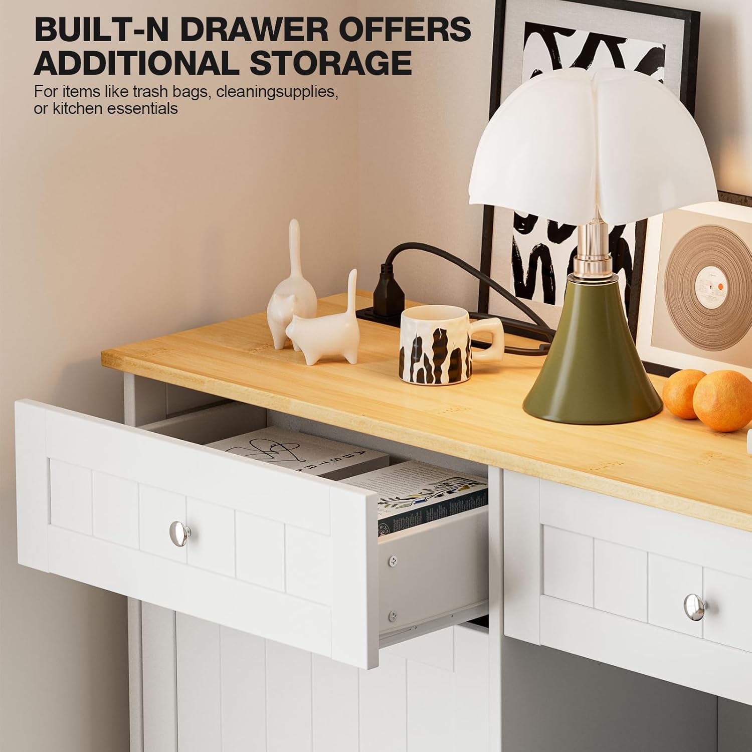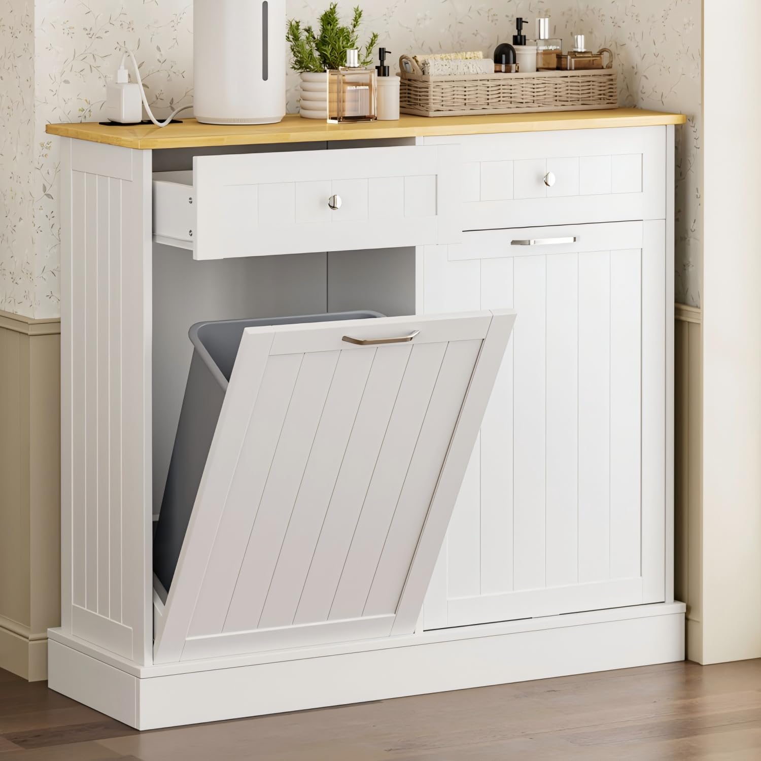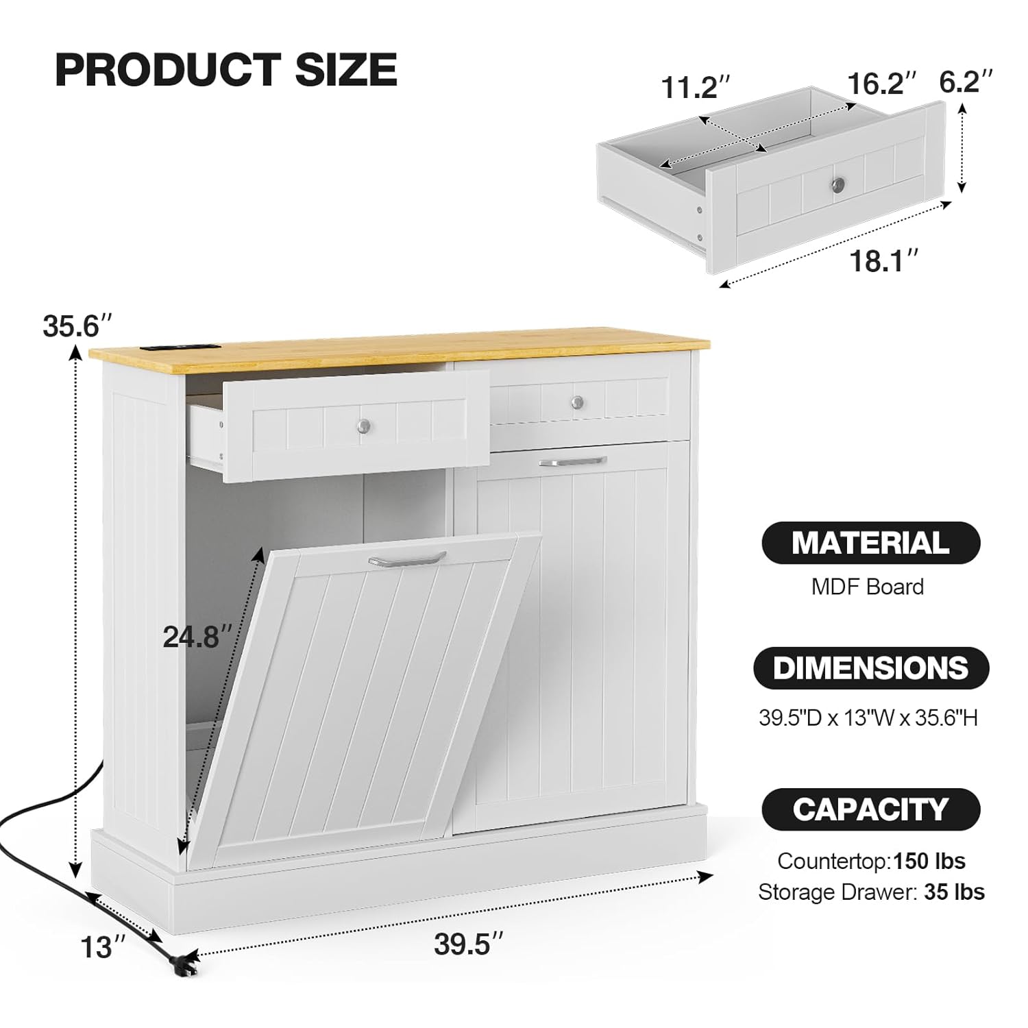 GAZHOME 20 Gallon Double Tilt Out Wooden Trash Cabinet with Charging Station, Upgrade Free Standing Recycling Cabinet with Outlet,White