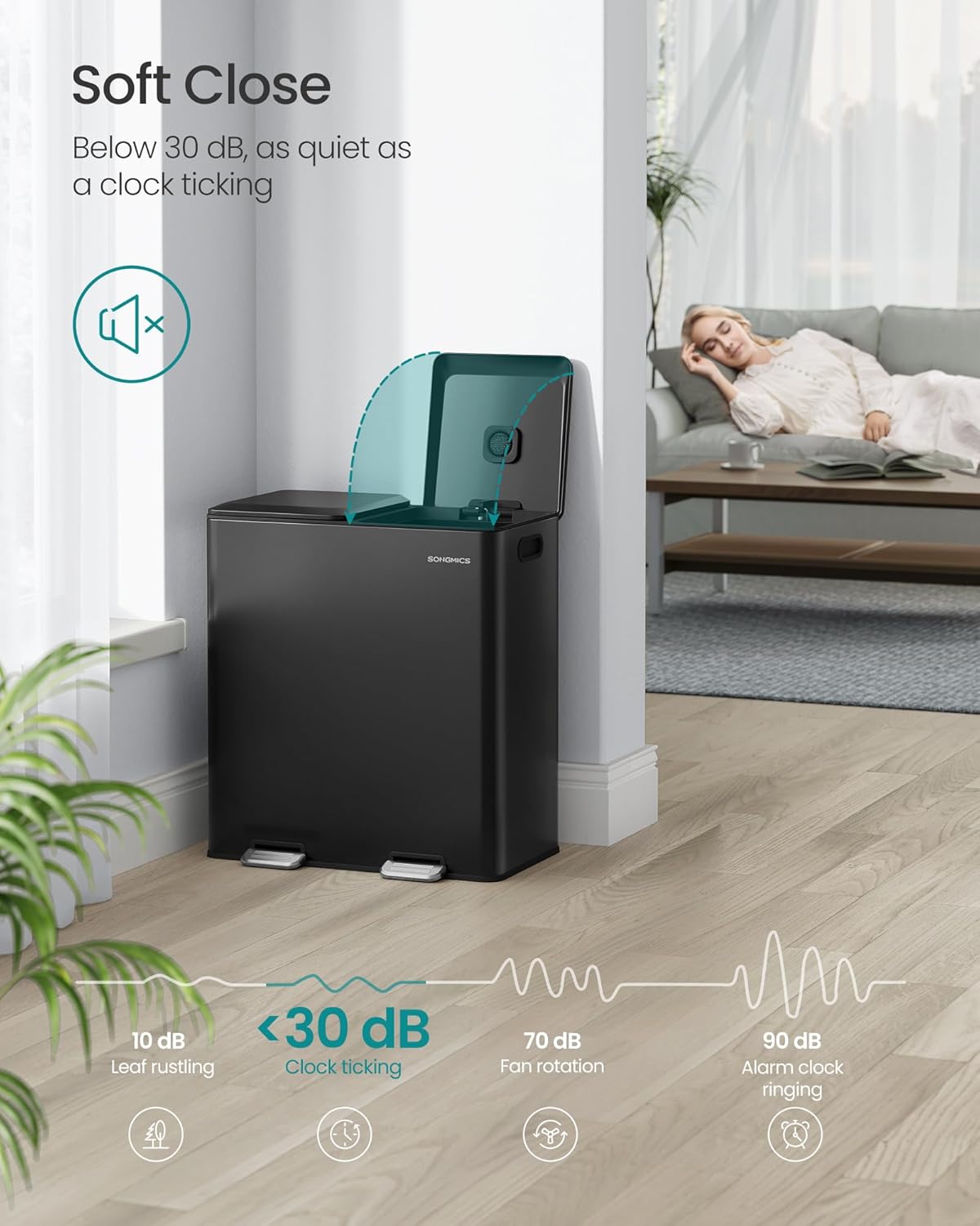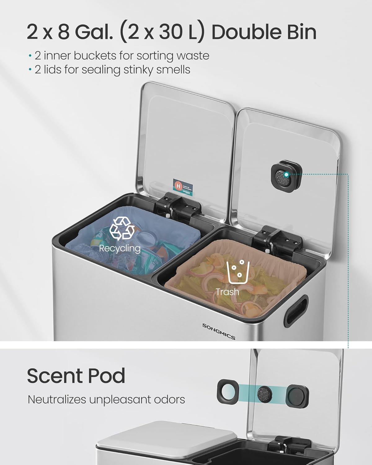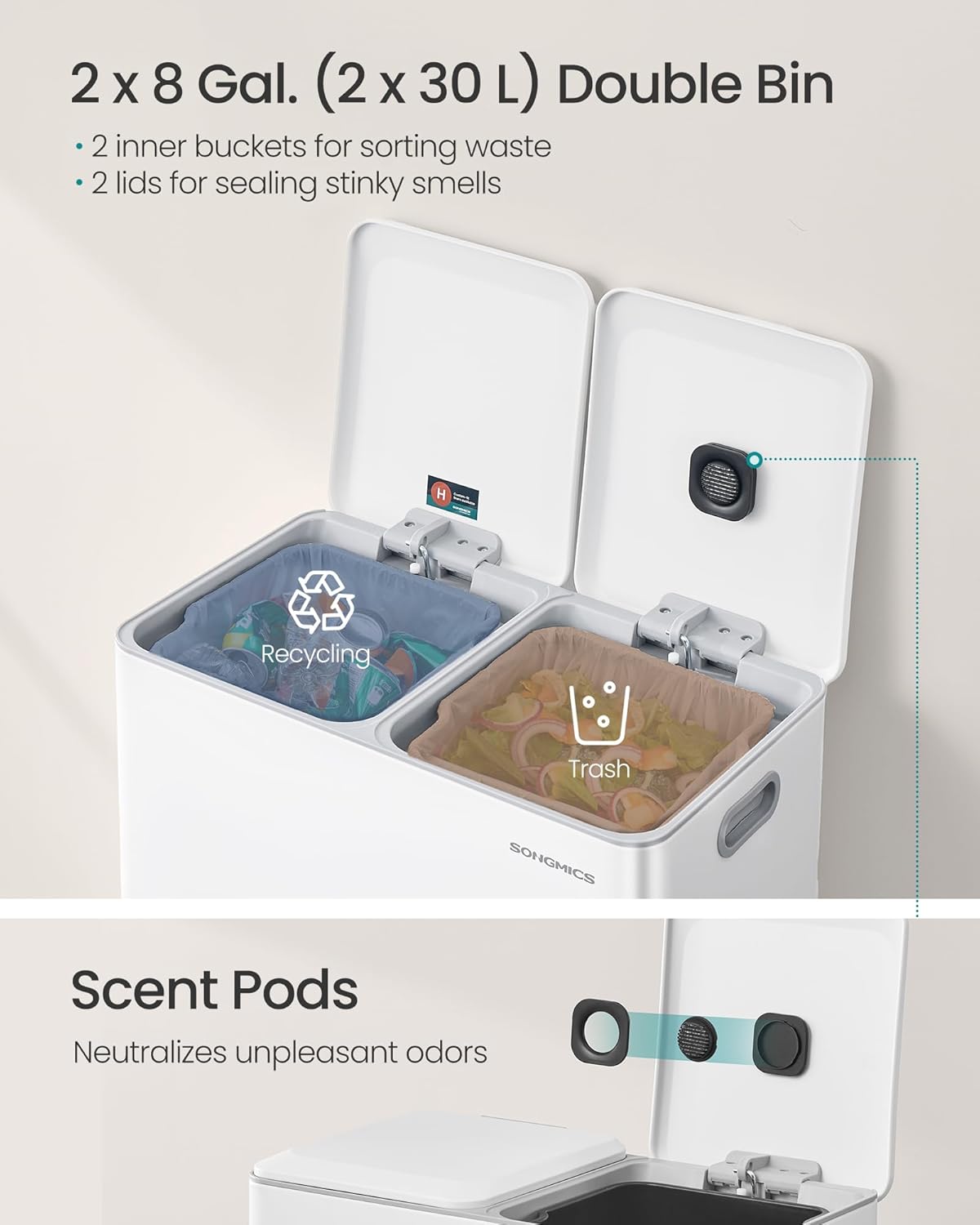 SONGMICS Trash Can, 2 x 8 Gallon (2 x 30 L) Double Garbage Can with Soft-Close Lids, Removable Inner Buckets, Pedals, Stainless Steel, for Waste and Recycling, Cloud White ULTB743W01