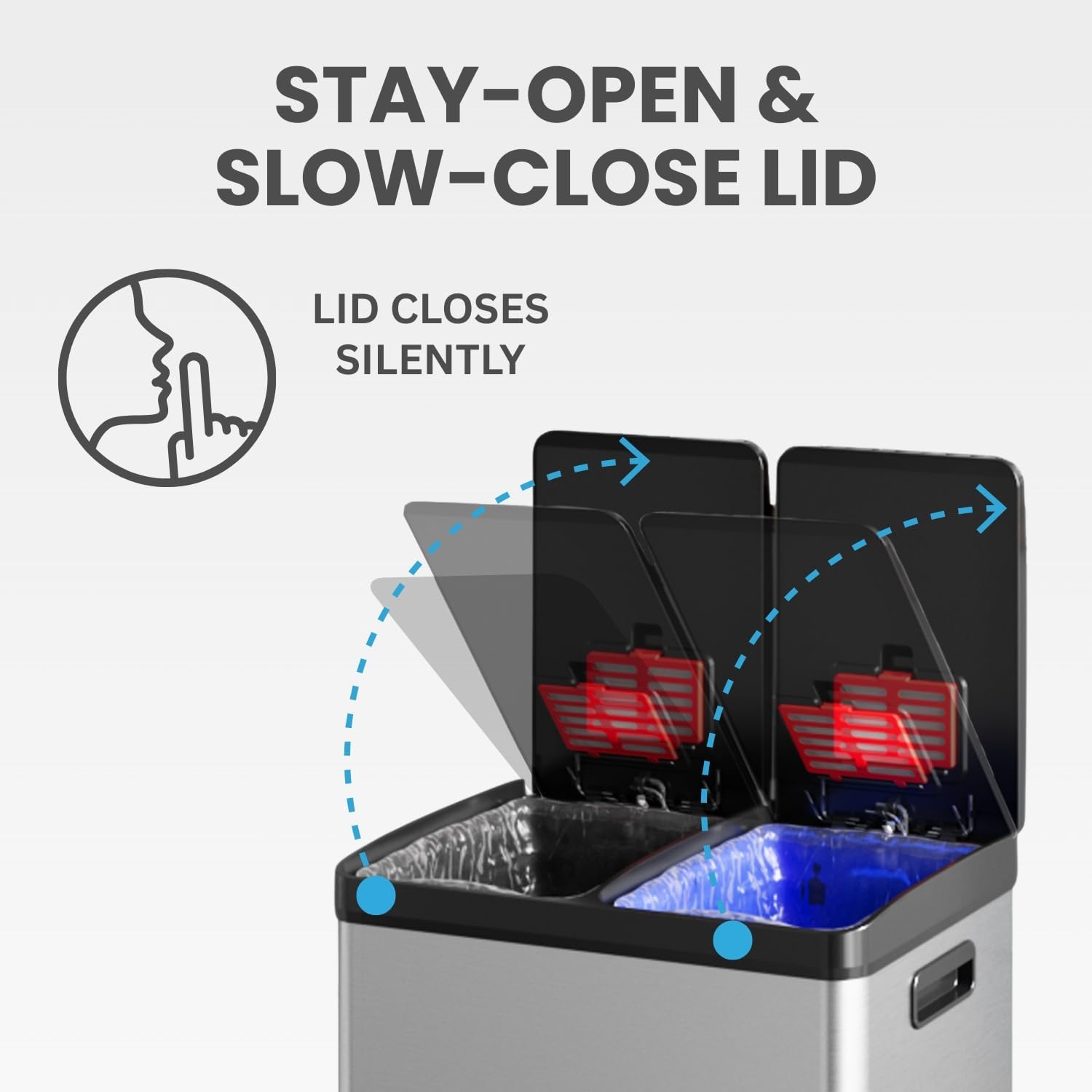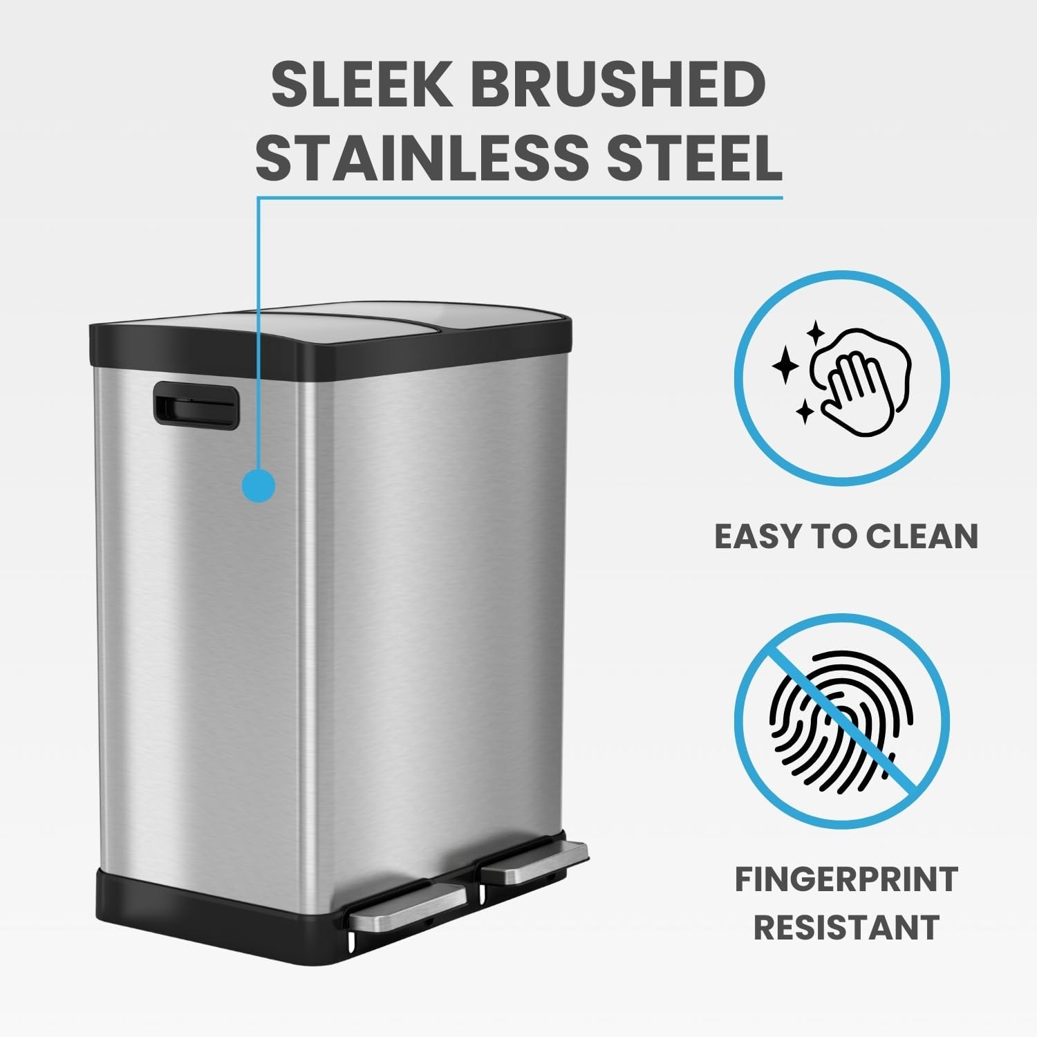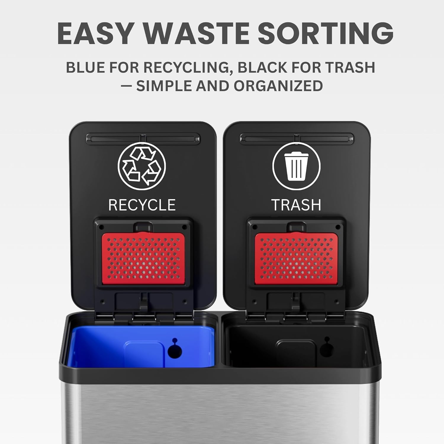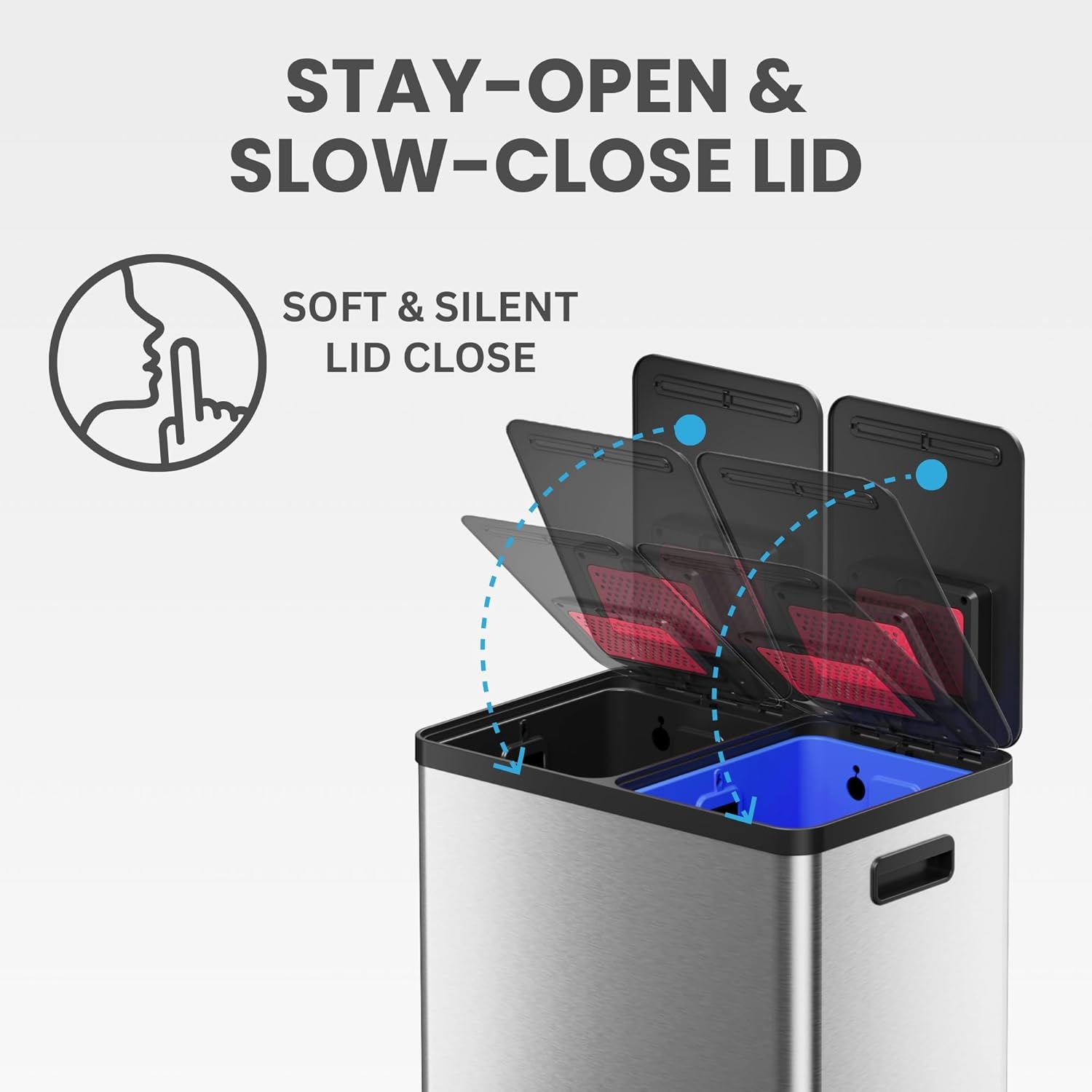 iTouchless 60 Liter / 16 Gallon Dual Compartment Kitchen Trash Can & Recycling Bin, Odor Filter, Soft-Close, Hands-Free Step Pedals, 2x 8-Gal Color-Coded Buckets, Smudge-Resistant Stainless Steel