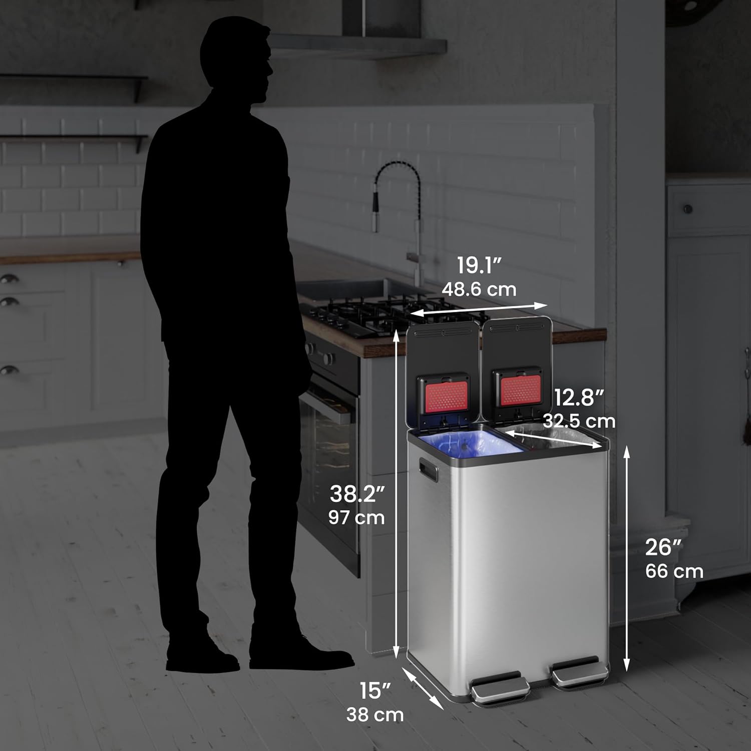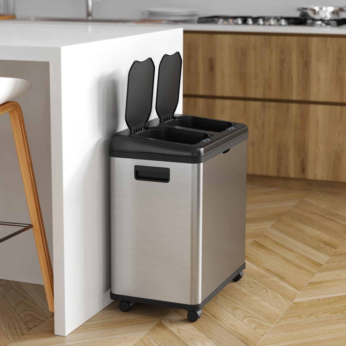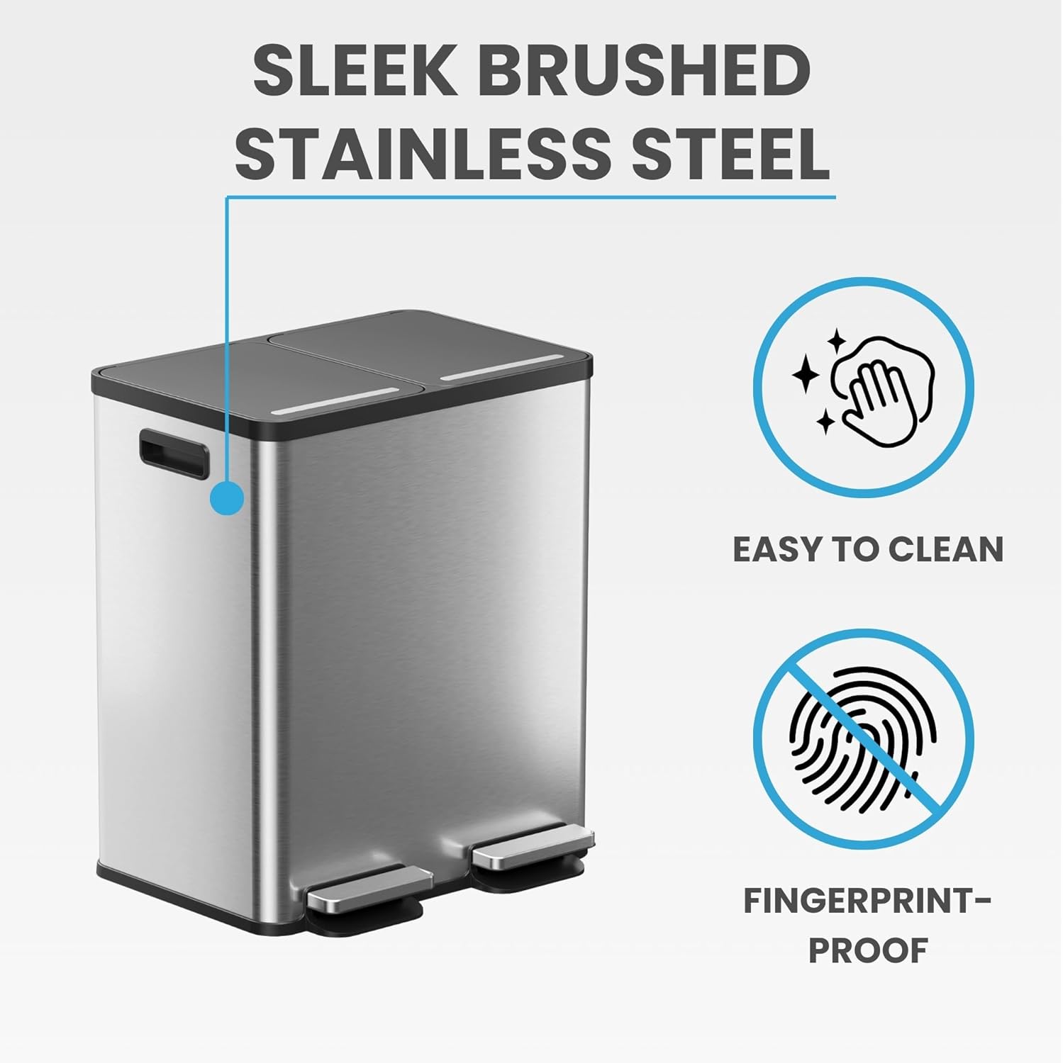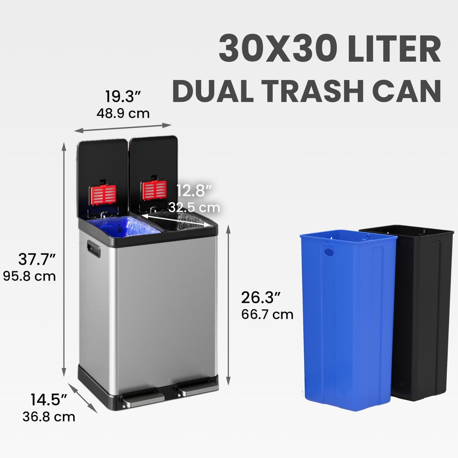 iTouchless 60 Liter / 16 Gallon Dual Compartment Kitchen Trash Can & Recycling Bin, Odor Filter, Soft-Close, Hands-Free Step Pedals, 2x 8-Gal Color-Coded Buckets, Smudge-Resistant Stainless Steel