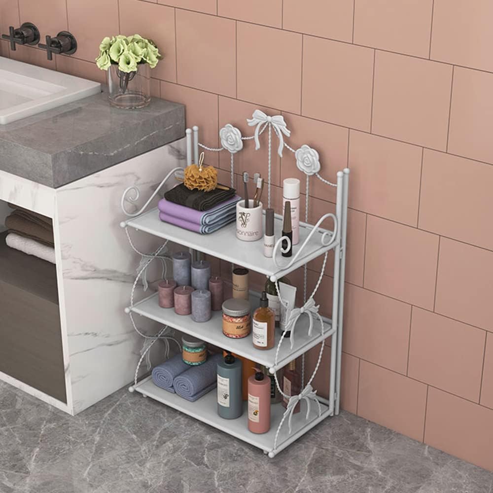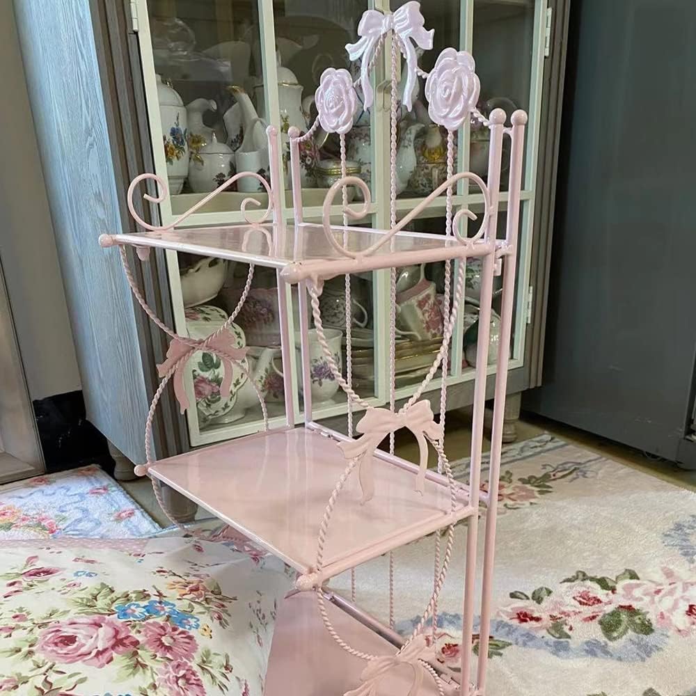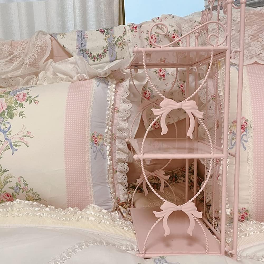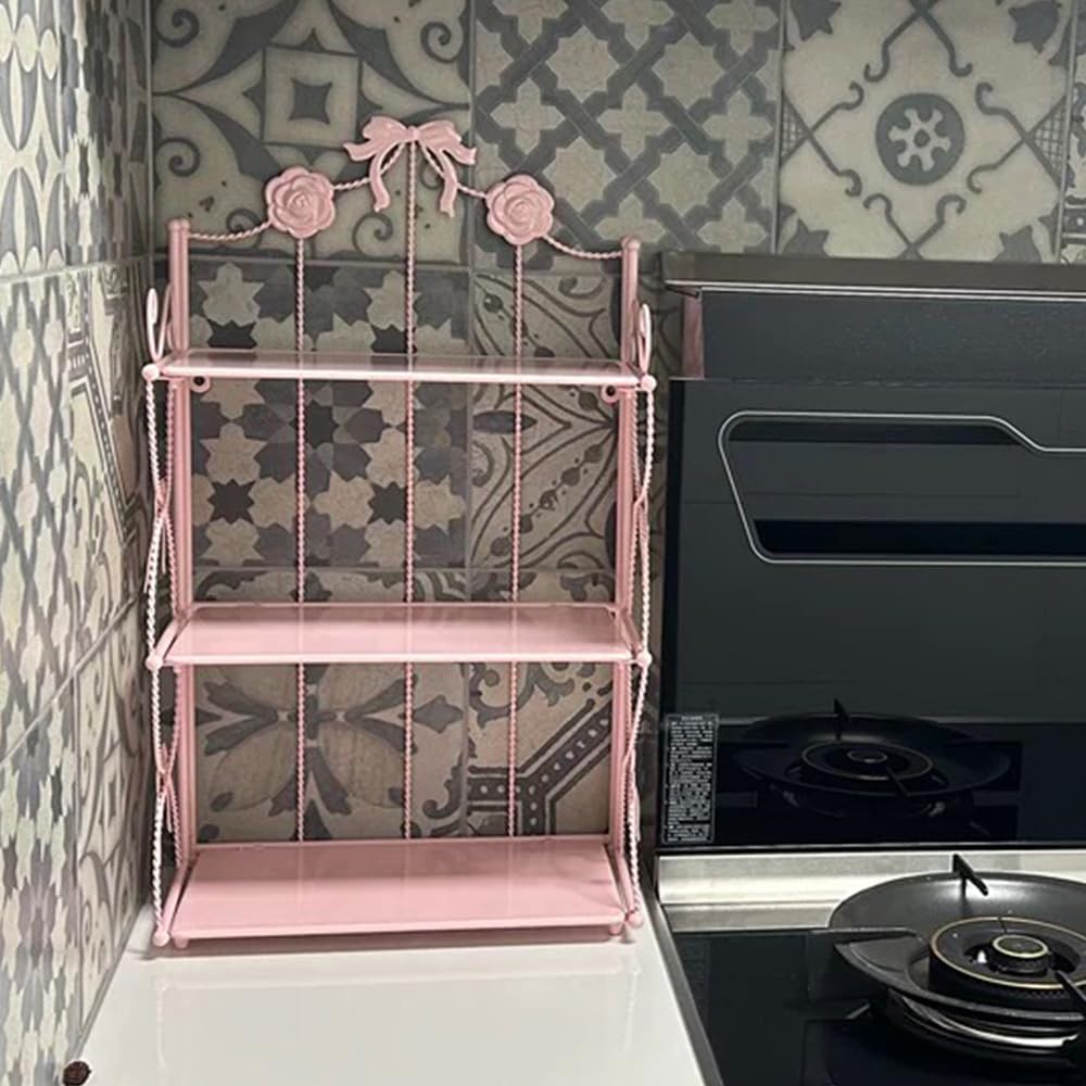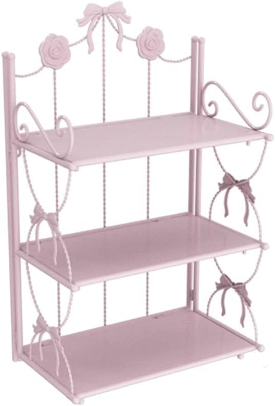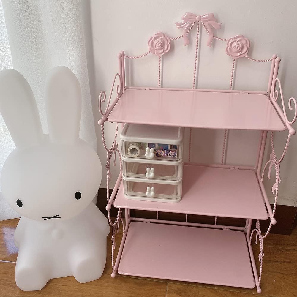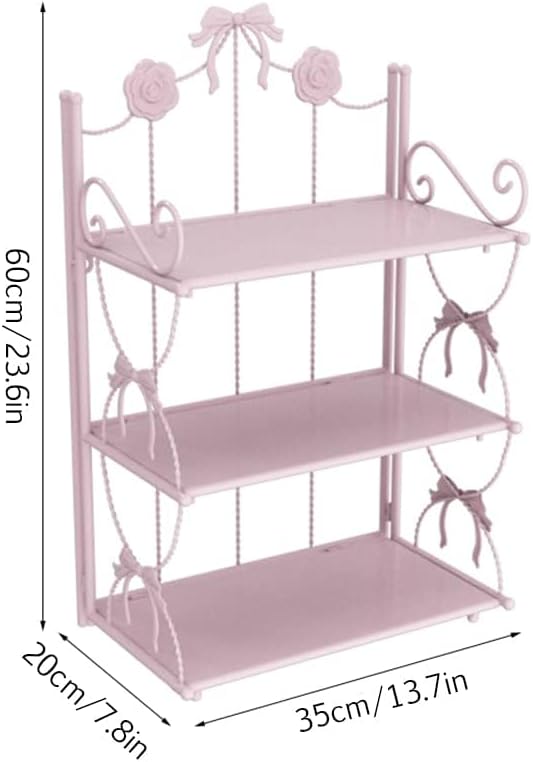 BOOMALTU Cute 4-Tier Folding Metal Shelving Bathroom Shelf,Pink Shelves Pink Bookshelf with Bow and Flowers Decor for Storage and Display in Living Room, Bathroom, Office, Kitchen