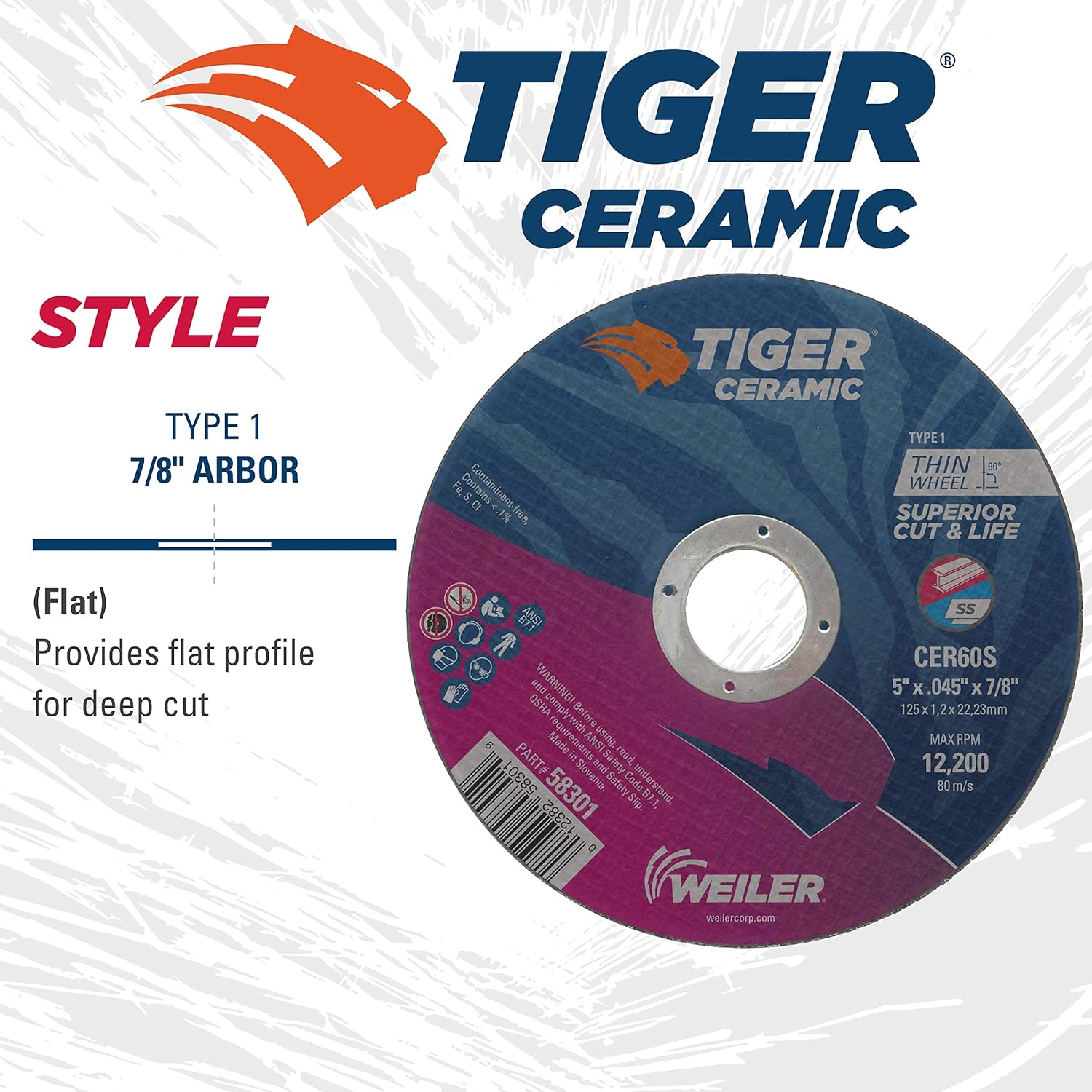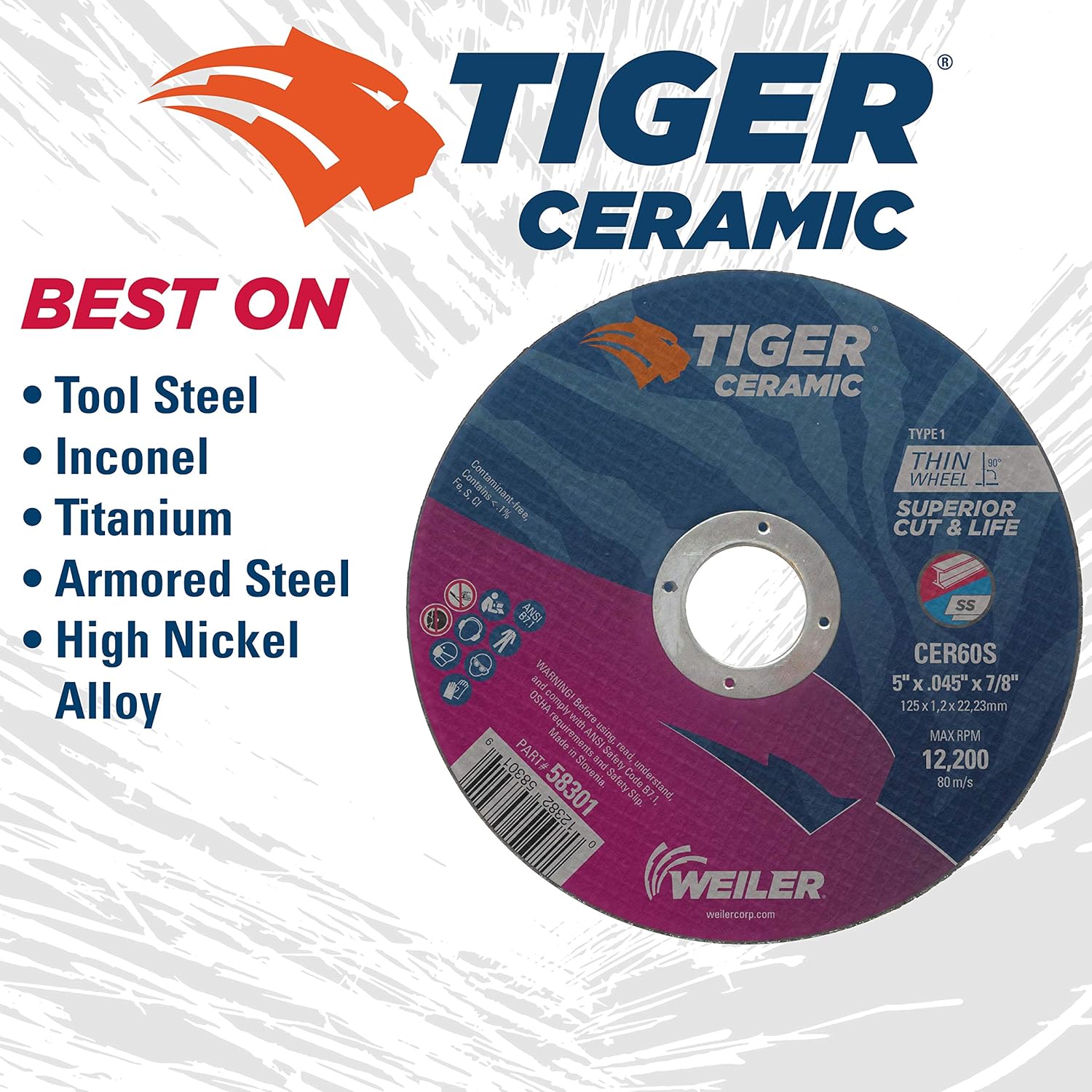 Weiler 58301 5 Inch Cutting Wheel, Tiger Ceramic Stainless Steel Superior Life & Cut Contaminant Free Max Performance Cutting, .045" CER60S Type 1 7/8" Arbor, Pack of 25