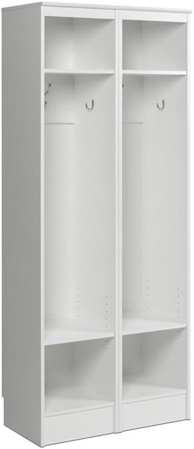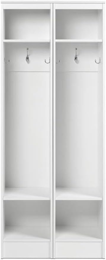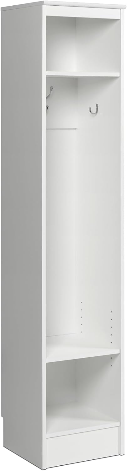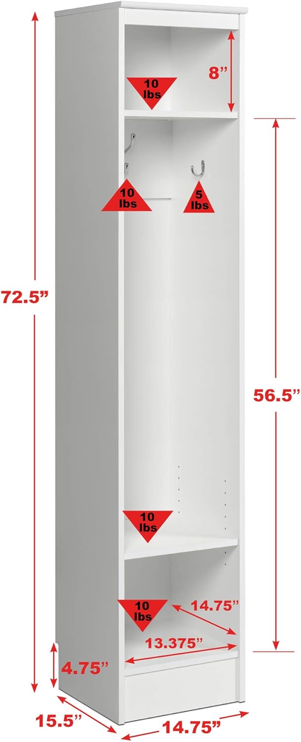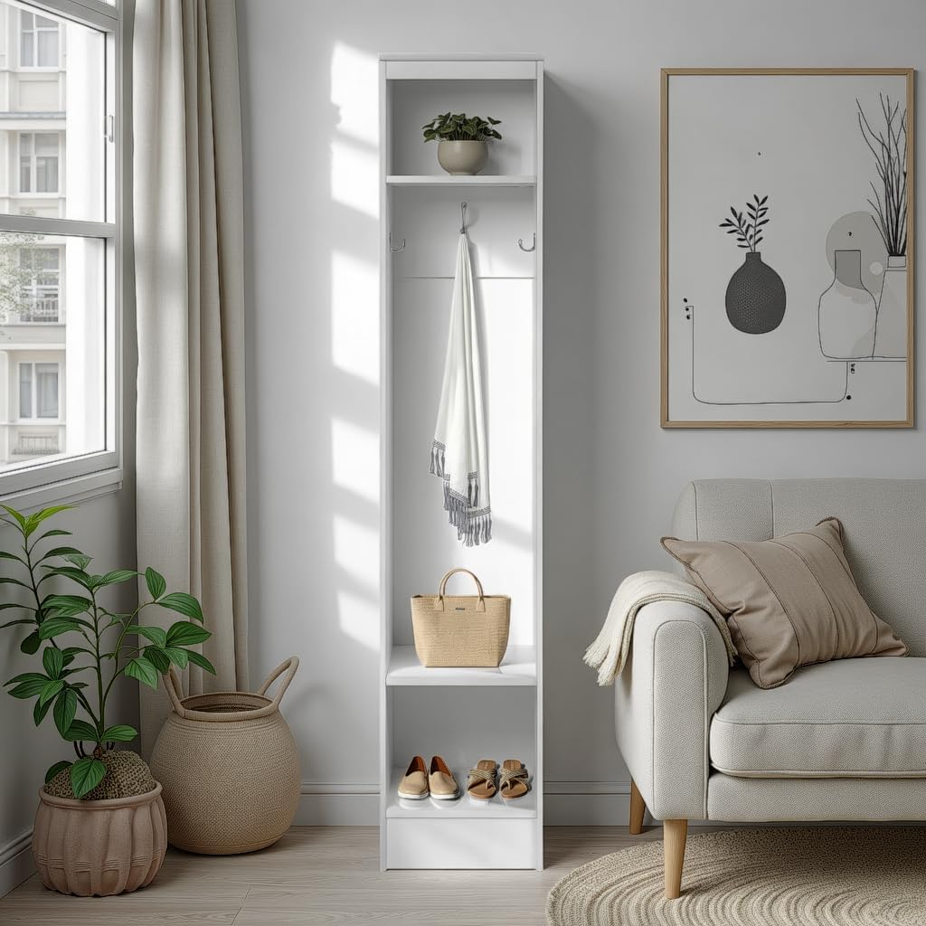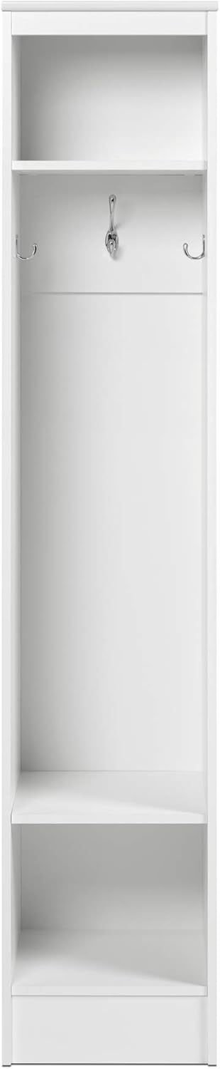 Prepac Narrow Coat Rack Freestanding Hall Tree with 3 Hooks, Entryway Furniture for Coat and Shoe Storage, Entryway Organization with an Adjustable Shelf, 14.75"W x 72.5"H x 15.5"D, White