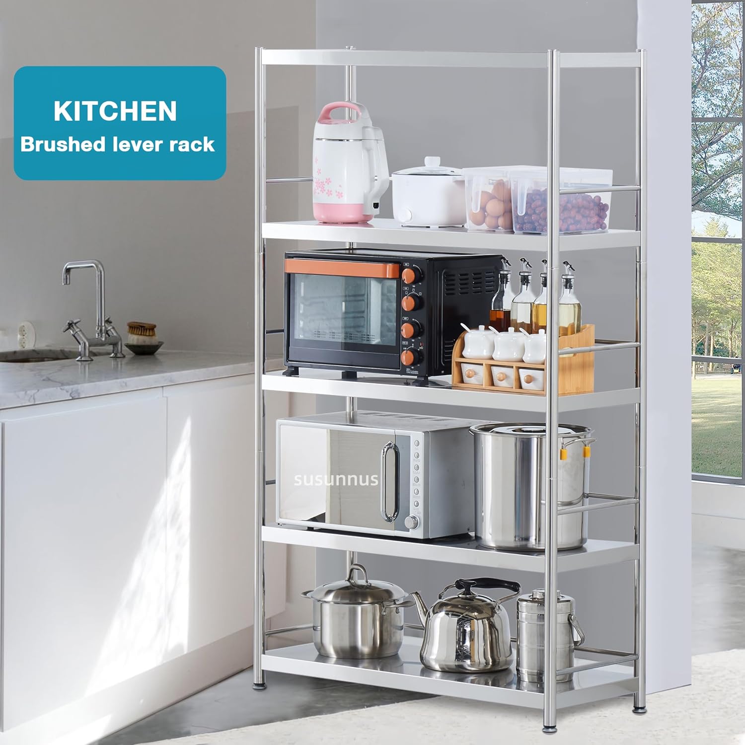 susunnus Stainless Steel Shelves 4 Tier Storage Shelves for Kitchen Garage Shelves Heavy Duty Shelving Metal Shelving Units and Storage Kitchen Industrial Storage Rack(with Guardrails)