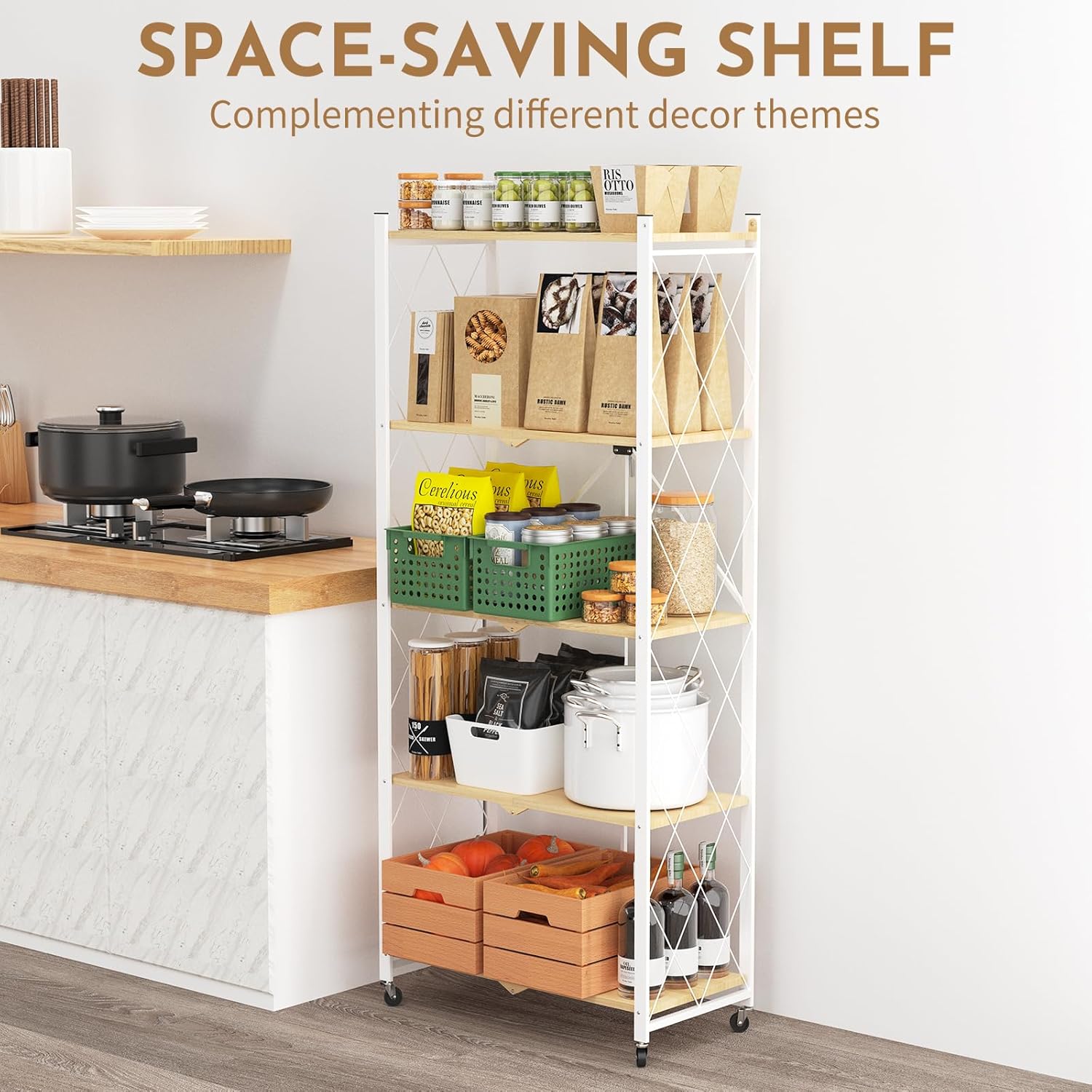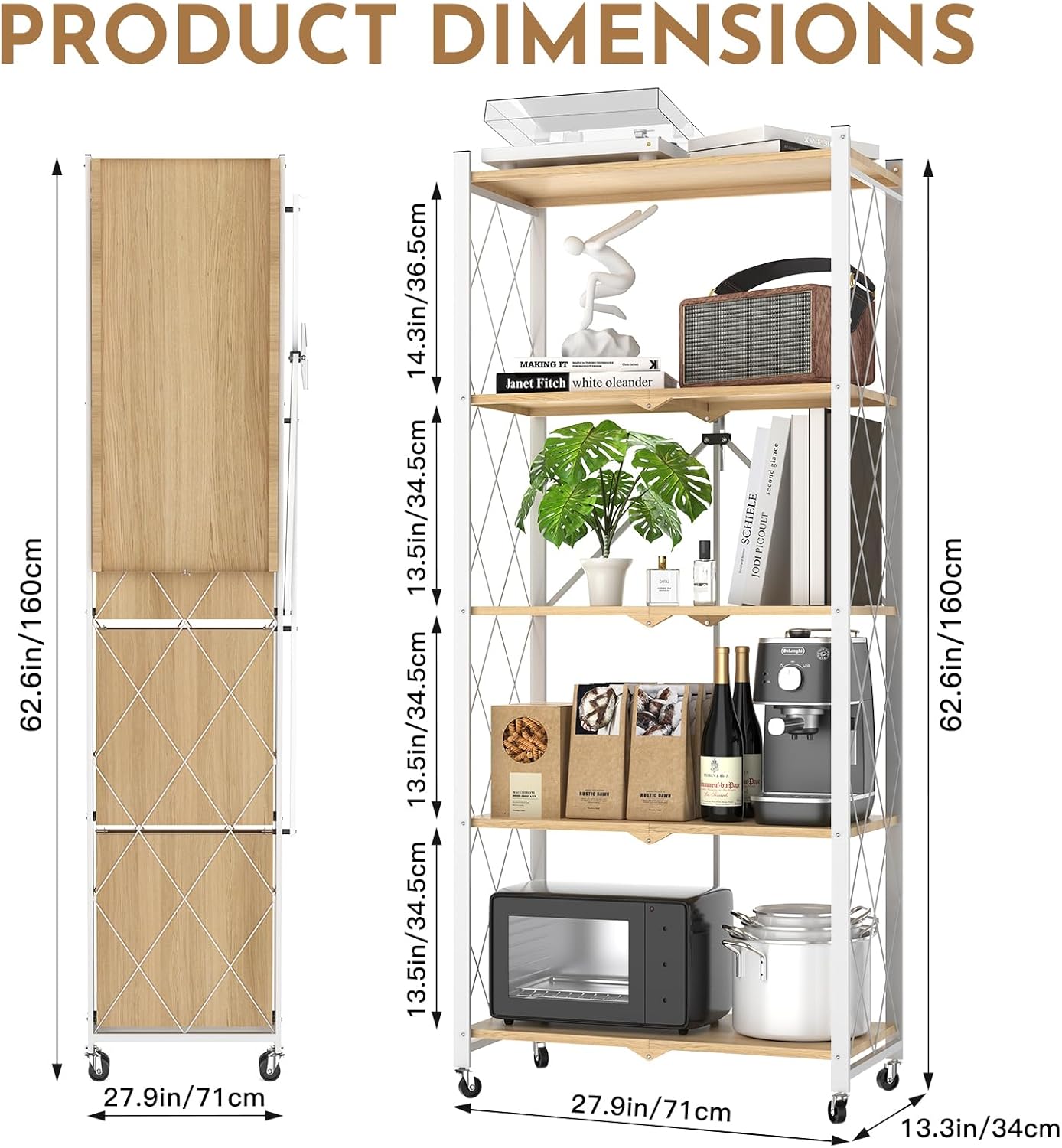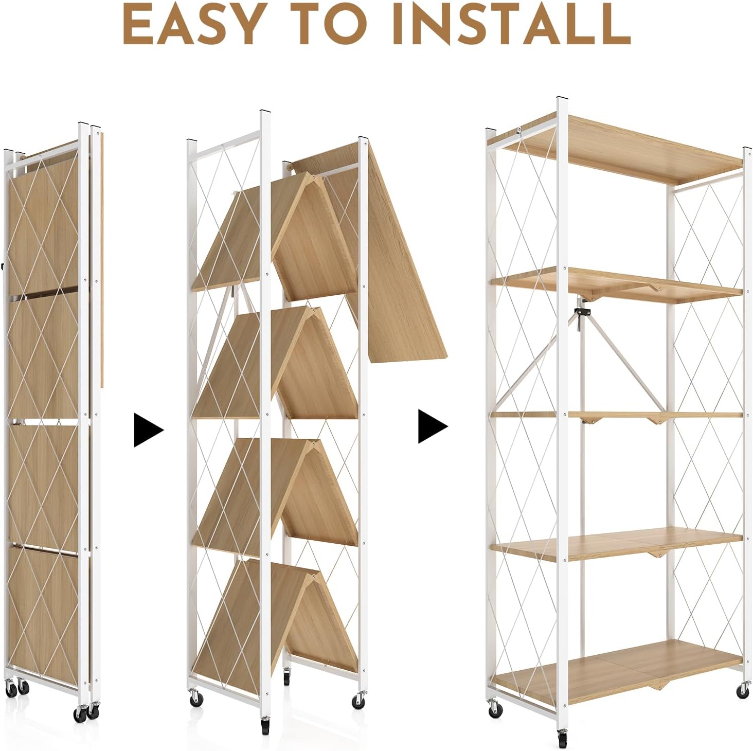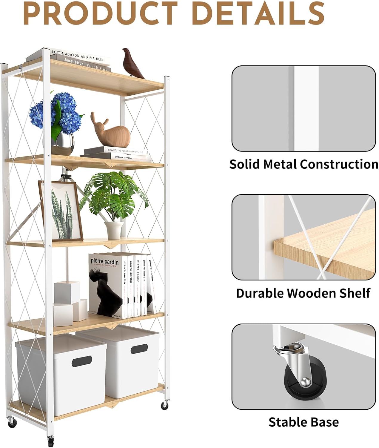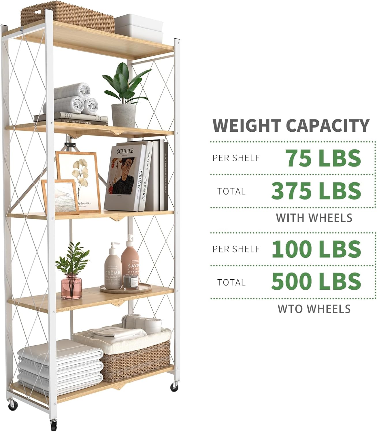 5 Tier Foldable Storage Shelf with Wheels,Folding Shelving Loads 500 LBS,No Assembly Bookshelf,Metal Shelving Units Storage for Garage,Living Room,Kitchen,Pantry, Office(27.9 x 13.3 x 62.6 in,White)
