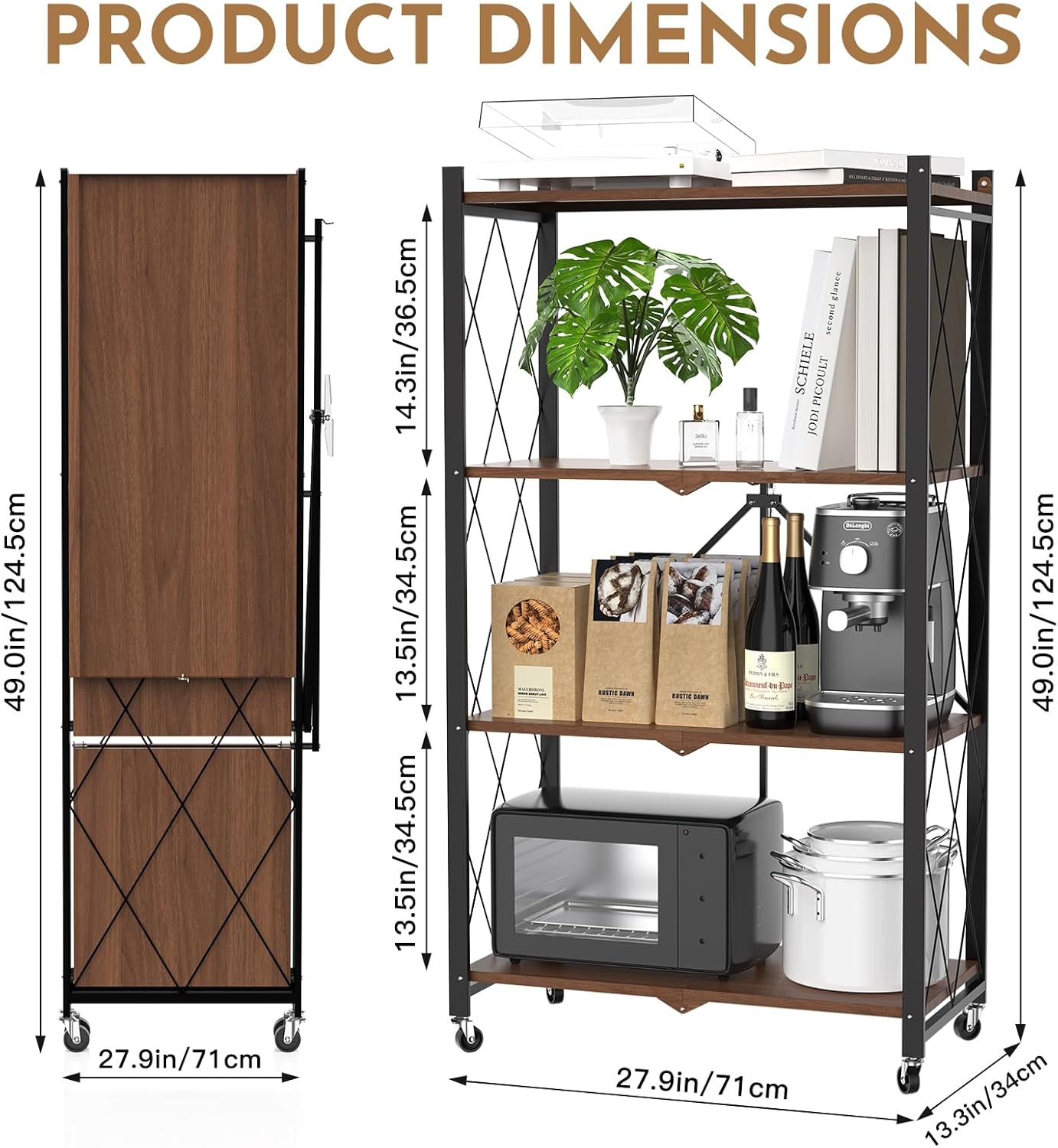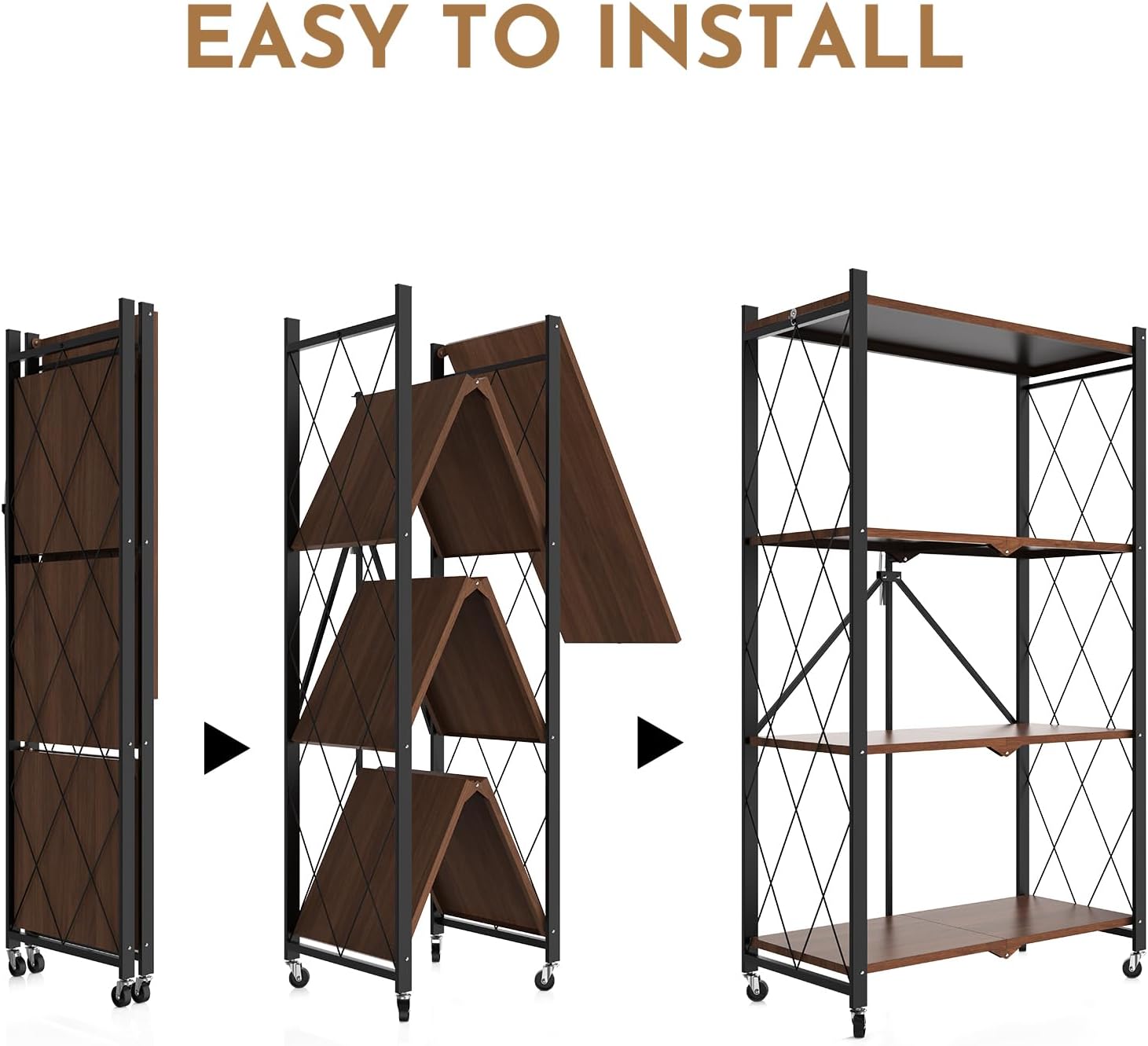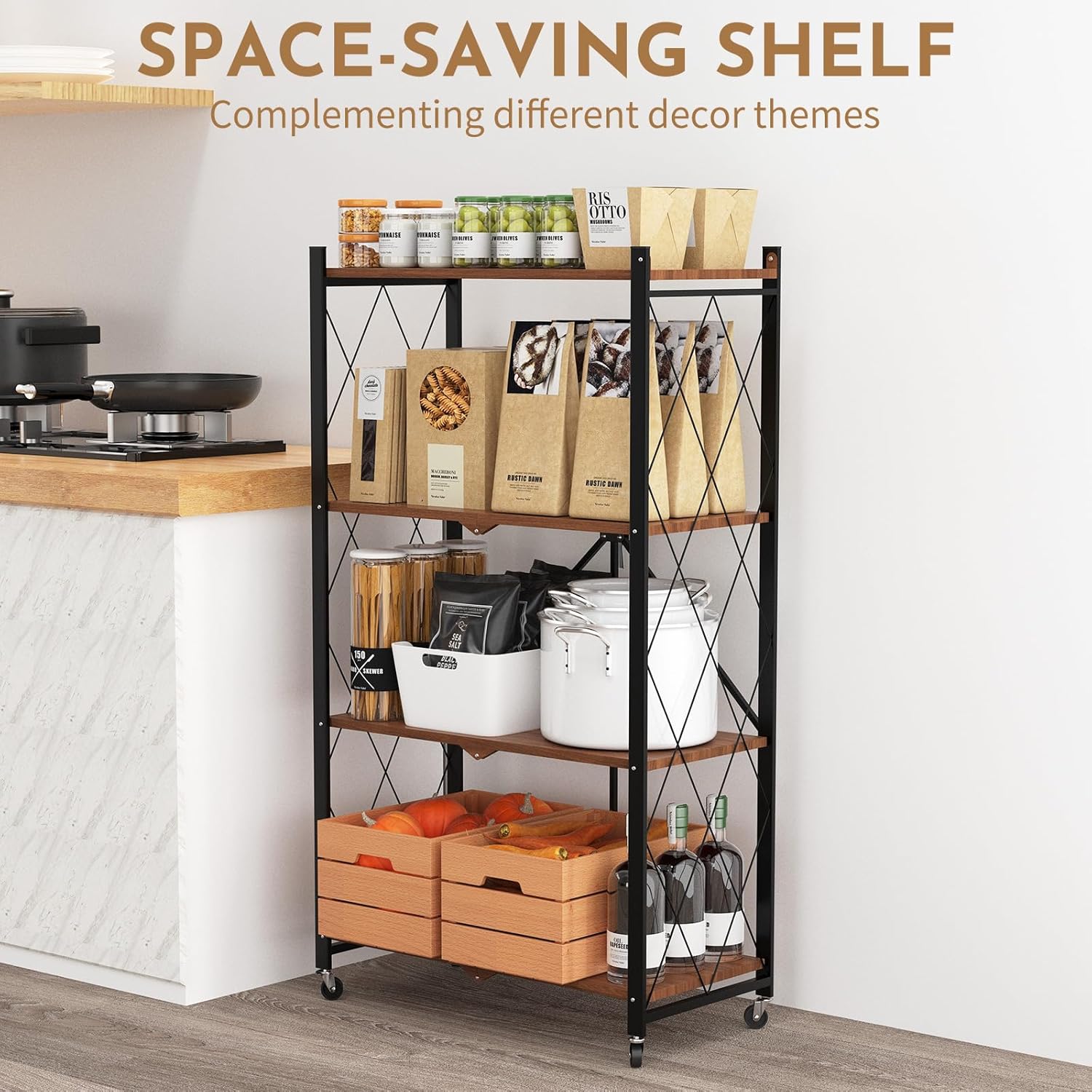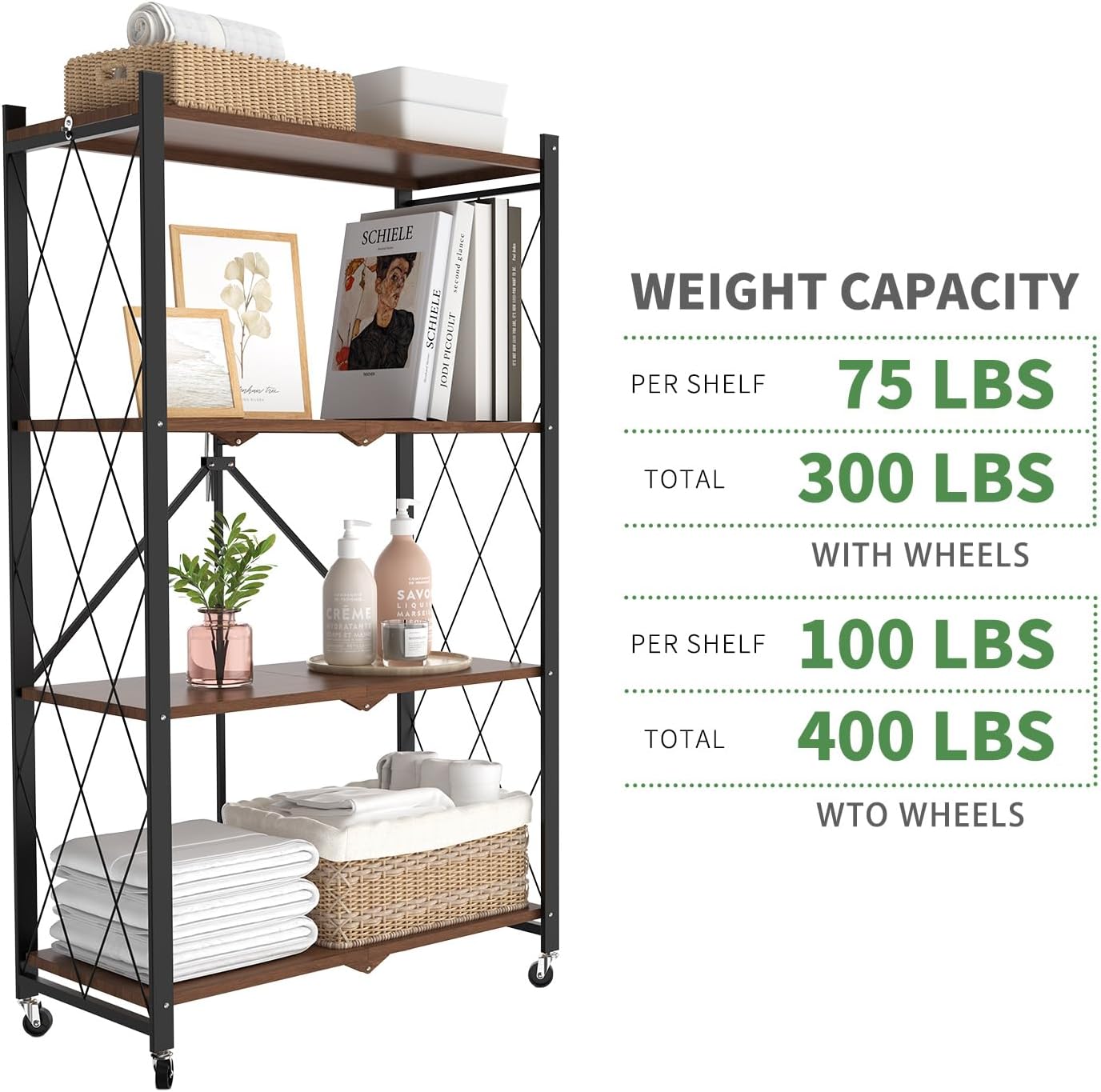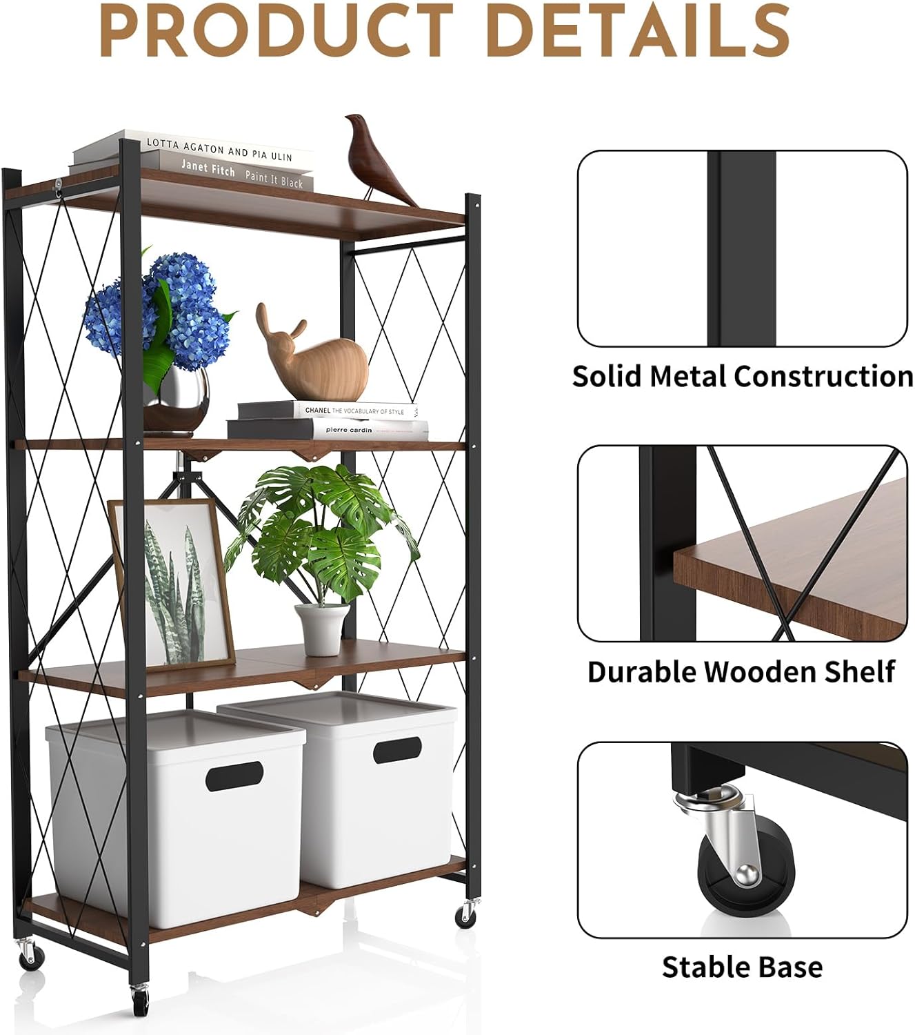 5 Tier Foldable Storage Shelf with Wheels,Folding Shelving Loads 500 LBS,No Assembly Bookshelf,Metal Shelving Units Storage for Garage,Living Room,Kitchen,Pantry, Office(27.9 x 13.3 x 62.6 in,White)