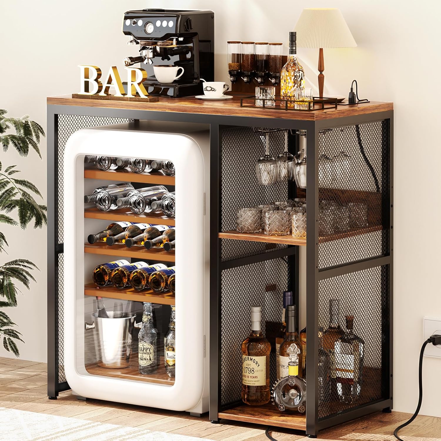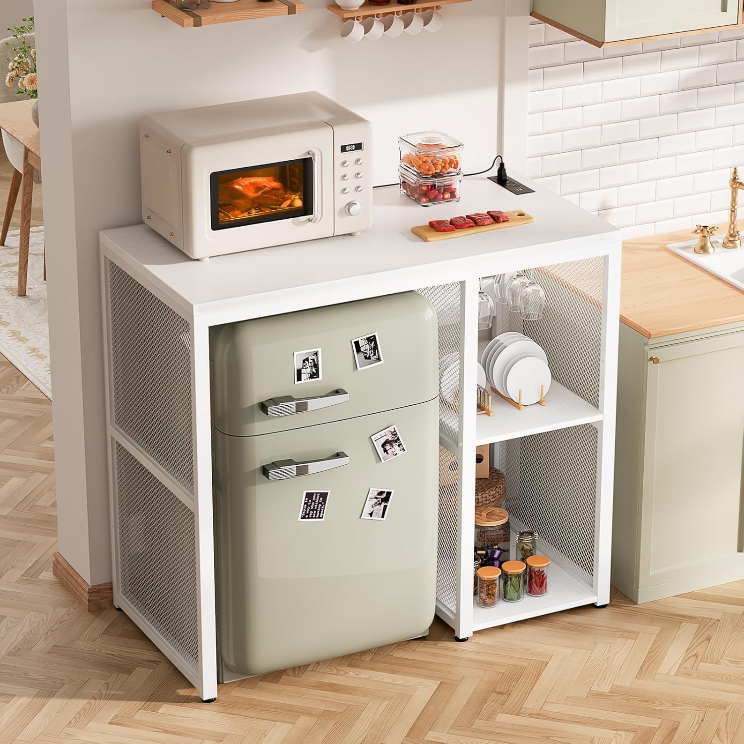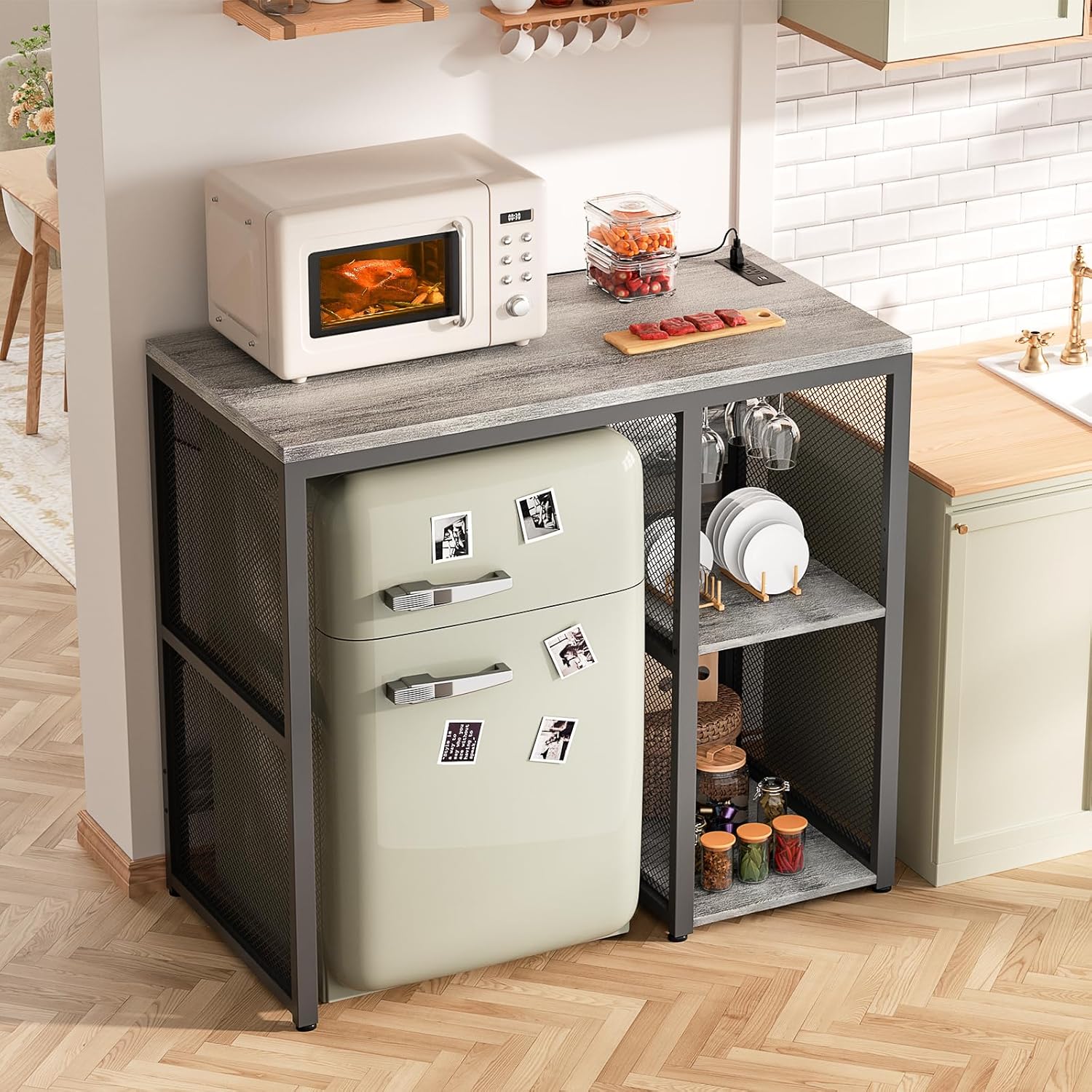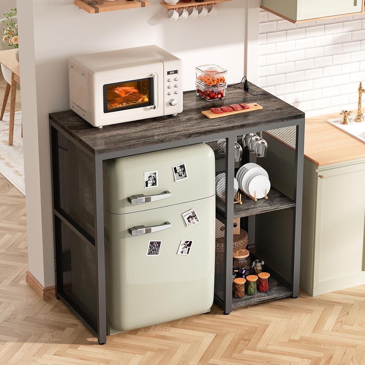 Homieasy Mini Fridge Stand Organizer with Power Outlet, Industrial Microwave Stand with Storage Shelving Unit, Space Saving Over Fridge Storage Cabinet for Home Kitchen Dorm, Black
