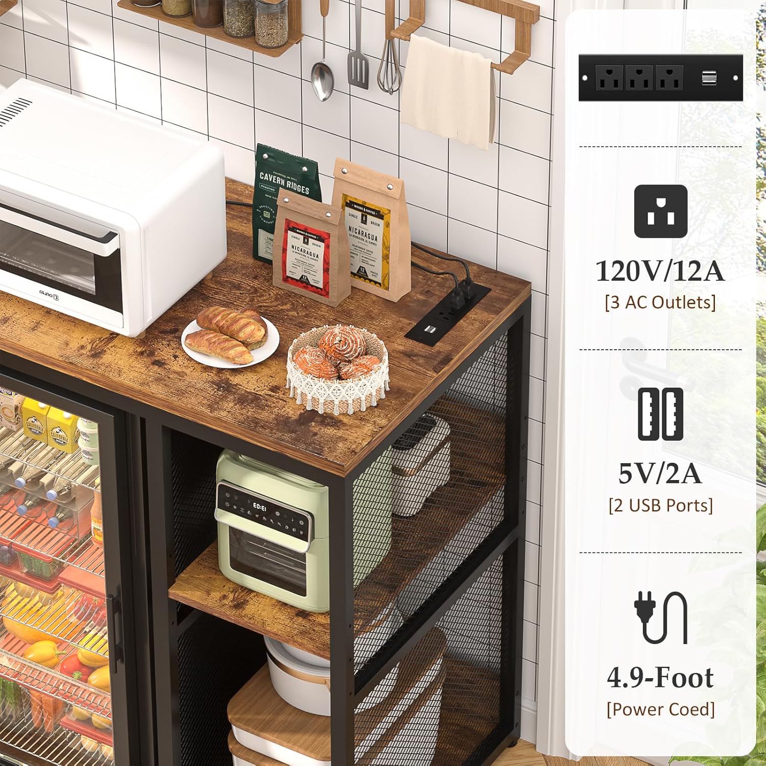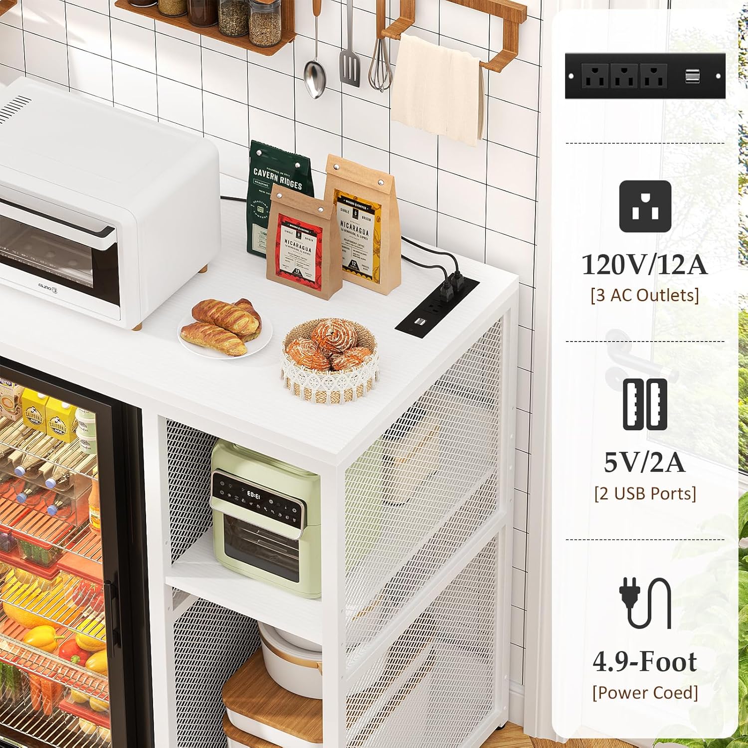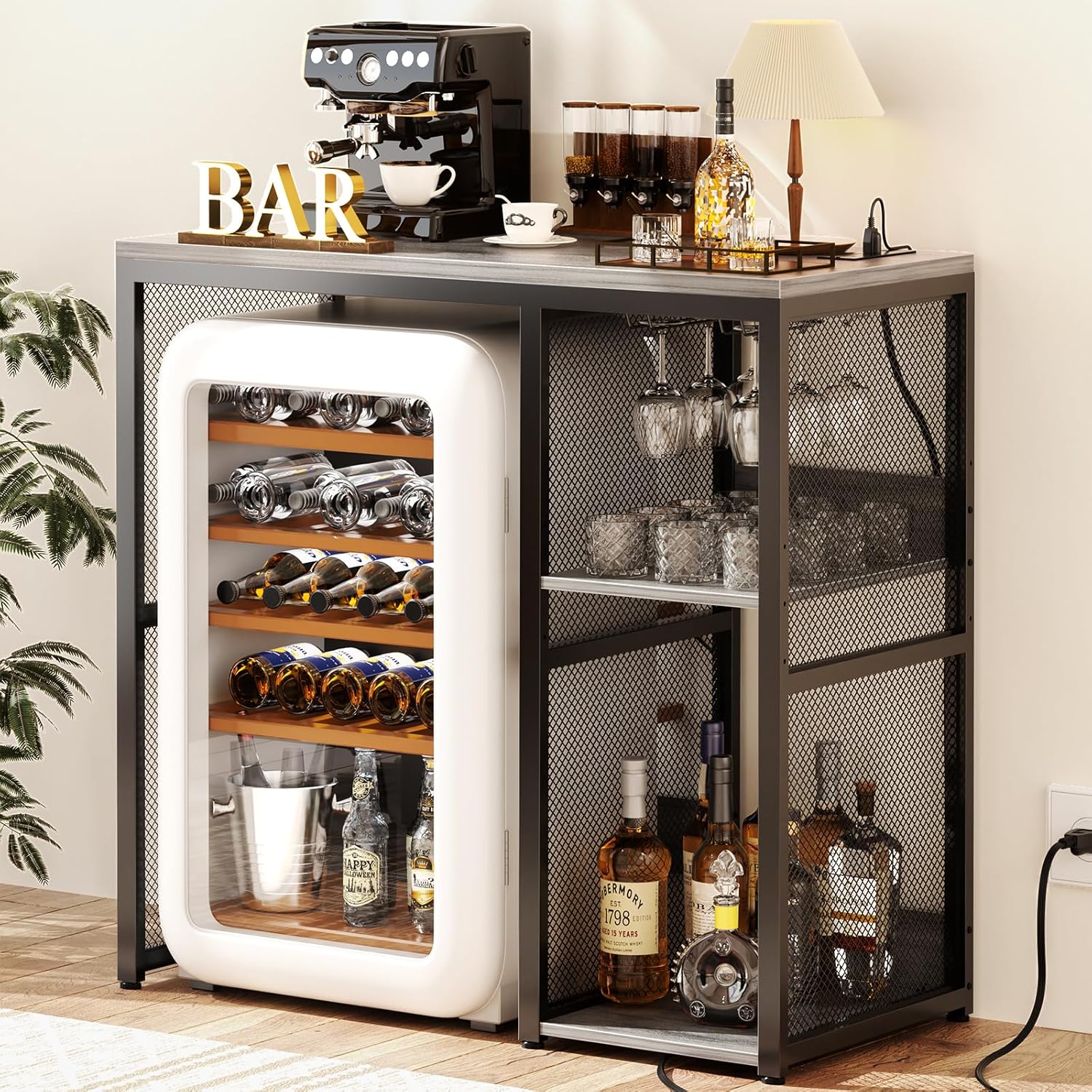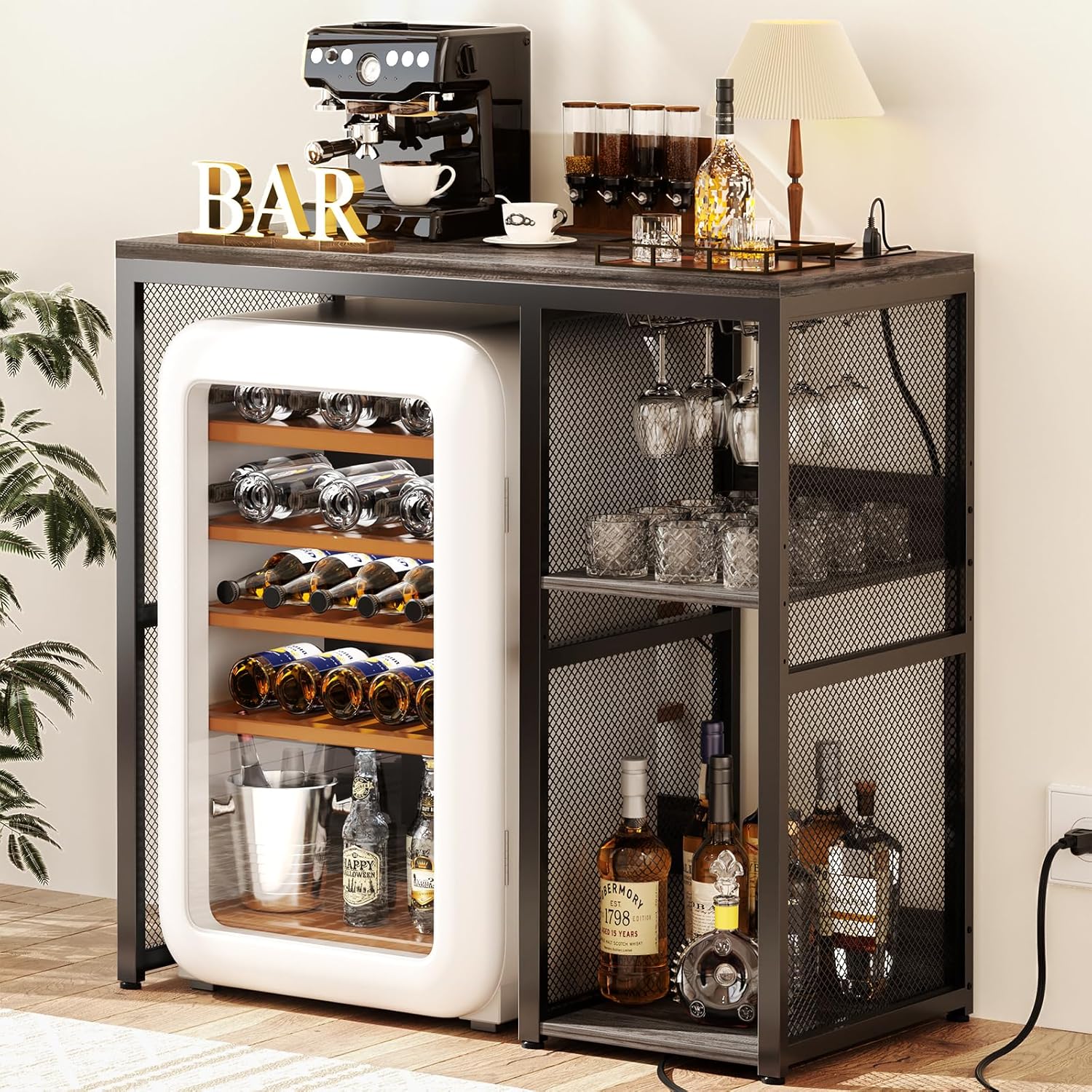 Homieasy Mini Fridge Stand Organizer with Power Outlet, Industrial Microwave Stand with Storage Shelving Unit, Space Saving Over Fridge Storage Cabinet for Home Kitchen Dorm, Black
