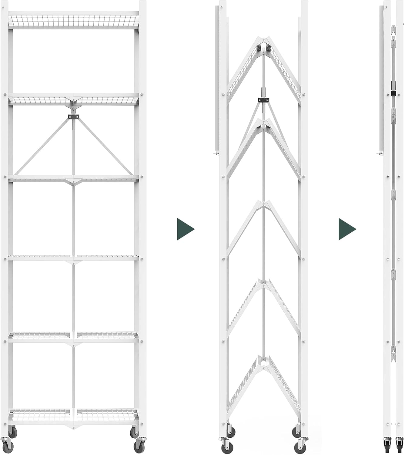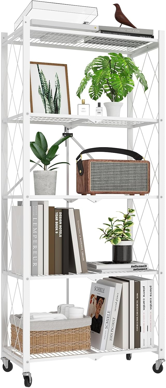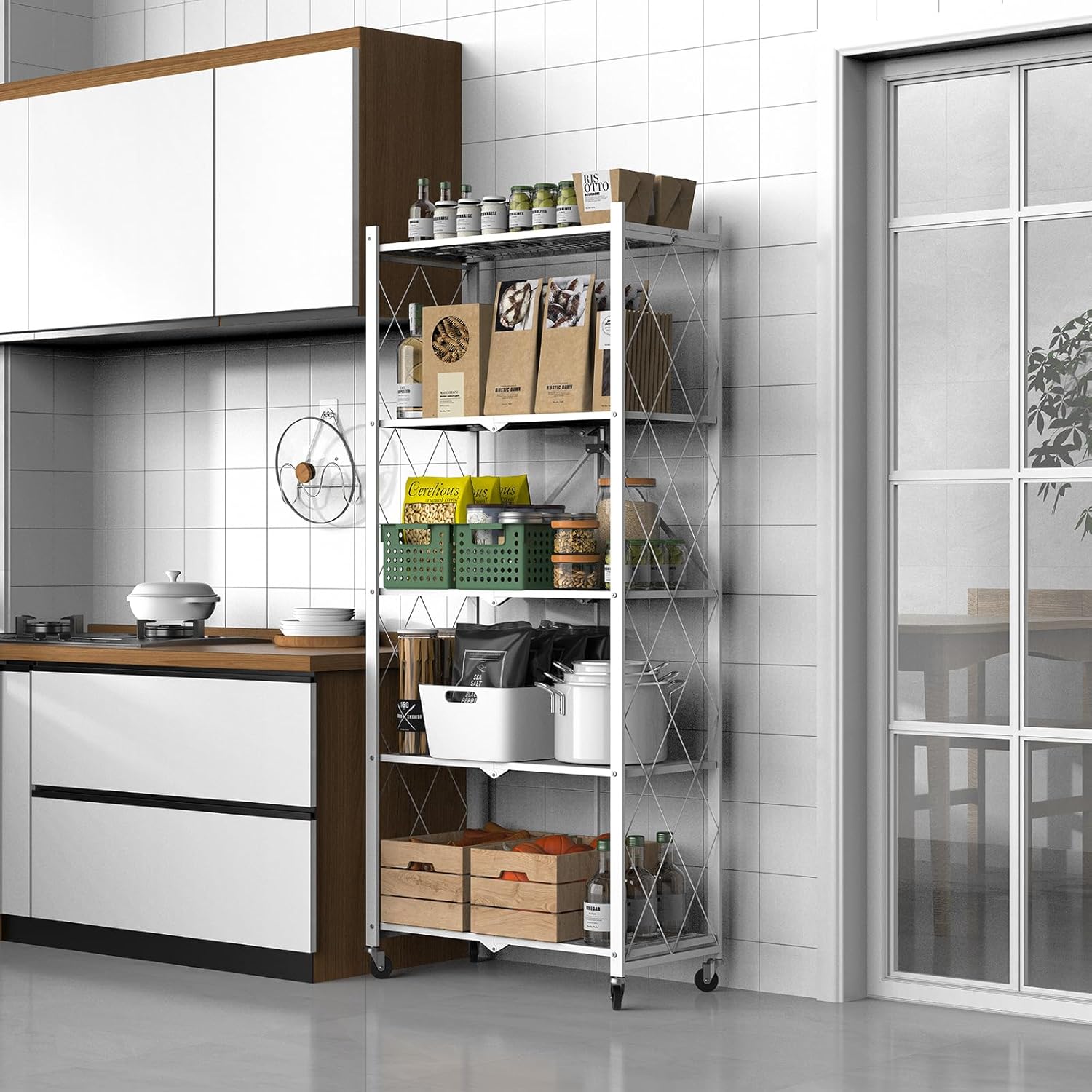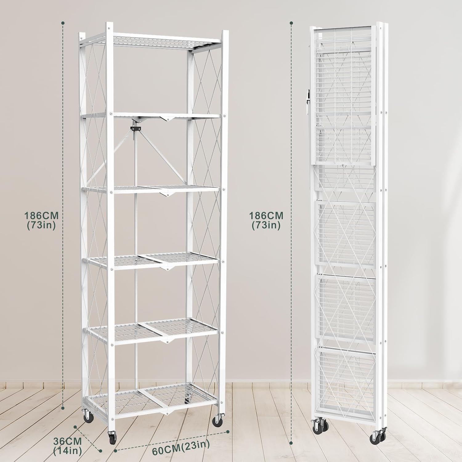 72" H 6 Tier Foldable Storage Shelf with Wheels, Folding Shelving Loads 600 LBS, Metal Steel Garage Shelves, Rolling Standing Utility Rack for Kitchen, Pantry, Office, White