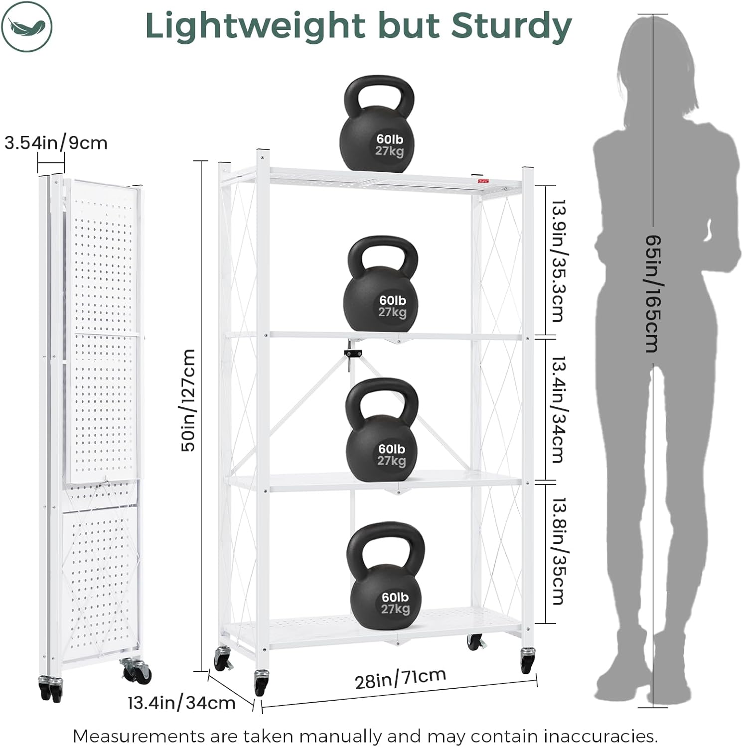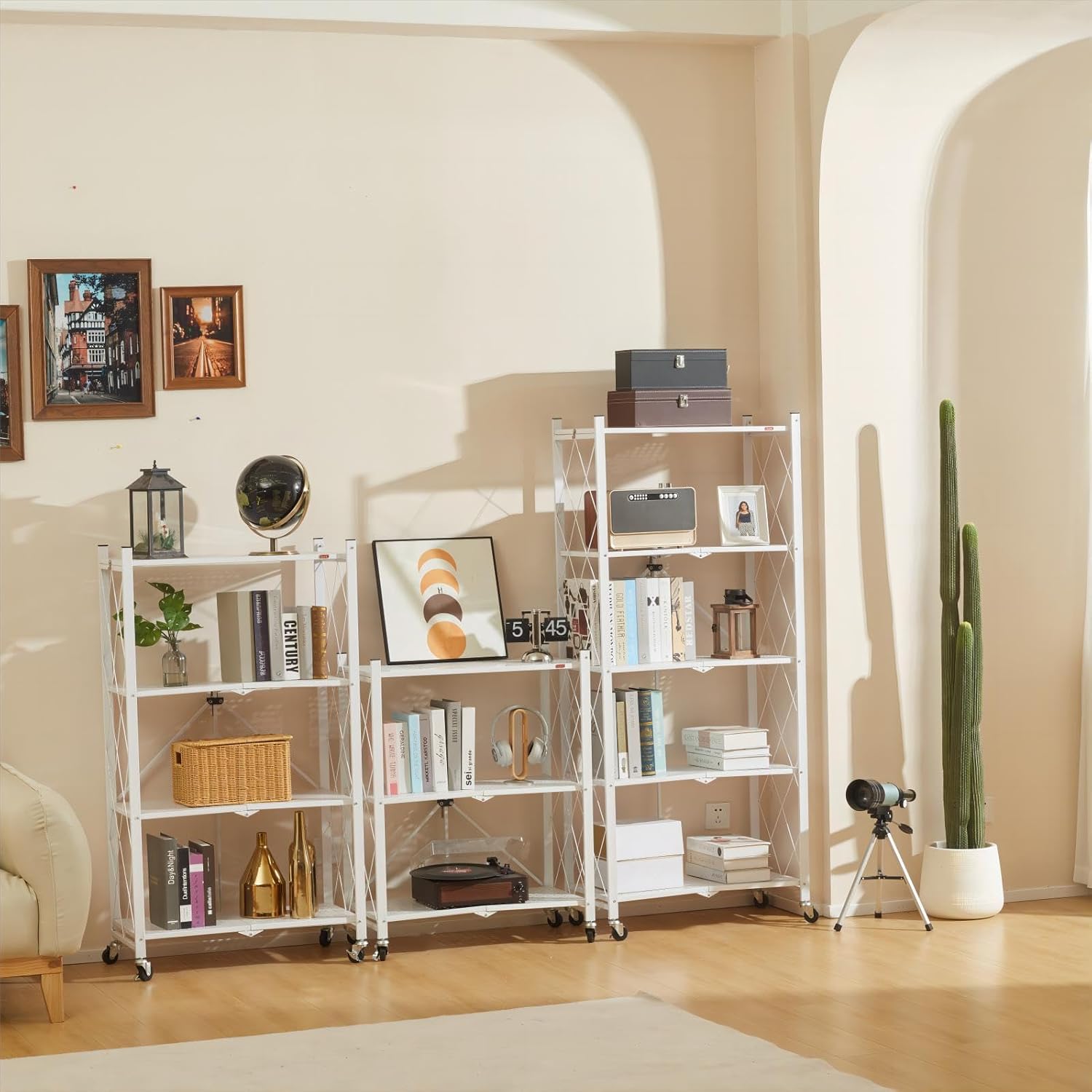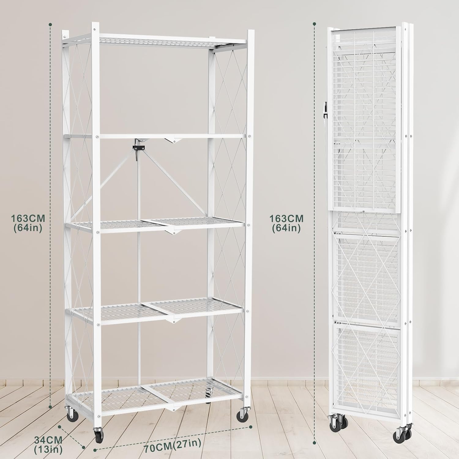 72" H 6 Tier Foldable Storage Shelf with Wheels, Folding Shelving Loads 600 LBS, Metal Steel Garage Shelves, Rolling Standing Utility Rack for Kitchen, Pantry, Office, White