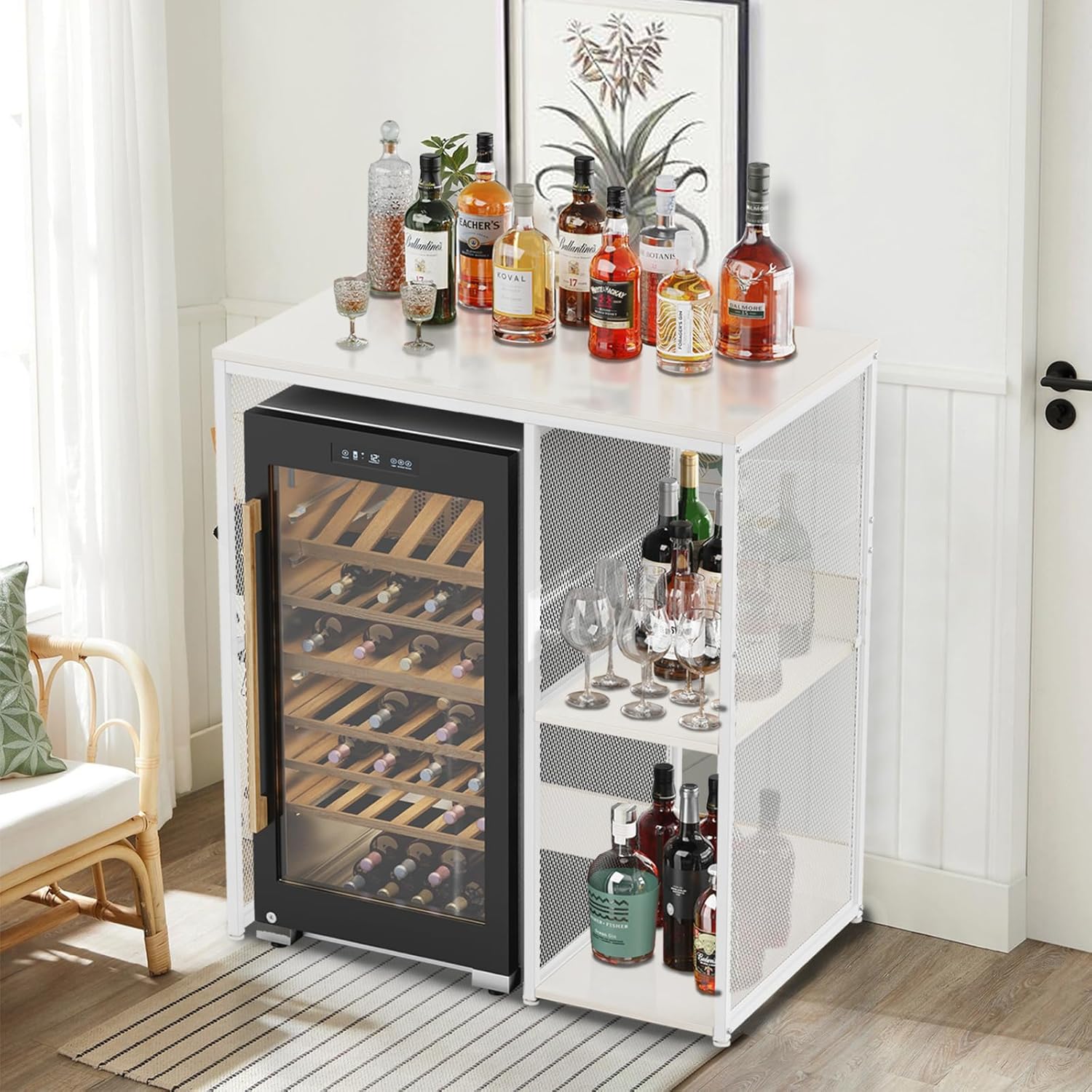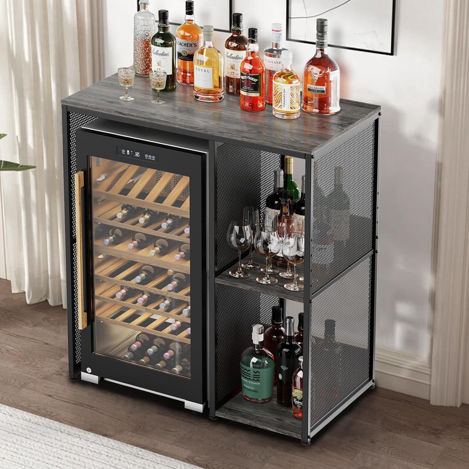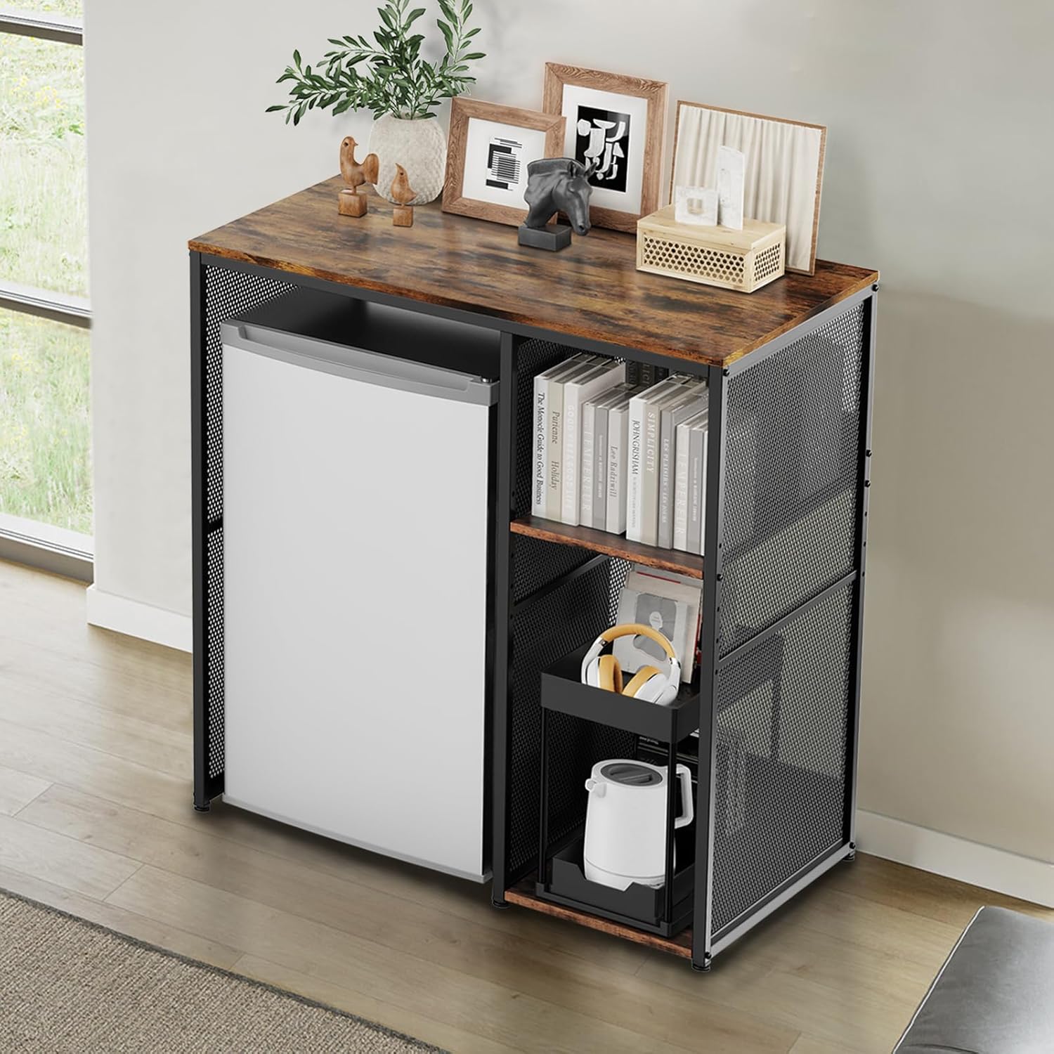 3-Tier Mini Fridge Cabinet with Storage, Industrial Style Kitchen Microwave Stand Baker Rack, Utility Storage Shelf with Mini Fridge Space for Home Kitchen Dorm, Vintage Wood