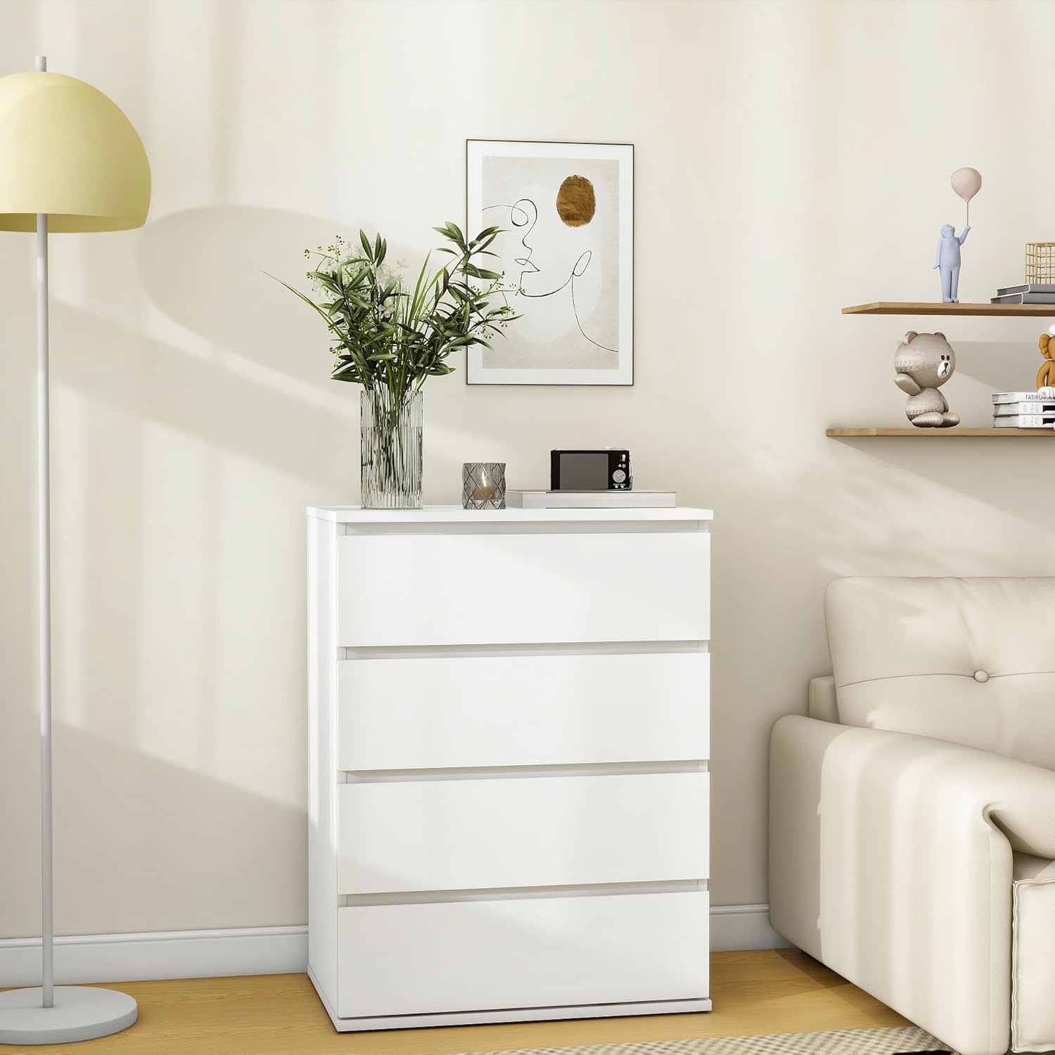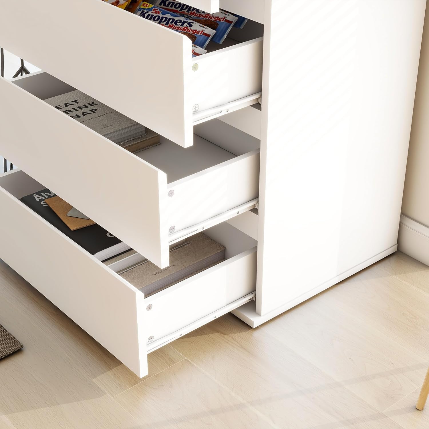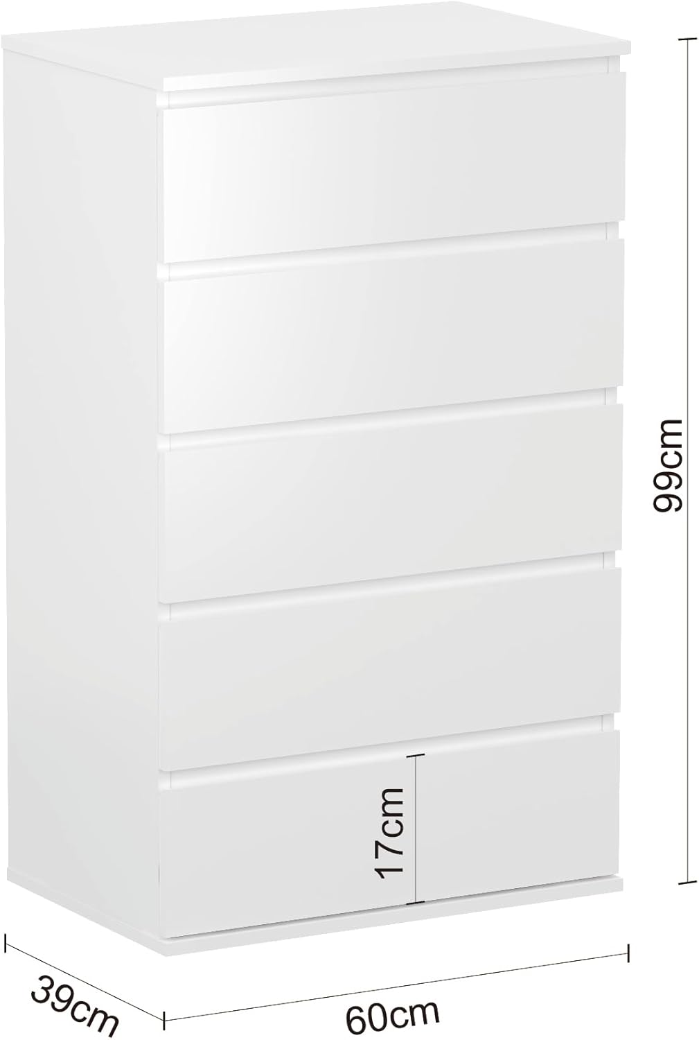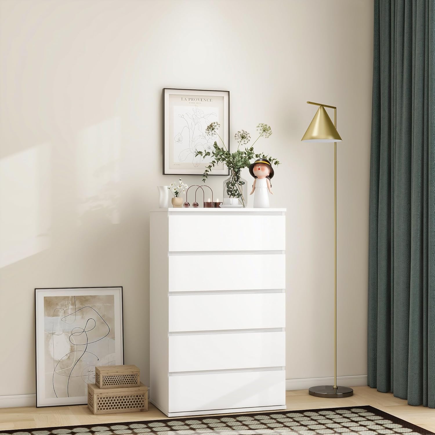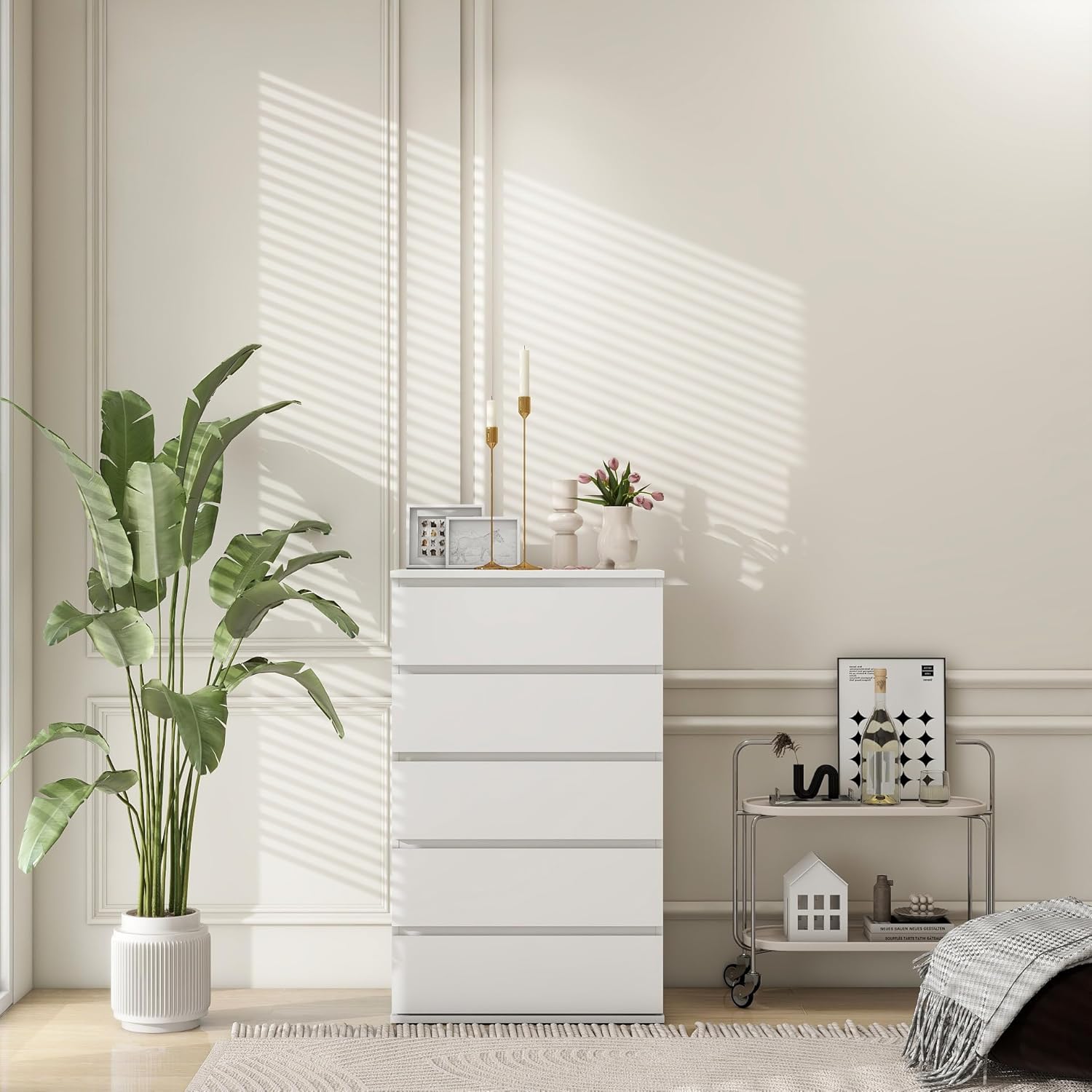 Modern Chest of Drawers, 4/5/6 Drawer Dresser Without Handles Floor Storage Drawer Cabinet Vertical Dresser Storage Organizer for Home Office(5 Drawers, White)