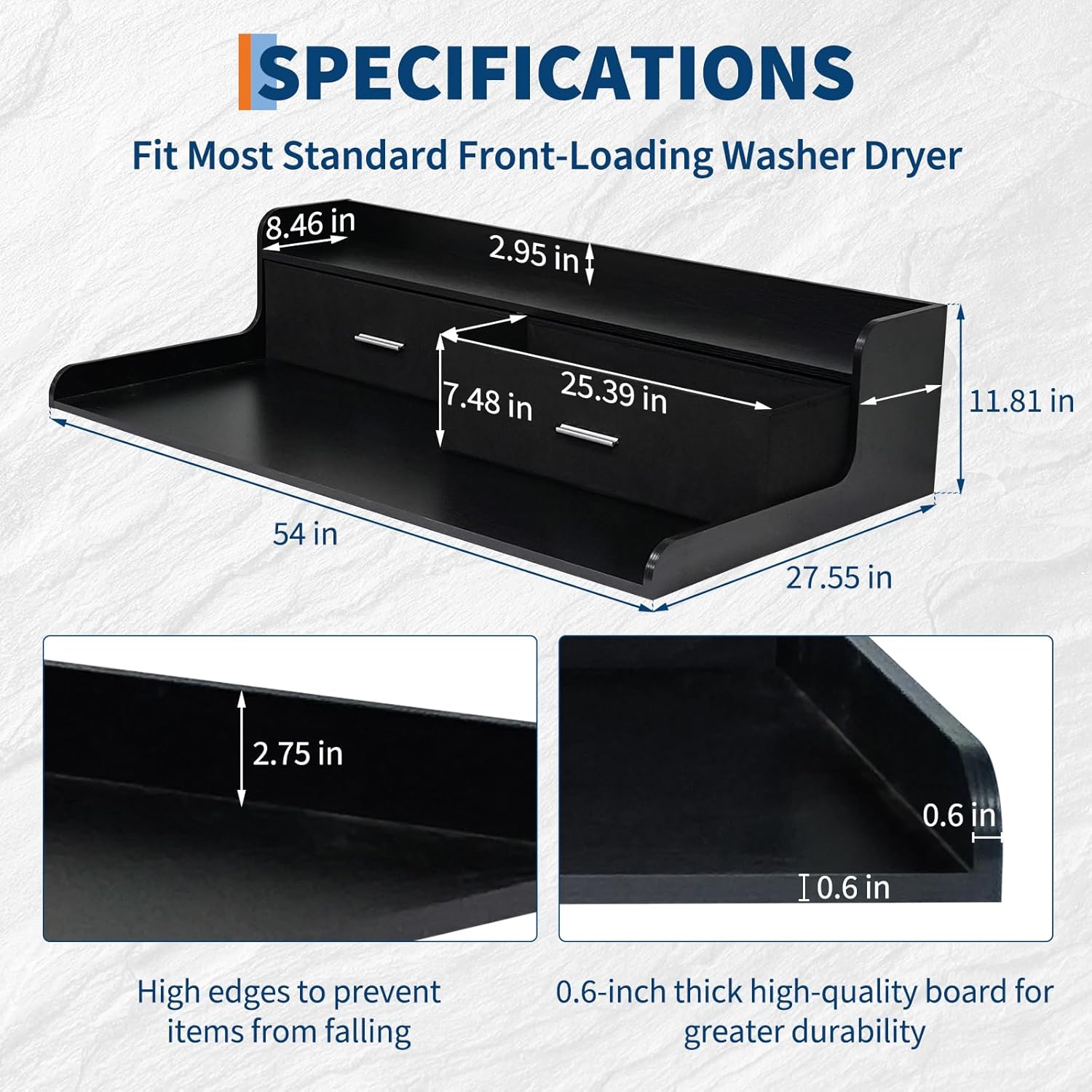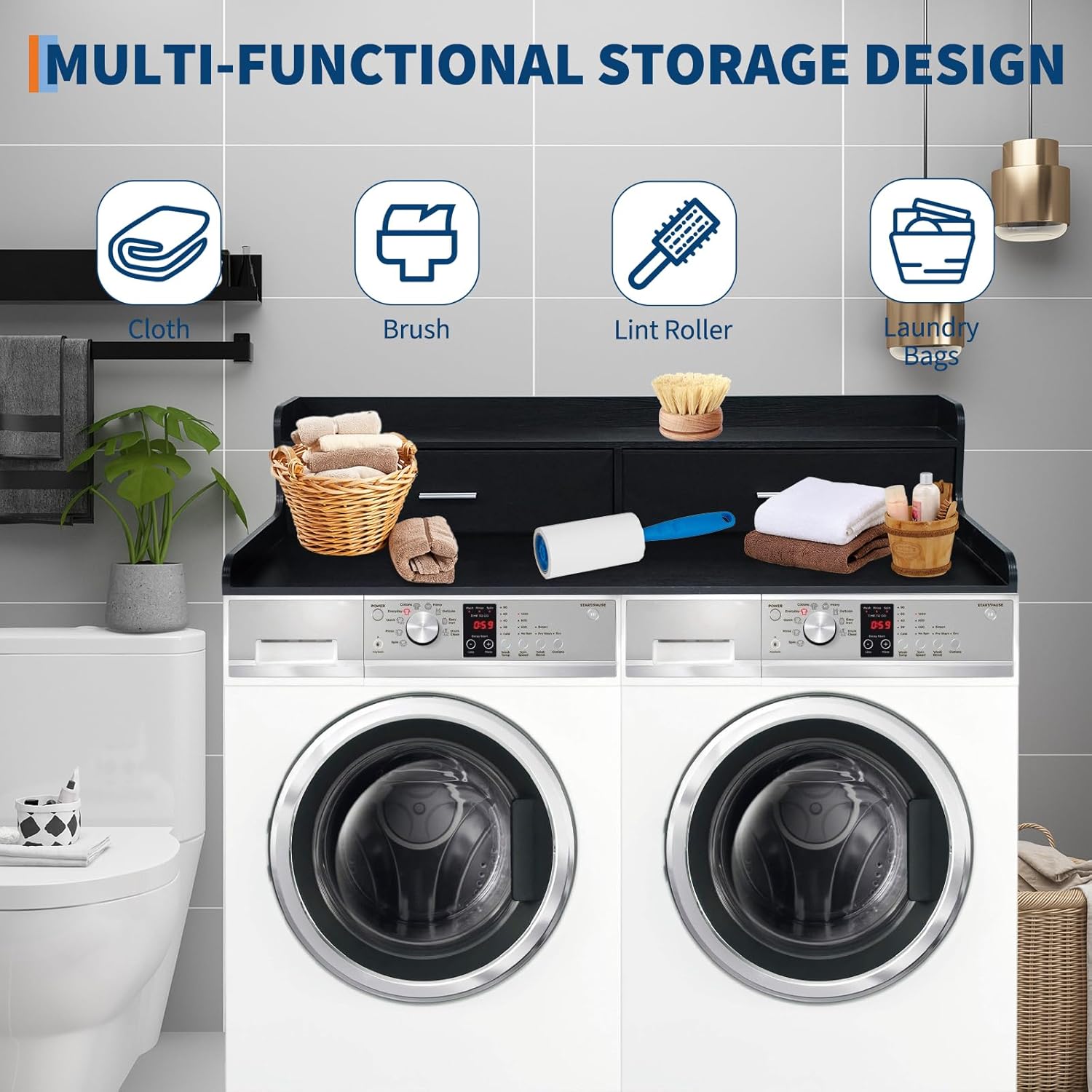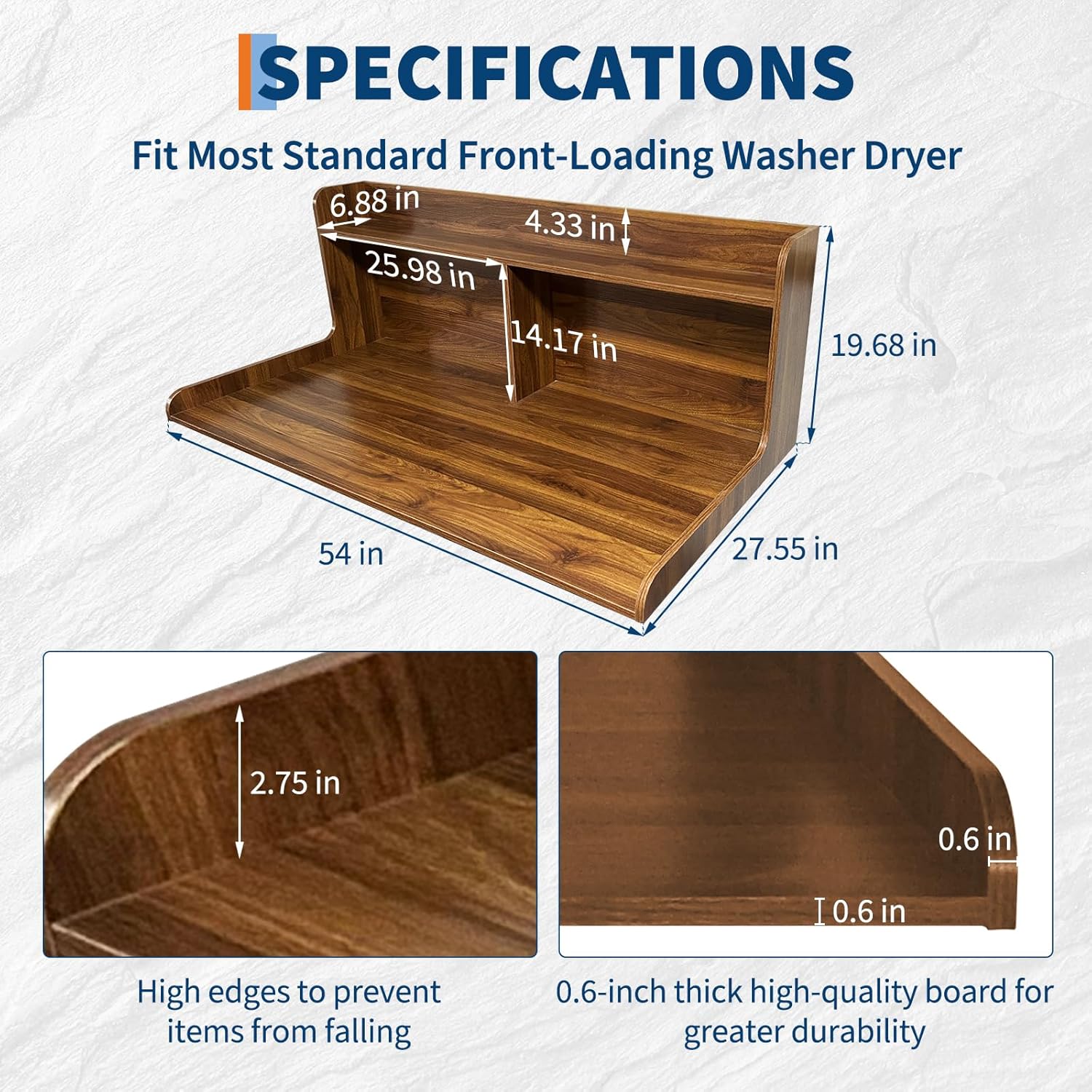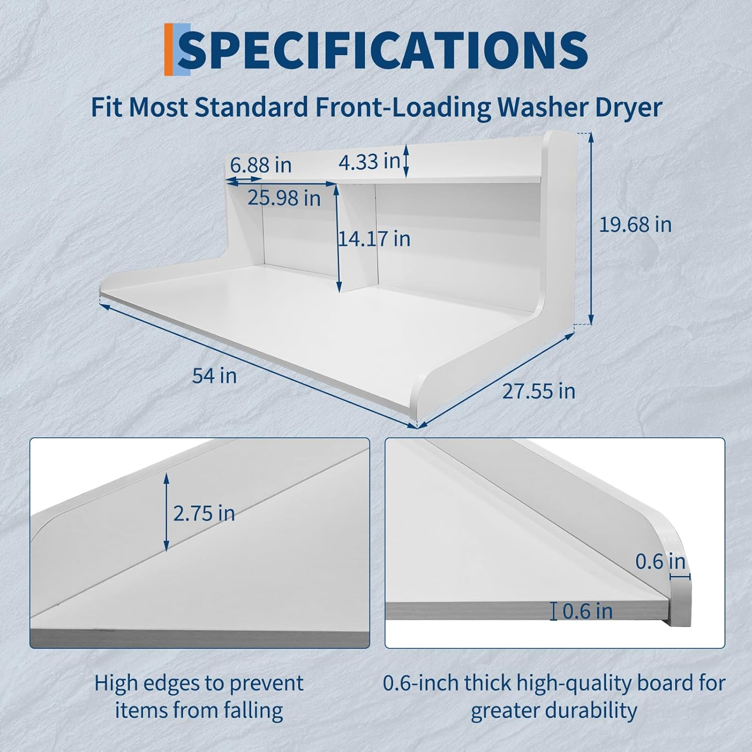 Washer Dryer Countertop, Wood Laundry Countertop with 2.75" H Edge Rails, Waterproof Washer Dryer Cover with Anti-Slip Pads (White, 2-Tier-54" W x 27.55" D x 19.68" H)