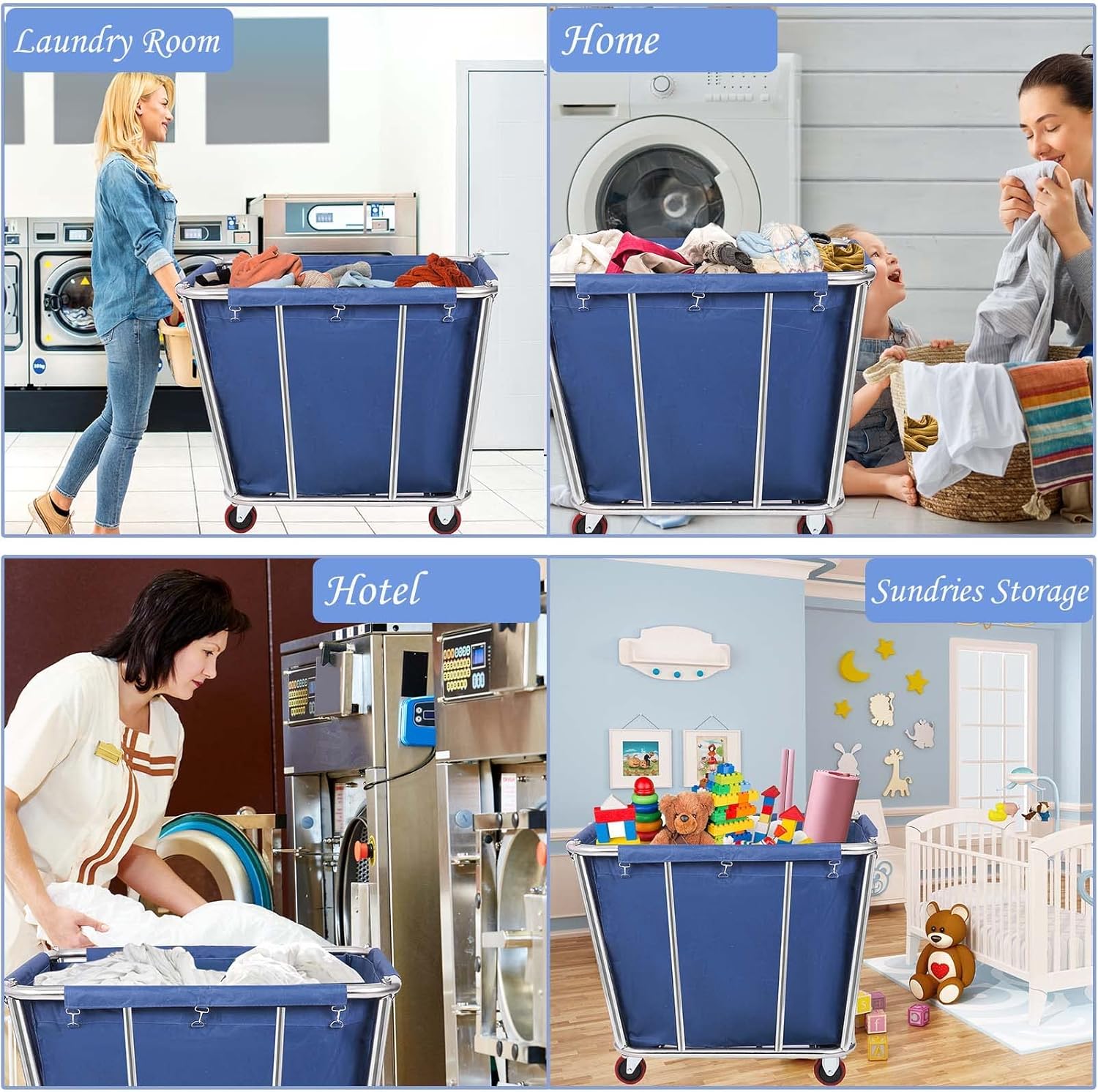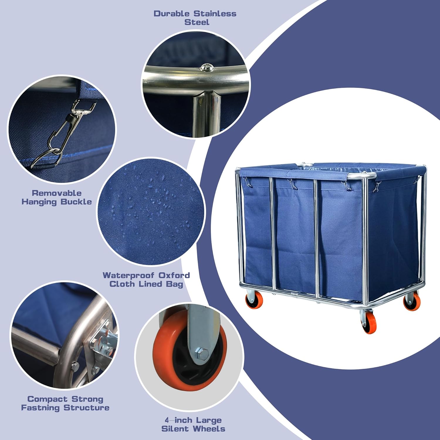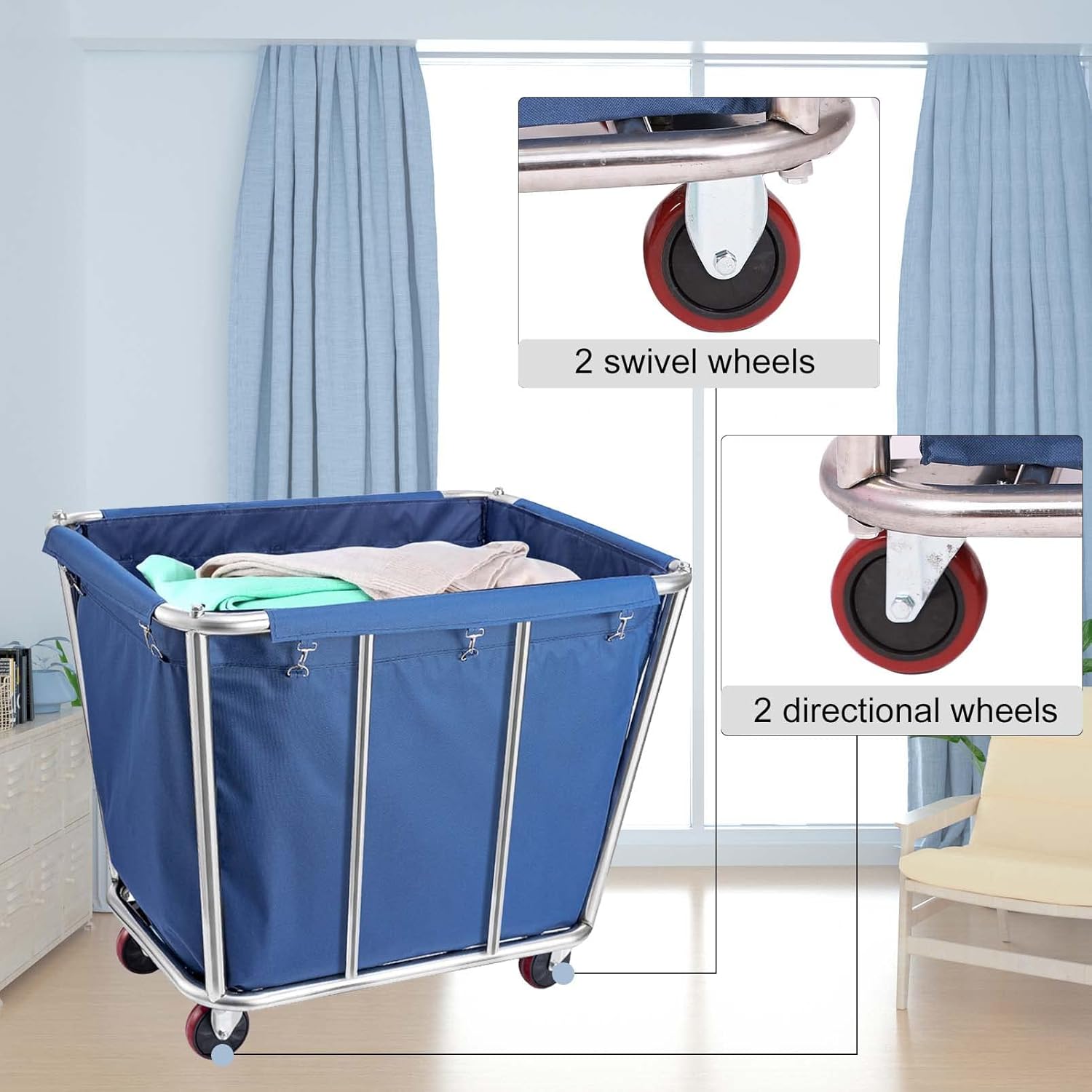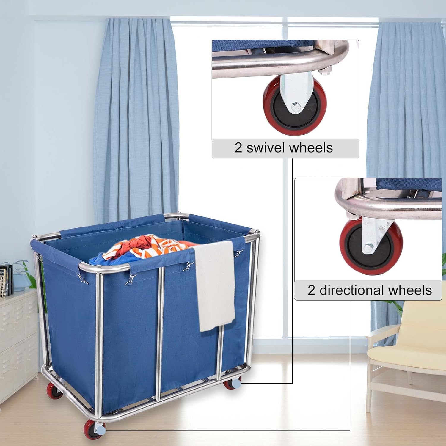 Commercial Laundry Cart with Wheels, 400L Large Capacity Heavy Duty Stainless Laundry Basket,Laundry Sorter for Clothes Storage,330 lbs Load (Blue)
