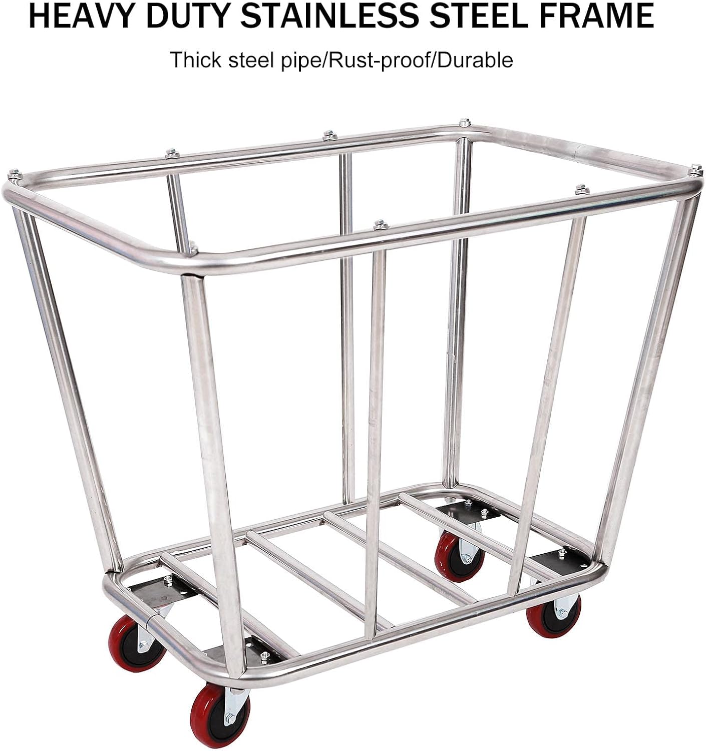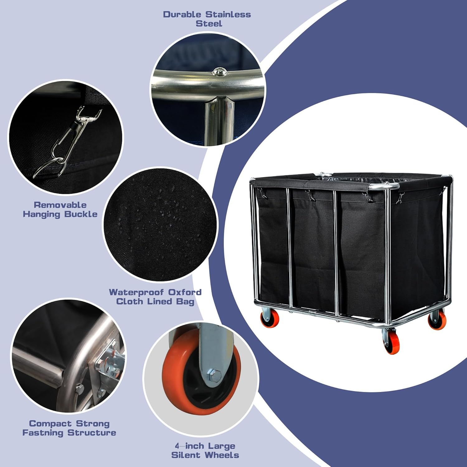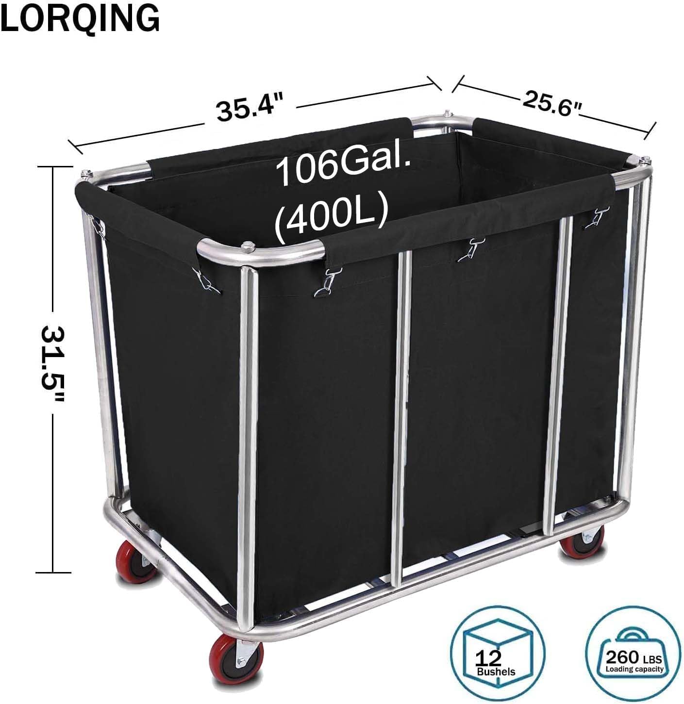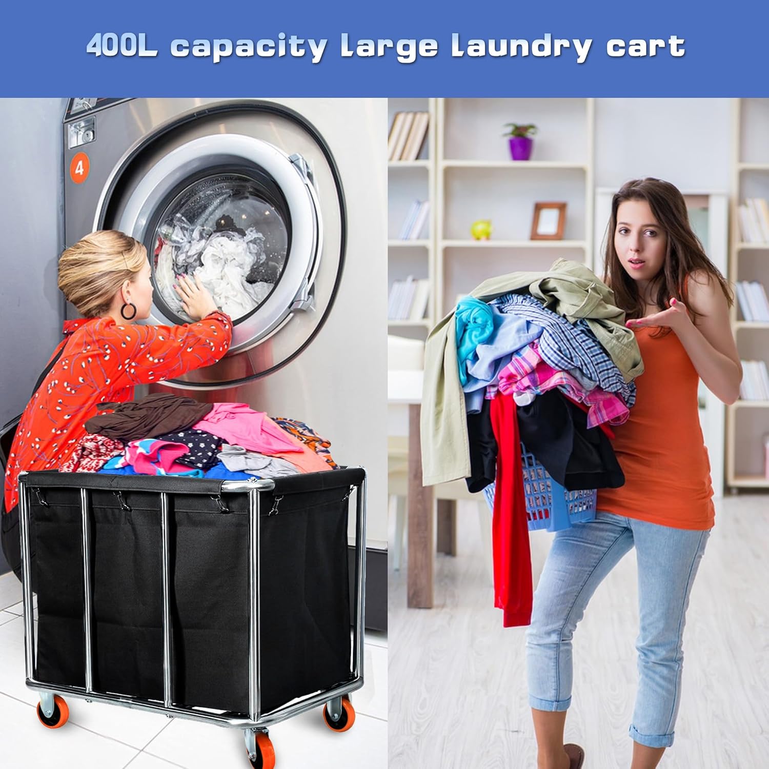 Commercial Laundry Cart with Wheels, 400L Large Capacity Heavy Duty Stainless Laundry Basket,Laundry Sorter for Clothes Storage,330 lbs Load (Black)