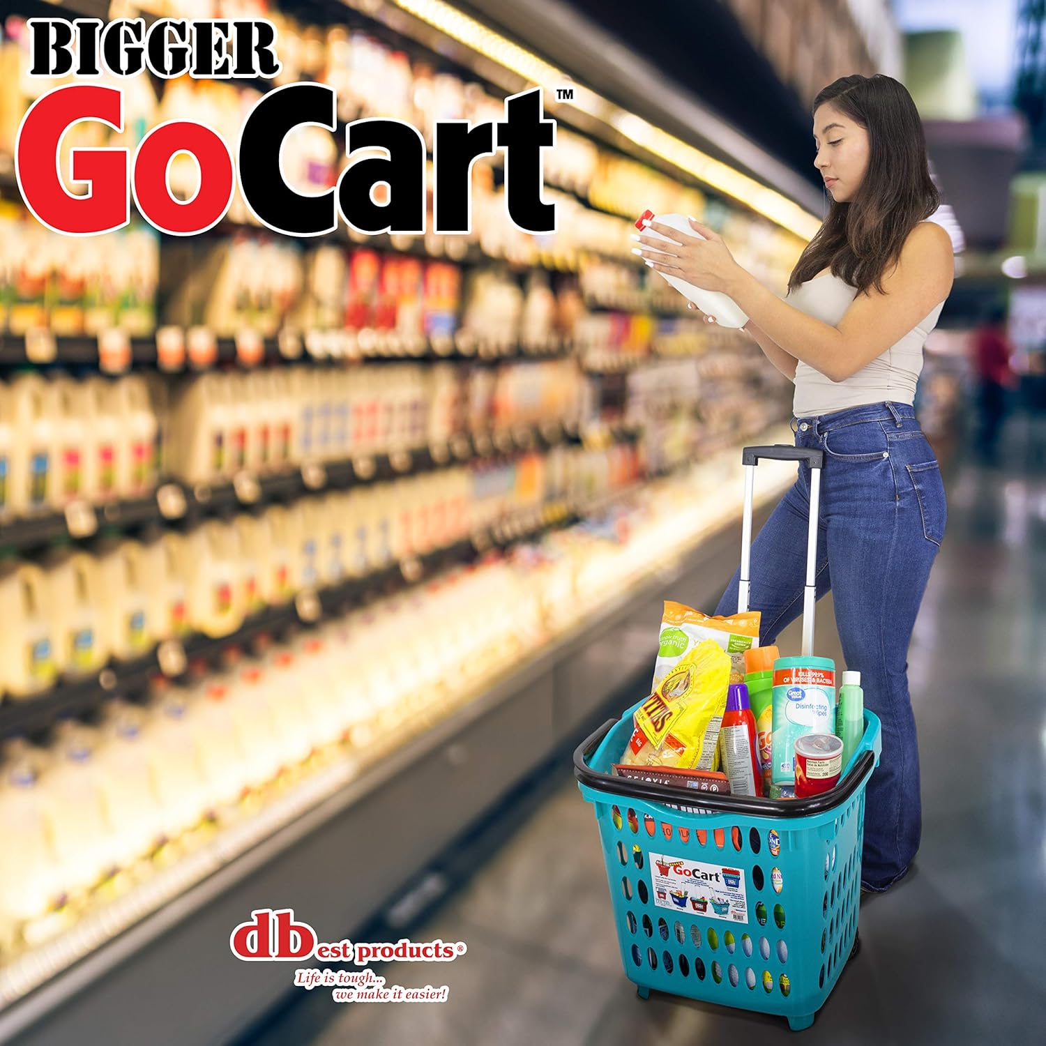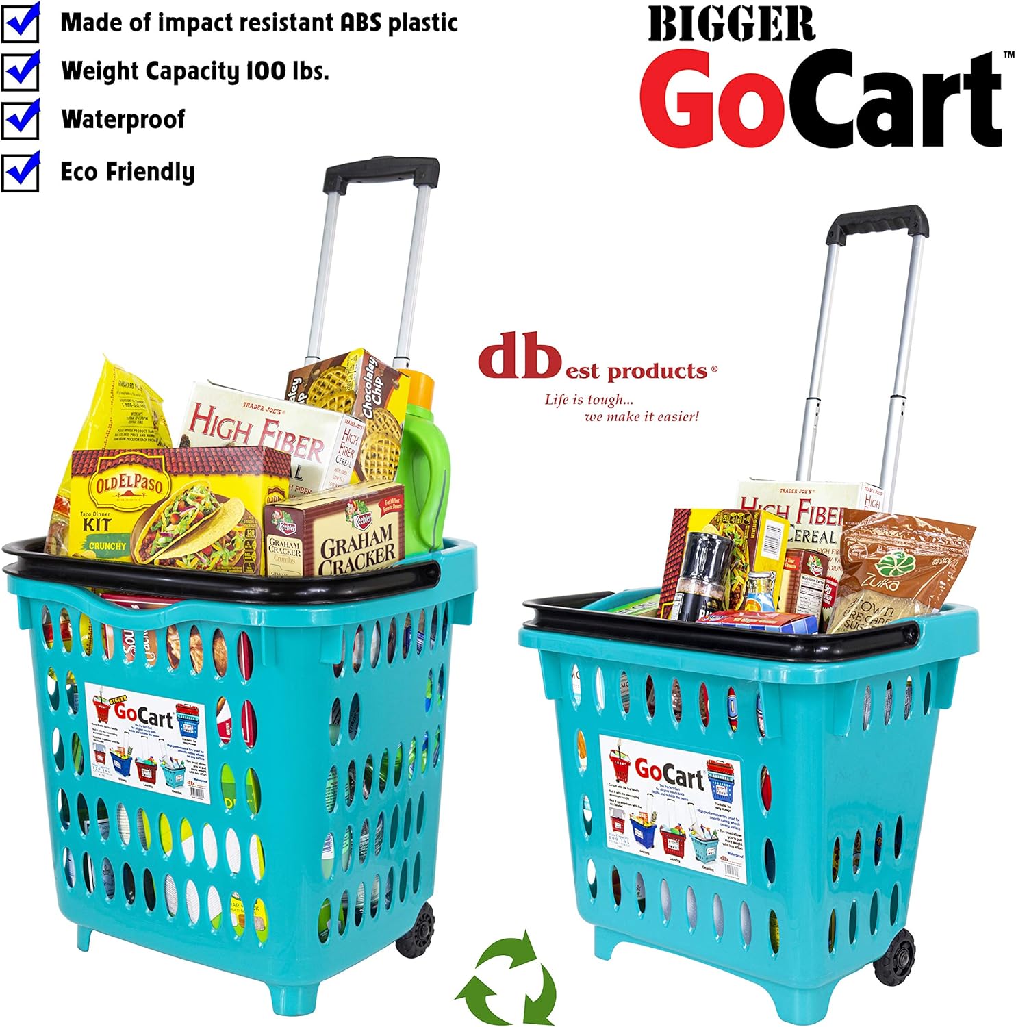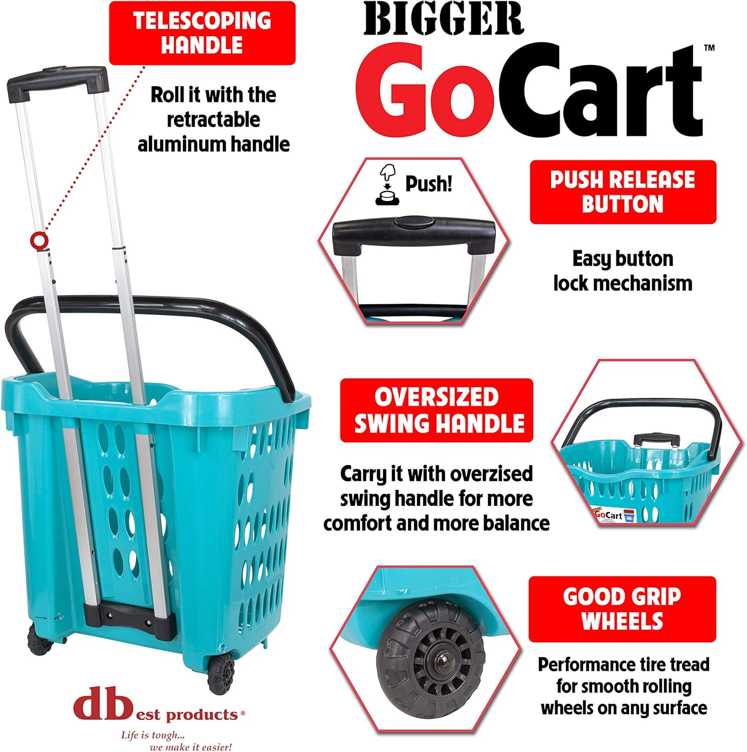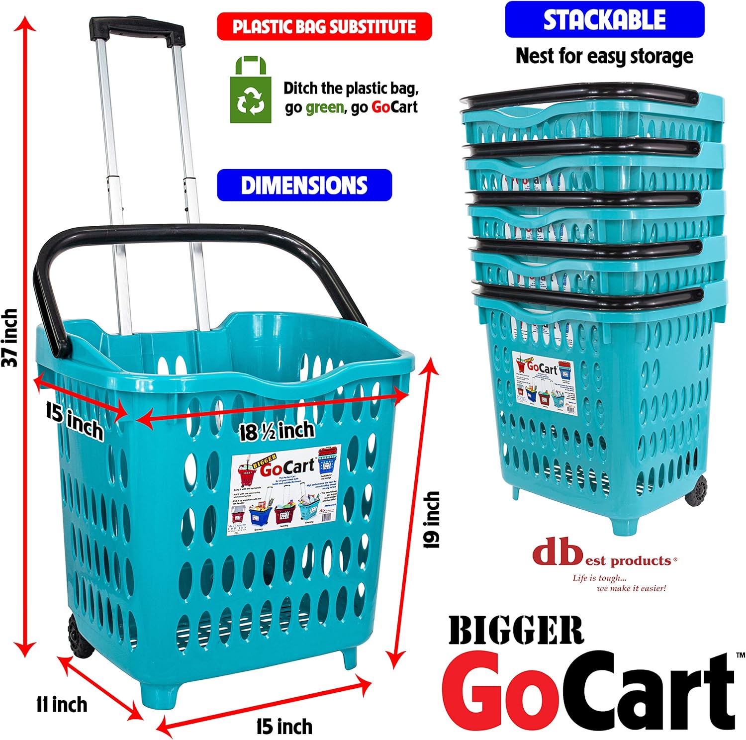 dbest products Bigger GoCart Grocery Cart Rolling Shopping Laundry Basket on Wheels Hamper with Telescopic Handle Cleaning Caddy Trolley, Teal, Bigger 1 pack