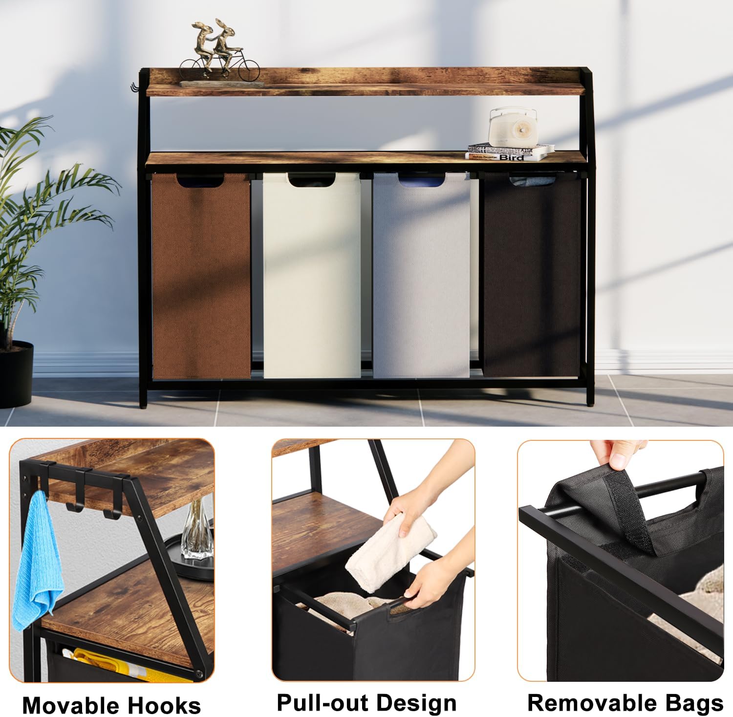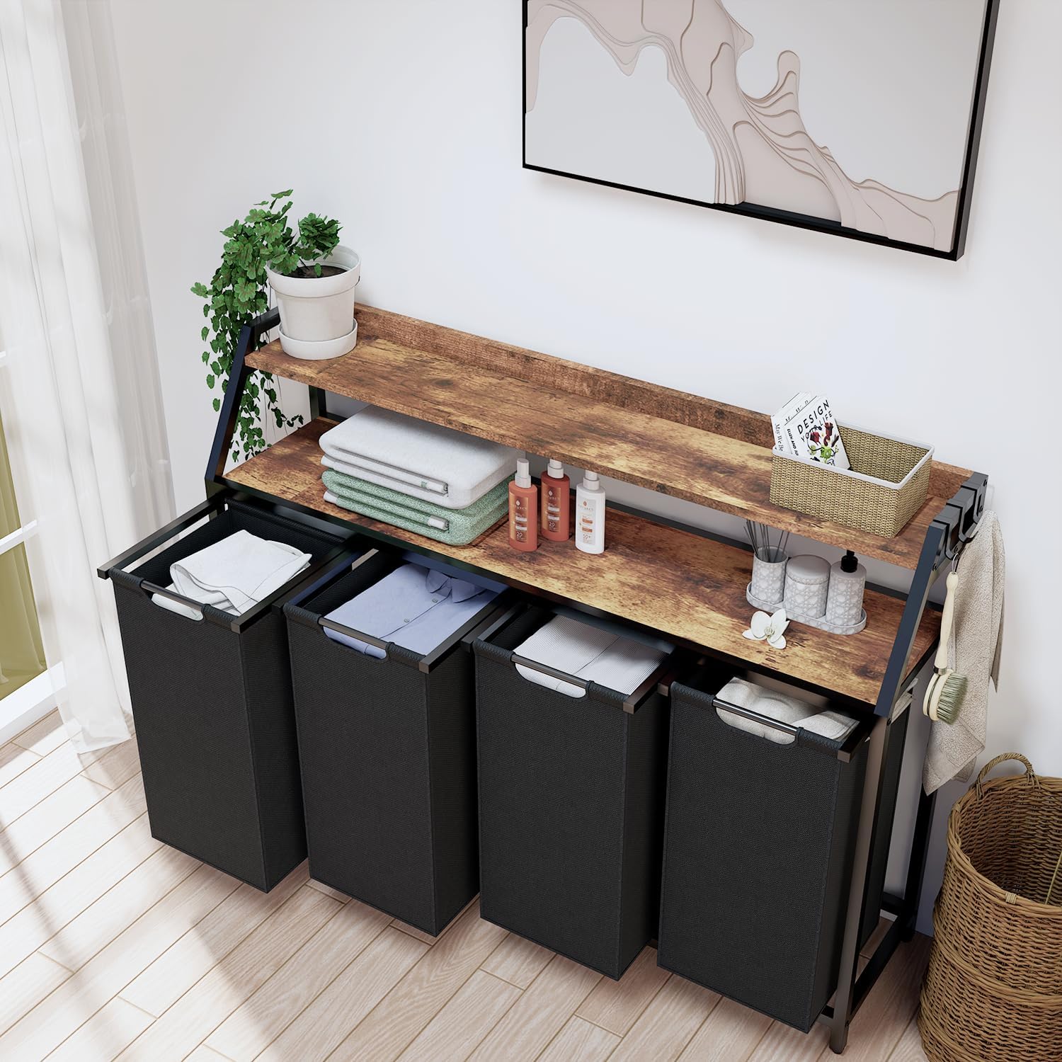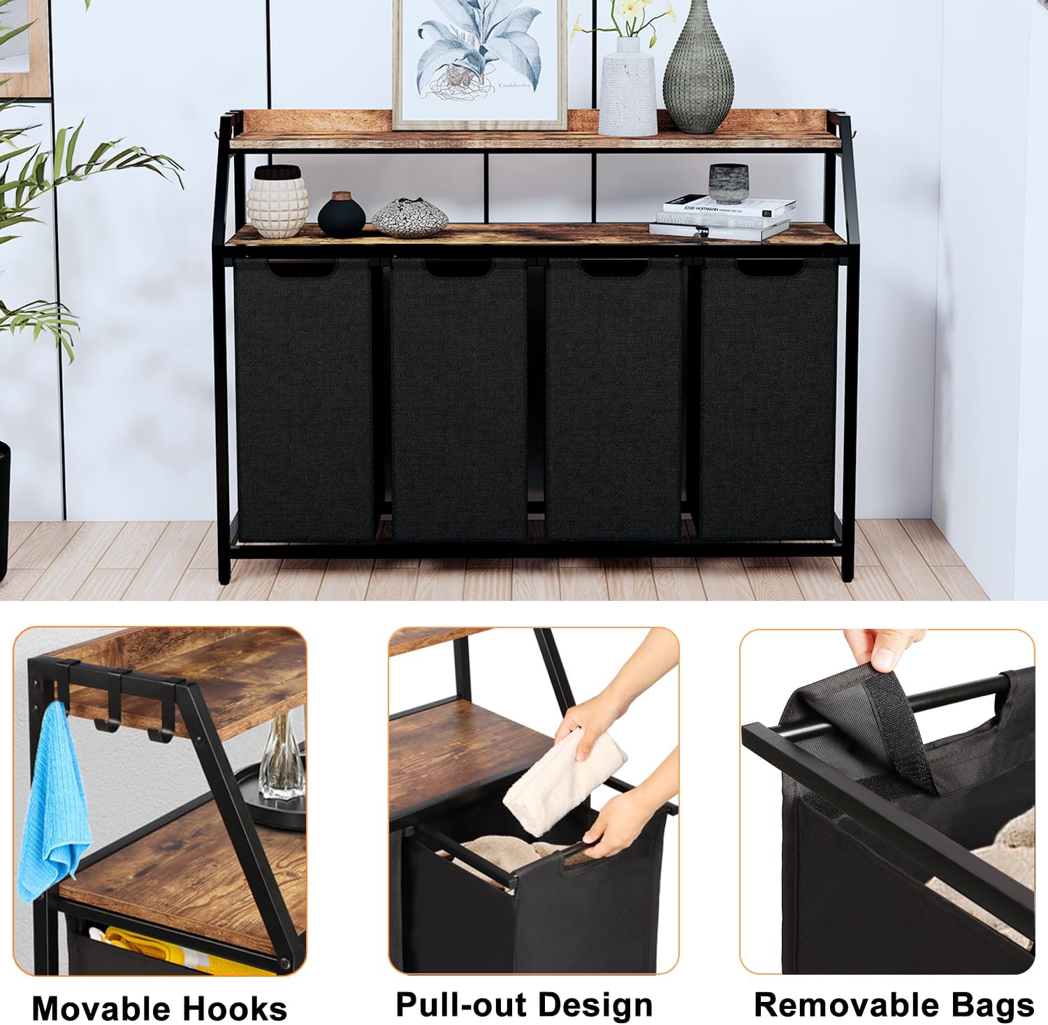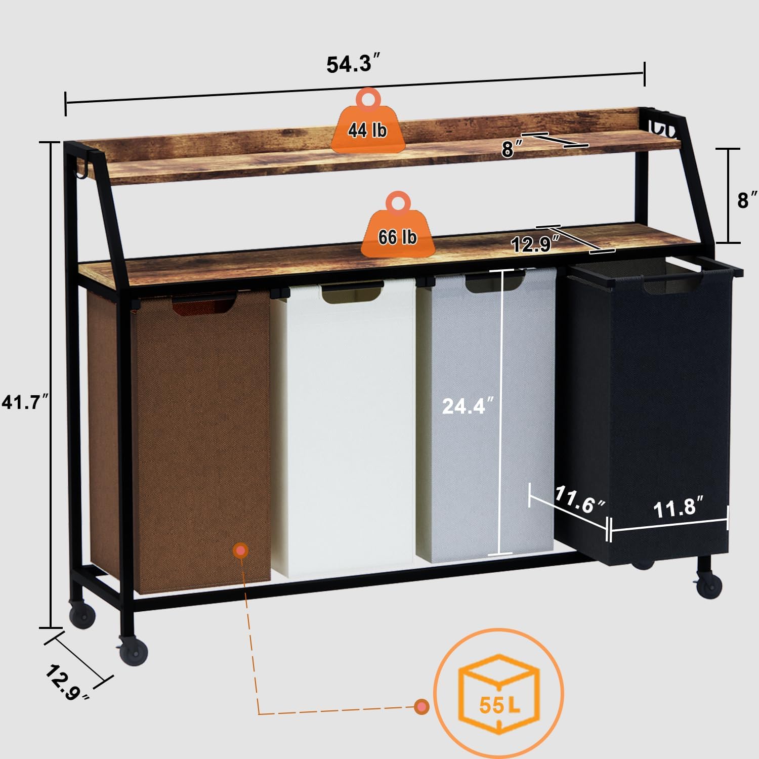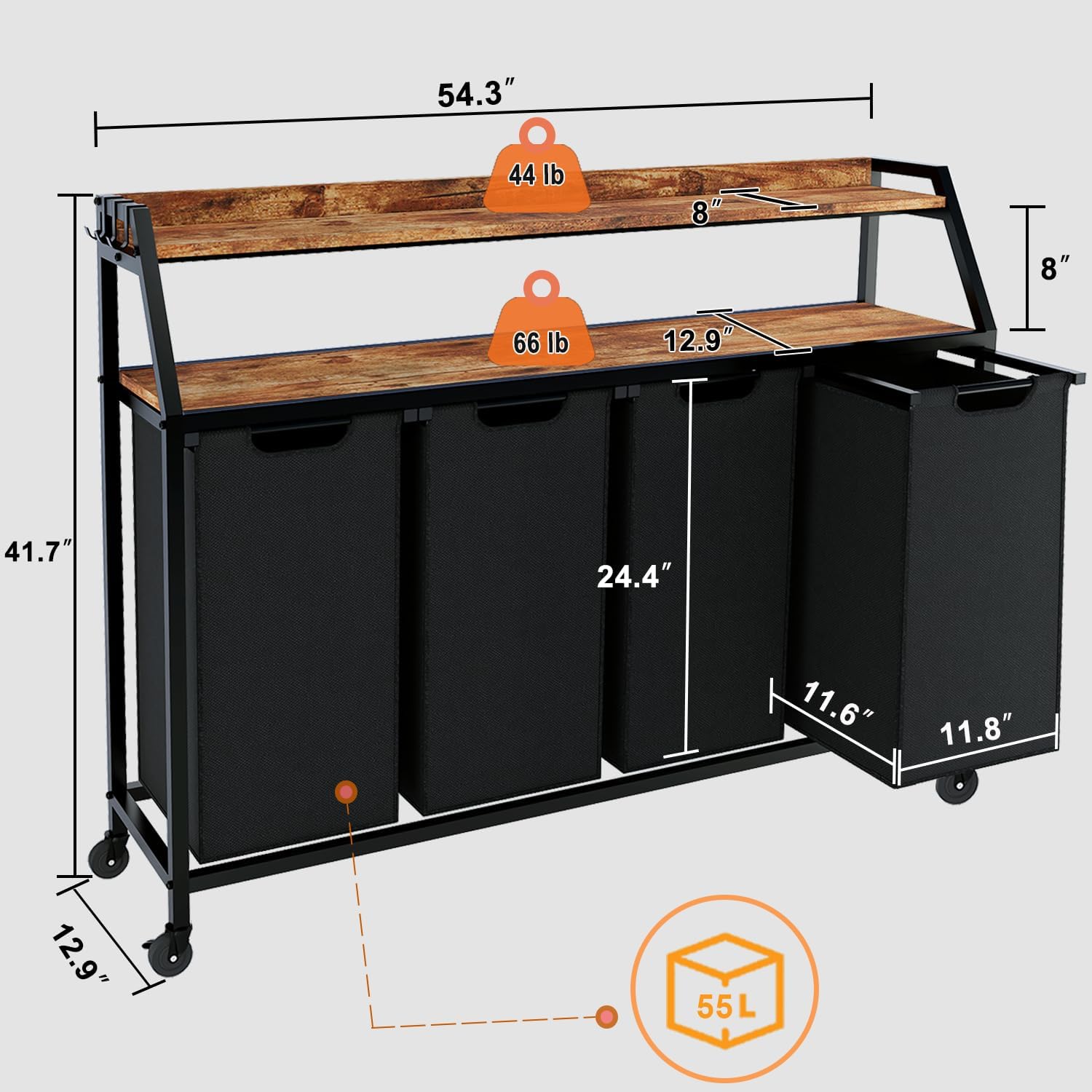 Laundry Hamper, Laundry Sorter with 4 Section, Rolling Basket with Wheels, 2 Shelves, 4 14.5 Gal, Pull-Out and Removable Oxford Fabric Bags for Laundry Room, Black and Rustic Brown