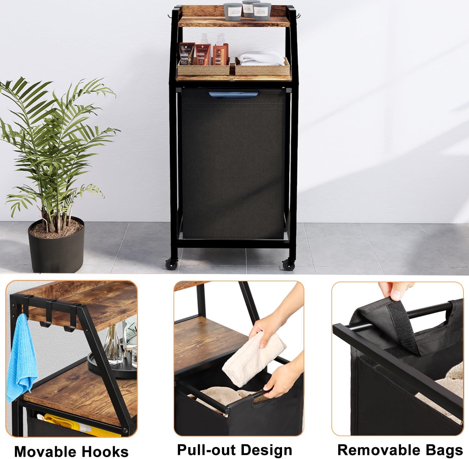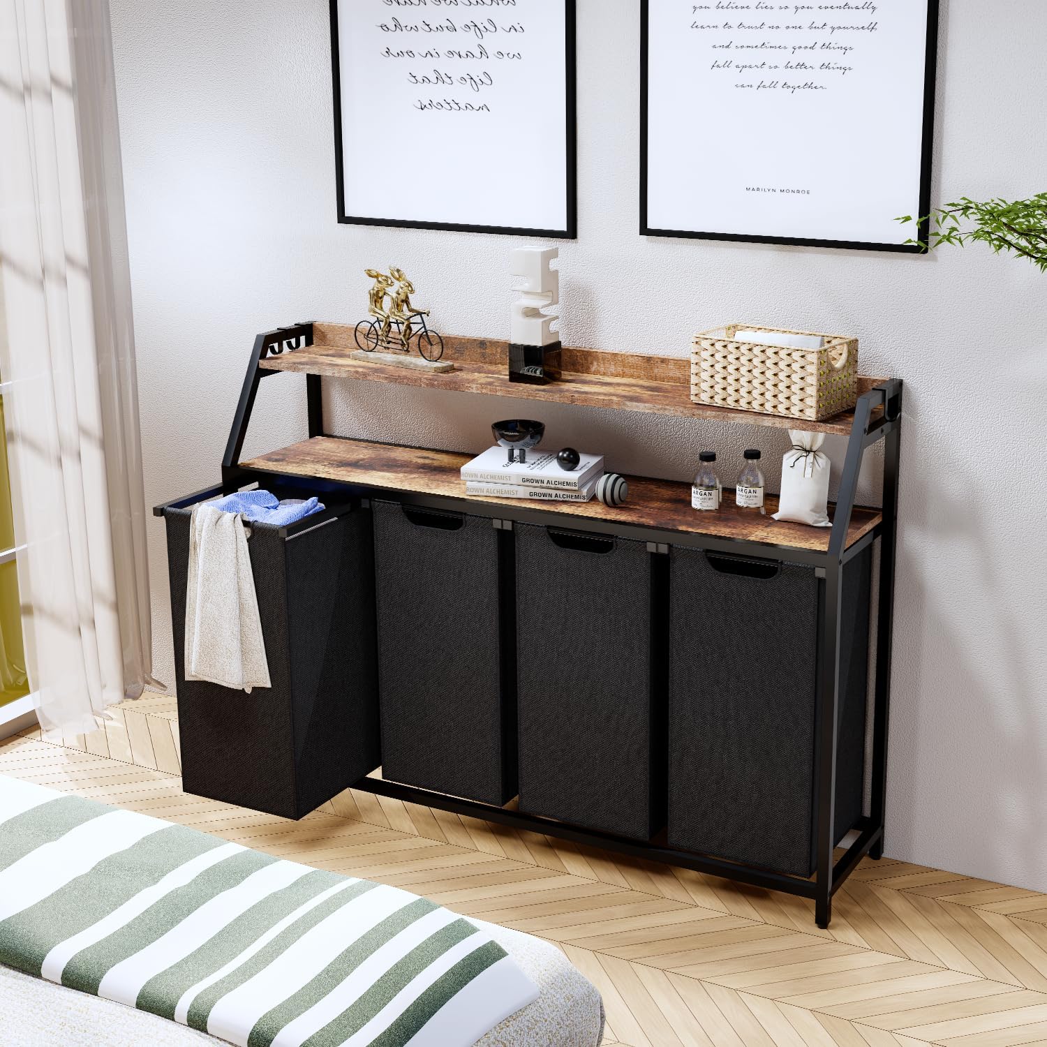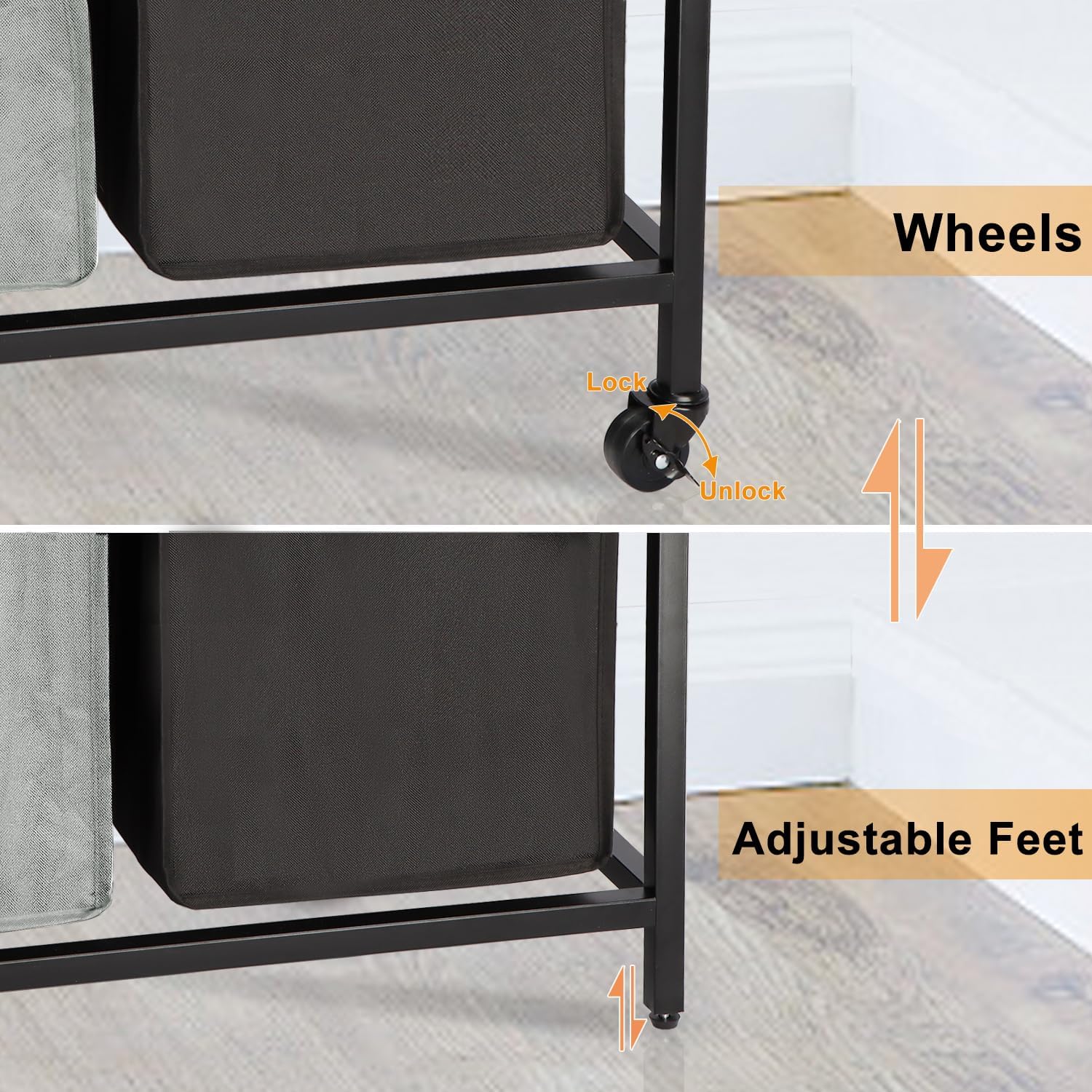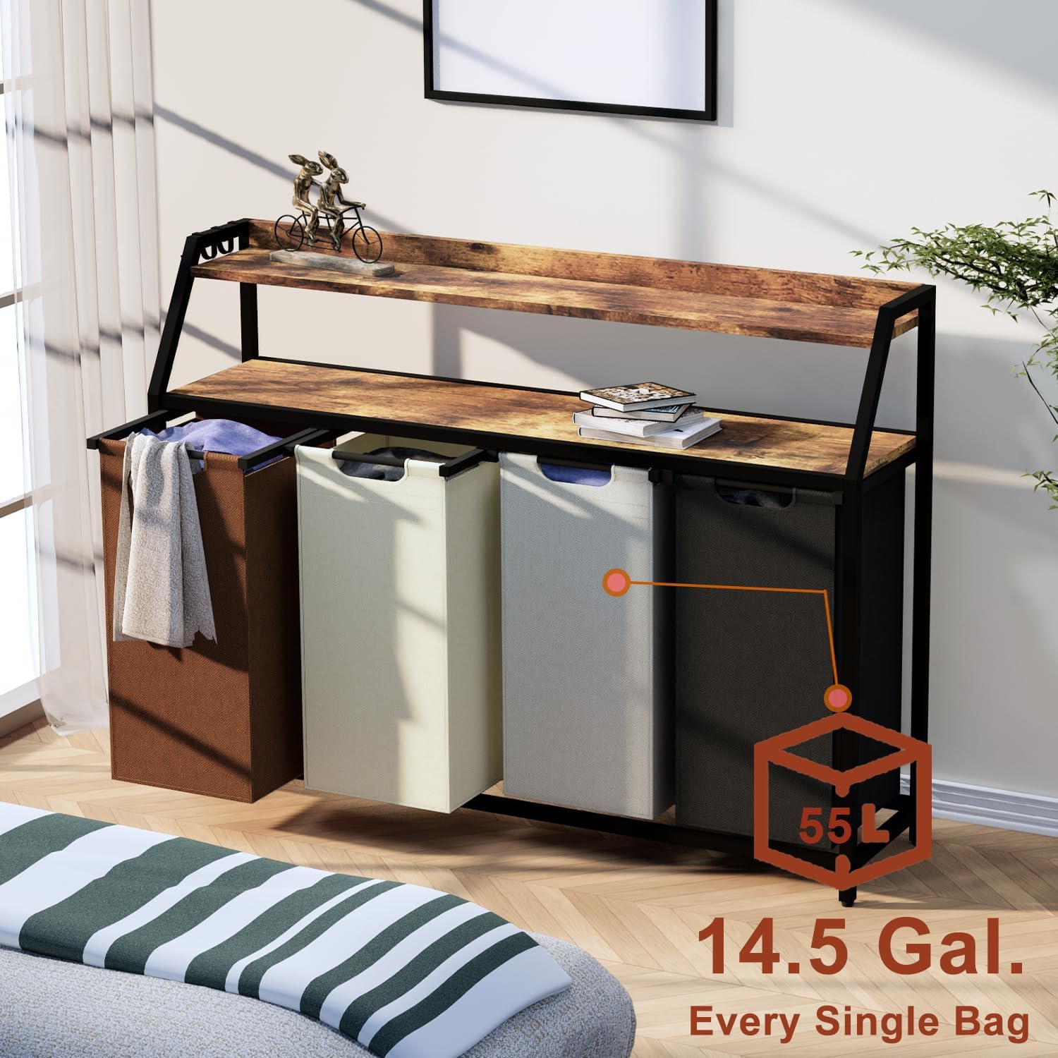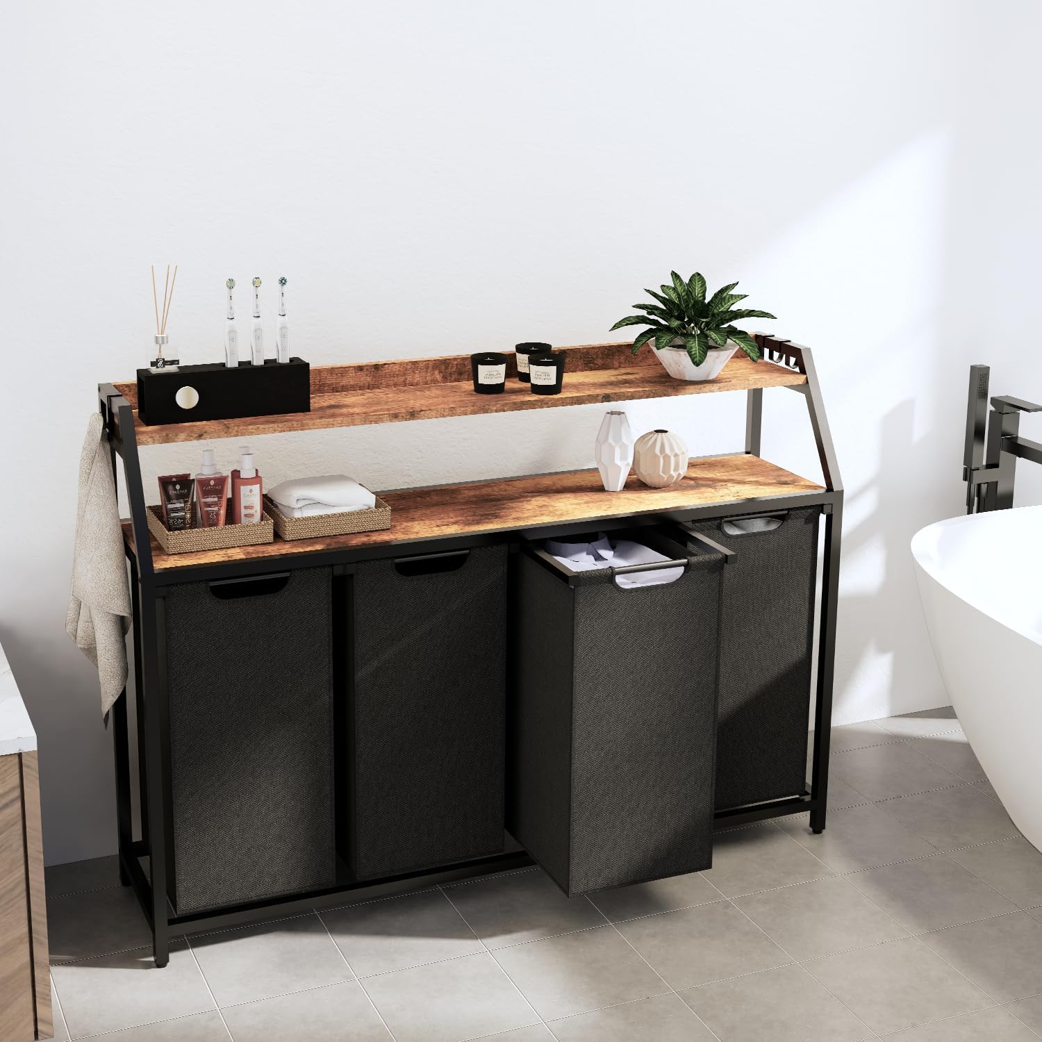 Laundry Hamper, Laundry Sorter with 4 Section, Rolling Basket with Wheels, 2 Shelves, 4 14.5 Gal, Pull-Out and Removable Oxford Fabric Bags for Laundry Room, Black and Rustic Brown