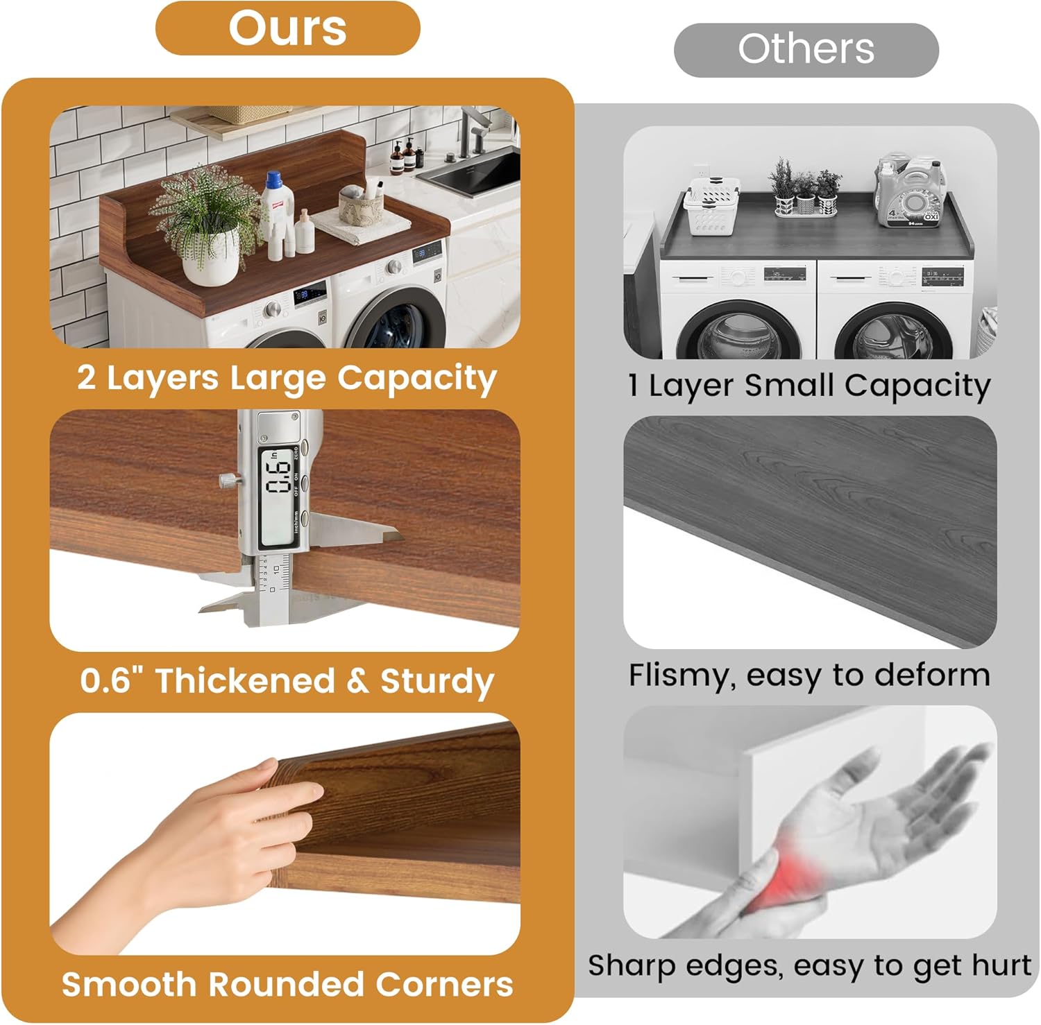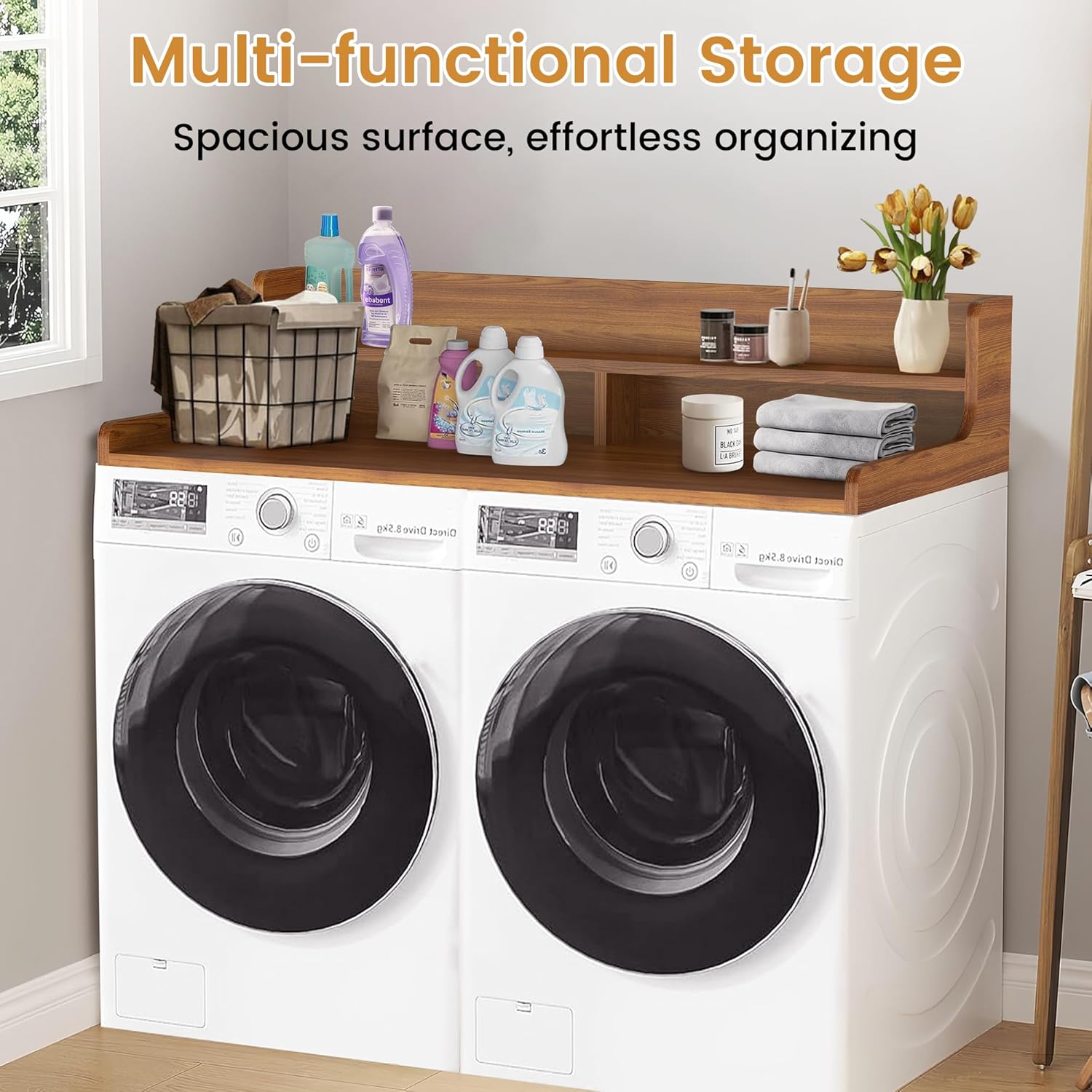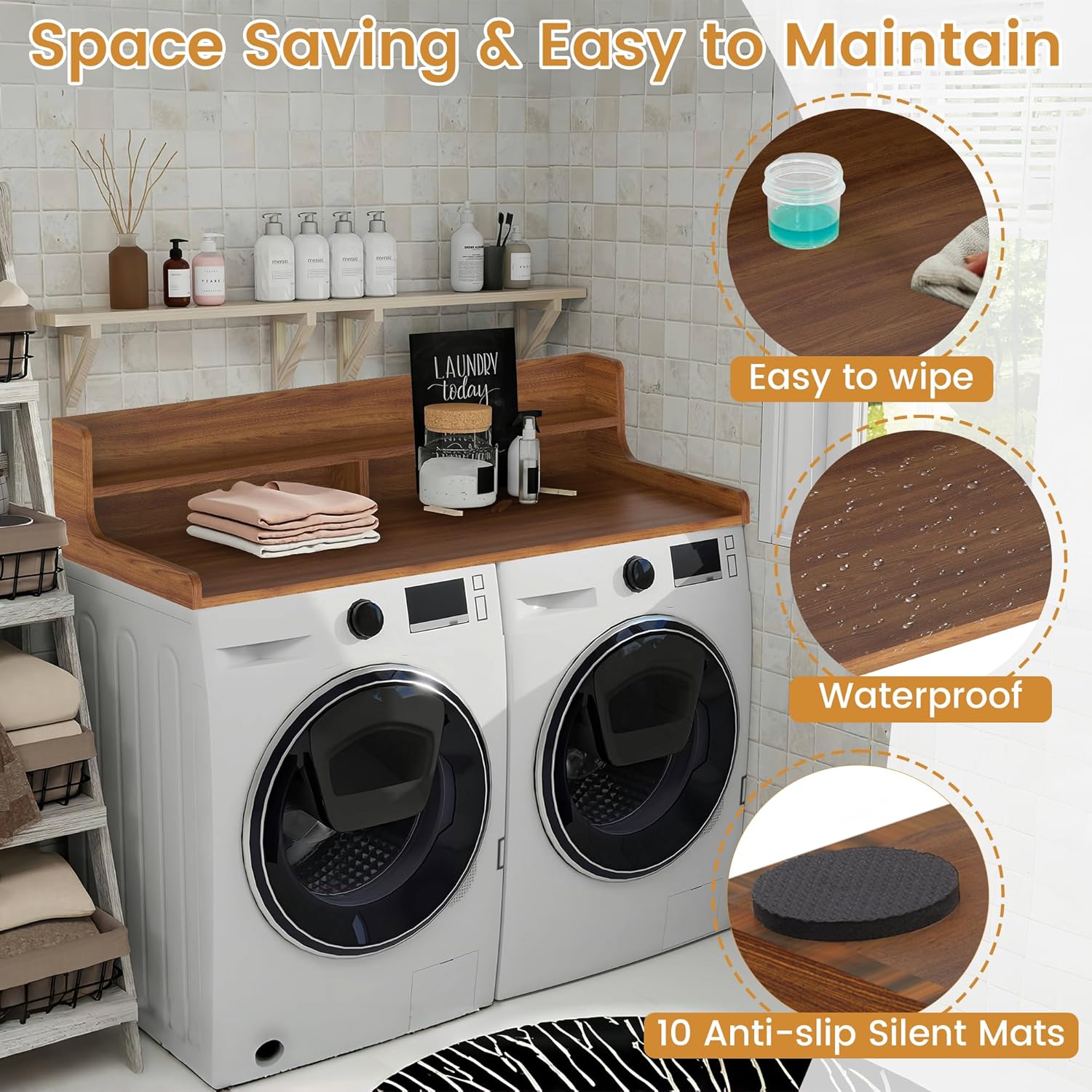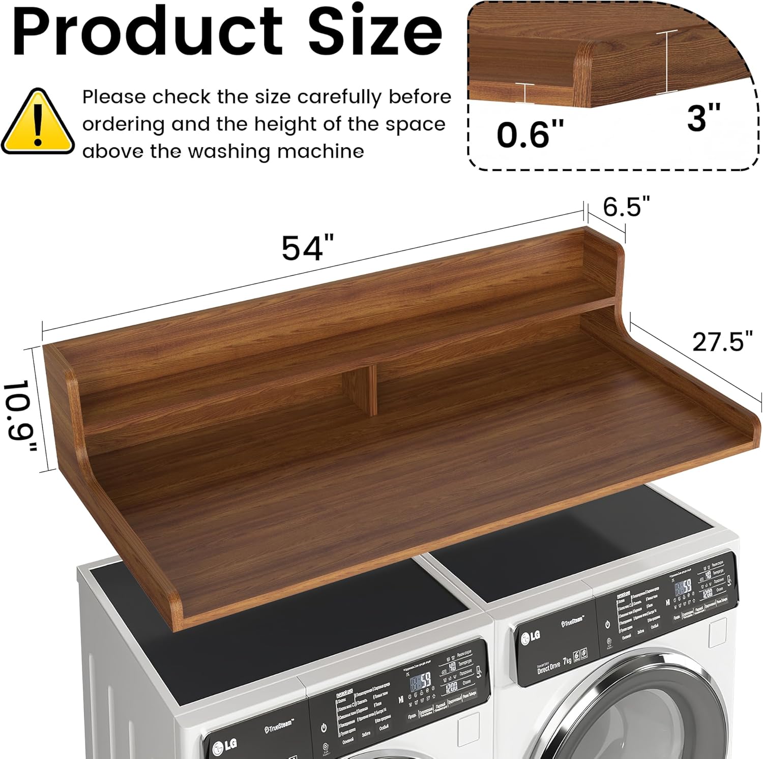 2-Tier Washer Dryer Countertop with 3" H Raised Edge, 54" W x 27.5" D Laundry Countertop Cover with Non-Slip Pad, Washer and Dryer Topper for All Front-loaded, Easy to Install(Walnut)