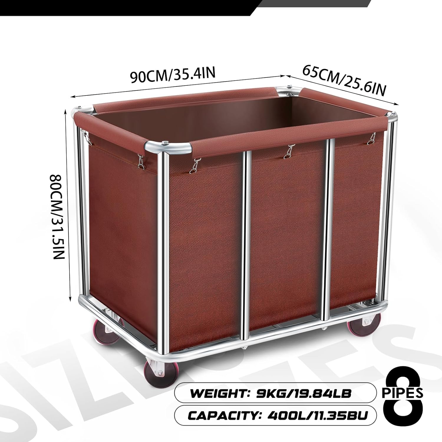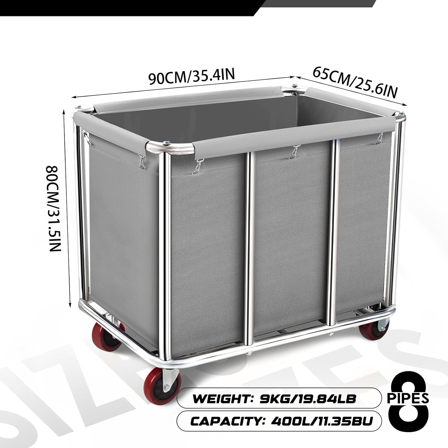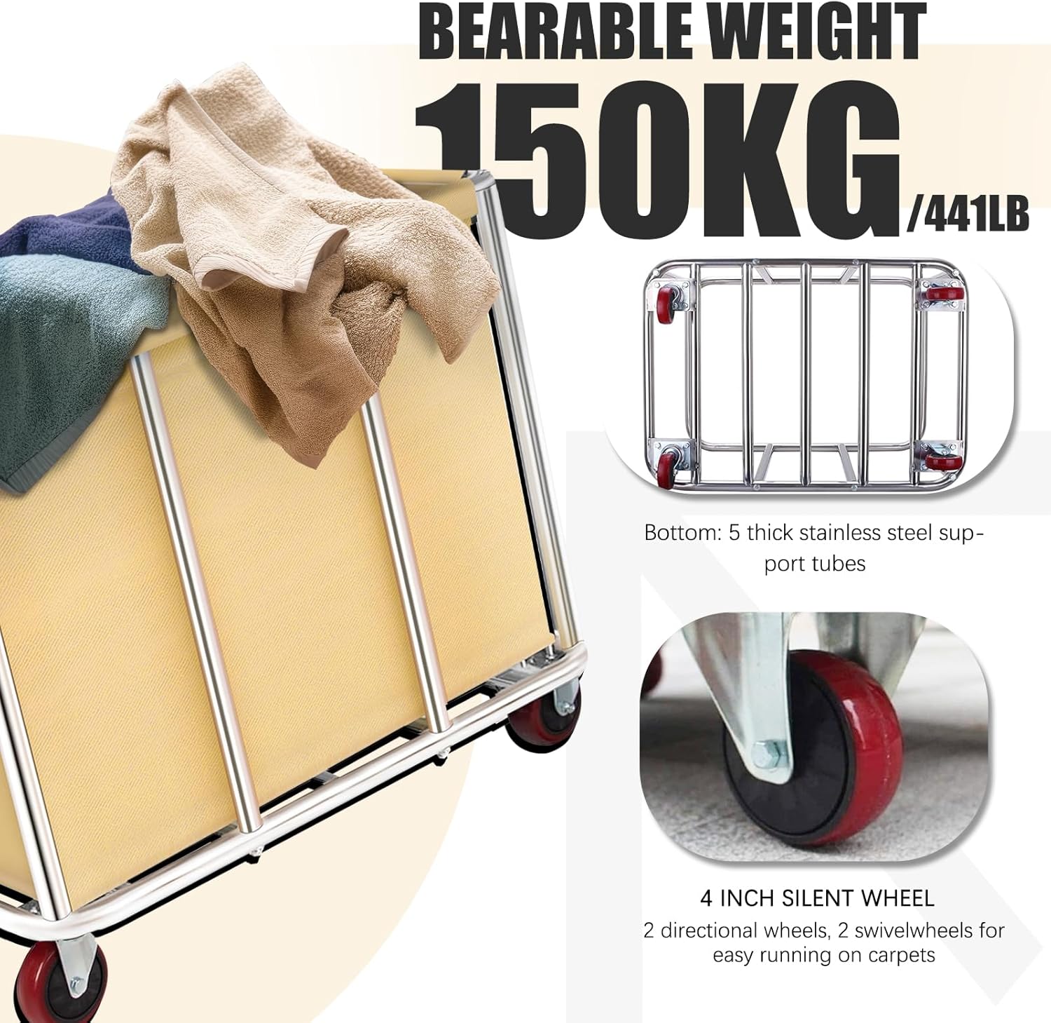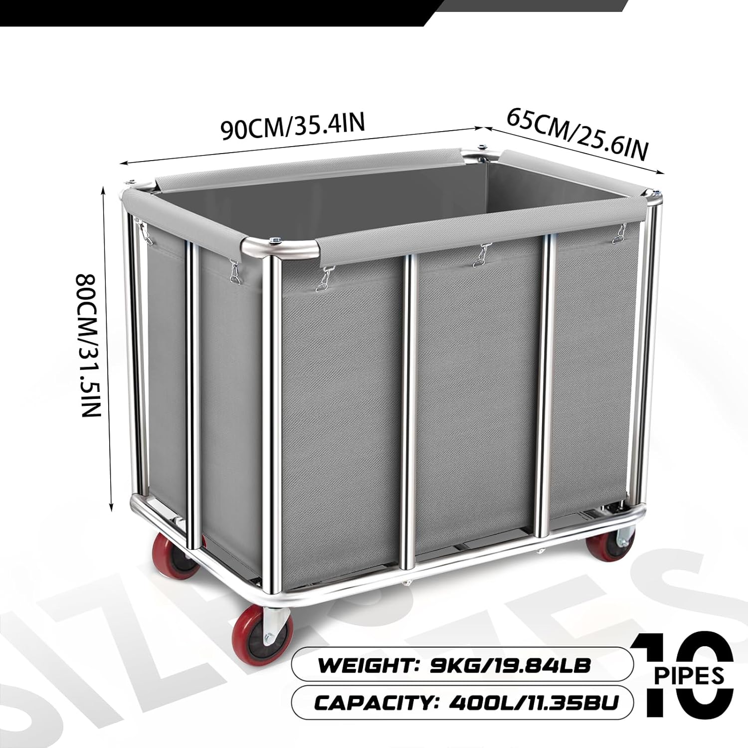 Commercial Laundry Cart with Wheels, 11.35 Bushel Large Laundry Tumbler with Removable Waterproof Canvas Lined Basket, Heavy Duty Stainless Steel Laundry Basket for Hotels and Hospitals