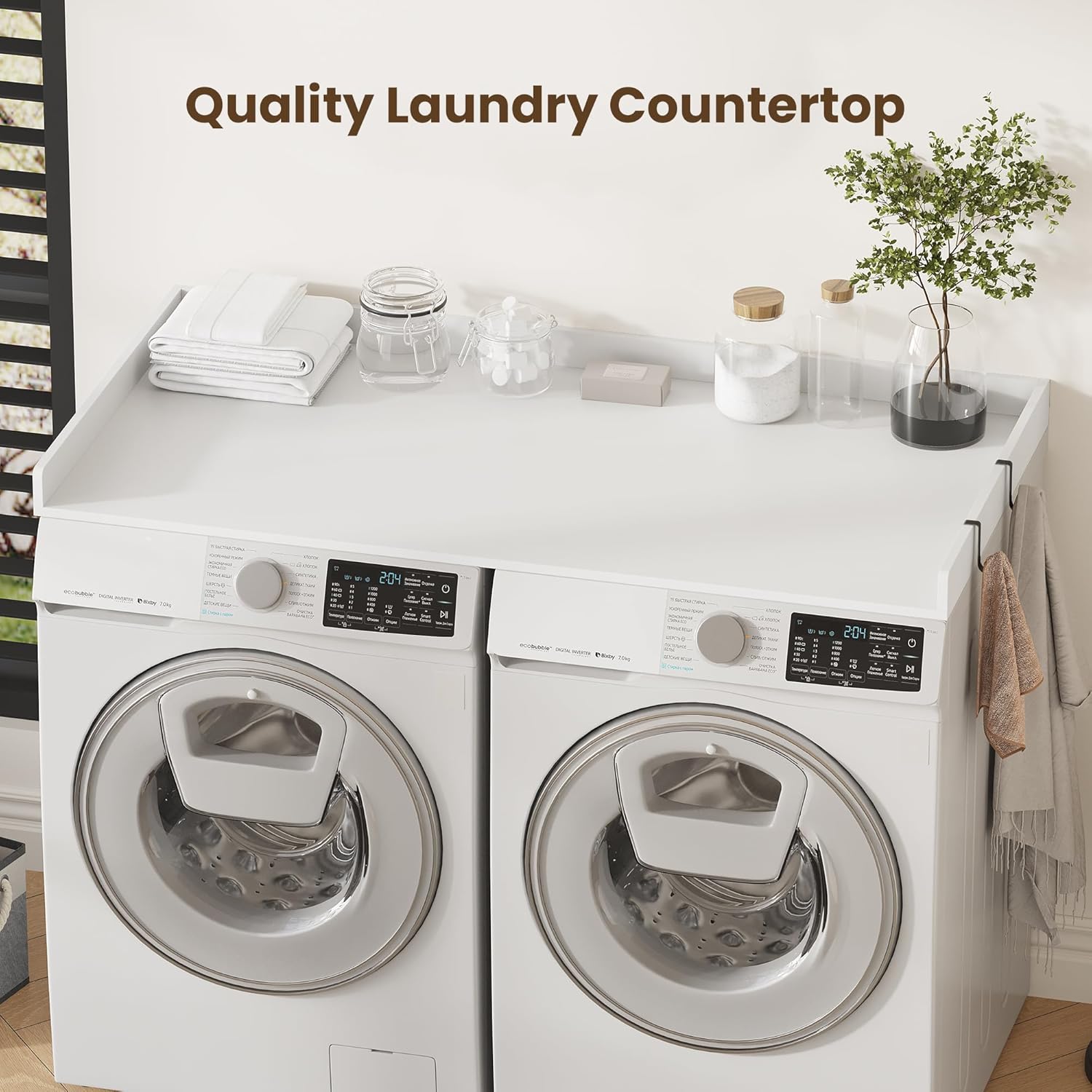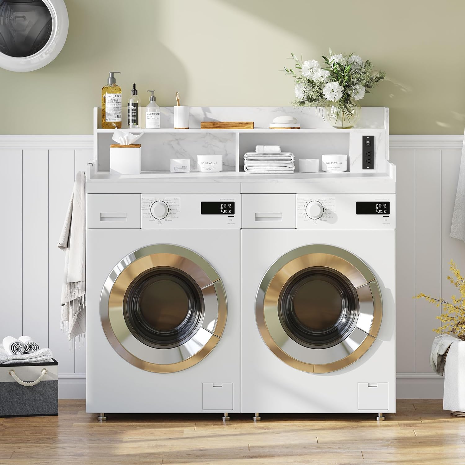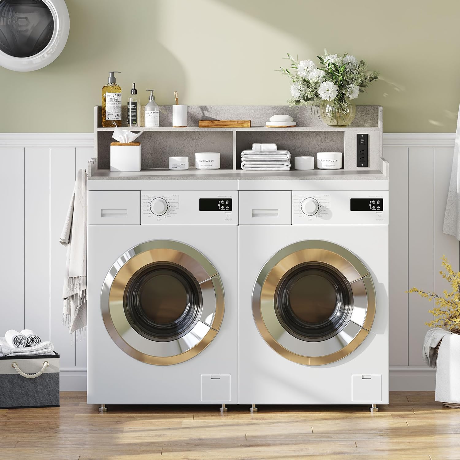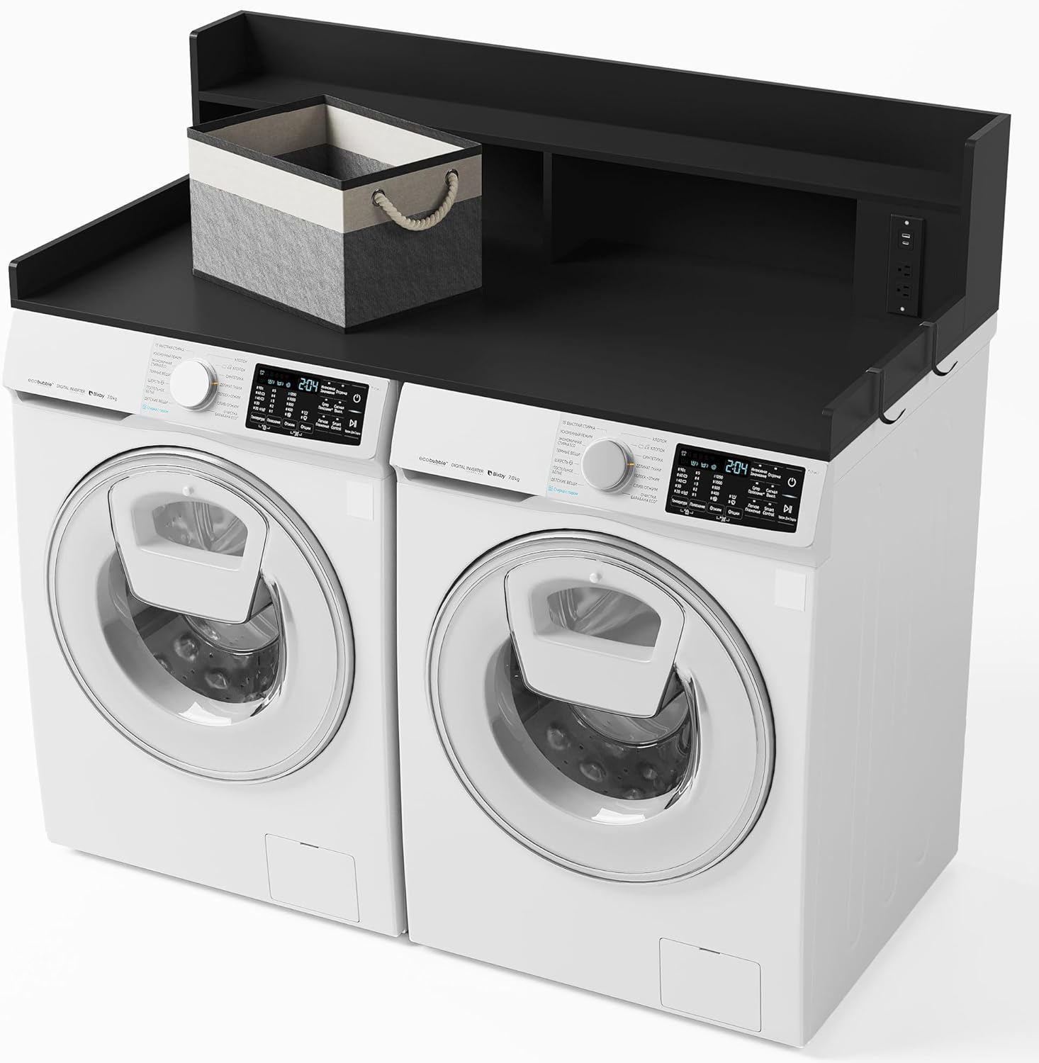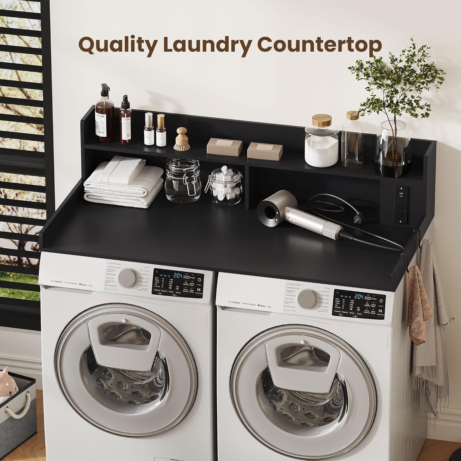 Upgraded 2-Tier Washer and Dryer Countertop with Power Outlet,54" W x 27.6" D Large Laundry Countertop for Fold Clothes, Laundry Topper with Non-Slip Pads & Metal Hooks and Storage Basket