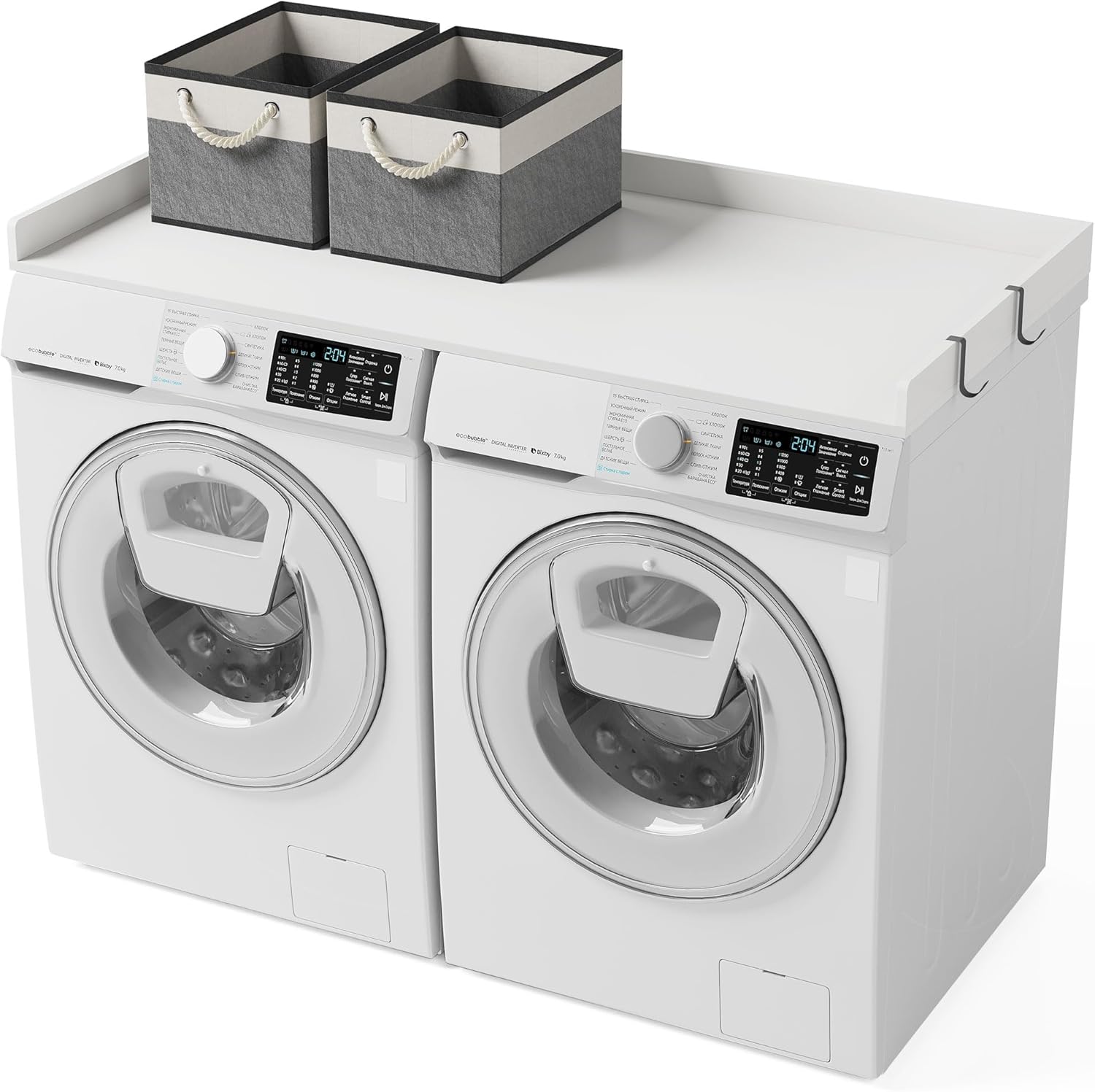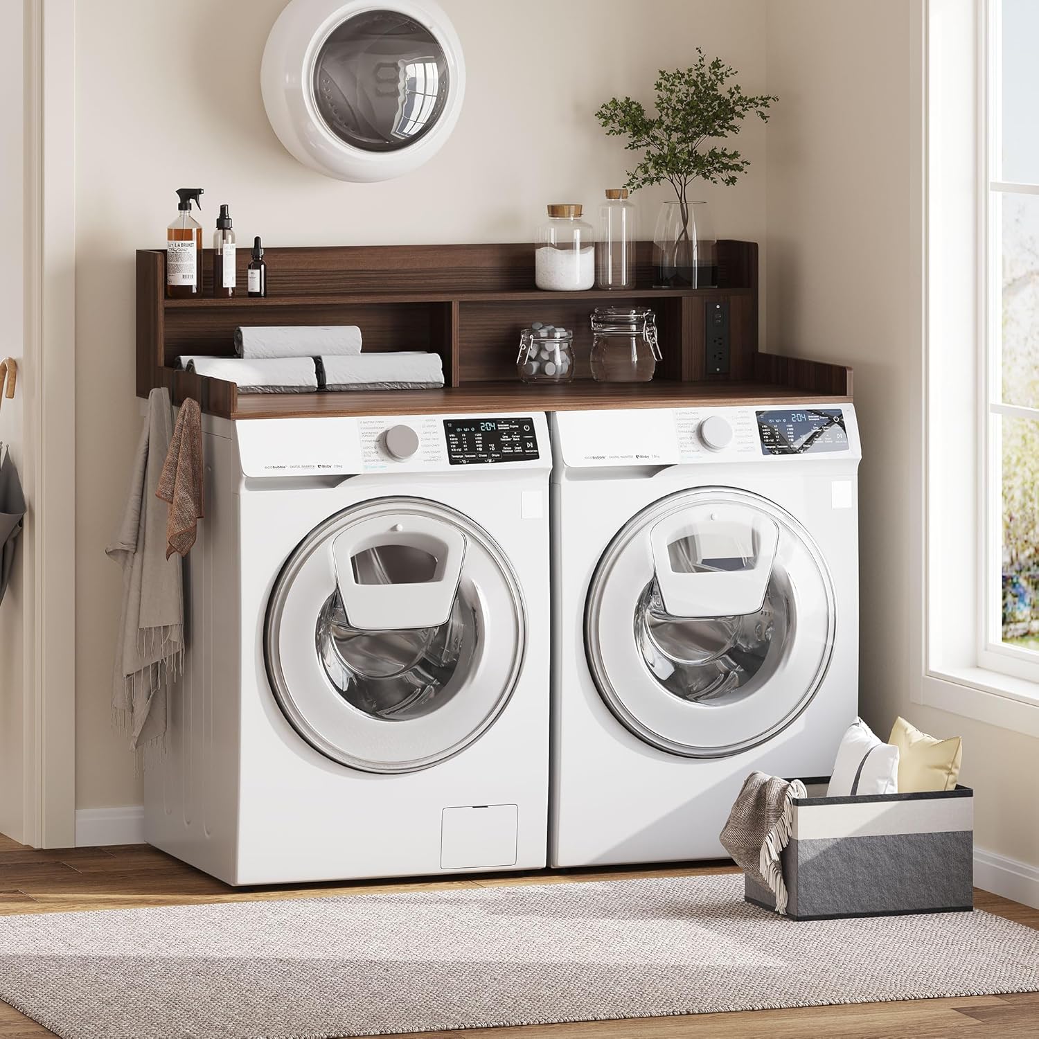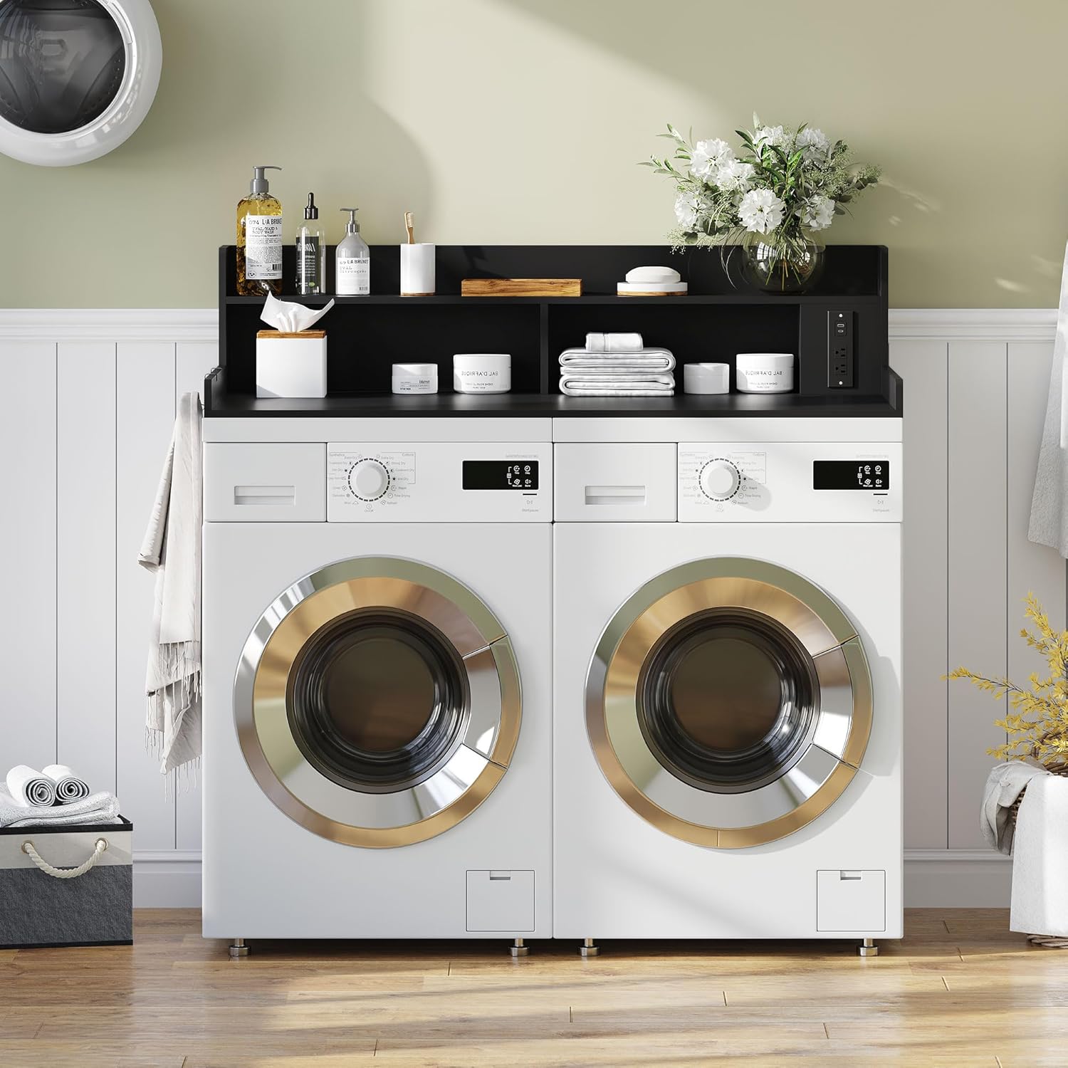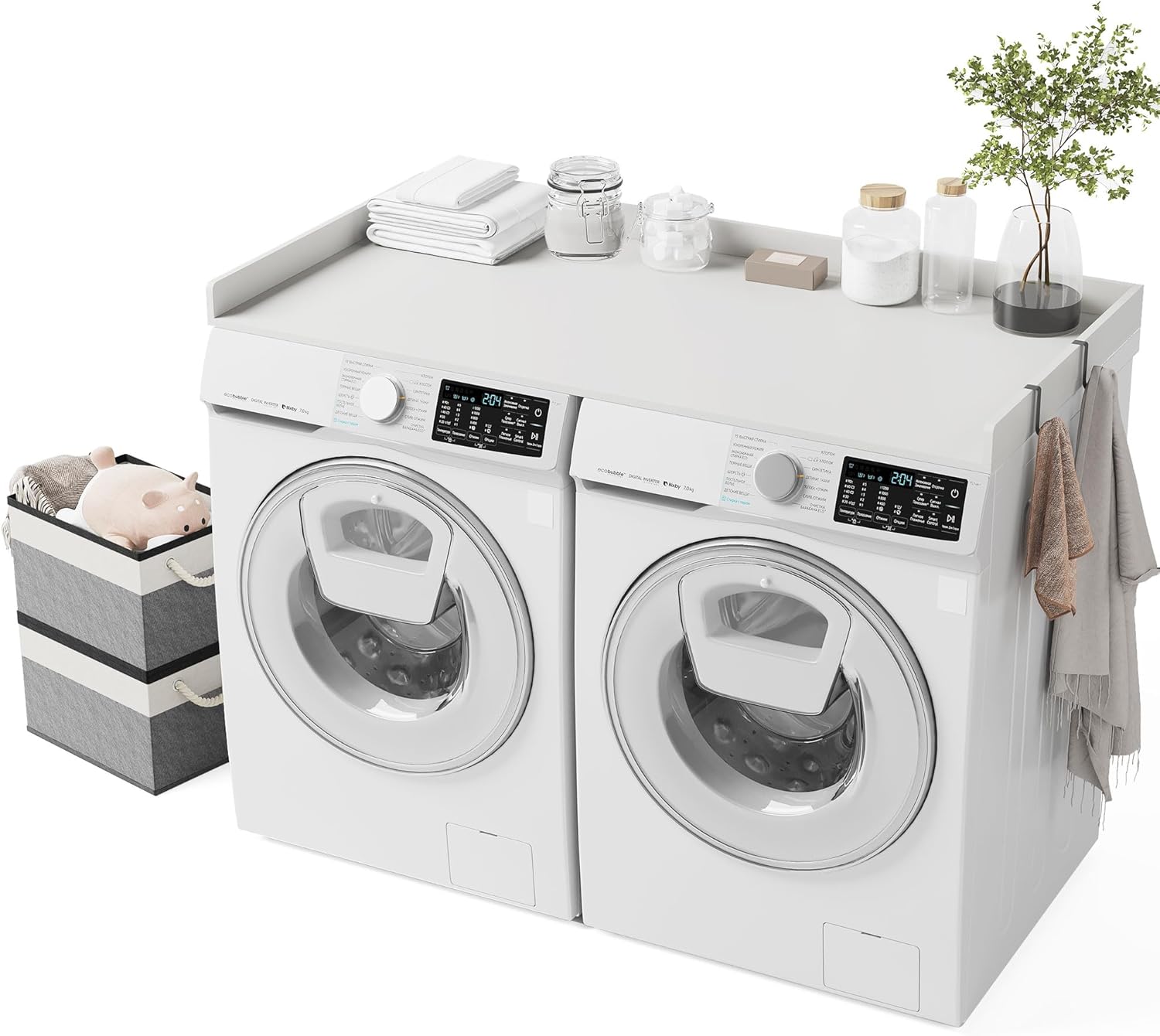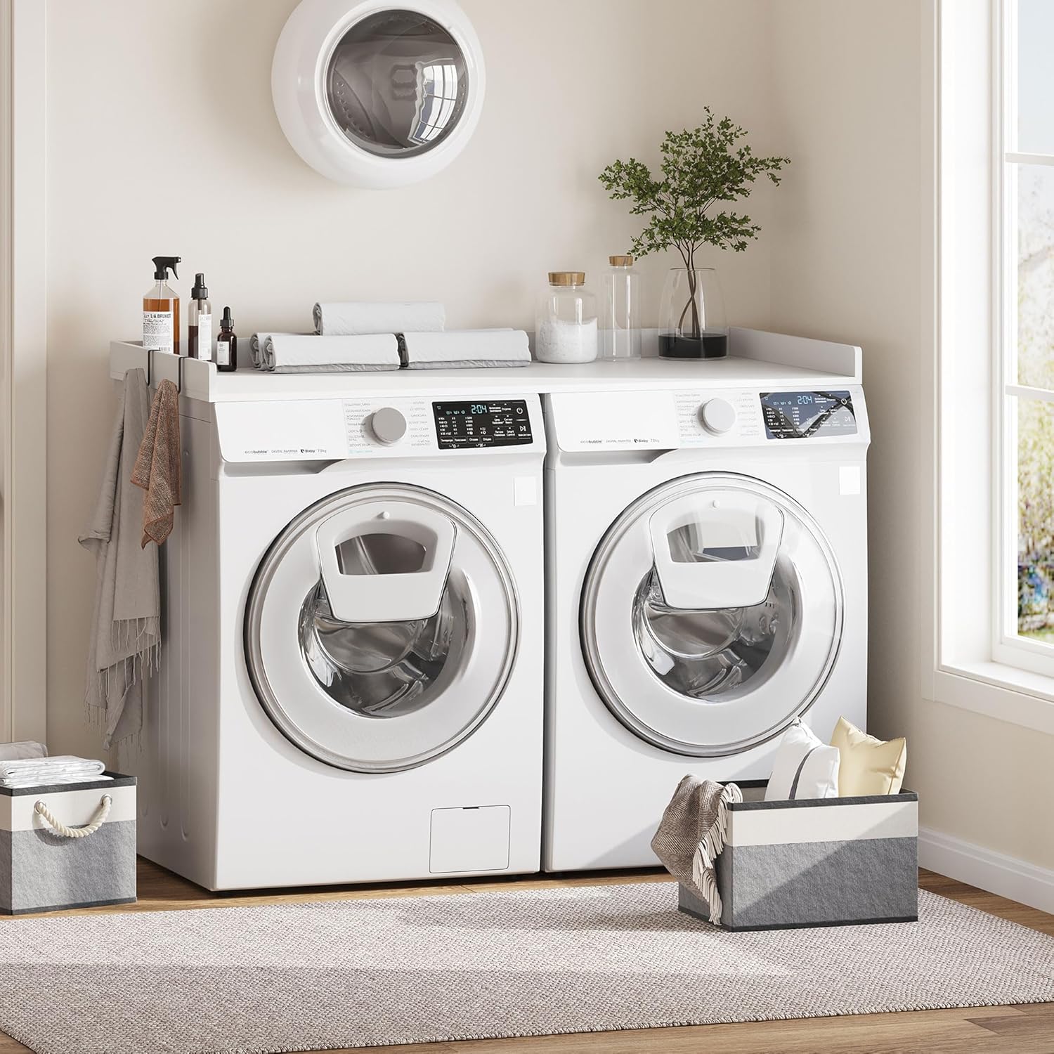 Upgraded 2-Tier Washer and Dryer Countertop with Power Outlet,54" W x 27.6" D Large Laundry Countertop for Fold Clothes, Laundry Topper with Non-Slip Pads & Metal Hooks and Storage Basket