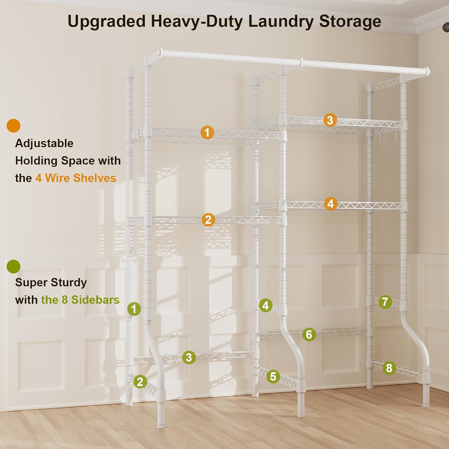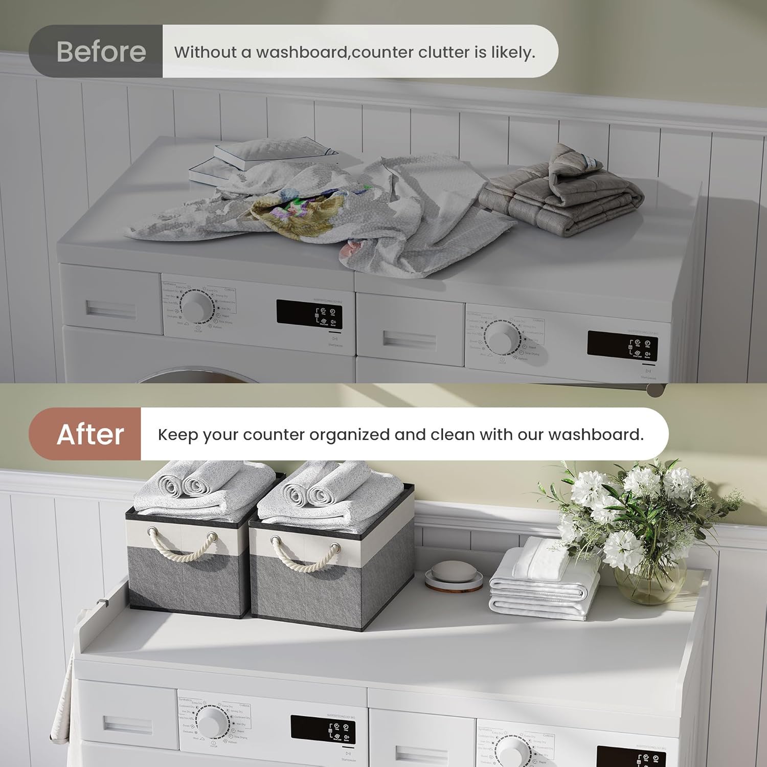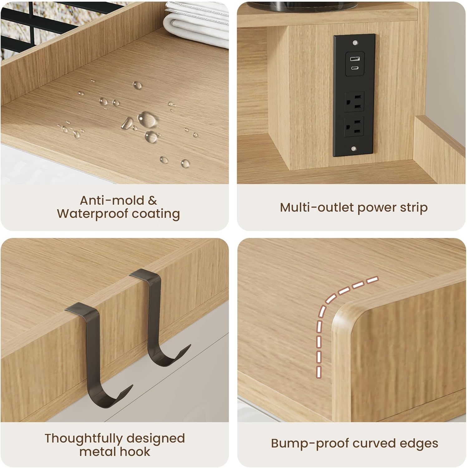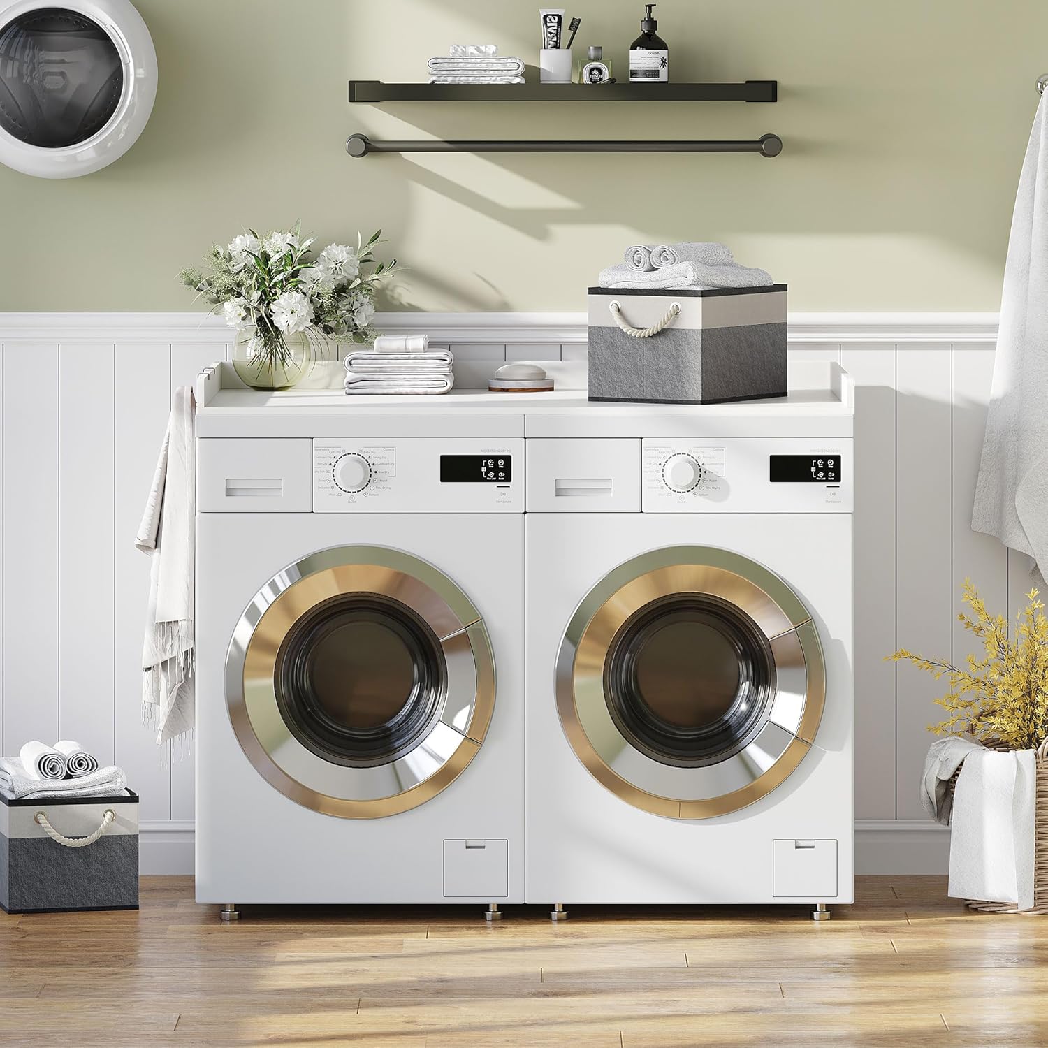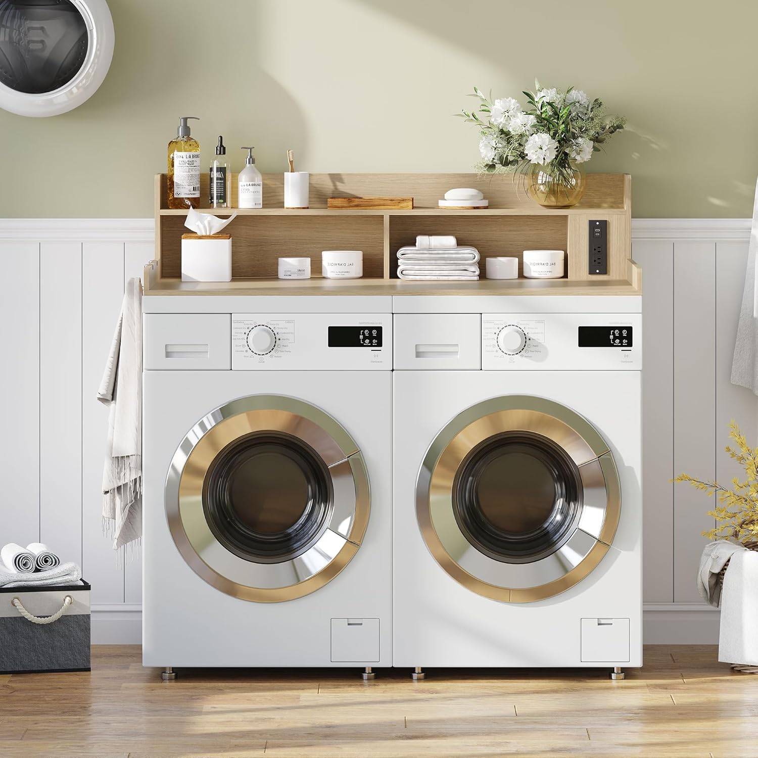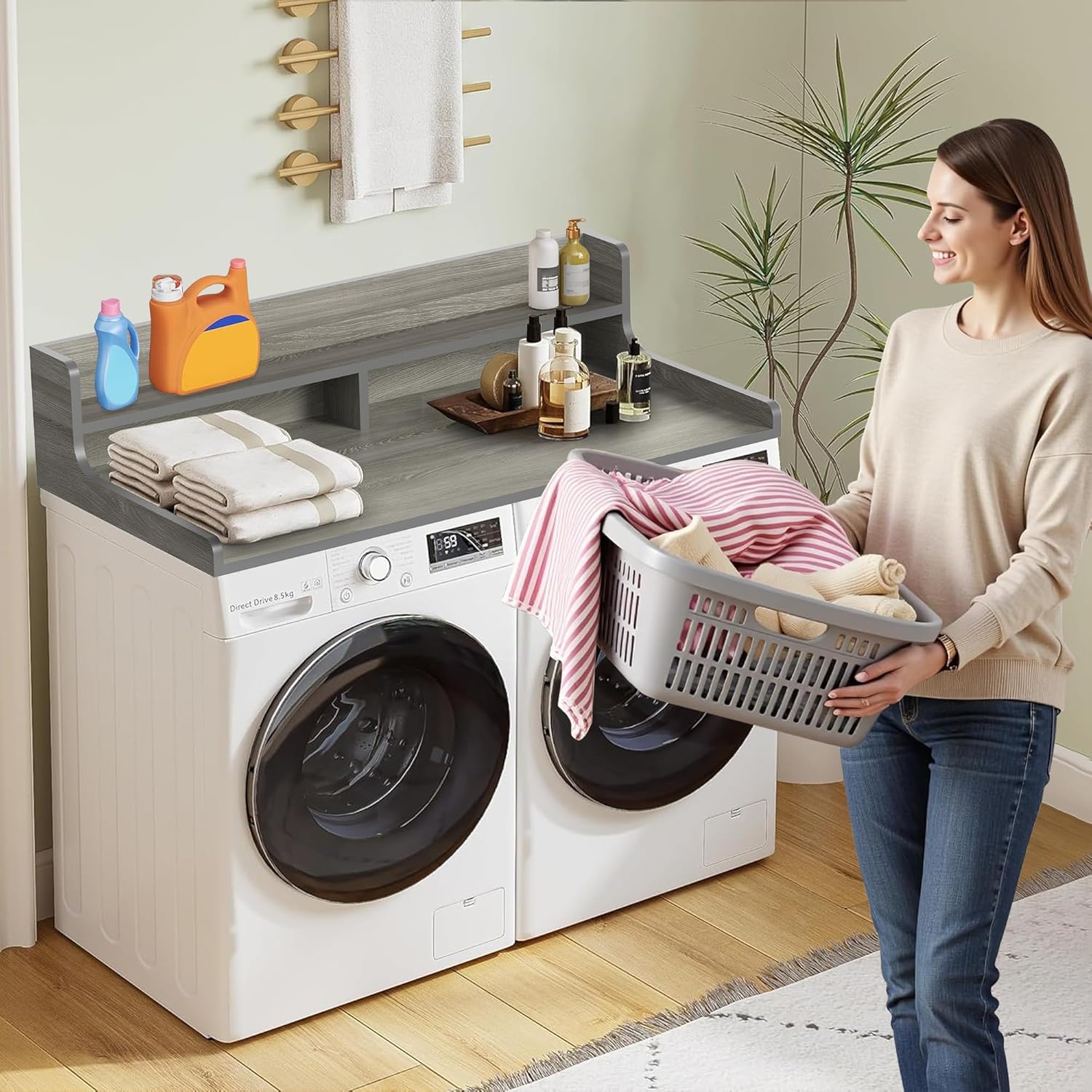 Upgraded 2-Tier Washer and Dryer Countertop with Power Outlet,54" W x 27.6" D Large Laundry Countertop for Fold Clothes, Laundry Topper with Non-Slip Pads & Metal Hooks and Storage Basket