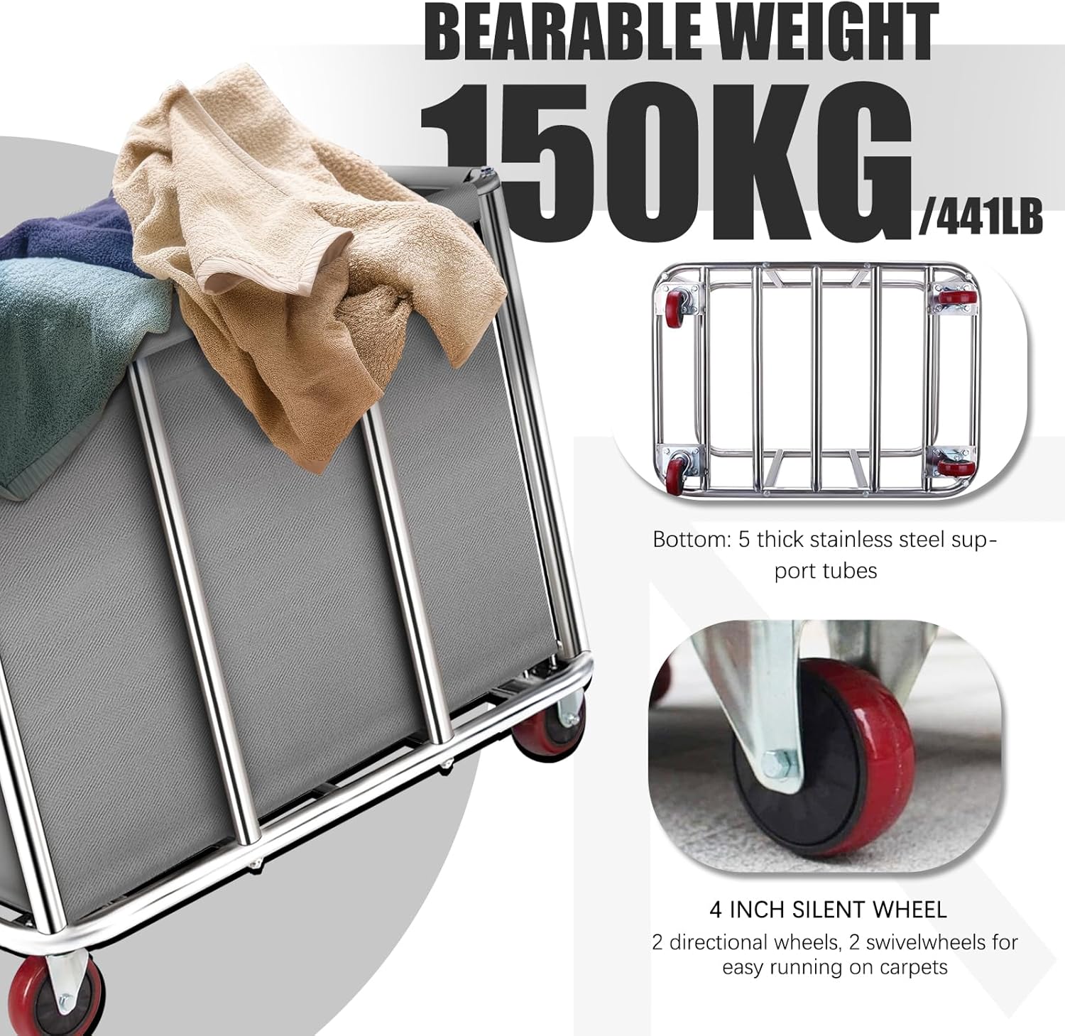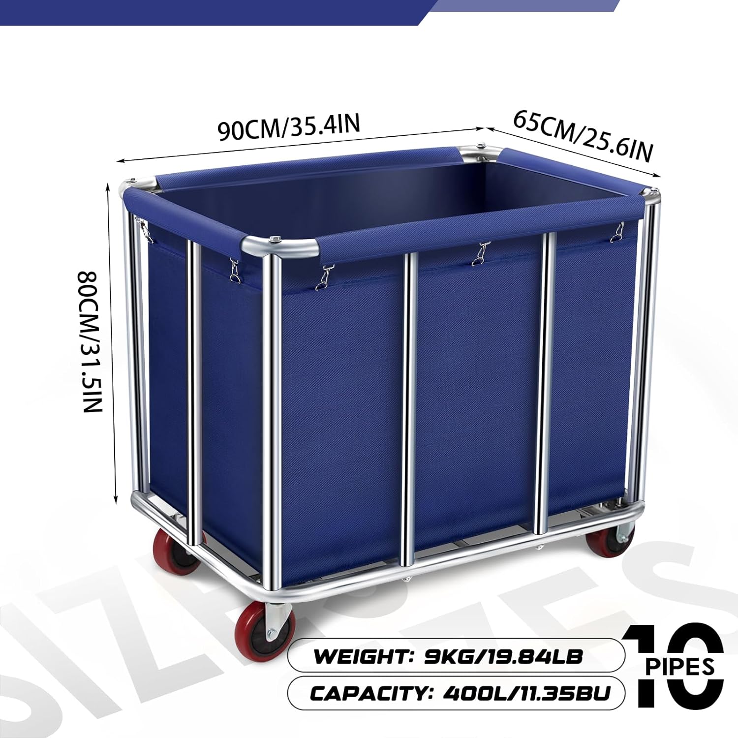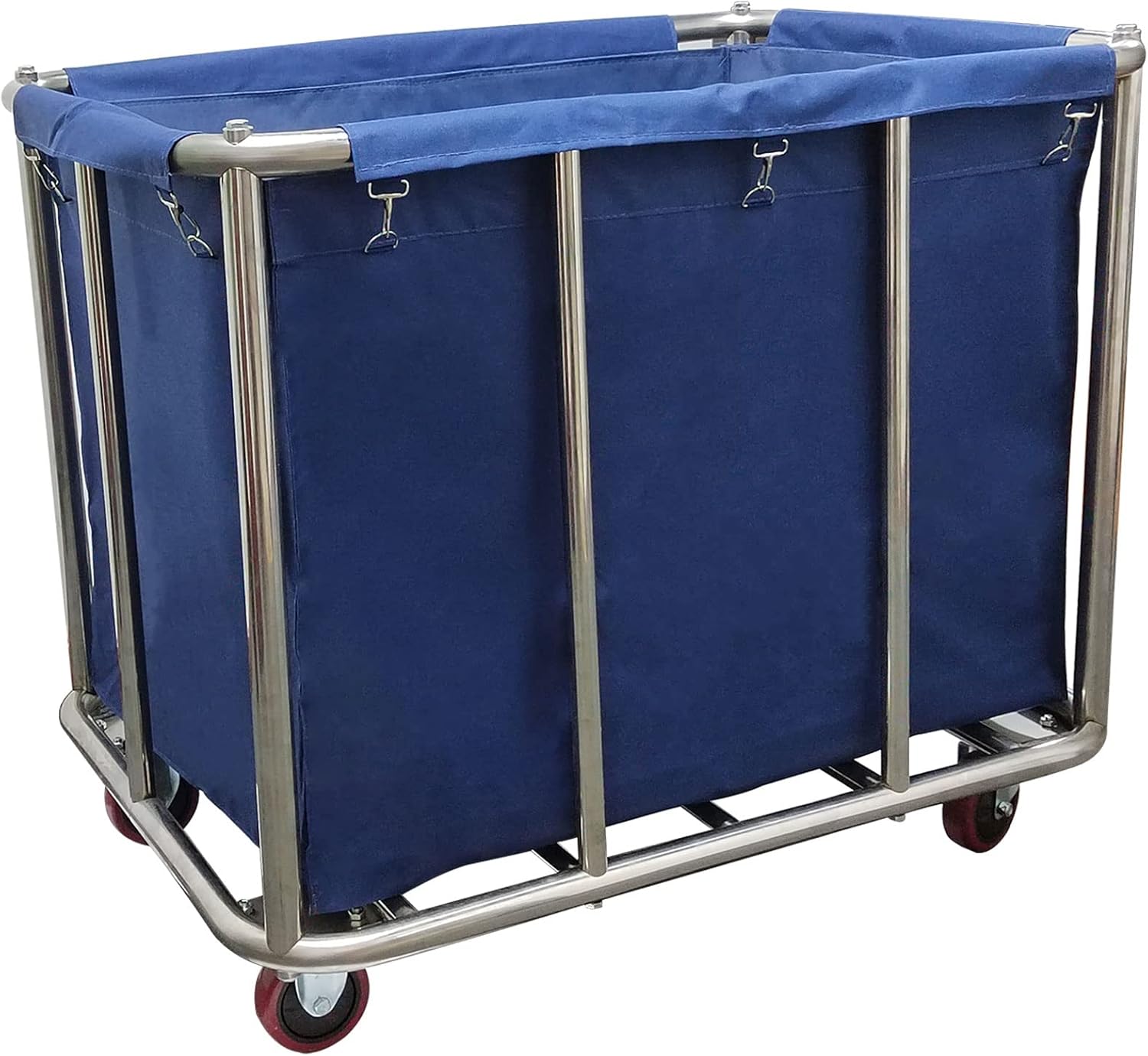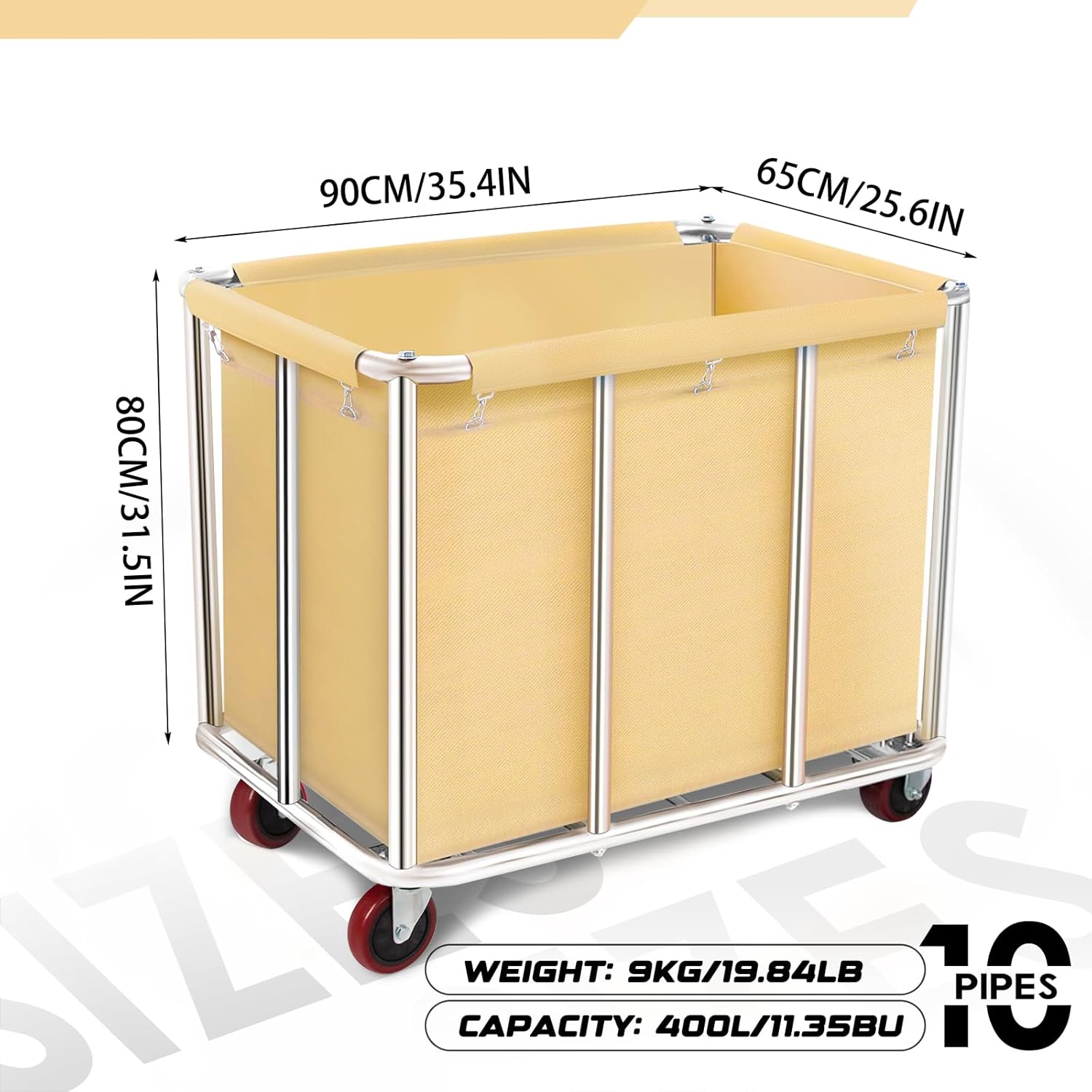 Commercial Laundry Cart on Wheels, 11.35 Bushels Large Roller with Removable Waterproof Canvas Lined Basket, Heavy Duty Stainless Steel for Hotels and Hospitals