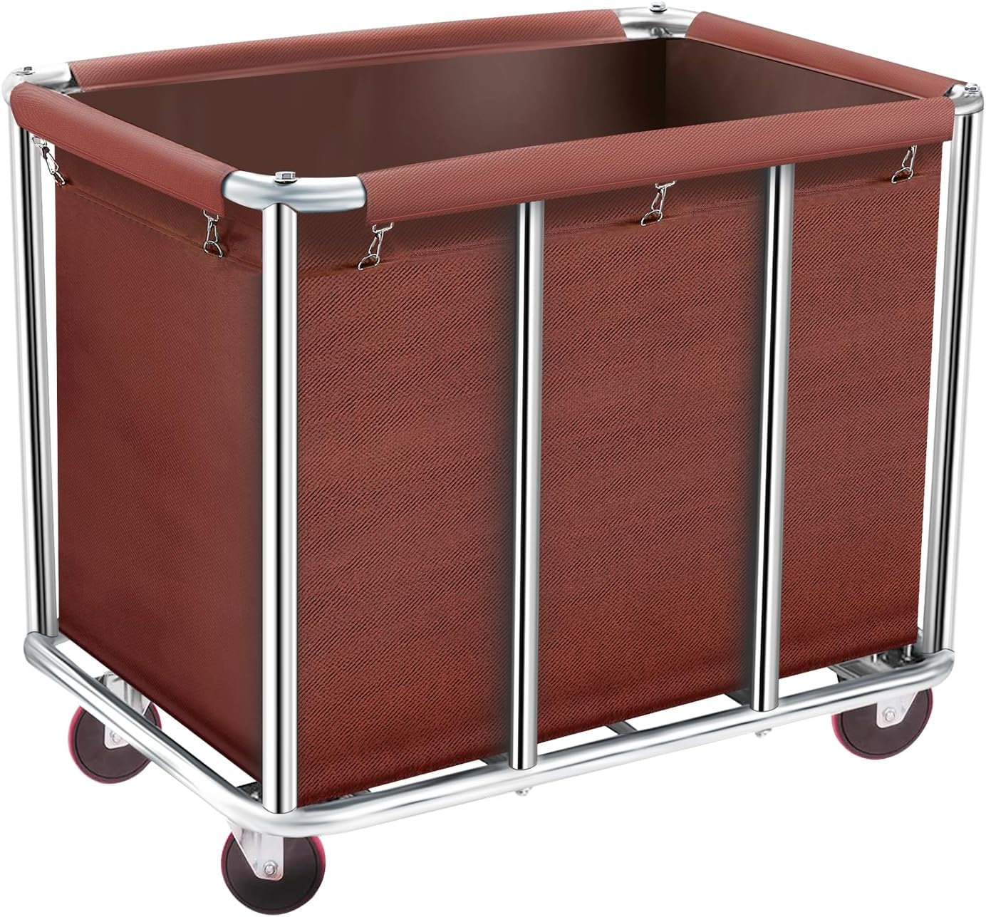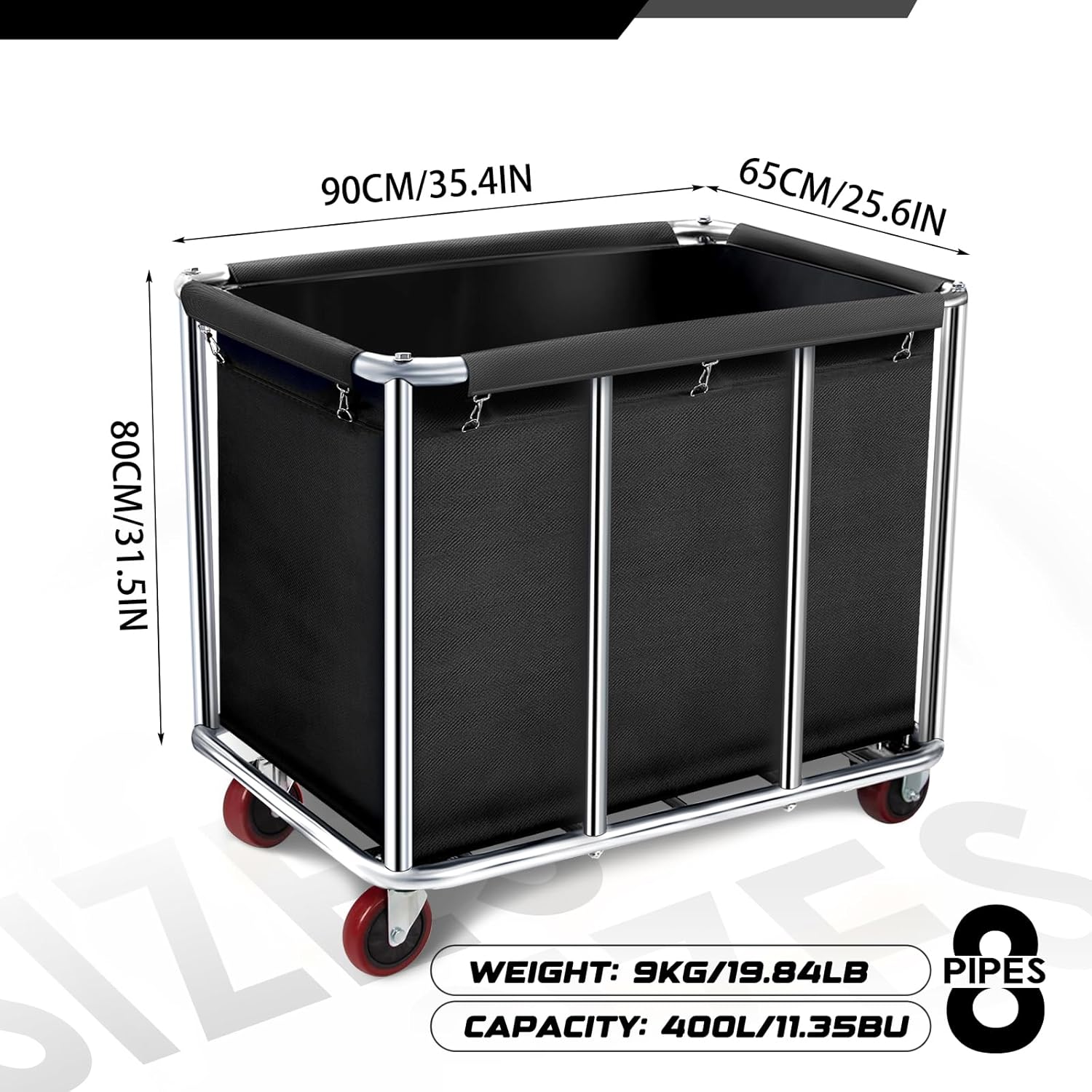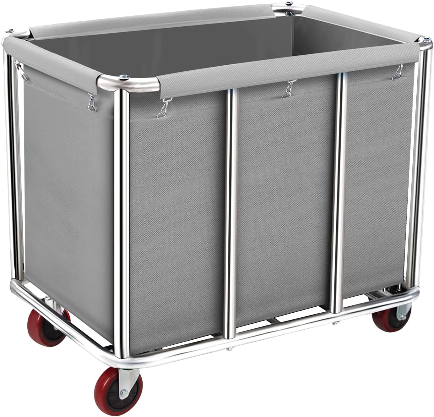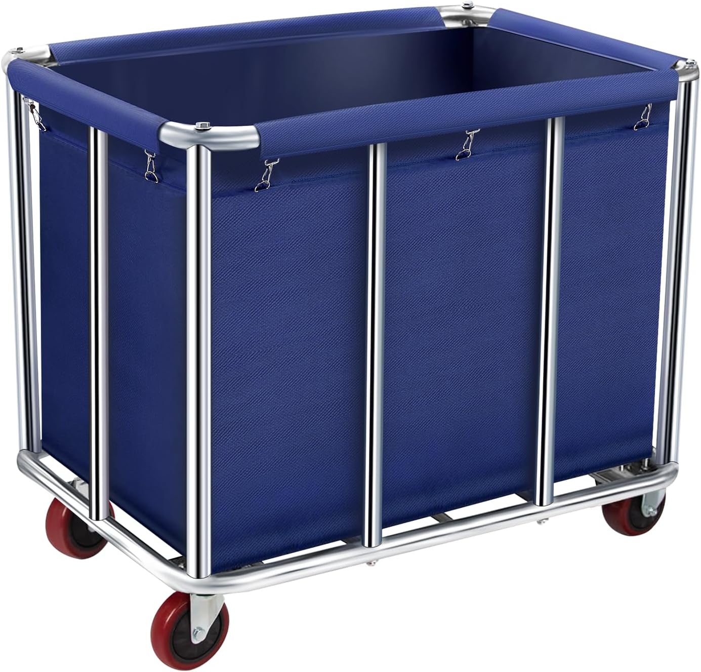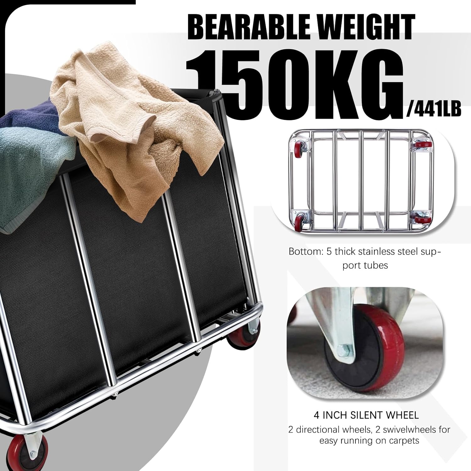 Commercial Laundry Cart on Wheels, 11.35 Bushels Large Roller with Removable Waterproof Canvas Lined Basket, Heavy Duty Stainless Steel for Hotels and Hospitals